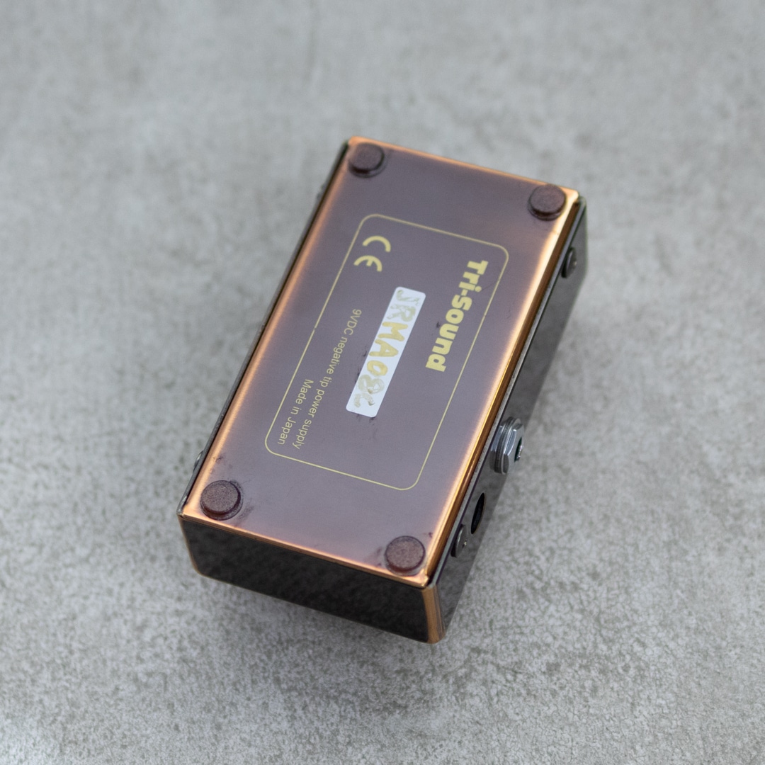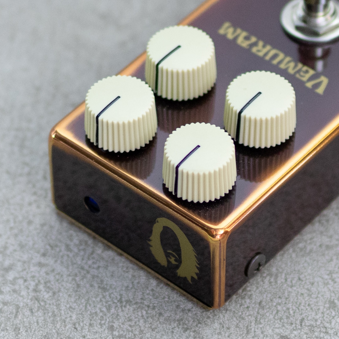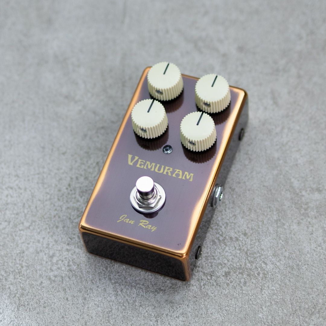 2008年にスタートしたVemuram、日本製に拘り生産されるブティックペダルブランド。マイケル・ランドゥ、ジョン・シャンクスなど、アメリカのトップミュージシャンらによってそのクオリティは証明され、今やハイエンドのトランスペアレント系ドライブの大定番として認められたJan Rayを筆頭に、魅力的なモデルを展開し続けています。本器は2018年に500台限定で販売がされたMateus Asato(マテウス・アサト)シグネチャーモデル。現代の若手ギタリストを代表するMateus Asato氏。長らくペダルボードのレギュラー入りをしているJan Rayは、初めて手に入れた時からすぐに惚れこんでしまったとのことで、ドライブの太さ、明るさ、透明感により既に氏の望む殆どを実現した満足感の高いオーバードライブでした。本シグネチャーでは、ゲインとコンプレッションを僅かに強く調整。より存在感あるサウンドチューニングで、僅かによりエフェクター然としたキャラクターでの仕上がり。無論Jan Rayの特徴であるリッチな倍音感、ギュワっとサチュレーションの効いたドライブが、ピッキングタッチに反応良く挙動するリアルなアウトプット、そしてブラス筐体によるローノイズなど、キャラクターは大きく変えることなく健在。トリマによるSaturation調整もそのまま搭載しています。氏のトレードカラーであるピンクの塗装をコートし、通常のブラスカラーよりほんのり赤みのある上品なルックスに仕上がっています。上面にはアイコニックなシルエットロゴを配置。筐体裏など僅かに極細かなひっかき傷もございますが、全体的に顕著な使用感は感じさせない綺麗な印象。もちろん動作やサウンドには全く問題のなく大変良いコンディションです。中古でもなかなか見当たらない限定モデル、ぜひお見逃しなく。