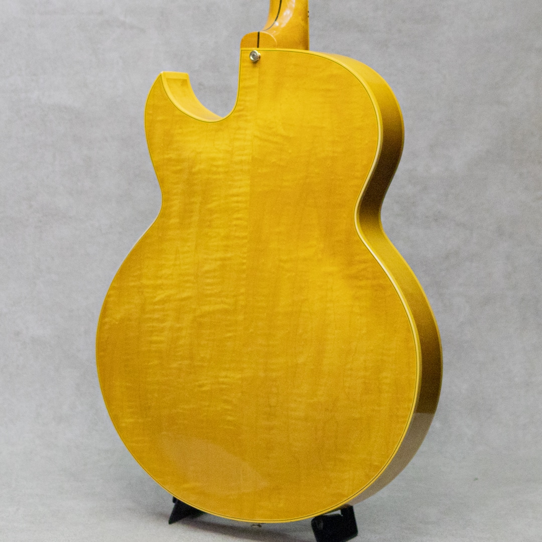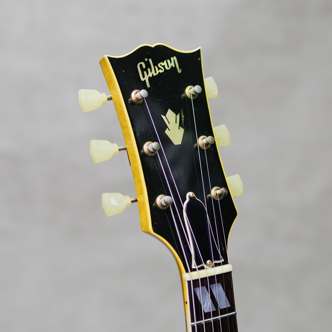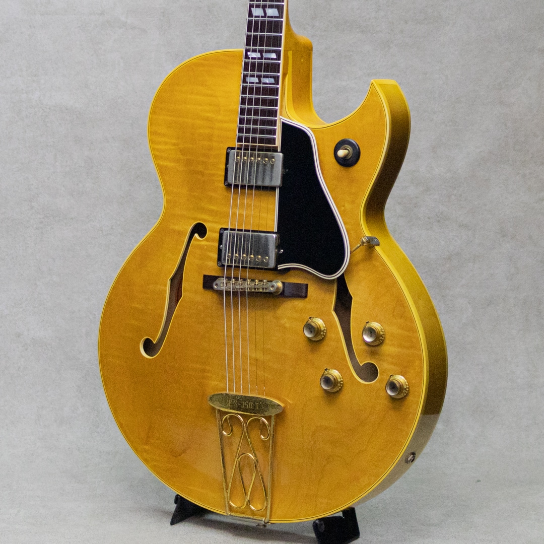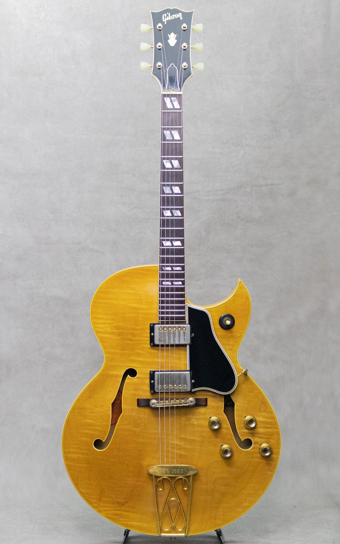 Gibson “ES-350TDN”。ESホロウボディモデルの中位器種として1947年にラインナップされた”ES-350”の後継機種として、1955年にシンボディ・ホロウモデルとしてデザイン変更され1963年まで製造されました。シン・ボディモデルになった際にショートスケール&ナロウストリングピッチへと仕様変更され、差し詰め”Byrdland”のラミネイトトップ版としての認識で知られます。またチャック・ベリーが愛用したことでも広く知られるモデルです。本器は、フローレンタインカッタウェイに変更になった後の”ES-350TDN”。ナチュラルカラーに浮き出るフィギュアド杢が色気抜群のブロンド1962年製Vintage品。全面に浮かぶ縮み杢が美事なゴージャスなラミネイトメイプルを用いたホロウボディ。ブロンドカラーならではのたまらない色気です。セルロイドバインディングのメイプル2pcsネックにハカランダ指板、MOPダブルパラレログラム指板インレイ、Gibsonロゴ&クラウンヘッドインレイ。薄手ながら安心感のあるグリップのネックシェイプを持つ本器。とても弾きやすく、馴染みがグッドです。ピックアップは、オリジナル”P.A.F"の”PU-490”ナロウピッチハムバッキングPUx2が搭載されています。アッセンブリーはもちろん、ABR-1ブリッジ、”ES-350T"刻印テイルピース、ベベルドプライピックガード、エスカッション、ゴールドリフレクターノブなど、パーツはオリジナルをストック。唯一、ペグのみ近年Kluson Deluxeに交換されていますが、経年により質感は伴っており良い印象です。ドライで分離が良く、それでいて艶やかで倍音の乗った素晴らしいサウンドの本器。強弱で出る特有の倍音は、フレーズに色気と表情をもたらしてくれます。オリジナルビンテージ、そしてオリジナルP.A.Fでしか得られないグッドフィールは、弾き出すと止まらなくなる極上サウンドです。フレットはしっかりと交換され残りもしっかりとあり、ネックコンディションもとても良好。ハイフレットまで音詰まりもなくスムースにプレイいただけます。傷も極々僅かのみで、ウェザーチェッキングも派手でなく上品な面持ちです。ネックヒール側面にストラップピン取付埋め痕が見られます。プレイにももちろんですが、このルックスはとても高い満足度をもたらしてくれるでしょう。オススメ度二重丸のコレクタブルビンテージです。オリジナルブラウンハードケース付属