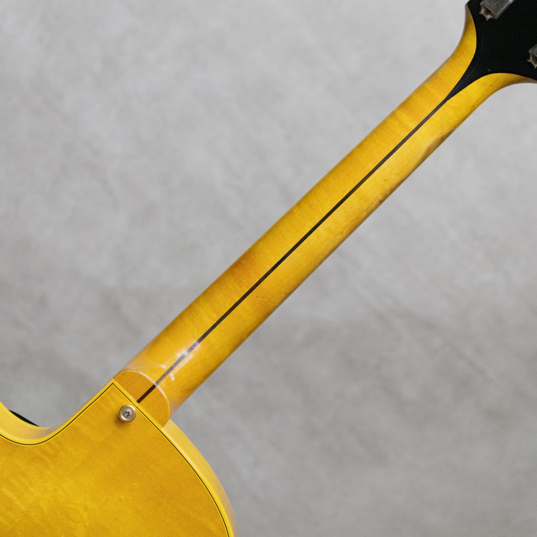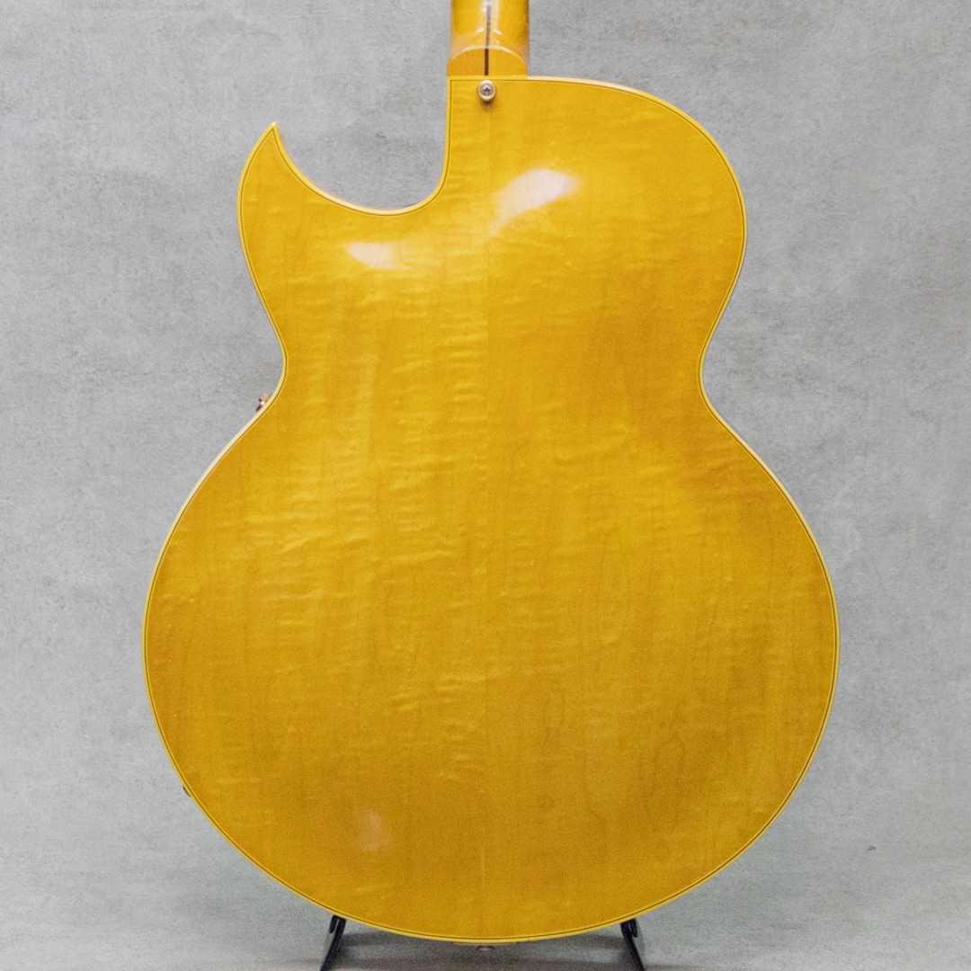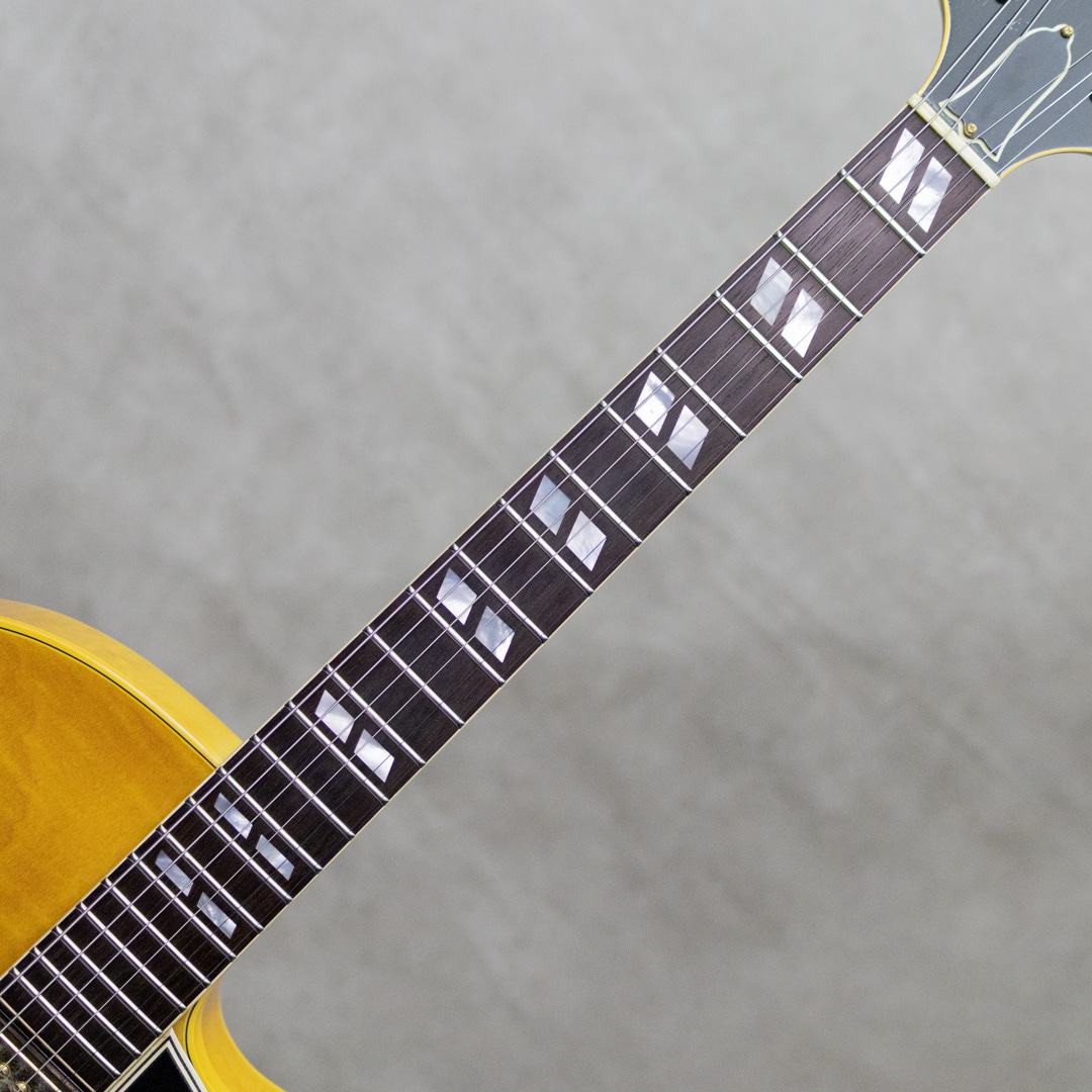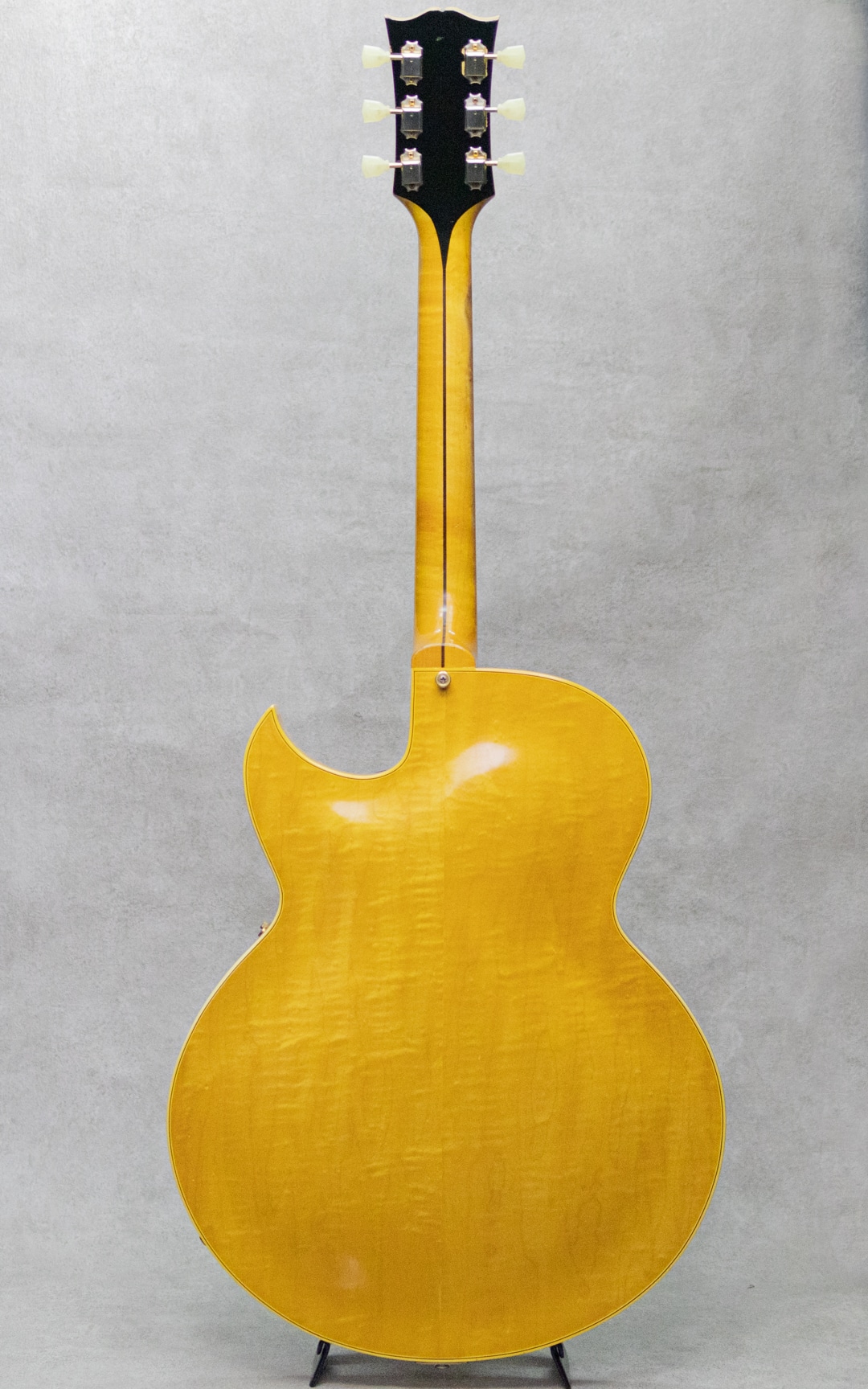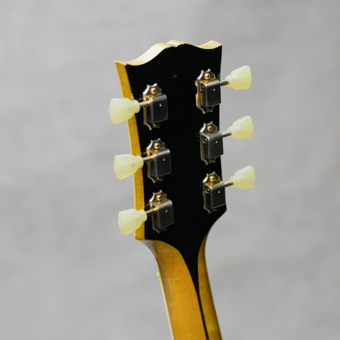 Gibson “ES-350TDN”。ESホロウボディモデルの中位器種として1947年にラインナップされた”ES-350”の後継機種として、1955年にシンボディ・ホロウモデルとしてデザイン変更され1963年まで製造されました。シン・ボディモデルになった際にショートスケール&ナロウストリングピッチへと仕様変更され、差し詰め”Byrdland”のラミネイトトップ版としての認識で知られます。またチャック・ベリーが愛用したことでも広く知られるモデルです。本器は、フローレンタインカッタウェイに変更になった後の”ES-350TDN”。ナチュラルカラーに浮き出るフィギュアド杢が色気抜群のブロンド1962年製Vintage品。全面に浮かぶ縮み杢が美事なゴージャスなラミネイトメイプルを用いたホロウボディ。ブロンドカラーならではのたまらない色気です。セルロイドバインディングのメイプル2pcsネックにハカランダ指板、MOPダブルパラレログラム指板インレイ、Gibsonロゴ&クラウンヘッドインレイ。薄手ながら安心感のあるグリップのネックシェイプを持つ本器。とても弾きやすく、馴染みがグッドです。ピックアップは、オリジナル”P.A.F"の”PU-490”ナロウピッチハムバッキングPUx2が搭載されています。アッセンブリーはもちろん、ABR-1ブリッジ、”ES-350T"刻印テイルピース、ベベルドプライピックガード、エスカッション、ゴールドリフレクターノブなど、パーツはオリジナルをストック。唯一、ペグのみ近年Kluson Deluxeに交換されていますが、経年により質感は伴っており良い印象です。ドライで分離が良く、それでいて艶やかで倍音の乗った素晴らしいサウンドの本器。強弱で出る特有の倍音は、フレーズに色気と表情をもたらしてくれます。オリジナルビンテージ、そしてオリジナルP.A.Fでしか得られないグッドフィールは、弾き出すと止まらなくなる極上サウンドです。フレットはしっかりと交換され残りもしっかりとあり、ネックコンディションもとても良好。ハイフレットまで音詰まりもなくスムースにプレイいただけます。傷も極々僅かのみで、ウェザーチェッキングも派手でなく上品な面持ちです。ネックヒール側面にストラップピン取付埋め痕が見られます。プレイにももちろんですが、このルックスはとても高い満足度をもたらしてくれるでしょう。オススメ度二重丸のコレクタブルビンテージです。オリジナルブラウンハードケース付属