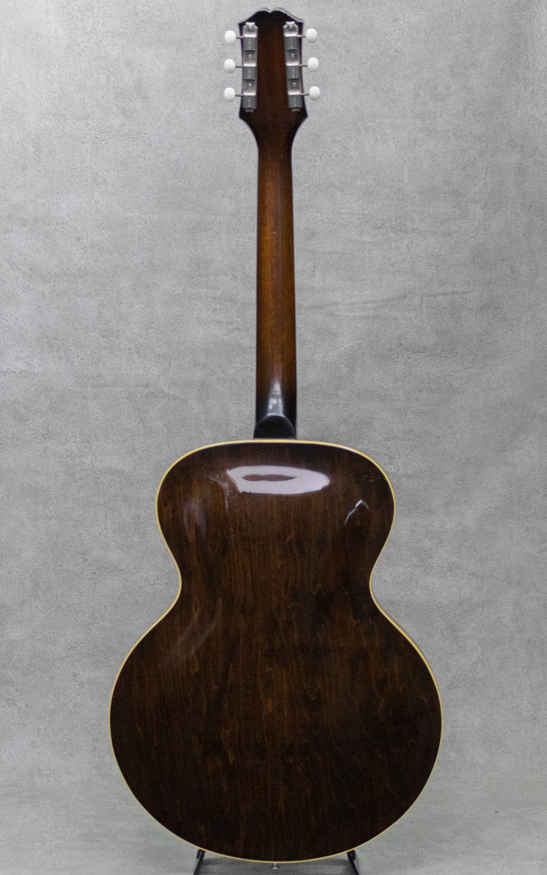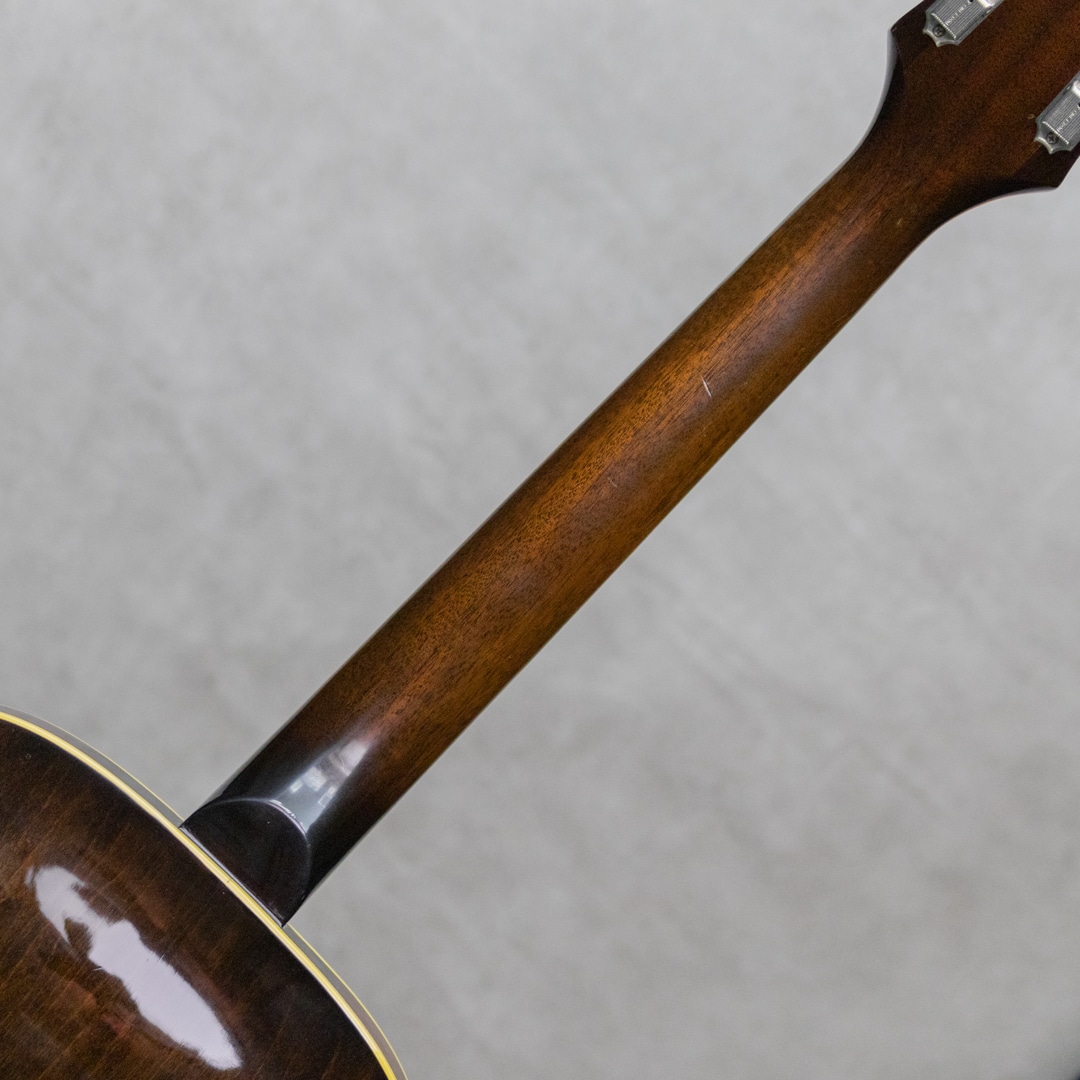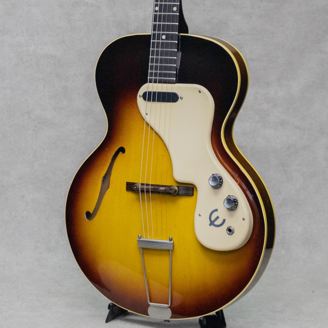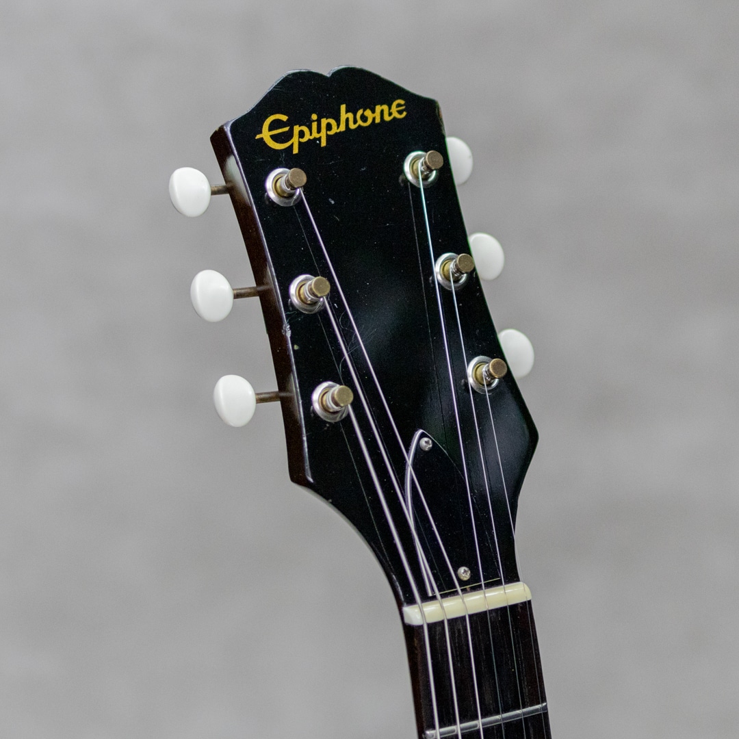 ギリシャ系移民の一家によって始まったEpiphone。20世紀の初めにマンハッタンに居を構えた一家は、マンドリンを始めとした楽器の製造・販売・修理業を住居兼工房の建物で経営し始めます。家業を受け継いだ長男のエパミノンダスは1928年に社名を現在のEpiphoneに改名。1930年代、ブームがバンジョーやアーチトップギターと変遷していく中、ライバルのGibson社としのぎを削りながらも両社は名声を大きくしていきます、しかし大戦中に生産体制に大きくダメージを受けた同社は、その後労働争議等も経て経営的に大きく落ち込む低迷期へと突入。50年代初頭に工房と深く所縁のあったレス・ポール氏はEpiphone救済をGibsonのテッド・マッカーティに進言。1957年同社はGibson傘下となり、翌年には新しいラインナップが展開され新たな道を進むこととなりました。本器は1962年製Gibsonカラマズー工場製の1本、 E444T "Granada"。少し珍しく50'sの雰囲気を残した王道のサンバーストカラーリングが魅力の1本。マホガニーネック/ローズウッド指板/16インチメイプルラミネイトボディ/メロディメーカーピックアップ搭載。最大の特徴は何といっても大きくデザインされたピックガード・アッセンブリで、メロディメーカーPUを備えたちょっとオモチャのような雰囲気が抜群にキュートなルックスを演出しています。GibsonのES-120Tに準じたモデル。P-90よりもクリアな出力のシングルコイルに加え、1Vol,1Toneのシンプルなサーキットは500kΩのポットを使っている為、ボディのアコースティックな鳴りに加えてより歯切れの良い明るく軽快なアウトプットを付与しています。フロント1発ですが、トーンコントロールで幅広く音色を楽しめる隅に置けないぽポテンシャル。ナット幅約43㎜のレギュラーワイドネックは、この年代らしく少し薄めで誰でも違和感なく手に取りやすいシェイプ。アンプラグドでもそれなりに鳴ってくれるため家弾きの一本としてもとってもお勧めです。こちら経年相応のウェザーチェック、ボディバックの打痕などはありますが、塗装の艶を残し一目見て綺麗なコンディションと思わせてくれる良い外観。ロッドの調整を含め良いネックのコンディションで音詰まりなどもなく気持ちよく演奏できます。ハードケースが付属。