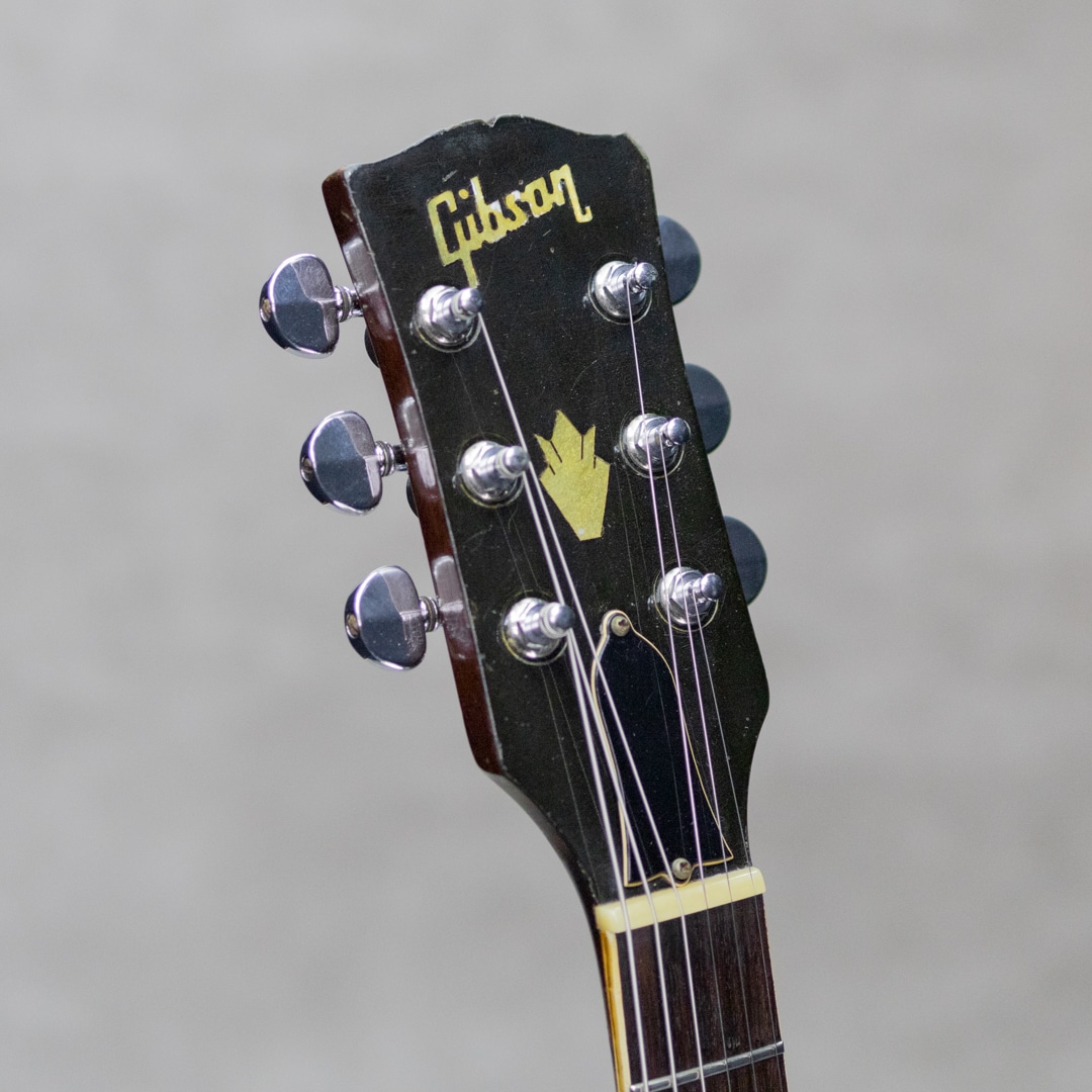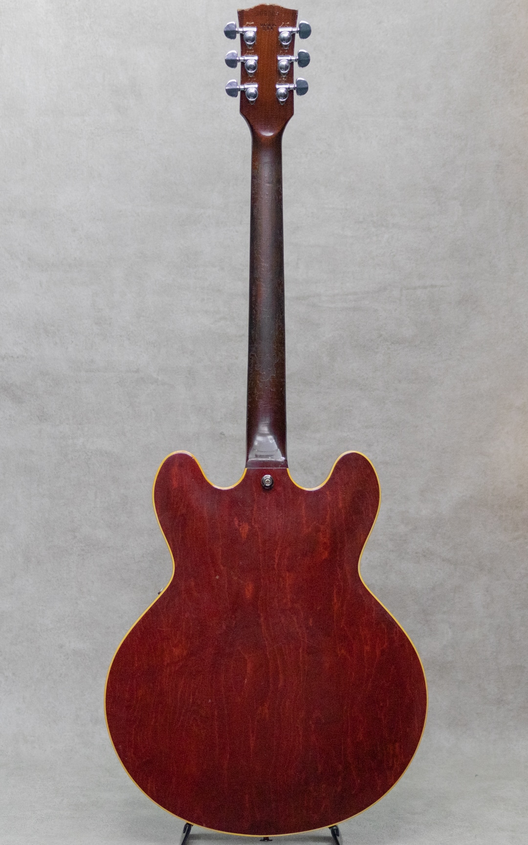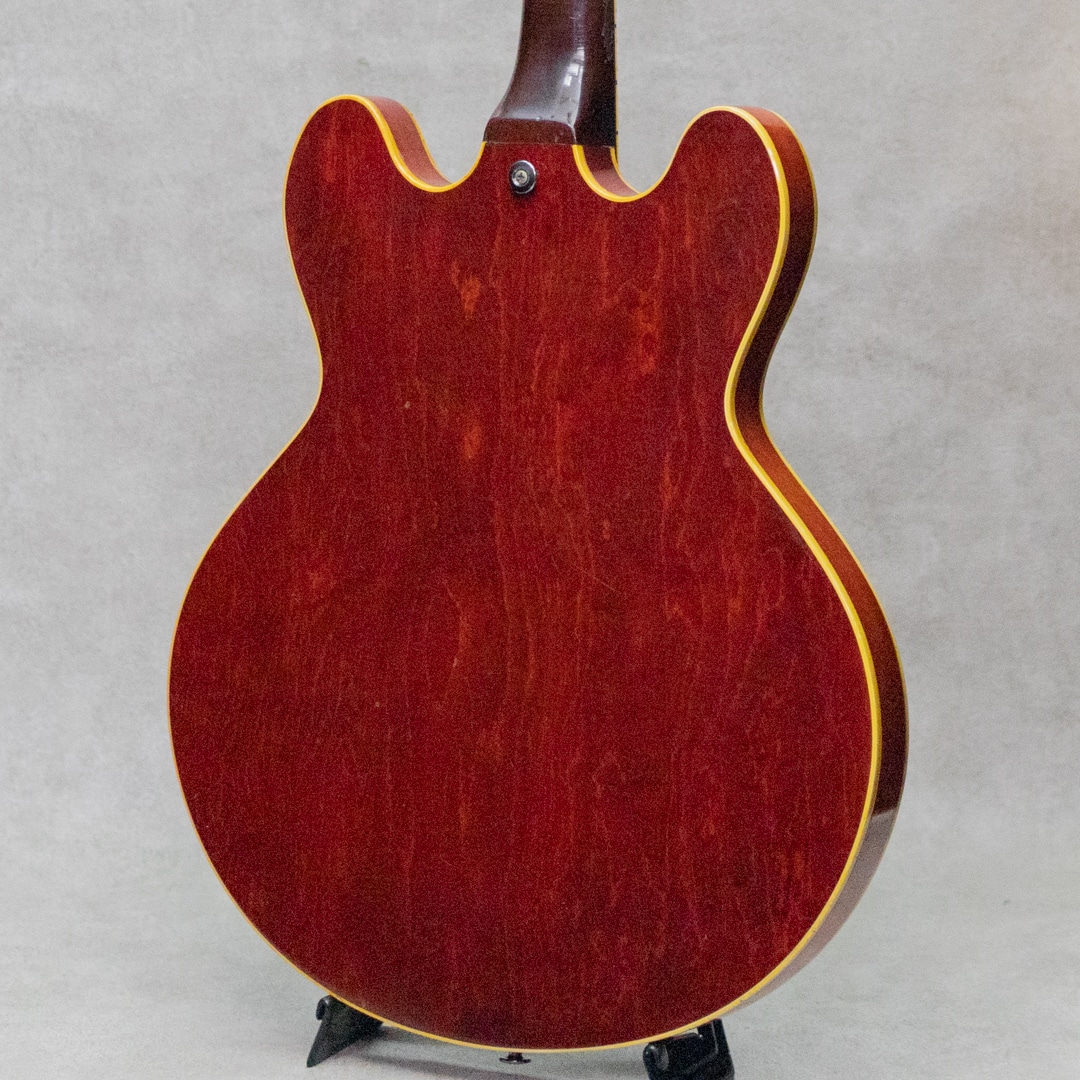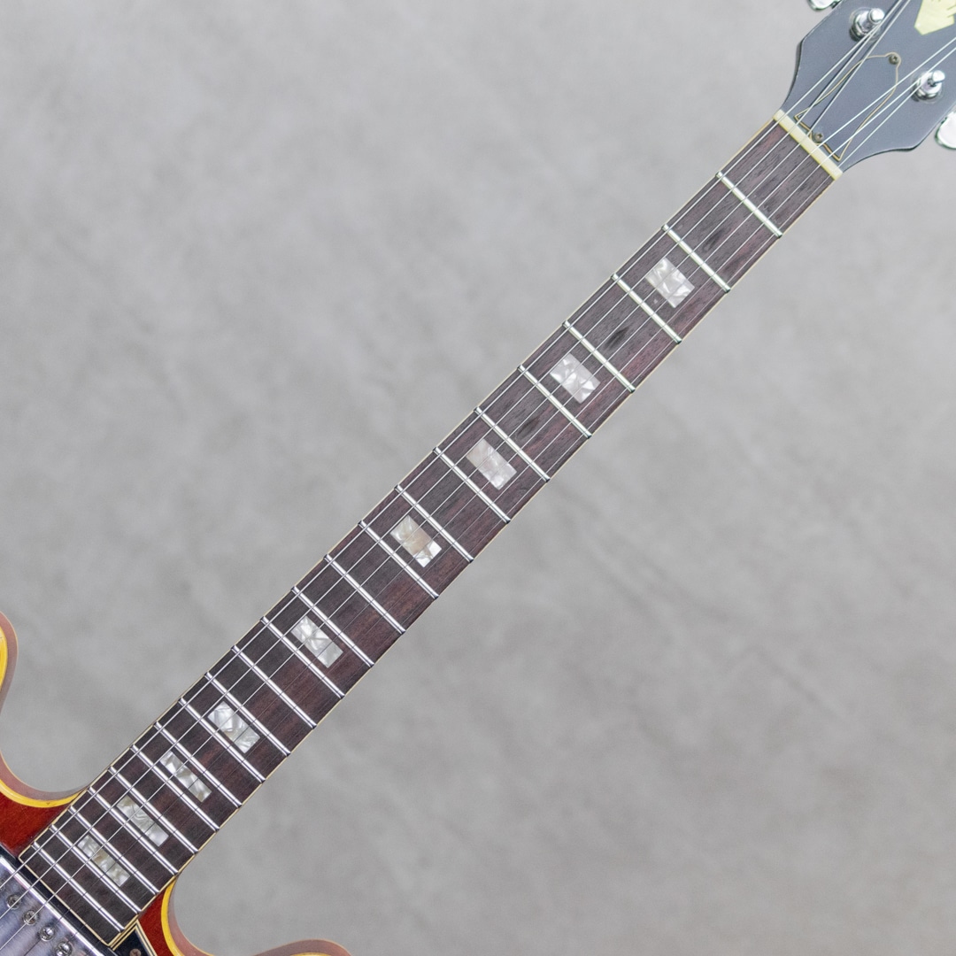 Les Paulに続き、憧れのGibsonエレクトリックとして君臨する王道モデルES-335。"セミアコ"の代名詞としての存在感は言わずもがな、バーサタイルな実用性を伴った完成度から古今あらゆる場面、プレイヤーたちによって愛用され数々の名演を彩ってきたことも絶えない人気の所以です。58年頃の生産開始より、いくつもの仕様変更を伴いながら販売が続けられるES-335。本器は1970年頃製造の一本。本来ブランコテールピースの年式ですが、後年ストップテール仕様にコンバートされており、ルーズな弦テンション感故のこの年式のウィークポイントに対応がなされております。その他製造年に準じた仕様、14度の浅いヘッド角、極々僅かに形成され始めた小さなボリュート、ナローネックは3ピースマホガニー、先端の細いホーン、PUには”ステッカードナンバード”を搭載。センタ‐ブロック中央部の空洞は1弦側が大きく開放され、58年~60年台前半までのソリッドな仕様と比べると、よりエアー感を伴ったトーンが魅力の年代。スリムなネックによる音の立ち上がりスピードや軽快な挙動が大きく特徴的。パワフルながら抜け感のある独特の枯れたサウンドには気を張らない心地よさがあり、元より335の中でも特にキャラクターの立った年式らしい、そのユニークな出力に、より幅広いジャンルへの演奏性、対応力を兼ね備えた魅力的な一本です。搭載の”ステッカードナンバード”に関して、Gibsonでは60年台後半のこの頃よりワインディングマシンに自動停止機構が備えられるようになり、それまでばらつきの大きかったコイルの巻き数が均一化。直流抵抗値の安定に加えてマグネットもアルニコVに統一、シリーズ接続される2つのコイルがより同質化することにより、元来求められたハムキャンセリングの原理が、より安定した製品のレベルに持ち上げられた年台です。この安定した出力もまた、70年台以降、技術的な選択肢が増え多様化していくサウンドメイクやプレイスタイルの幅において、一役買った要素と言ってよいかもしれません。こちらテールピースの追加の他、ペグ、ブリッジサドル、ストラップピンが変更済み。ハンダがかぶっており具体的なポットデイトは確認ができませんが、PU、サーキットはオリジナルコンディション。ピックガードブラケットのキャップボルトがないものの固定に問題はありません。ネック裏の塗装剥がれを中心に、各所小傷やウェザーチェック等相応に貫禄が感じられる経年がございますが、顕著に外観を損ねるものはございません。ロッドの調整を含め良好なネックコンディション、リフレットがされている為良い演奏性で、即戦力的にお楽しみいただけます。カラマズー工場製60'sの空気感を残すヴィンテージ然とした存在感が魅力的な335。ぜひお確かめください。ハードケースが付属。