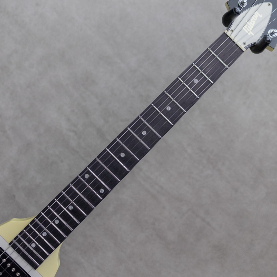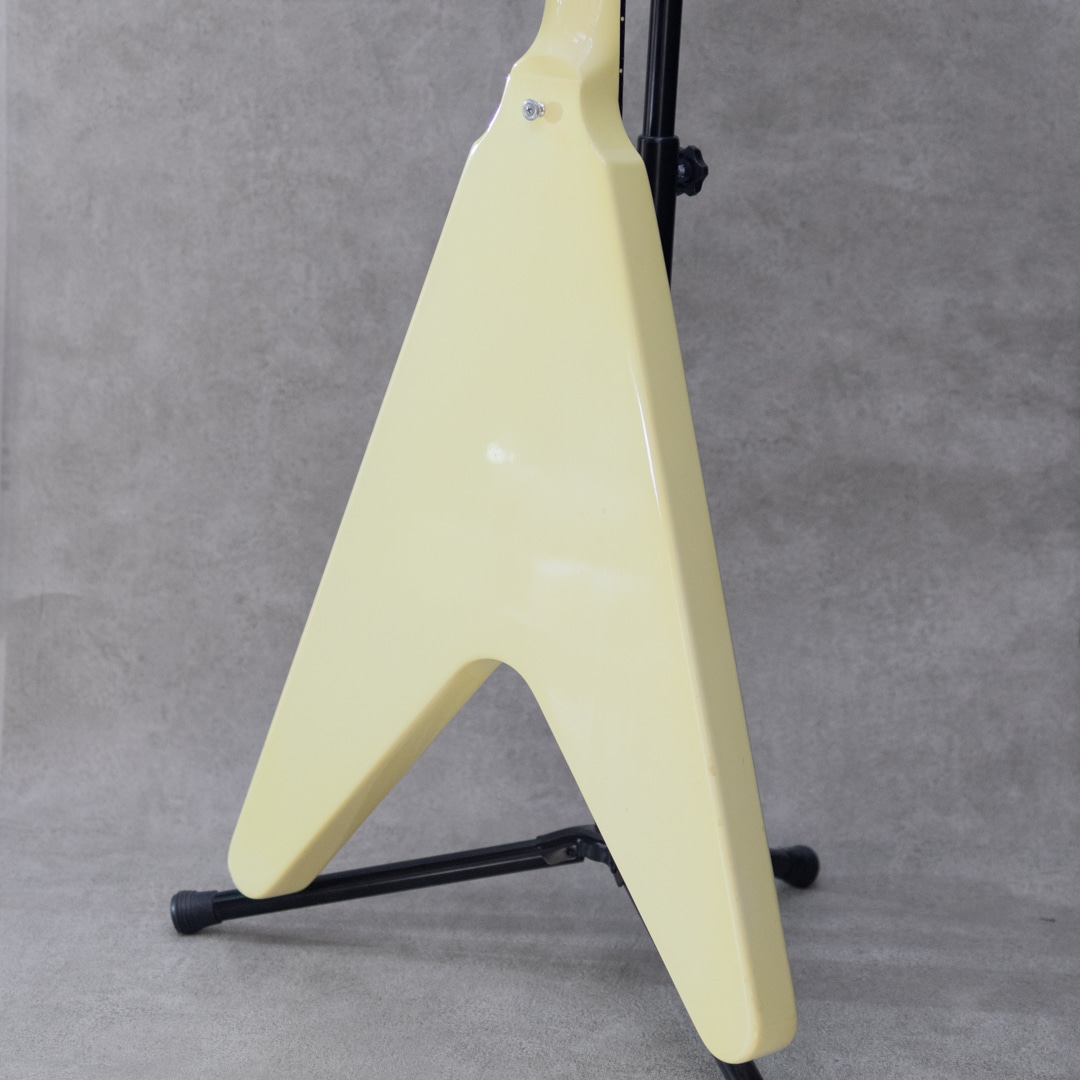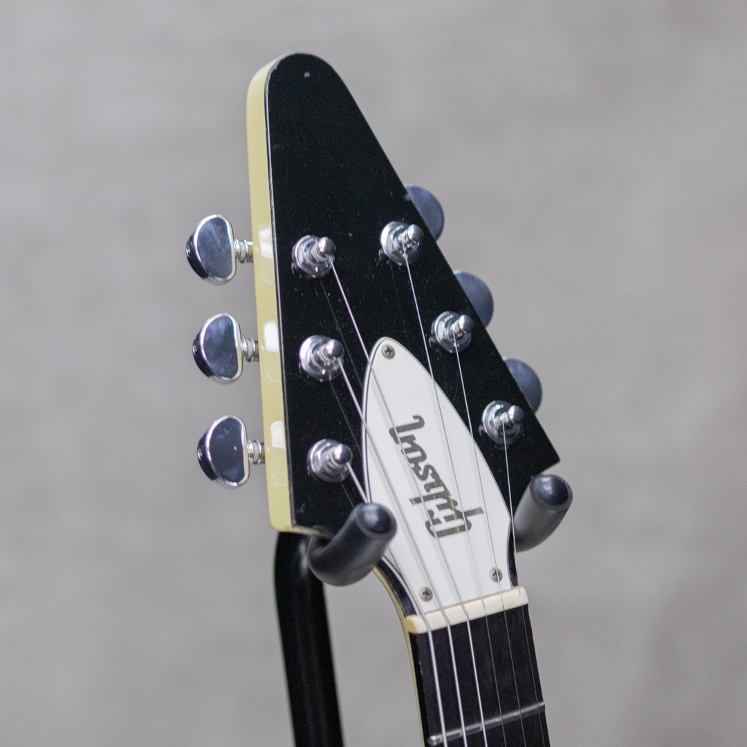 Gibsonソリッドモデルの中としてはもとより、エレキギター全体としても"変形モデル"の代名詞と言えるFlying V。50年代の後半、当時勢いを見せ始めた新興のブランドFenderに牽制をする意味もあり登場。しかし大きくセールスを狙ったプロダクトの位置づけではなかったらしく、その後66年頃に再販がされてからの仕様こそ、メタルギアとしての現代的立ち位置を確立したモデルと言えます。ラージピックガードを採用、ボディデザインが一回り小さくなりネックジョイント位置が変わった所謂"67V"。本器はその年式を復刻、USAラインの定番モデルとして1989年から発売されていたFlying V '67。スリムなネックグリップで演奏性が高く、セラミックマグネットを採用したハイパワーの496R/500Tピックアップとも相まって、ハードロック/ヘヴィメタルには持ってこいのスペック。また、この頃の生産時期ではClassic Whiteにエボニー指板を採用することがあり、本器でもまさしく90年代らしい艶やかなエボニーが使われております。エッジーでシャープな立ち上がりのアウトプットはドライブサウンドを始め、各種エフェクトの乗りも良く、バンドアンサンブルの中でも抜群の抜けの良さが魅力。ペグはグローバーに交換済みで、ルックス・機能性ともにロックなアップデートとなっています。経年なりに塗装の僅かな焼け、細かな打痕、擦れ痕等はありますが、顕著に目立ったダメージはなく良い雰囲気。ロッドの調整を含めネック、フレットのコンディションも良く即戦力の良好な演奏性です。今も昔も変わらぬアイコニックな存在感を放つ"FV"。まずは一本、このモデルからというのも大変お勧めです。オリジナルハードケースが付属。