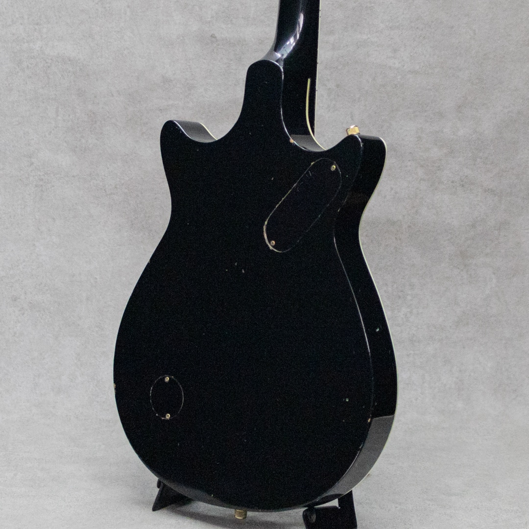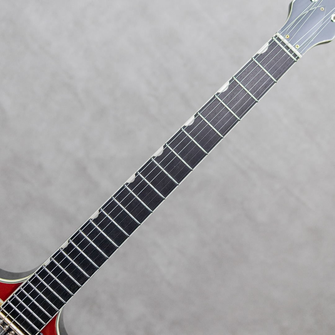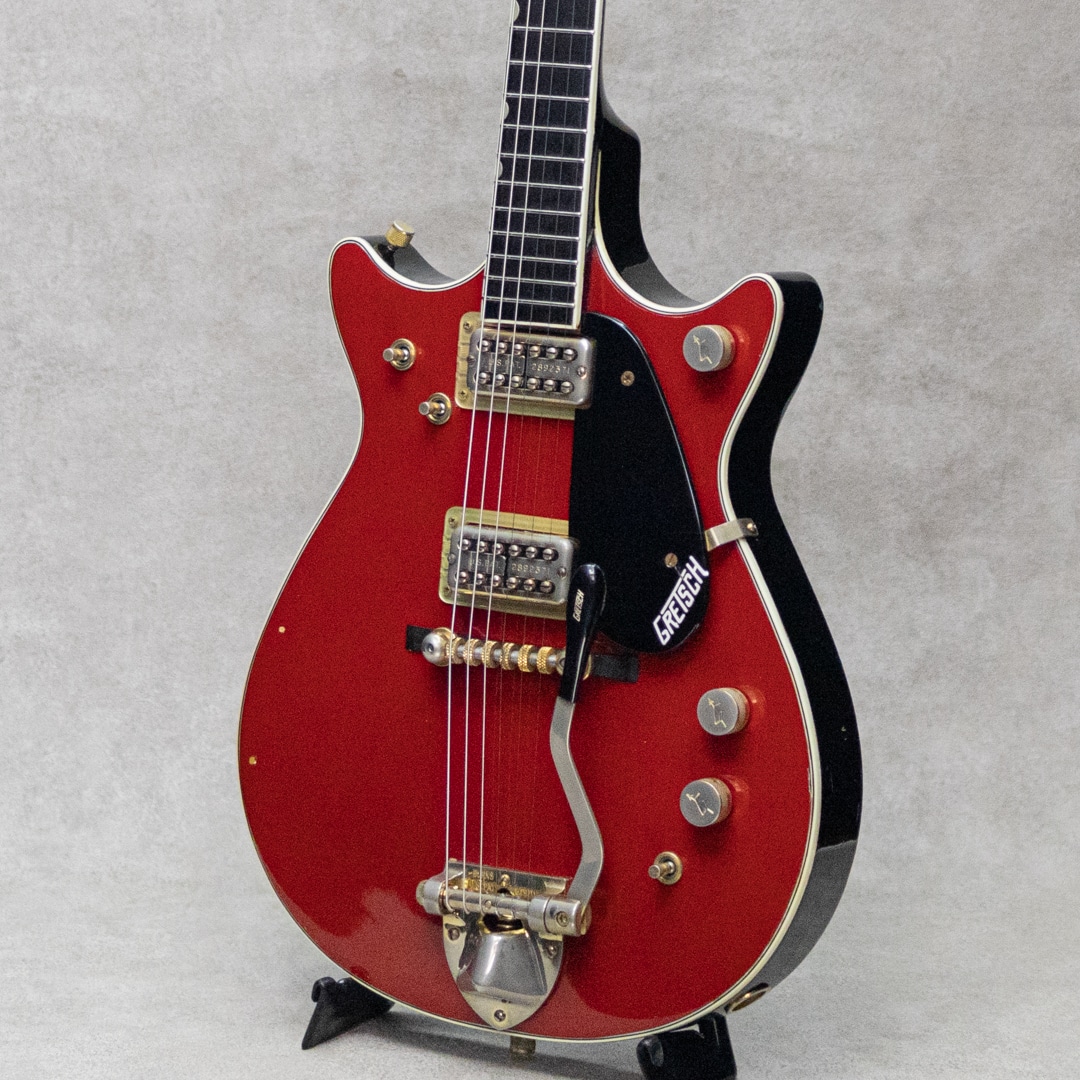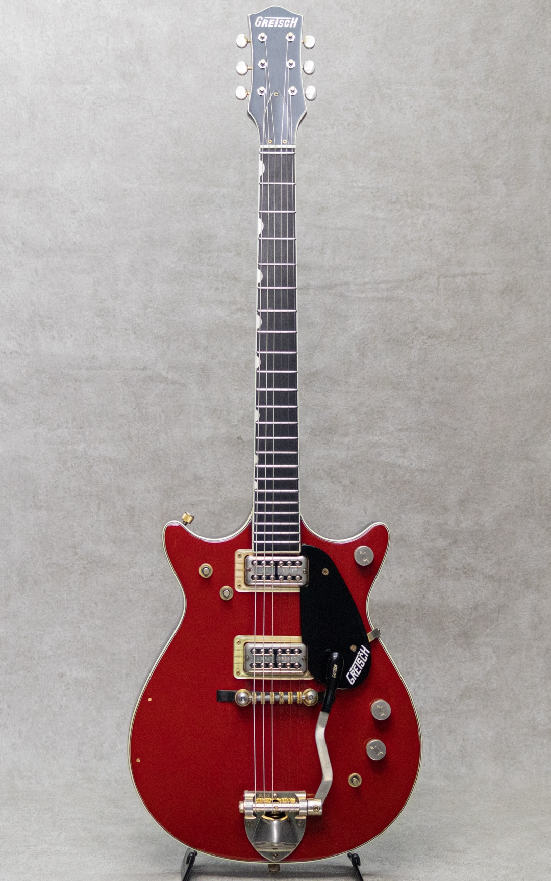 50年代、60年代のGretschエレクトリックモデルを代表する”Jet”シリーズ。Gibson "Les Paul Model"に対抗するかたちで登場し、1953年シングルカットスタイルにてブラックトップの”6128 Duo-Jet”を発売。54年にはスパークルトップの”6129 Silver Jet"、そして55年にはオリエンタルレッドカラーの”6131 Jet Firebird”の登場へと発展していきます。その後1958年にはDeArmondのシングルコイルピックアップからハムバッキングの"Filter'tron"を採用、1961年ダブルカットスタイルへとデザイン変更。完全にソリッド構造の製品開発に舵を切ったGibsonに対し、”Jet"シリーズでは他モデルより中空部を減らすデザインながらに楽器然とした構造に拘りを持ち続けたスペックは、搭載ハードウェアとも相まってグレッチ特有の存在感と魅力を醸成してゆくこととなります。本器はダブルカットスタイルにトレモロを搭載した"6131 Jet Firebird”。1964年製Vintage品。パッと目を惹く赤いボディにゴールドパーツ、独創的な配置された各コントロール類など抜群に存在感を放つルックスは、まさにGretschらしさを助長させ存分に楽しませてくれるモデルです。ピックアップにはGretsch”Filter'tron”x2を搭載。PUでよく使われるアルニコマグネットではなくフェライトマグネットを使用したこのPUは、より高音域のクリアで歯切れの良い出力が特徴的で、ホロウ構造を持ったボディの響きとのマッチングにより迫力と厚みのあるグッドサウンドを紡ぎ出します。いくらかの小傷や若干の打痕は見られますが、大きく損ねるダメージはなく良好な本器。ネックの状態も良好で、近年にリフレットされておりプレイコンディションも良くまだまだ安心してお楽しみいただける1本。ダブルカットスタイルにバーンズトレモロが目を惹く1本。是非お手元でお楽しみください。オリジナルハードケース付属