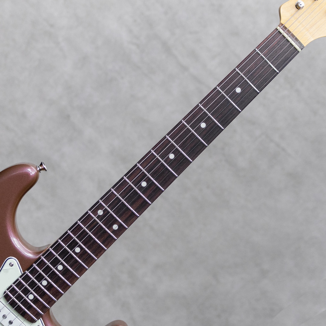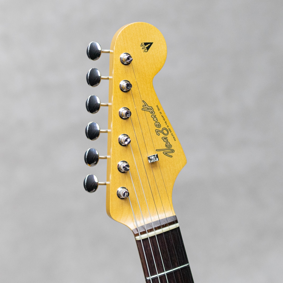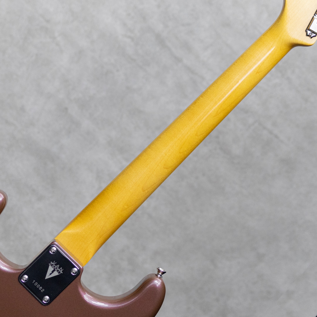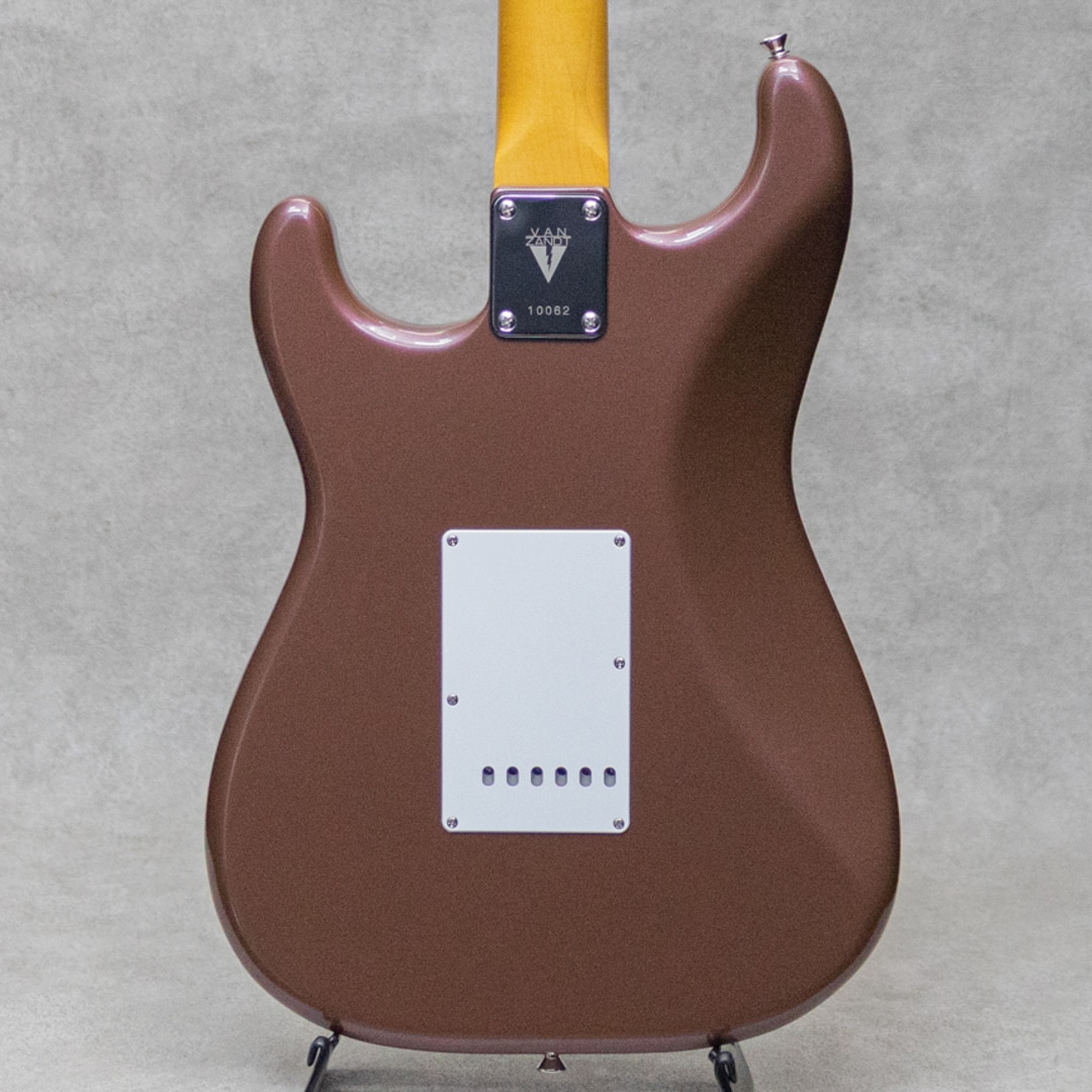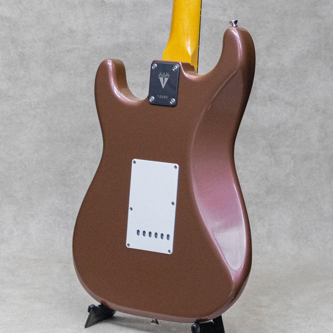 “Neo Vintage”を感じさせる”Vanzandt”。数多くのミュージシャンから愛されたテキサス生まれの”Van Zandt”ピックアップを搭載し、国産の確かな技術で作り上げられるギターは、その価格以上のクオリティを感じずにはいられない実力派ギター。本器は60年代モデルを踏襲した”STV-R2 Burgundy Mist”。ピックアップに"Van Zandt” TrueVintage&Bluesを搭載したショップセミオーダーモデル。アルダー2pcsボディ、クオーターソーン目取りのメイプルネックにインディアンローズウッドスラブ指板のウッドスペックといった王道スペック。ネックグリップは22フレット仕様の60 Style Oval Cシェイプで、厚すぎず薄すぎない弾き心地の良いネックシェイプ。通常モデルのピックアップは”Van Zandt”Bluesx3が搭載されておりますが、本器にはフロントPU&センターPUに”Van Zandt”TrueVintageを、リアPUには”Van Zandt”Bluesを搭載。トーンコンデンサーにはヴァンザントオリジナルレプリカコンデンサーを使用。フロント・センター時のクリアで乾いた響きは、より奥行きのあるベルトーンを思わせるレンジの広い響きで、リア時のパンチのあるミッドの効いたサウンドはドライブサウンドにも持ってこいです。より繊細で表現力のあるフロントやハーフトーンでファットでメロウなトーンから、エッジの効いたアグレッシブなパワー感の得られるリアサウンドまで幅広いサウンドメイクを可能にしてくれる1本です。