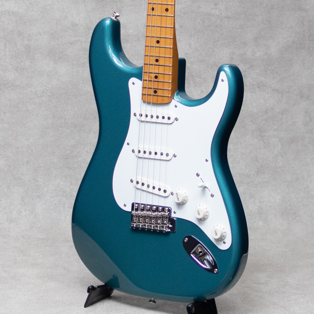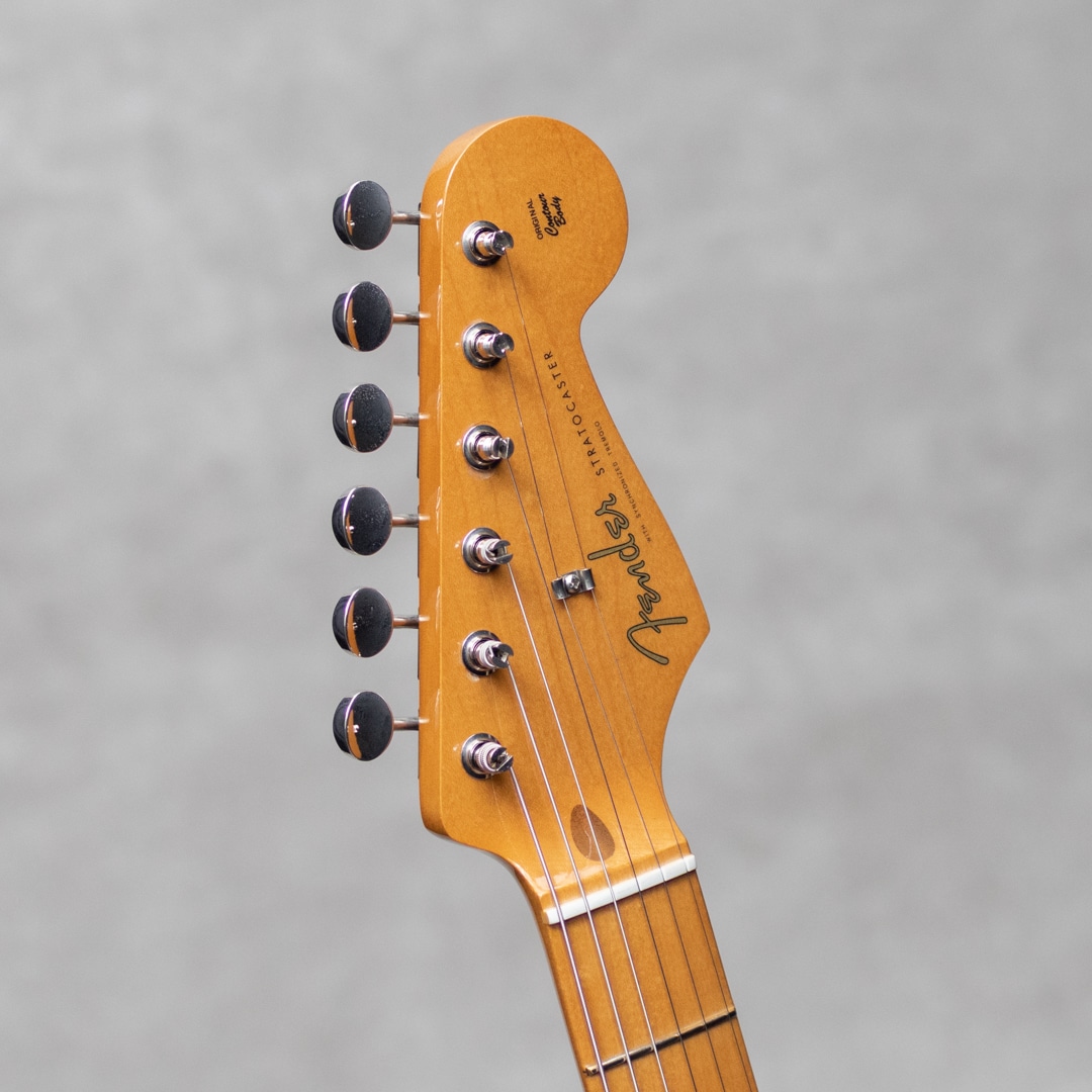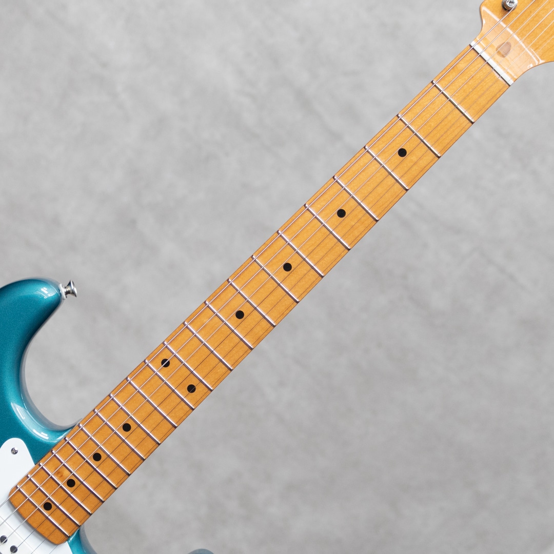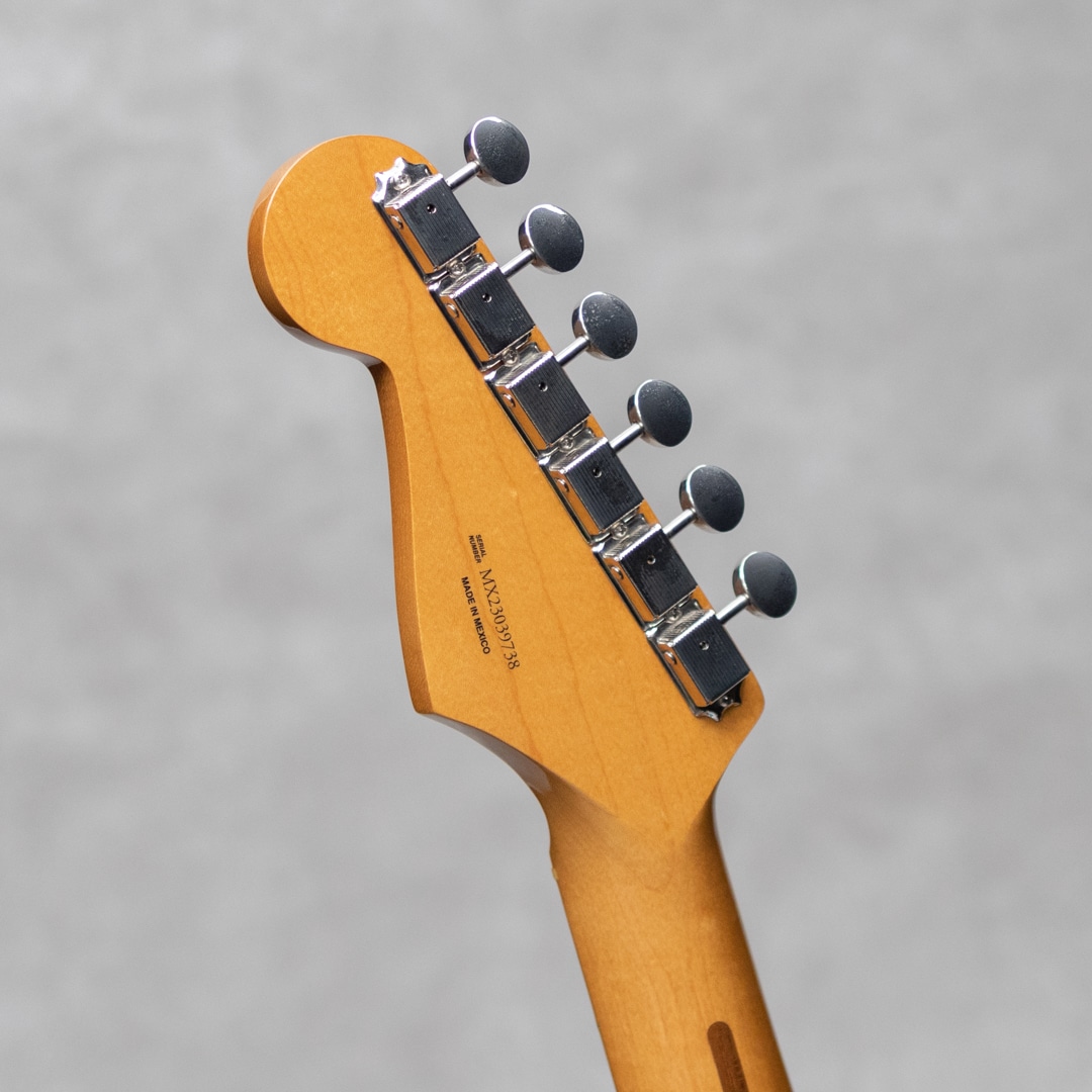 1986年に誕生した”American Standard Series”。時代の流れを汲みながら進化してきたUSAの核となるシリーズで、上位モデルとして”Plus”モデルや”American Deluxe”などが派生しラインナップされていきます。現在は”American Professional Series”へと続きまだまだ進化を遂げるモダン・レギュラーフェンダーのコアライン。本器は、”American Standard Stratocaster Burgandy Mist Metalic/Rosewood Matching Head”。FSR(Factory Special Run)にて限定発売されていた美しいバーガンディカラーのマッチングヘッドモデル。1995年製USED品。アルダーボディ、サテンフィニッシュのメイプルネックにインディアンローズウッドスラブ指板の定番ウッドスペック。ストラト系譜より産まれた純血のモダンモデル。9.5”R指板のつば出し22fネックに2ストリングガイド、2点支持のアメリカンスタンダードトレモロ、ダイカストサドルを装備。アメリカンスタンダードピックアップx3、0.022uFフィルムコンデンサー搭載。トーン回路は、フロントトーンとミドル・リアに配線されたTBX回路が搭載されています。モダンながらしっかりと受け継ぐフェンダートーン。ブライトで軽快なカッティングサウンドから、しっかりとコシのあるロックなフィールまで、しっかりと網羅してくれます。キャビティ内は導電塗料でシールディングもされており、積極的にサウンドメイクもしていただけます。ヘッド部の極小の塗装チッピングや若干の小傷が見られますが、30年近くの経年感を感じさせないグッドコンディションの本器。ネック裏に塗装のヒビ割れが見られますが、現在はしっかりと補修され引っ掛かりなどもなくプレイいただけます。塗装や金属パーツも光沢を保っておりとてもキレイな印象です。プラスチックパーツも経年で焼けて良い雰囲気。ネックまわりも良好で、ネックトラスロッドも正常に機能し低いアクションでセットアップできております。クールな外観と操作性の良いレギュラーモデルのストラト。ガンガンプレイいただきたい1本です。ブラックトーレックスのフェンダーハードケース、オリジナルトレモアームが付属します。