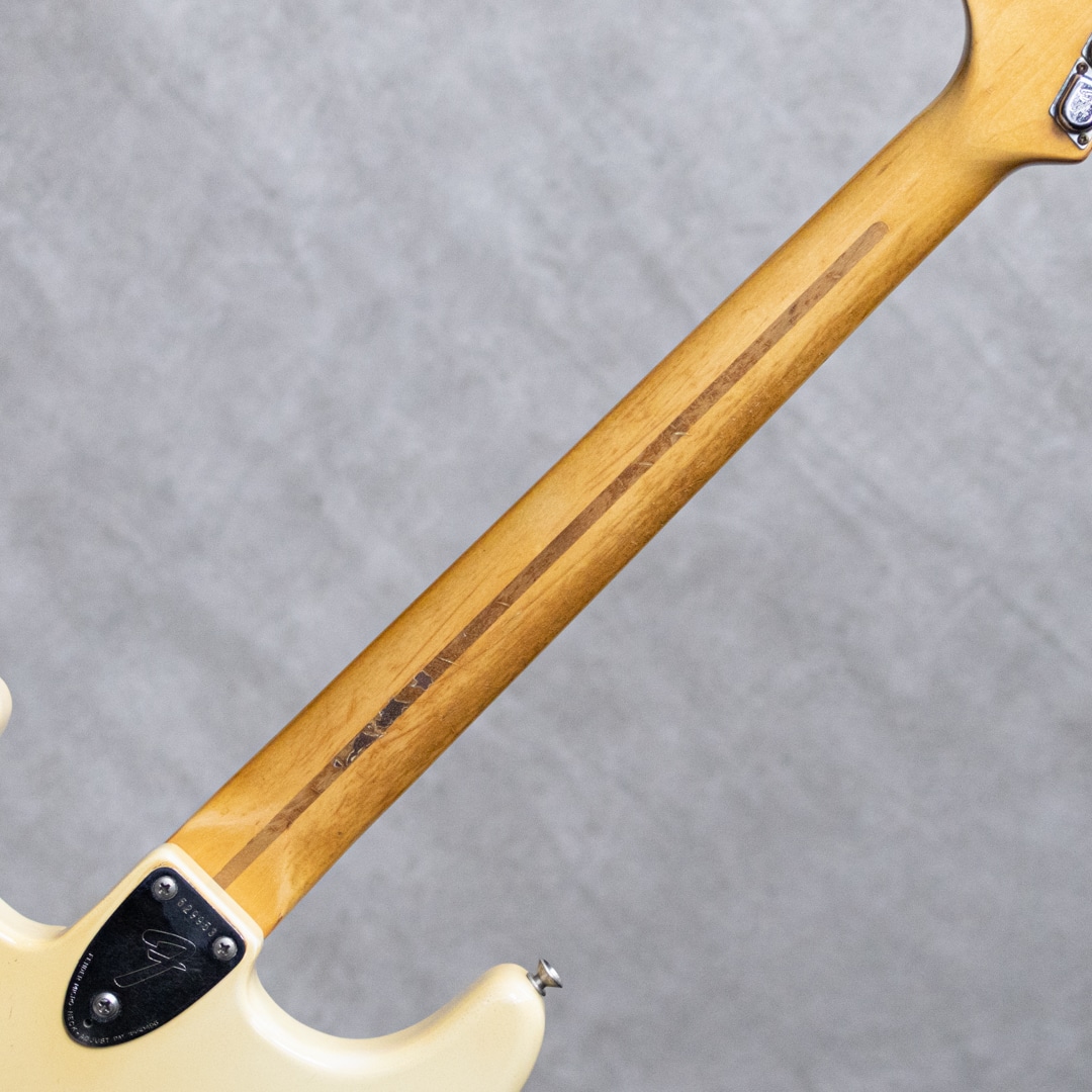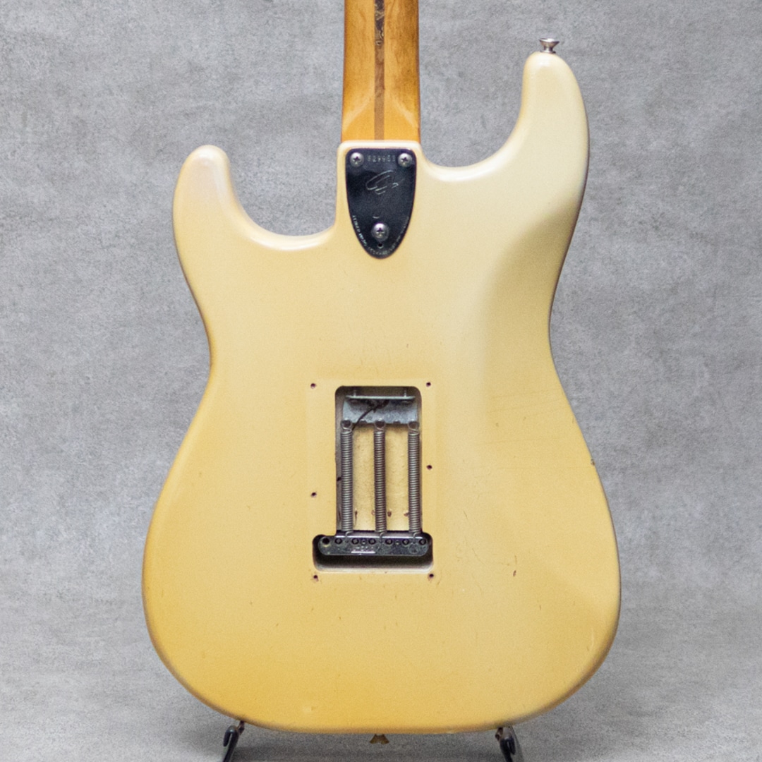 ラージヘッド&モダンロゴ、メイプル指板の70s"Stratocaster”。マイクロティルトを備えた3ボルトネック、2ストリングガイド、ダイカストブリッジなどの特徴を持つ70年代初頭〜中期仕様の1本。本器は、1974年製Vintage品。スタッガードポールピースを持つピックアップの最終年の1本。アルダーボディ、フラットソーン目取のラージヘッドメイプルネック&指板、モダンロゴ。ネックシェイプは少し薄手のCシェイプで、過去にリフレットがされており指板面は丁寧にリフィニッシュされて作業されています。フレット残りもしっかりとありネックコンディションもとても良好で音つまりなどもなくプレイいただけます。1974年デイトのグレイボビンPUx3、イエローダイムセラミックディスクコンデンサー搭載。POTは73年45周目のデイトで、VOL POTのみ86年デイトのものに交換されています。また、PUセレクターは5wayに交換されています。“F"ロゴペグ、ストリングガイド、”F"ロゴネックプレート、ダイカストトレモロアッセンブリーとダイカストサドルなどのハードウェアはオリジナルをキープ。ピックガードやコントロールノブ、スイッチノブなどもオリジナルのままをストックしています。ハリのあるロックサウンドがグッドな1本。芯のあるアタックと歯切れ良いサウンドでもたつきを感じさせません。それでいて耳障りでなく倍音の乗ったトーンは経年ならでは。軽快なカッティングから、ロックでパンチのあるサウンドまで、ストラトらしい魅力をしっかりと感じさせてくれます。全体的にいくら下の小傷や使用感は伺えるものの、金属パーツの錆や塗装のクスミはほとんど見られず、良い状態を保った本器。ネック裏に少し塗装剥がれが見られますが引っ掛かりなどは感じにくく良好です。まだまだ現役で弾き頃のビンテージストラト。要チェックください。同年代のブラックトーレックスハードケースと、トレモロアームが付属します。