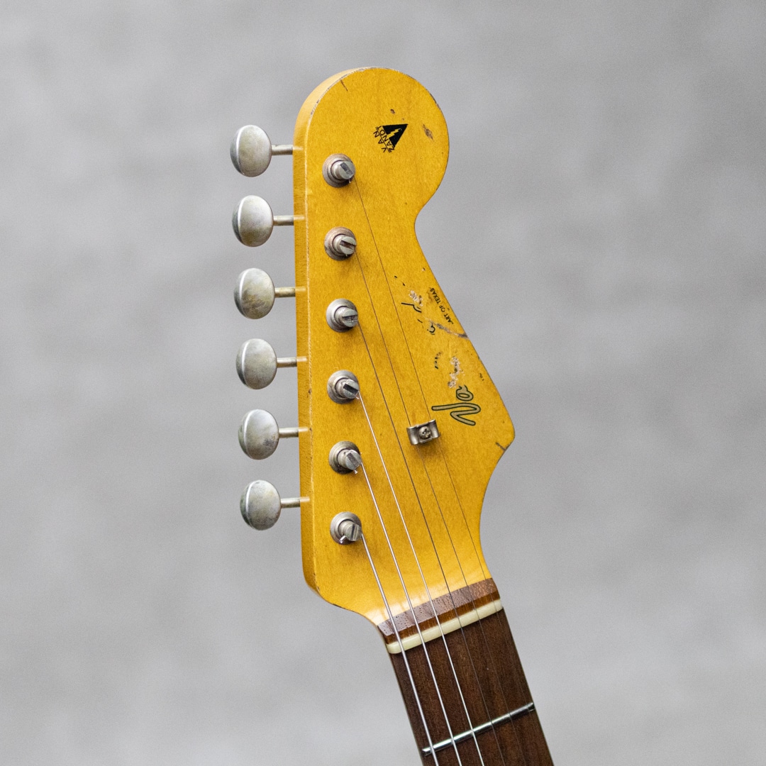“Neo Vintage”を感じさせる”Vanzandt”。数多くのミュージシャンから愛されたテキサス生まれの”Van Zandt”ピックアップを搭載し、国産の確かな技術で作り上げられるギターは、その価格以上のクオリティを感じずにはいられない実力派ギター。本器は60年代モデルを踏襲した”STV-R2 Lake Placid Blue”にヘビーエイジドモディファイを施した2017年製極上USED品。アルダー2pcsボディ、スラブローズ指板のウッドスペックといった王道スペックで、指板材には良質なマダガスカルローズウッドが使用されています。ネックグリップは22フレット仕様の60 Style Oval Cシェイプで、厚すぎず薄すぎない弾き心地の良いネックシェイプ。ピックアップには”Van Zandt”Bluesx3が搭載されており、トーンコンデンサーにはヴァンザントオリジナルレプリカコンデンサーを使用。トーン回路がフロント、ミドル・リアの配線にされており、奥深く柔らかく艶やかでレンジの広い音色がとても気持ち良い1本です。当店にてヘビーエイジドモディファイを施しており、長年激しく使い込まれたような貫禄めいた渋みのあるルックス。フレットもリファインしており、低い弦高でハイフレットまで音詰まりなくプレイいただけます。”Vanzandt”ギターはカラー塗装の下にキャビティ内のシールディング塗装も施されており、追加したピックガード下のアルミシールドと相まって、シングルながらノイズレスなセットアップ。アーミング時の安定性を望み、ゴトーマグナムロックチューナを使用。またトレモロスプリングには、定評かつ高評価な”Raw Vintagw”PVTS-1を使用して、程よいアタックレスポンスとレンジ感を持ち合わせます。ハードエイジド加工も相まって外観はもちろん、サウンドも程よい艶加減と音抜けを体感でき、使えるビンテージモデルとして仕上がっています。実戦向きかつ良い質感のルックスと個性ある存在感のギターをお探しの方、またビンテージギターユーザーさんの普段弾き用持ち出し用にもオススメの1本です。オリジナルソフトケース、オリジナルトレモトアーム付属