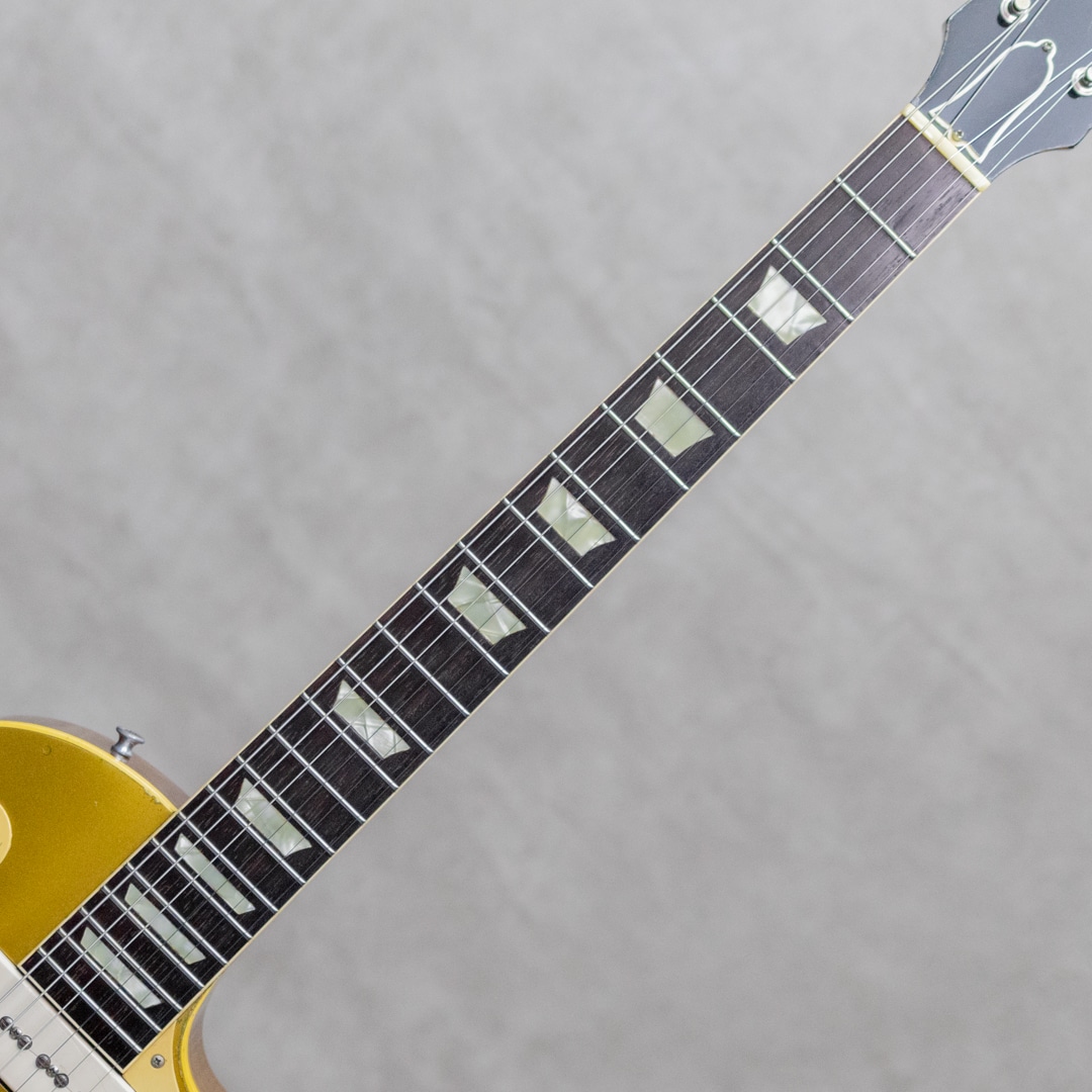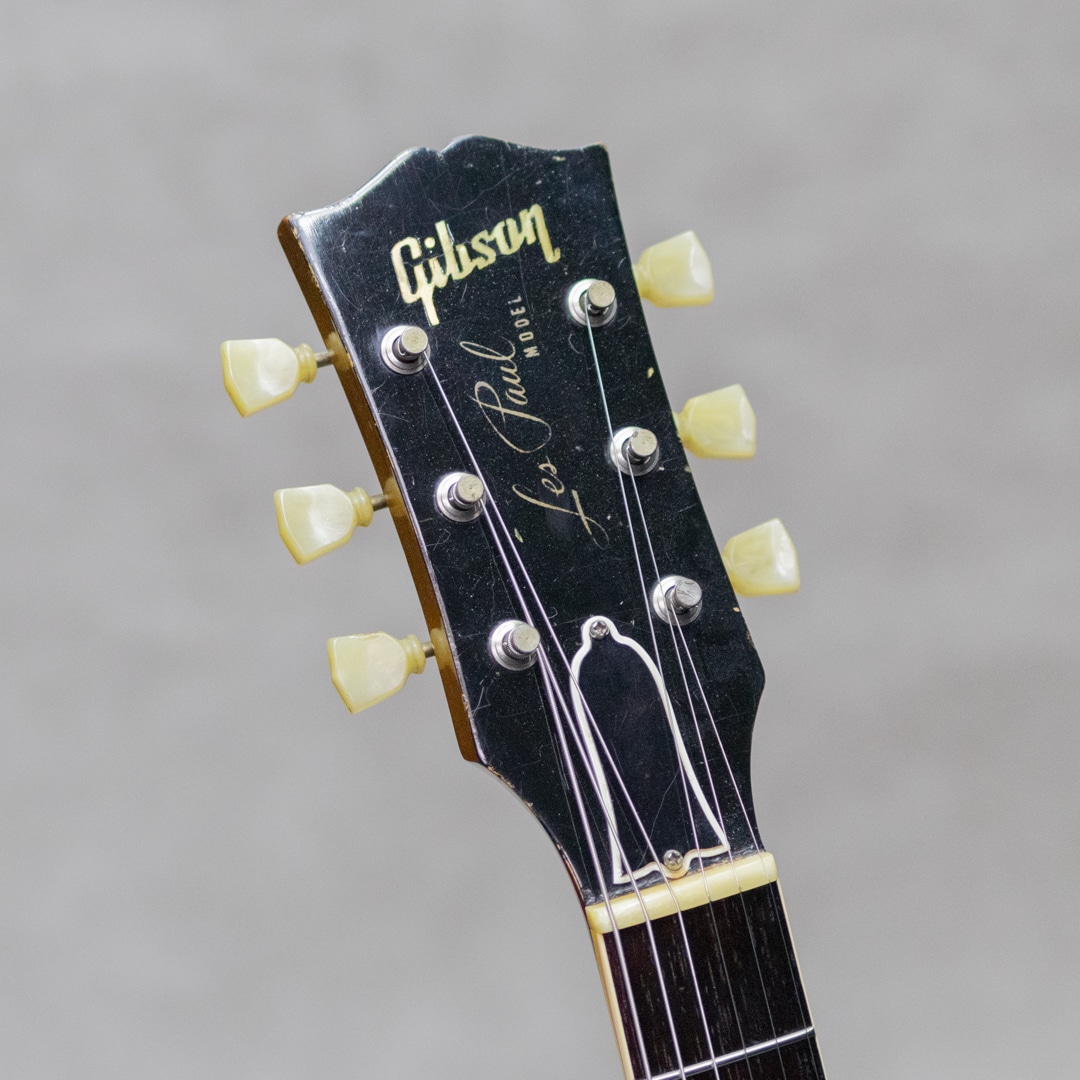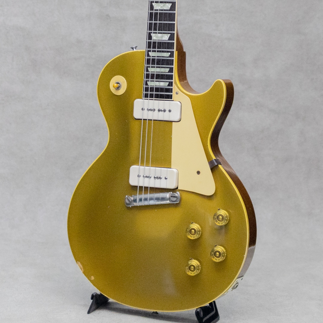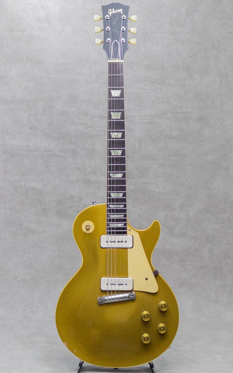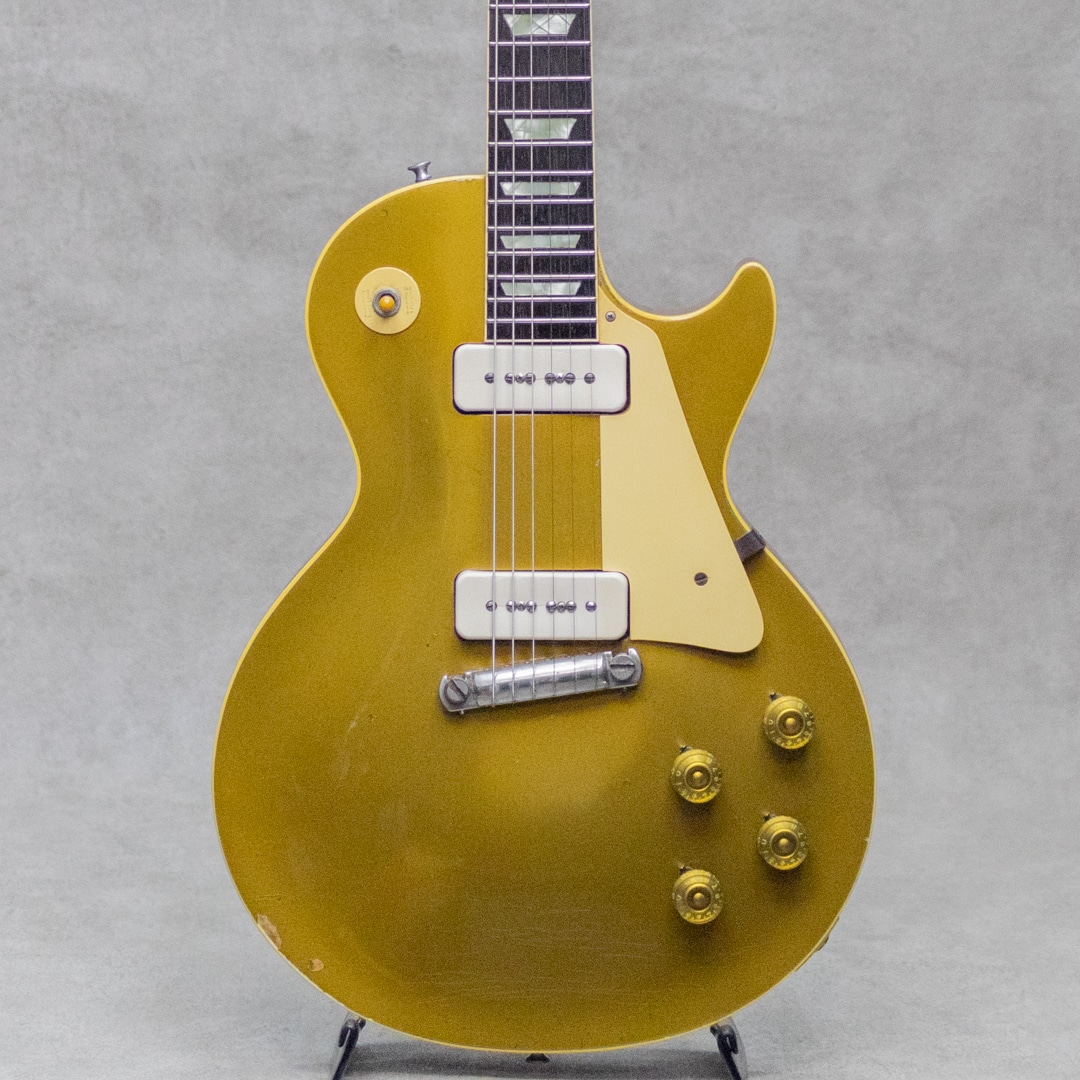 ギタリスト・発明家としても知られるギター史における殿堂入"Les Paul"。1952年登場のシグネチャー"Les Paul Model"は、その後のギターロック勃興と共にエレキギターのスタンダード、王道として認知されるまでに至りました。本器は、登場当初のP-90搭載時期、トラピーズスタイルからラップアラウンドのスタッドコンビネーションブリッジへと変更がされた時期の"Les Paul Model"1955年製Vintage品。メイプルトップにブラスパウダーを使用したゴールドトップと艶やかなハカランダ指板とのコントラスト、大きく板目に取られ杢の揺らぎが美しいマホガニーバック、この時期までに見られる特徴的な"Lower Logo”など、ふと目にしただけで感じられる貫禄抜群のルックスです。極僅かにソフトVのようなネック裏頂点を感じるネックプロファイルはしっかりとした握り応えがありつつも、決して太すぎることなく手に馴染む程よいネック。フレットは目立ったへこみなどなく各ポジションで音詰まりなく気持ちよくプレイ可能です。"P-90”ピックアップ、POT、"Gray Tiger”コンデンサなど、アッセンブリーはオリジナルパーツを保っており良好。丁寧に手加工で成形がされたことが見て取れるアルミ製のバーブリッジ、53年頃から薄いデザインに変更となった雰囲気あるゴールドスピードノブ、アメリカンミッドセンチュリーらしいデザインセンスのピックガード。"No Letter"クルーソンチューナーは1弦のみ他と異なるものが装着されていますが、Early 50sクルーソンが装着されて、それぞれ経年具合に差異はありません。ネック裏に塗装修正が見受けられますが、厚塗りの感じもなく丁寧な補修がされています。厚みのある倍音感、甘くギュッと深みのあるミドルのトーンが、気持ちの良いサスティーンで響くグッドサウンド。タッチレスポンスにはマテリアルと経年から成る程よい枯れ感も感じられ、まさに50's Gibsonらしい空気感、"Les Paul Model"たる存在感とを存分にを楽しませてくれます。経年による塗装ウェザーチェッキングや、塗装の剥がれた箇所から覗かせる緑青がオリジナルならではの色気と存在感を感じさせる本器。大きな傷みは見られず丁寧に扱われてきたことが伺える良好なコンディションの1本。ネックまわりも良好で演奏性もばっちりです。良いルックスと良い演奏性で楽しめる説得力抜群の本器。是非お手元でご体感ください。5ラッチのオリジナルブラウンケースが付属します。その他修理履歴など詳細はお気軽にお問い合わせください。