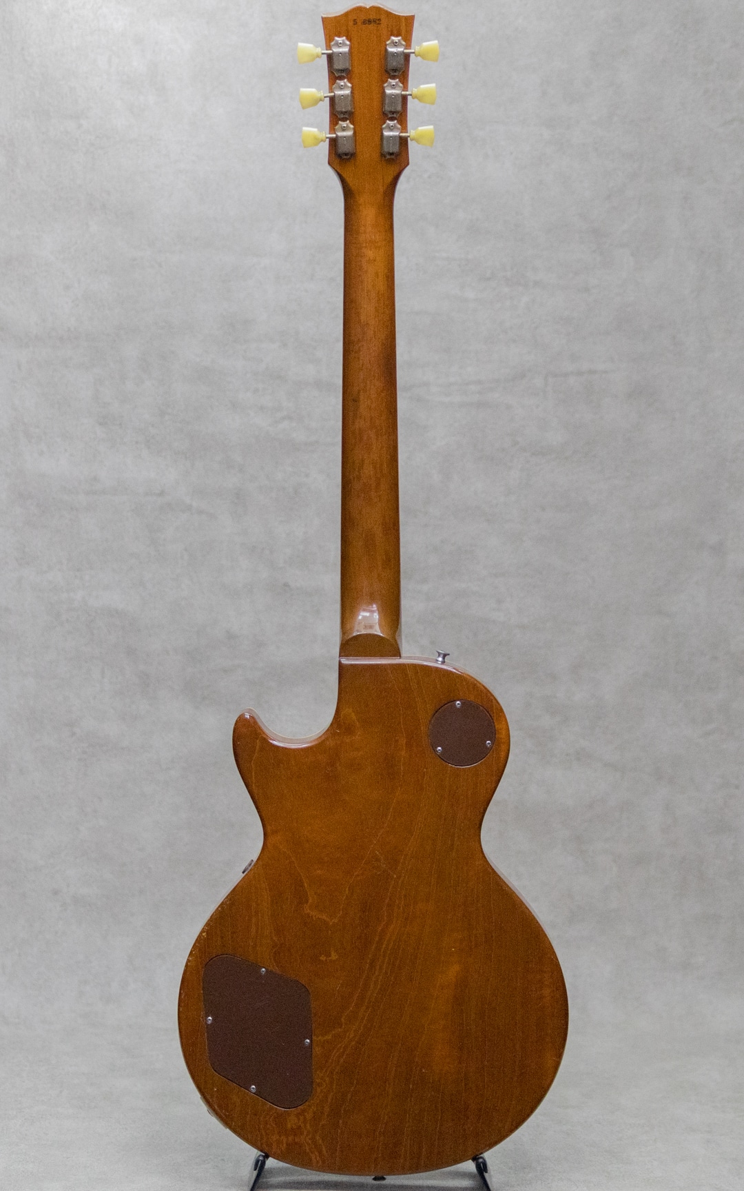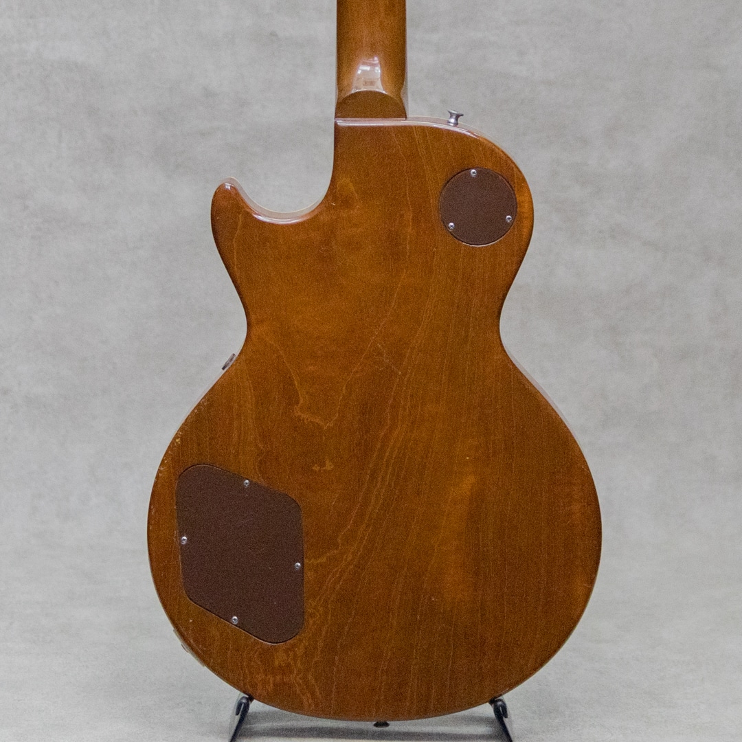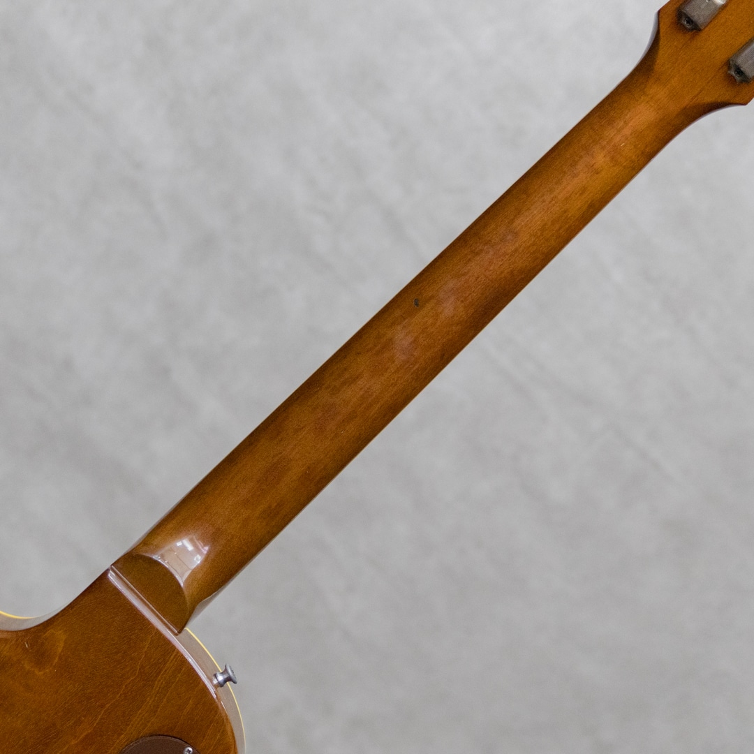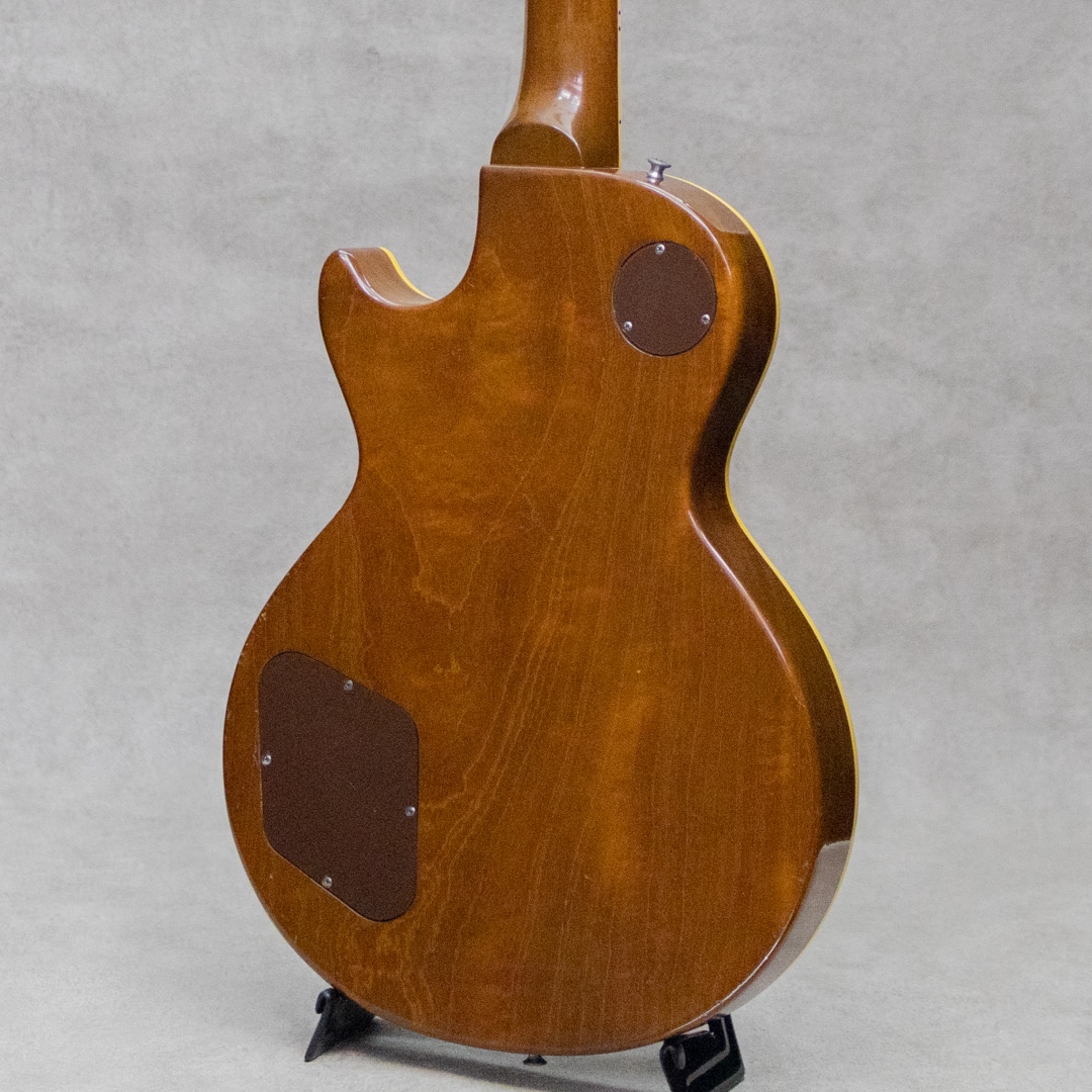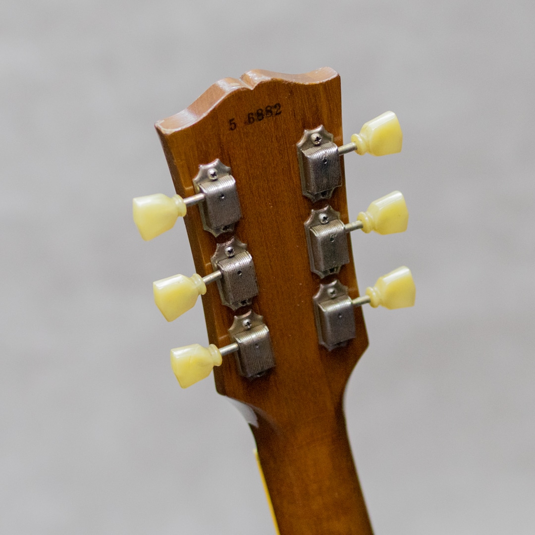 ギタリスト・発明家としても知られるギター史における殿堂入"Les Paul"。1952年登場のシグネチャー"Les Paul Model"は、その後のギターロック勃興と共にエレキギターのスタンダード、王道として認知されるまでに至りました。本器は、登場当初のP-90搭載時期、トラピーズスタイルからラップアラウンドのスタッドコンビネーションブリッジへと変更がされた時期の"Les Paul Model"1955年製Vintage品。メイプルトップにブラスパウダーを使用したゴールドトップと艶やかなハカランダ指板とのコントラスト、大きく板目に取られ杢の揺らぎが美しいマホガニーバック、この時期までに見られる特徴的な"Lower Logo”など、ふと目にしただけで感じられる貫禄抜群のルックスです。極僅かにソフトVのようなネック裏頂点を感じるネックプロファイルはしっかりとした握り応えがありつつも、決して太すぎることなく手に馴染む程よいネック。フレットは目立ったへこみなどなく各ポジションで音詰まりなく気持ちよくプレイ可能です。"P-90”ピックアップ、POT、"Gray Tiger”コンデンサなど、アッセンブリーはオリジナルパーツを保っており良好。丁寧に手加工で成形がされたことが見て取れるアルミ製のバーブリッジ、53年頃から薄いデザインに変更となった雰囲気あるゴールドスピードノブ、アメリカンミッドセンチュリーらしいデザインセンスのピックガード。"No Letter"クルーソンチューナーは1弦のみ他と異なるものが装着されていますが、Early 50sクルーソンが装着されて、それぞれ経年具合に差異はありません。ネック裏に塗装修正が見受けられますが、厚塗りの感じもなく丁寧な補修がされています。厚みのある倍音感、甘くギュッと深みのあるミドルのトーンが、気持ちの良いサスティーンで響くグッドサウンド。タッチレスポンスにはマテリアルと経年から成る程よい枯れ感も感じられ、まさに50's Gibsonらしい空気感、"Les Paul Model"たる存在感とを存分にを楽しませてくれます。経年による塗装ウェザーチェッキングや、塗装の剥がれた箇所から覗かせる緑青がオリジナルならではの色気と存在感を感じさせる本器。大きな傷みは見られず丁寧に扱われてきたことが伺える良好なコンディションの1本。ネックまわりも良好で演奏性もばっちりです。良いルックスと良い演奏性で楽しめる説得力抜群の本器。是非お手元でご体感ください。5ラッチのオリジナルブラウンケースが付属します。その他修理履歴など詳細はお気軽にお問い合わせください。