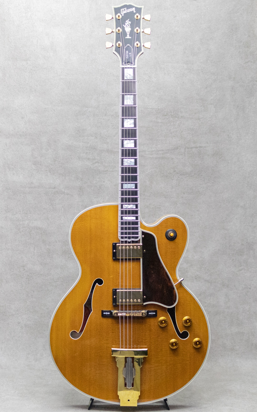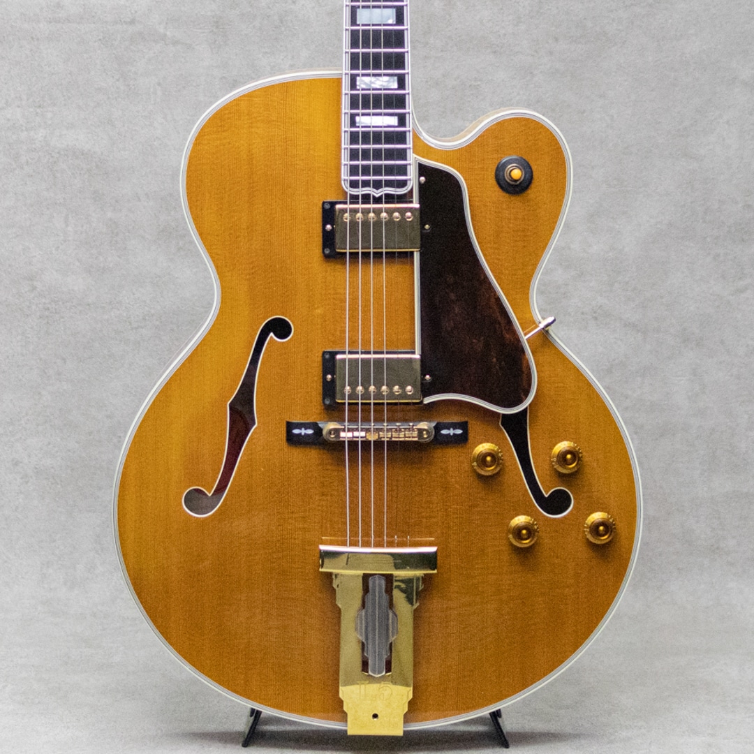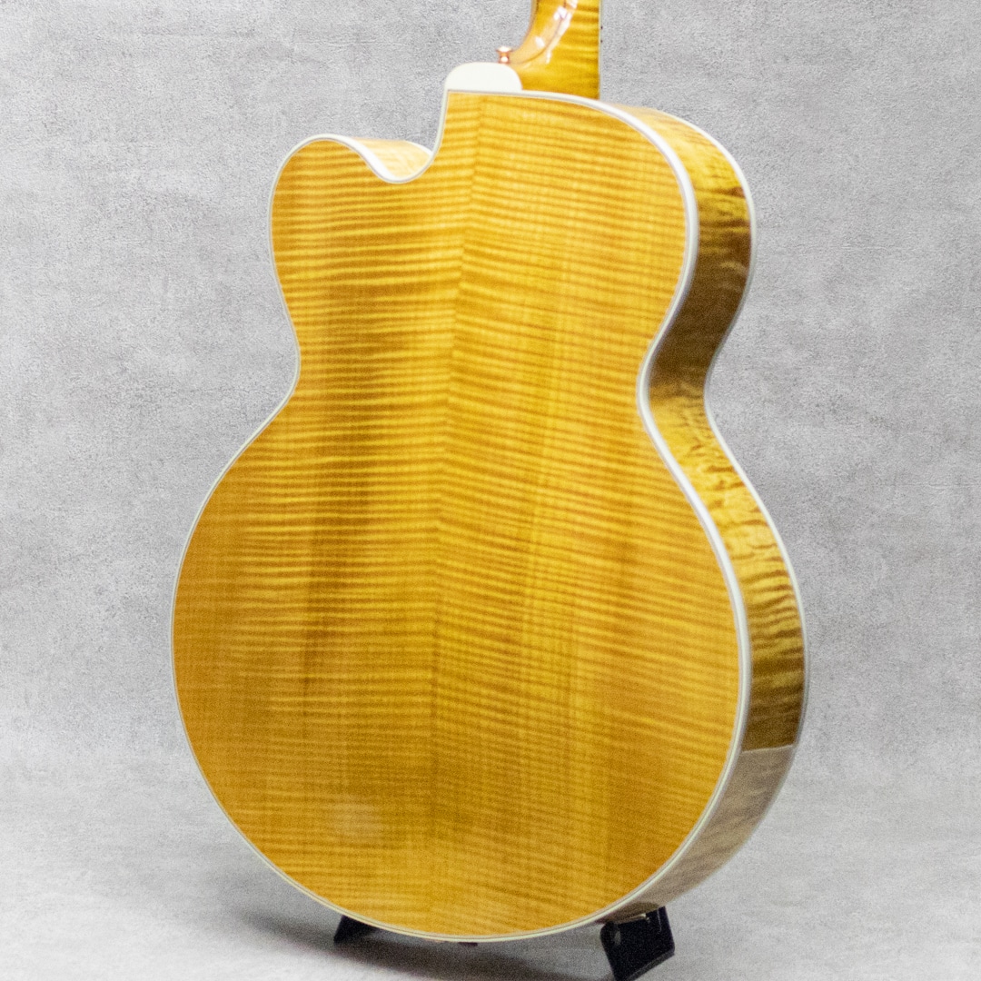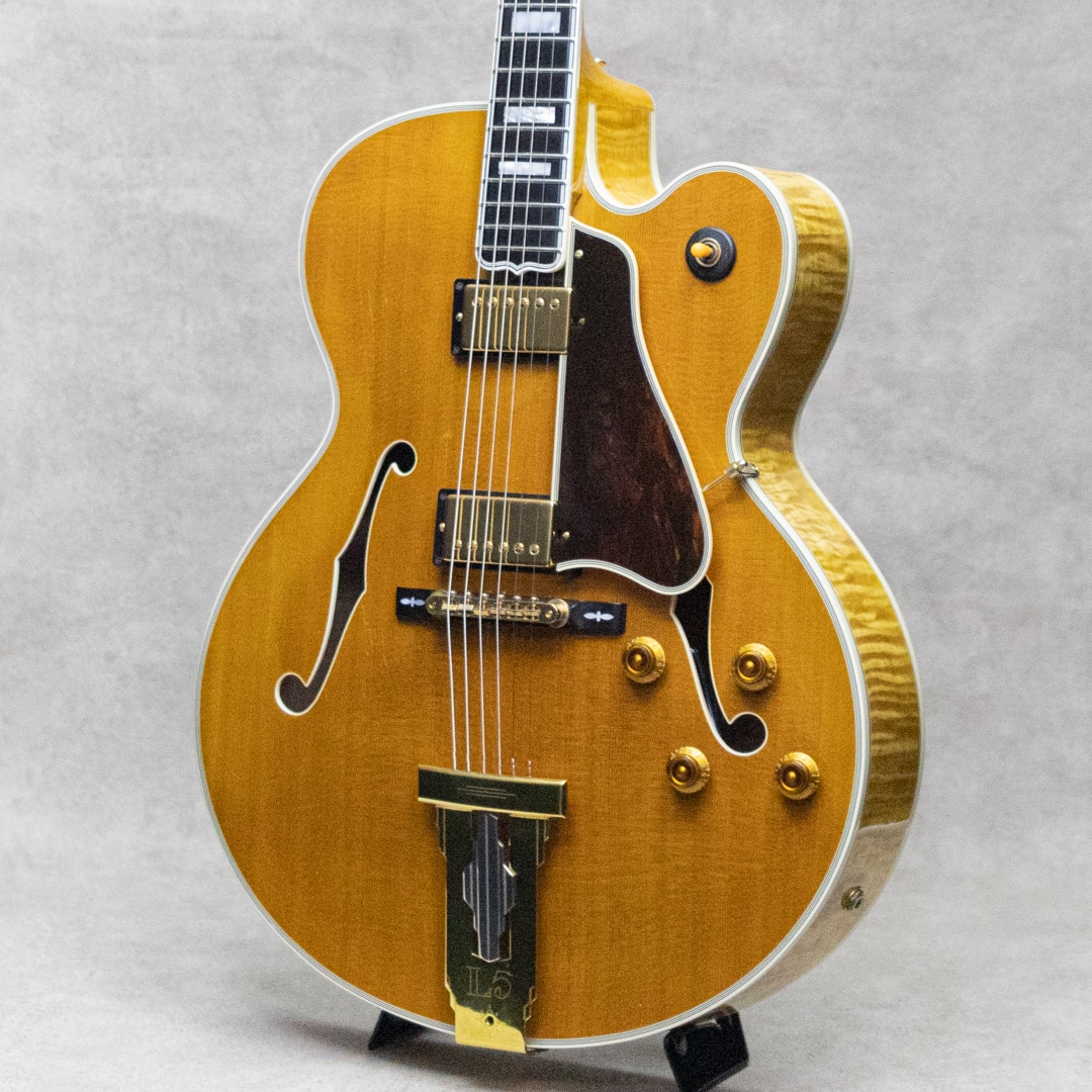 アーチトップギターの金字塔として長くGibsonの上位機種の座を占めるL-5。1951年頃にはエレクトリックバージョンのL-5CESが登場。今なお憧れのモデルとして多くの注目を惹き続けています。本器はこの時期らしいマテリアルの美しさが際立った、貫禄と魅力抜群の1996年製ナチュラルカラー。目の細かく詰まった柾目杢が美しく整った削り出しソリッドスプルーストップ、フィギュアドメイプル&ウォルナット5pcsネック、ソリッドメイプルボディサイド&バック、各所メイプル材のストライプ、フレイムはいずれも魅力的な揺らぎのある抜群の貫禄です。トーチインレイ、エボニー指板、マザーオブパールブロックポジション、プライバインディング、ベネチアンカッタウェイ、57Classic×2搭載。2PU仕様のCESながら生鳴の時点で豊かな音量感とふくよかなトーンが感じられ、アンプからのアウトプットでも本体のポテンシャルを十二分に発揮。甘く倍音の厚いサウンドキャラクター。Gibsonらしいセピアな空気感で音楽的に存在感のあるトーンながら、上級モデルL-5故のクリアなダイナミズム、タッチニュアンスに対して懐の余裕を感じる気持ちの良いレンジ感をしっかりと確立しています。ヘッドトップやネックヒール、ボディトップにも所どころ雰囲気の良いウェザーチェックが出てきており、各所極小さな打痕などの小傷はありますが、経年からしても塗装の美しさをキープ。メイプルの美しい杢目、ナチュラルカラーが相まって魅惑的かつ上品な印象もしっかり感じさせる上位機種然とした佇まいです。フレットは85%程と多少の減りは見受けられるものの綺麗にメンテナンスされており、ネックコンディションも良好。現状ローアクションでとても弾きやすいセッティングができております。ネックヒールにストラップピン追加。ピックガードはピックアップ位置等に綺麗に沿って作り直しがされております。近年しばらく製造が止まってしまっていることからも、注目度高めの90's L-5。ぜひお見逃しのないよう。オリジナルハードケースが付属。