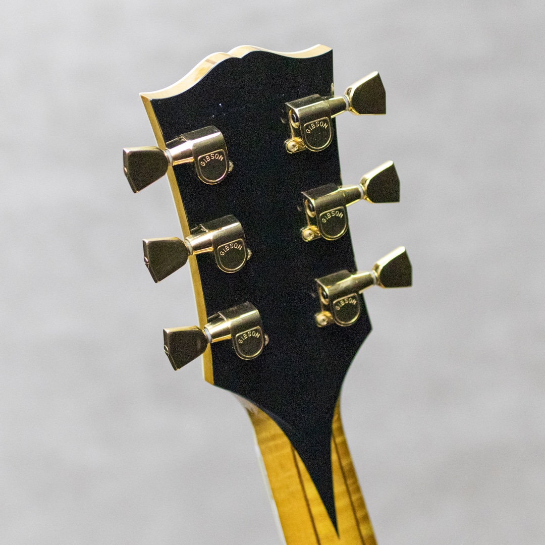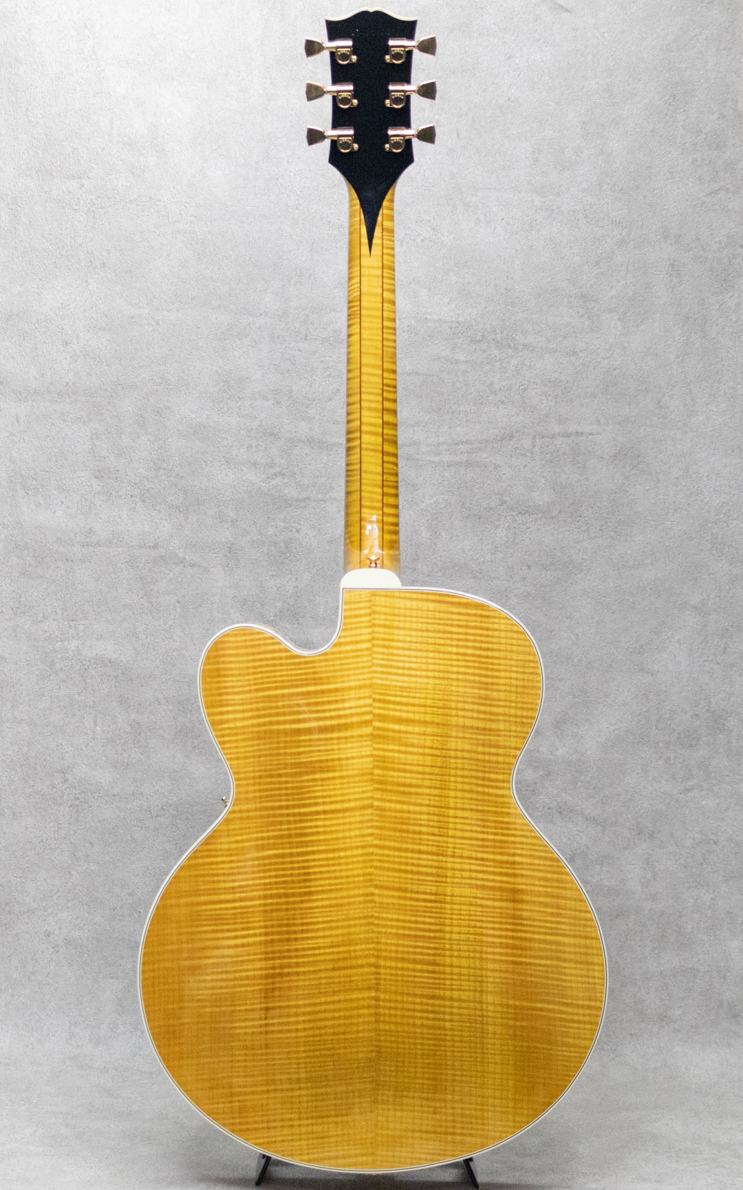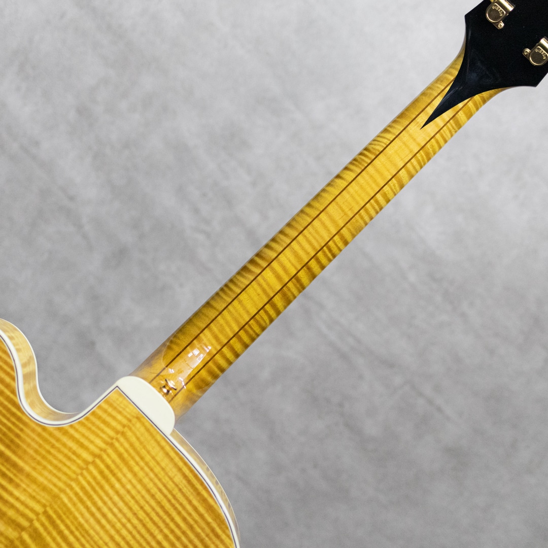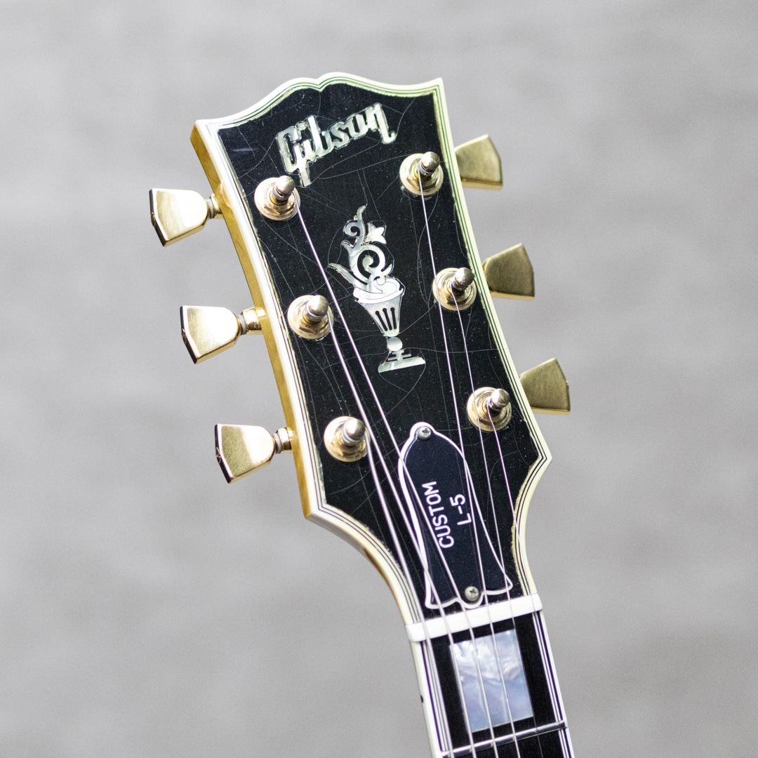 アーチトップギターの金字塔として長くGibsonの上位機種の座を占めるL-5。1951年頃にはエレクトリックバージョンのL-5CESが登場。今なお憧れのモデルとして多くの注目を惹き続けています。本器はこの時期らしいマテリアルの美しさが際立った、貫禄と魅力抜群の1996年製ナチュラルカラー。目の細かく詰まった柾目杢が美しく整った削り出しソリッドスプルーストップ、フィギュアドメイプル&ウォルナット5pcsネック、ソリッドメイプルボディサイド&バック、各所メイプル材のストライプ、フレイムはいずれも魅力的な揺らぎのある抜群の貫禄です。トーチインレイ、エボニー指板、マザーオブパールブロックポジション、プライバインディング、ベネチアンカッタウェイ、57Classic×2搭載。2PU仕様のCESながら生鳴の時点で豊かな音量感とふくよかなトーンが感じられ、アンプからのアウトプットでも本体のポテンシャルを十二分に発揮。甘く倍音の厚いサウンドキャラクター。Gibsonらしいセピアな空気感で音楽的に存在感のあるトーンながら、上級モデルL-5故のクリアなダイナミズム、タッチニュアンスに対して懐の余裕を感じる気持ちの良いレンジ感をしっかりと確立しています。ヘッドトップやネックヒール、ボディトップにも所どころ雰囲気の良いウェザーチェックが出てきており、各所極小さな打痕などの小傷はありますが、経年からしても塗装の美しさをキープ。メイプルの美しい杢目、ナチュラルカラーが相まって魅惑的かつ上品な印象もしっかり感じさせる上位機種然とした佇まいです。フレットは85%程と多少の減りは見受けられるものの綺麗にメンテナンスされており、ネックコンディションも良好。現状ローアクションでとても弾きやすいセッティングができております。ネックヒールにストラップピン追加。ピックガードはピックアップ位置等に綺麗に沿って作り直しがされております。近年しばらく製造が止まってしまっていることからも、注目度高めの90's L-5。ぜひお見逃しのないよう。オリジナルハードケースが付属。