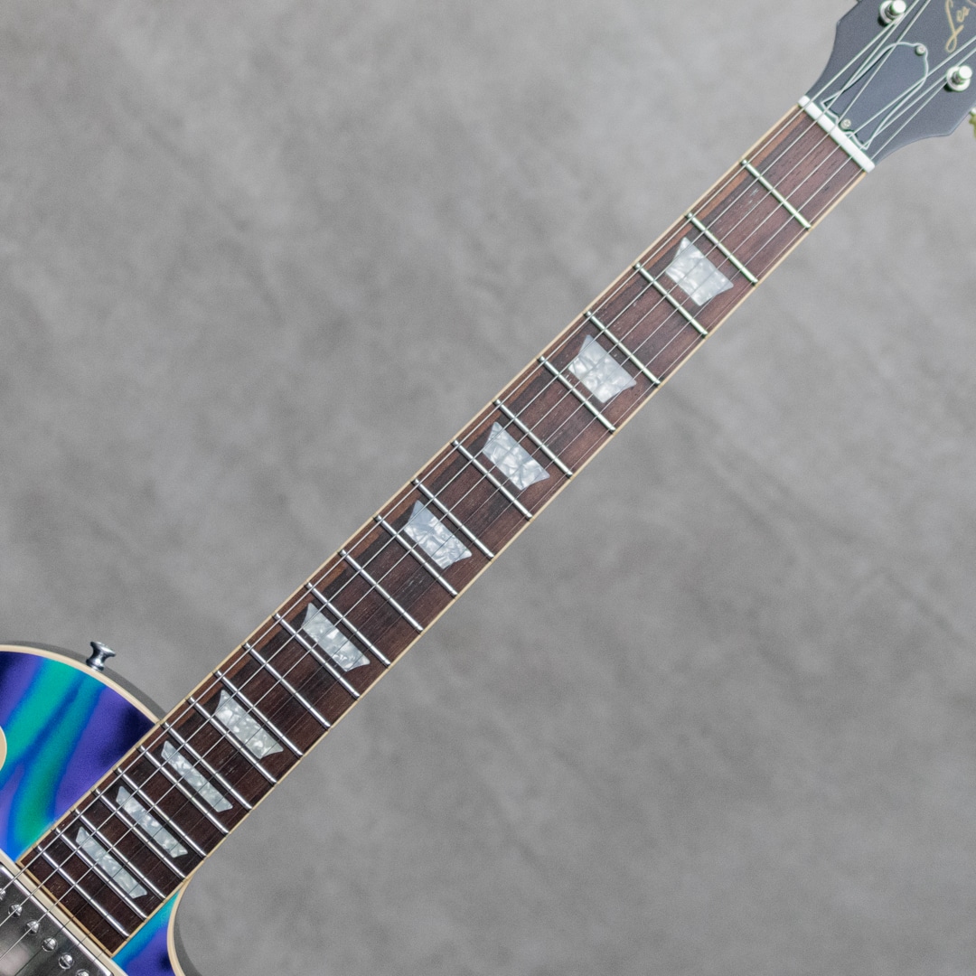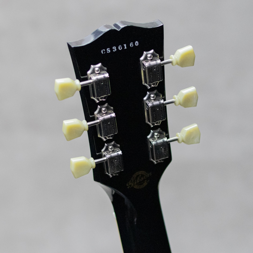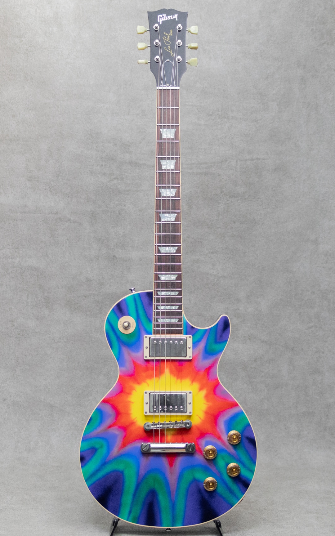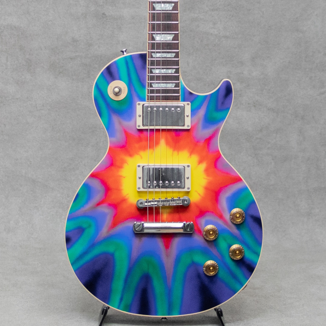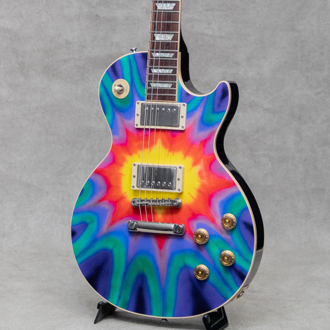 個性的でアバンギャルドな展開が多く見られる2000年代Gibson。アーチトップを採用した"SG Diablo"、積層構造のマルチレイヤーを採用した"Zoot Suit"、本当にV字になった"Reverse Flying V"、全面星条旗のLes Paul Custom”Stars&Stripes”などなど、挑戦的で飽きさせずドッキリさせるモデルが多く発表されました。本器はそんな中でも一際目を惹く2003年製Les Paul Tie Dye。布の一部を縛るなどして染色に模様をつける"絞り染め(Tie Dye)"を大胆にLes Paulのトップにあしらった奇想天外な1本。古くから世界各地で自然発生的に存在したとされる絞り染めの技法は、主に南アジア~東南アジアや一部アフリカなどの伝統的工芸に見られ、日本でも6~7世紀ごろから盛んに行われてきました。もともと欧米圏ではあまり馴染みの薄い文化であったものの、アメリカでは1960年代後半以降のヒッピーカルチャーの台頭、東洋思想への近づきやドラッグカルチャーなども相まって、サイケデリックな極彩色とともにアイコニックなモチーフとして広く知られるようになっていきました。こちらスペックは王道のメイプルトップ、マホガニーバックにマホガニーネック、ピックアップには57Classic×2搭載。軽いボディも相まってオープンな鳴感で、厚みのある王道Les Paulサウンド。ボディエッジの軽い塗装チップ、細かな打痕、ハードウェアのくすみなどはあるものの、目立って外観を損ねるダメージはございません。ロッドの調整を含め良好なネックコンディション。フレットも綺麗な状態で弾きやすいアクションでセッティングができております。1950年代に端を発しトラディショナルで王道モデルたるモデル"Les Paul"に、1970年代カウンターカルチャーをぶつけた驚きの一本。お見逃しなく。オリジナルハードケースが付属。