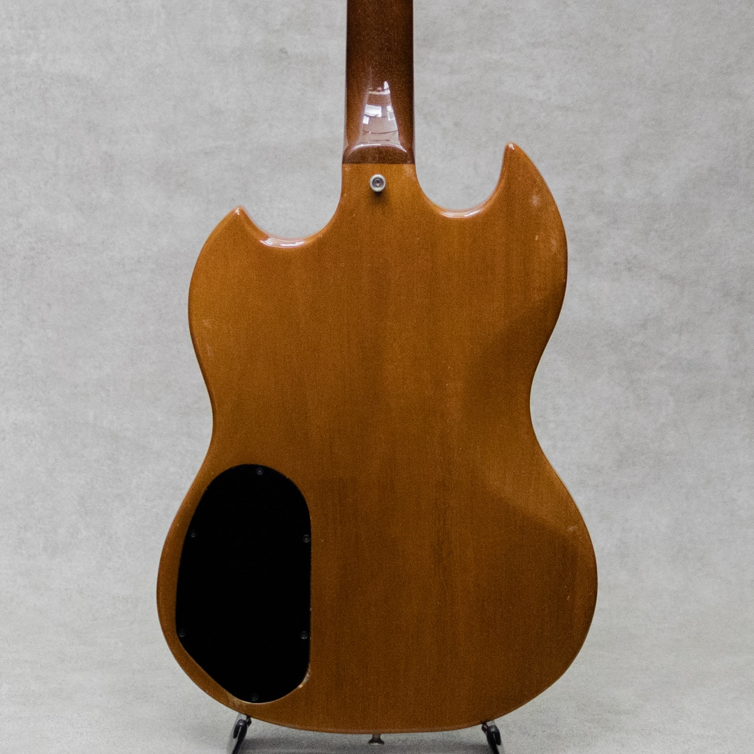 古くはマーチン、ギブソンと並び御三家ブランドとして名を馳せていたアメリカを象徴するブランドのひとつ、"Guild(ギルド)"。1963年頃にはソリッドエレクトリックも展開しはじめ、70年代を彩る多様なエレキギターの1つとして多くの憧れ、人気を集めていました。本器はマホガニーボディ、マホガニーネック、ベベルドコンターデザインのダブルカットスタイル"S-100"1975年製。プレーントップも多く作られましたが、こちらはトップを彩るどんぐりの彫刻がパッと目を惹く"Carved Top"モデル。その他も、当時としては最新のマテリアルであったであろうアクリル製クリアピックガード、スラントデザインのブラステールピース、MOPで彩られたダイナミックなヘッドストックなど、ナチュラルウォルナットカラーと相まってレトロで愛嬌のある印象ながら、まとまりのあるデザインセンスを感じさせるルック。ピックアップはオリジナルのハムバッキング。一般的な2Vol、2Toneのコントロールにフェイズスイッチも搭載。ミニスイッチでリアピックアップの極性を反転させることで、ミドルポジションで印象的なフェイズアウトサウンドも出力可能です。取り回しの良いボディに、薄くスリムなネックシェイプで演奏性も良く、ネックとボディの繋ぎ目ヒール部分は段差のない滑らかな造りでハイポジションへのアクセスも容易。ブライトな倍音感が心地よい出力は、歯切れ良くも決して硬い印象ではなく、ナチュラルオーバードライブで子気味の良いリフサウンドも抜群。リフレットがされている為、各ポジションで良い演奏性、ローアクションのセッティングができており即戦力コンディションです。経年相応の小傷等はございますが、顕著にデザイン性を損ねるダメージはなく比較的綺麗な印象。手加工の彫刻がお手元で眺めるのにも雰囲気よく、一味違ったライブギアとしても見映えするチャーミングなアイテム。ぜひご検討ください。オリジナルハードケースが付属。