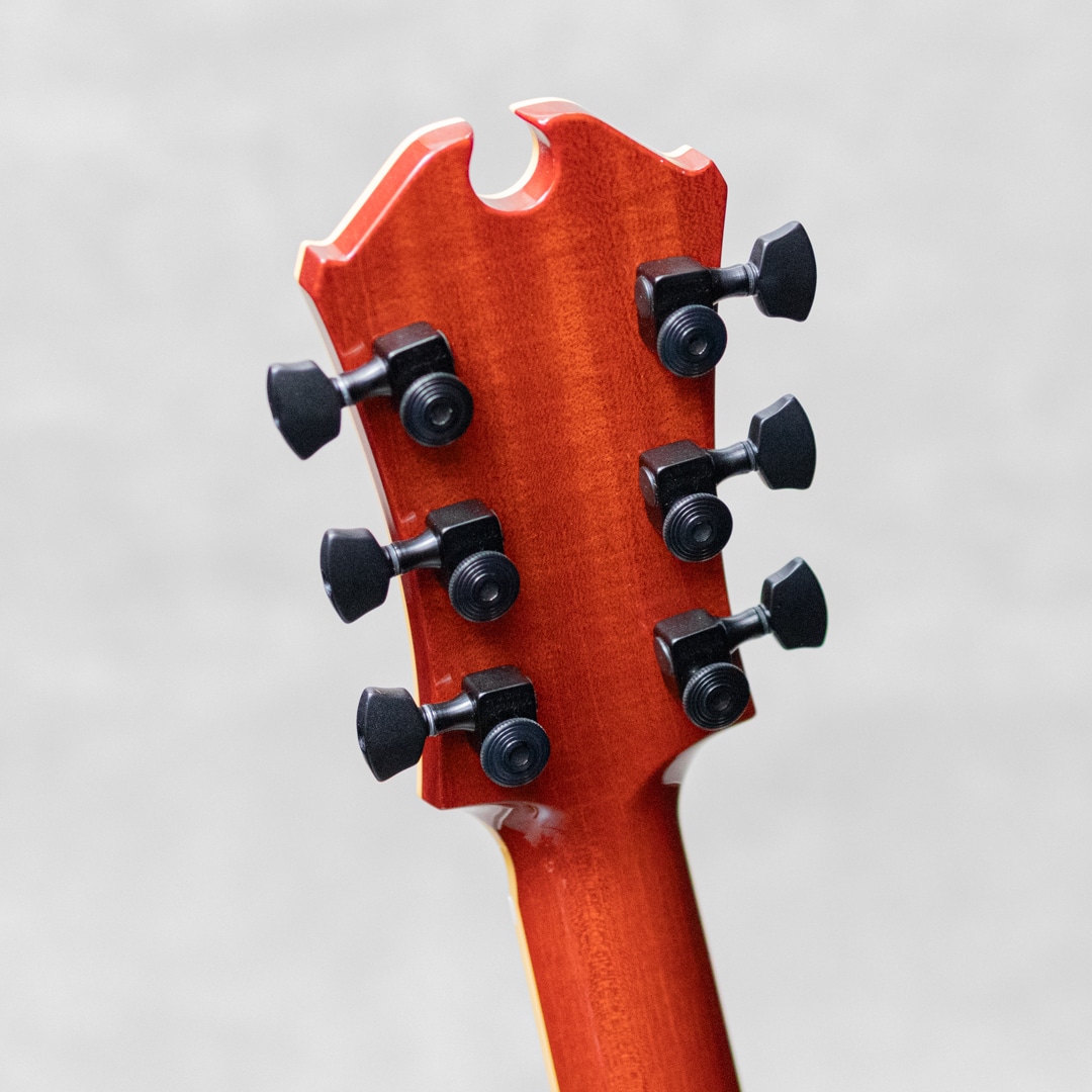 稀代の天才"Stephan Marchione"。1980年代John SuhrとRudy Pensaが設立したブランド"Pensa Suhr"にて彼らと共にギターの製作にかかわり、1993年に独立し自らのブランド"Marchione Guitars"を設立。2001年からは現在の製作拠点であるテキサス州ヒューストンに移り住み、アーチトップやクラッシックギター等、少数生産ながら多くのプレイヤーを魅了する楽器を製作し続けています。本器はメイプルトップ、マホガニーバック、マホガニーネックをベースとしたセミホロウモデル"59 Burst"。セミホロウモデルは元々、新進気鋭のギタリスト"Mike Moreno"氏が、必要とするクオリティの楽器の選択肢が既存のセミホロウスタイルのギターになかったことに端を発して開発されたモデル。トップ、バックのハンドカーヴィングによるアーチトップ形状は綿密な設計と作業によって生み出されています。本器は24.75inch(約628mm)のスケール、セラックとニトロセルロースによる塗装、ピックアップにはDimarzio社製のMarchione Customモデルを採用。従来のエレクトリックギターでは調整の為、可動式となることが多い各所(ピックアップマウント周りなど)には、不明確な要素を徹底して廃し、マテリアルと設計による理想のサウンドを実現する為固定化するなど、明確な理想とそれを体現する確かな技術力を感じさせます。複雑な和音でも澱みな無く響く、正確無比なピッチと研ぎ澄まされた美しい倍音成分は弦楽器を知り尽くしたマルキオーネならではの技法。どこまでもクリアで澱み無く透き通った鳴りは明らかに他ブランドとは一線を画します。ワイドなフレイムに雰囲気の良いフレックが魅力的に映え、見るからに上質な材をより美しく魅せるトップカーブとカラーリング。最上級に洗練された仕上がり、ぜひお確かめください。オリジナルハードケースが付属。