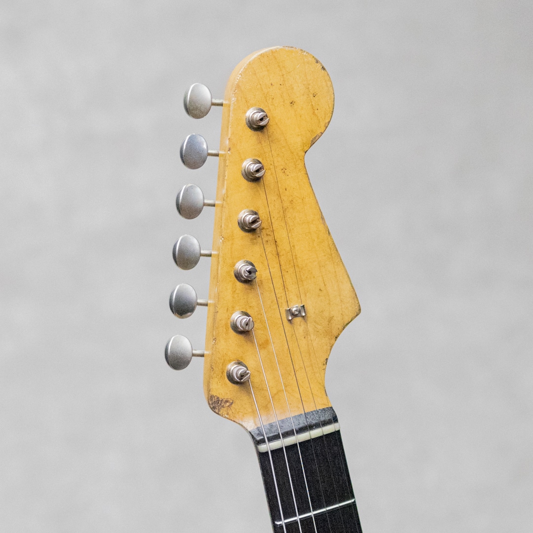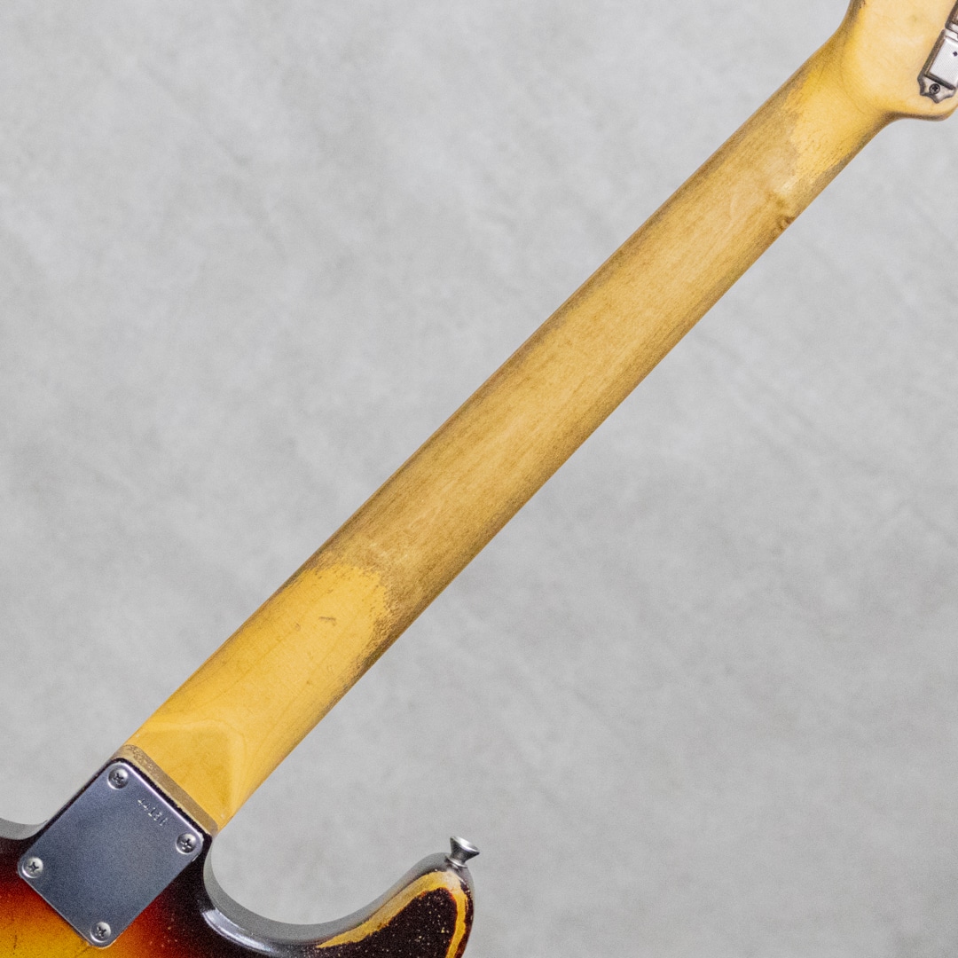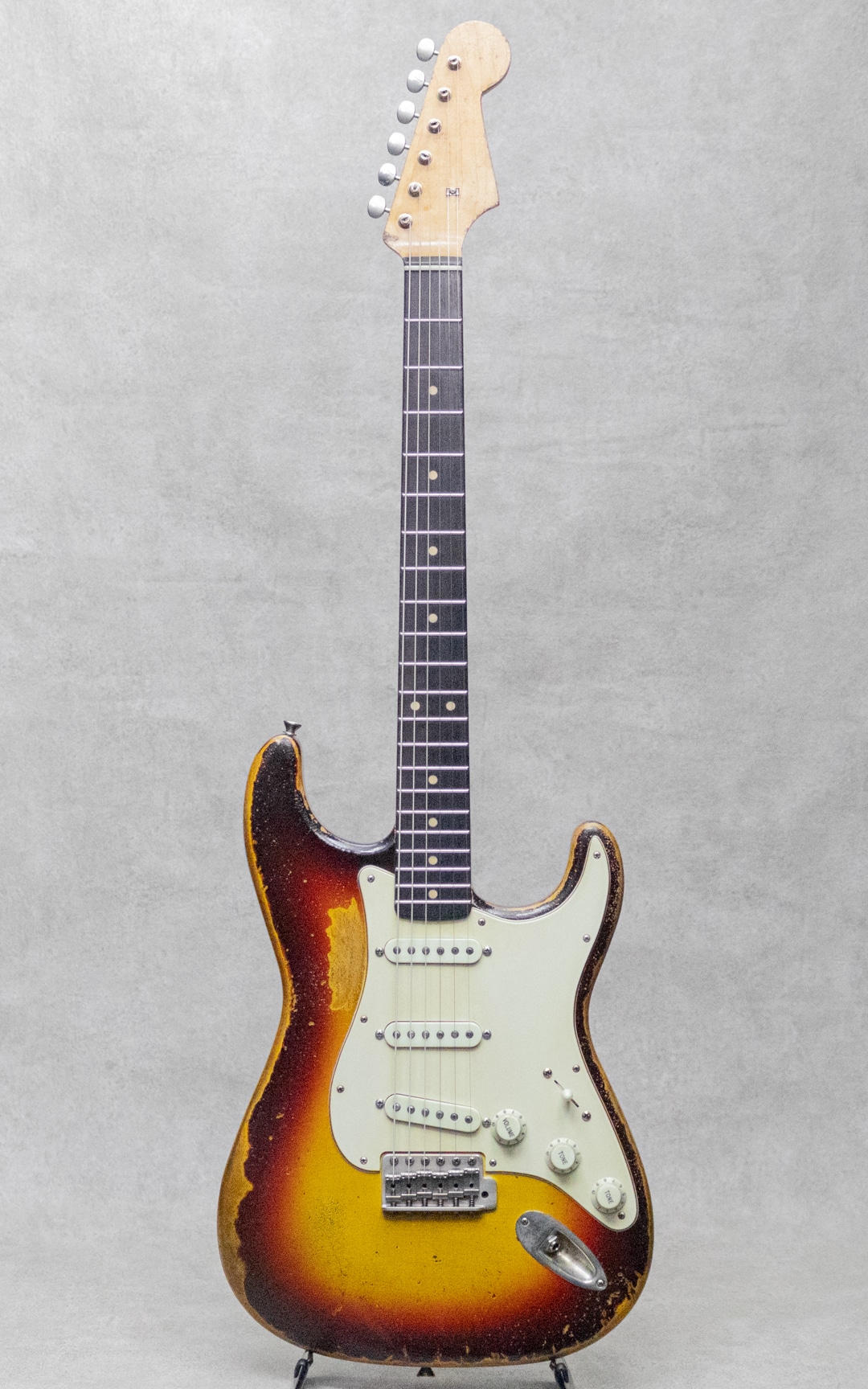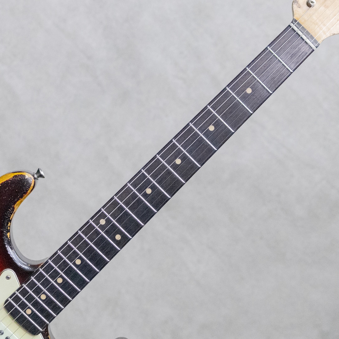 "THE BLACKGUARD BOOK"の著書でもあるNacho Banos氏による、究極のBlackguard Replicaブランド"Nacho Guitars”。年間の製作本数は非常に少なく日本国内への入荷数も限られており、カタログモデルといった概念は無く1本1本個性を宿したギターをワンオフで製作するようなスタイルが貫かれています。同じ年代・特徴のモデルであっても、それぞれが個性を持った外観・弾き心地・そしてサウンドが表現されております。本器は、”Early 60s Contour Body #44156 Super Heavy Aging Sunburst Medium C Neck”。オリジナル・ブラックガードを知り尽くしたNacho氏の経験値を元に製作される、圧巻の完成度を誇る 60’sレプリカの1本。スラブローズウッド指板、メイプルネック、アルダーボディのウッドスペック。オールドを知り尽くしたNacho氏ならではの雰囲気満点、貫禄充分のスーパーヘビーエイジド加工が施された褪色したエイジド3トーンサンバースト。ミディアムCシェイプに仕上げられたネックは細すぎず薄すぎない握り心地の良いネックシェイプです。本物さながらの経年したハードウェア、褪色感を再現したエイジンググリーンカラーの3plyPGは、その作り込みを愛でるだけでも楽しめる仕上がり。9.5”ラジアス指板、ミディアムフレット、Early60’sスタイルトレモロブリッジ、スチールサドル、Early 60’sスタイルピックアップ、アルミシールディングプレート、ワックスディップレプリカコンデンサー。ピックアップセレクターワイヤリングは5wayで、ネックPUトーン、センターPU&ブリッジPUトーンです。レンジ感の広い乾いたサウンド。レスポンスに長けながら金属質でないビンテージさながらのトーン。倍音感にあふれる甘いトーンから、ベルトーンの美しいハーフトーンまで、このスタイルに求められるサウンドを遺憾なく発揮してくれます。ストイックにブラックガードを愛したNacho氏ながら、指板ラジアスやピックアップワイヤリングなどはモダンで使いやすいセットをセレクトしており、より実戦向きで使えるビンテージレプリカに仕上げられています。歴戦の1本と見紛うばかりの雰囲気と仕上がりの話題と人気を集めるスペイン発”Nacho Guitars”。是非お手元でお確かめください。オリジナルハードケース、トレモロアーム、バックパネル&スクリュー、オリジナル・レザーバック、スペックシート、当機の画像データが入ったUSBとUSB用の木箱、レザーストラップ付属