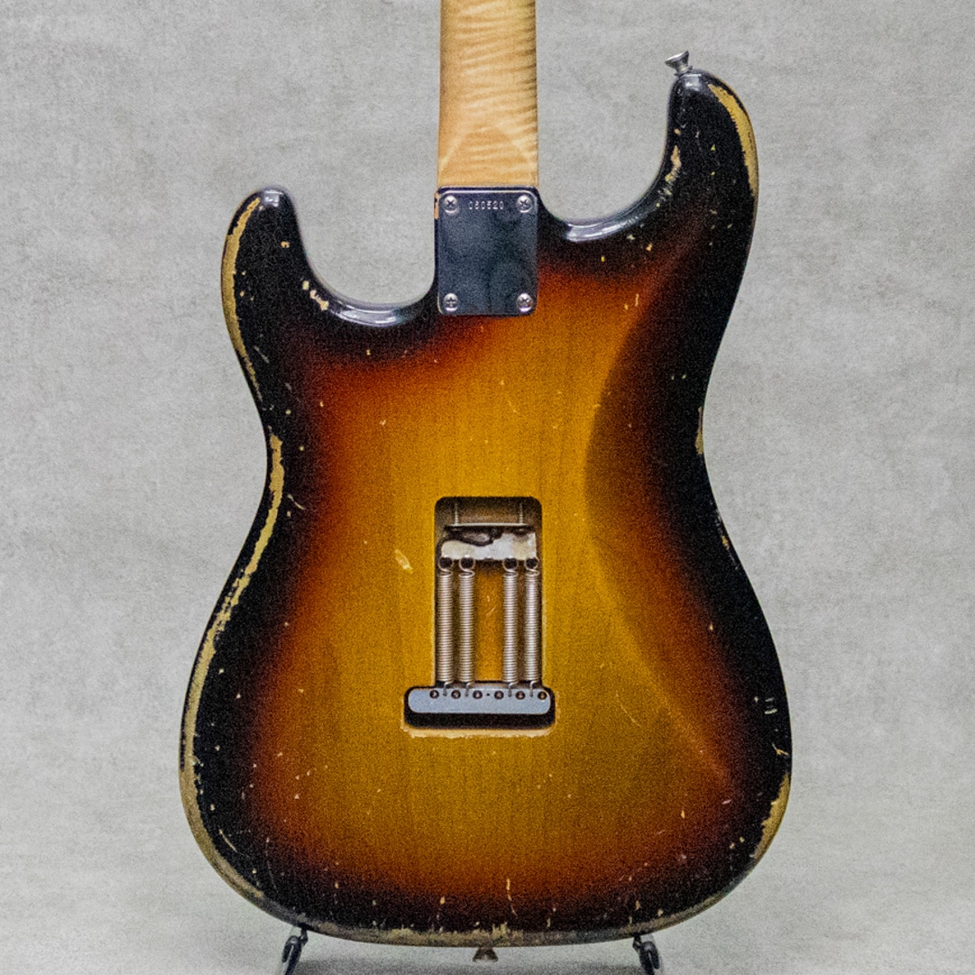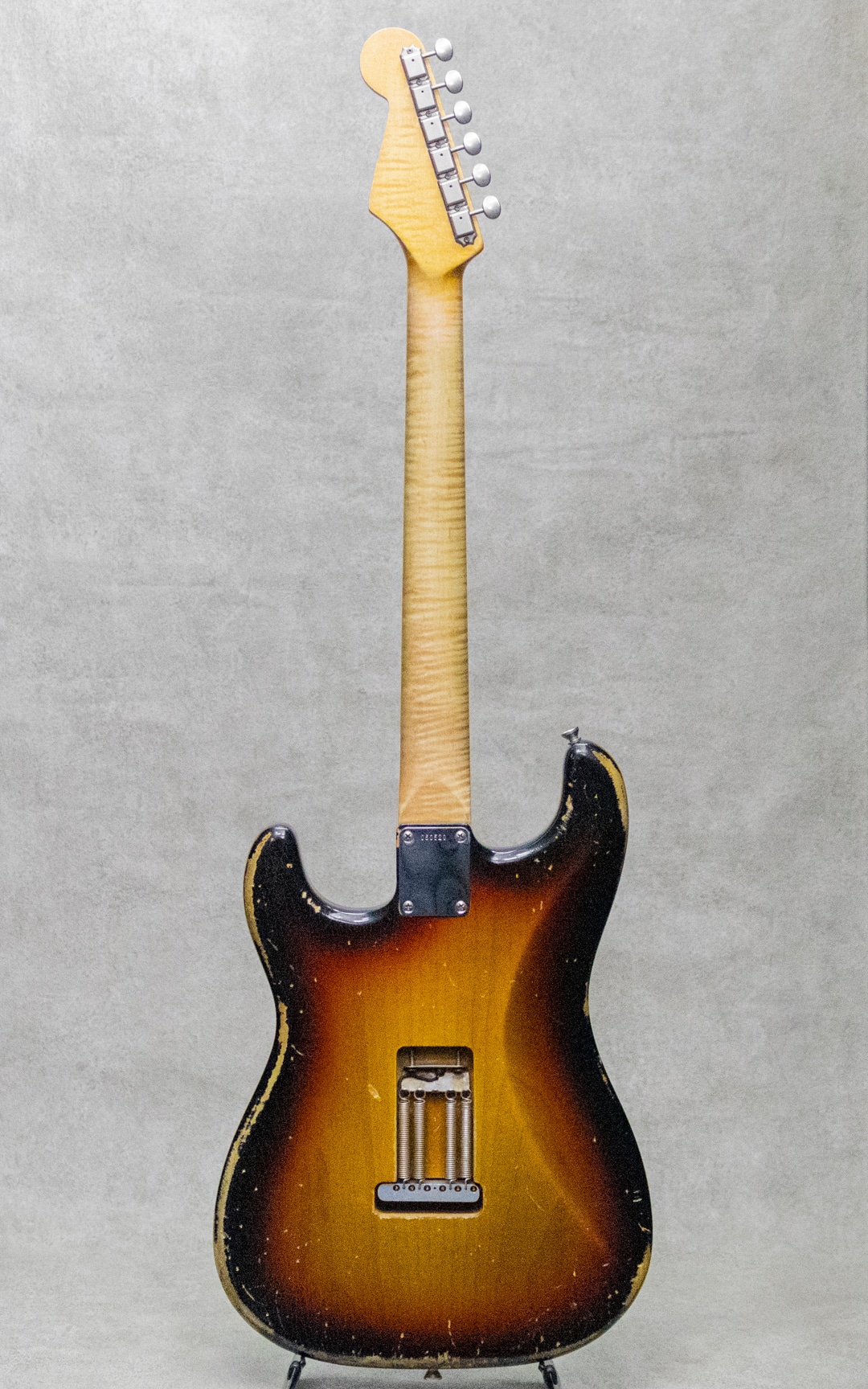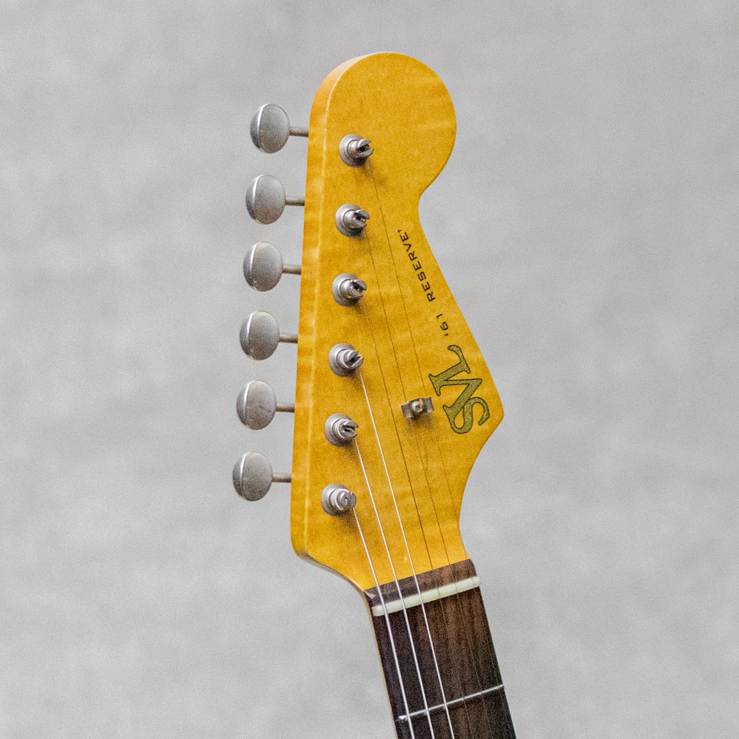 イギリス・ハンプシャー州にて作られる”SVL Custom Guitars & Amplifier Service”。”Simon V Law”氏は16年以上に渡りギター修理やアンプ技術者としてキャリアを積んだ後、自身の工房を設立しました。見た目の美しさではなく、実際にプレイした際の"卓越した音色と感触”を第一にこだわり、実際のビンテージから受けるインスピレーションで1本1本作り上げられています。また"Robben Ford(ロベン・フォード)”や”Matt Schofield(マット・スコフィールド)"、そして近年名を上げ続ける”Philip Sayce(フィリップ・セイス)”などの実力派ブルース系ギタリストが使用することでもその注目を集めいています。本器はそんなSVLの代表人気モデル”61 Reserve 3-tone Sunburst”。SVLのもうひとつの人気でもある本物さながらのエイジド加工が施された貫禄の1本。2010年代製極上USED品。アルダー2ピースボディ、全面にしっかりとフレイム杢が浮き出たクオーターソーンメイプルネックにスラブローズ指板の61仕様。マテリアル選びに重きを置くSimon氏ならではの軽量な極上マテリアルの組み合わせ。クオーターソーンで目取られたメイプル材のネックは丸みがあり手によく馴染むビンテージフィールを持つオーバル”C”シェイプ。指板は9.5”Rのコンパウンドラジアスで、フレットはミディアムサイズのフレットで最近にリフレットされており、90%以上残っておりガンガンご使用いただけます。ピックガードは3plyのエイジドミントグリーンガード、ピックアップはカスタム60sスタイルのシングルピックアップx3、トーンコンデンサーは”Sozo”NexGenVintageMustardコンデンサーを搭載。コントロールレイアウトはマスタボリュームと、トーン回路がフロント、ミドル・リアの配線になっています。フィニッシュは、ニトロセルロースラッカーを使用したオールドとみまごう雰囲気を醸し出したウェザーチェックや傷を再現したレリック仕上げのサンバースト。ボディ形状やヘッド形状など、ビンテージを熟知しこだわるSimon氏ならではの雰囲気満点の質感は手元で見ても見惚れるかっこよさを持っています。見た目よりもサウンドとこだわるSVLならではの倍音溢れるビンテージフィールサウンド。しっかりと輪郭を帯びヌケるトーンながら、アタックが過度でなく心地よいレスポンス。ピッキングニュアンスに反応する倍音の量やバランスは、ビンテージ楽器のそれを彷彿させるグッドフィーリングです。使用に伴う傷や使用感は伺いにくく、とても良好なコンディションで保たれた本器。ネックコンディションも良好で、弾きやすいアクションでしっかりとお使いいただけます。国内流通もまだ多くないイギリス製の注目株、"SVL Custom Guitars”の”61 Reserve"。ワンクラス上の楽器を狙う実力派プレイヤーに是非お試しいただきたい1本です。お見逃しなく。オリジナルハードケース、トレモロアーム付属
