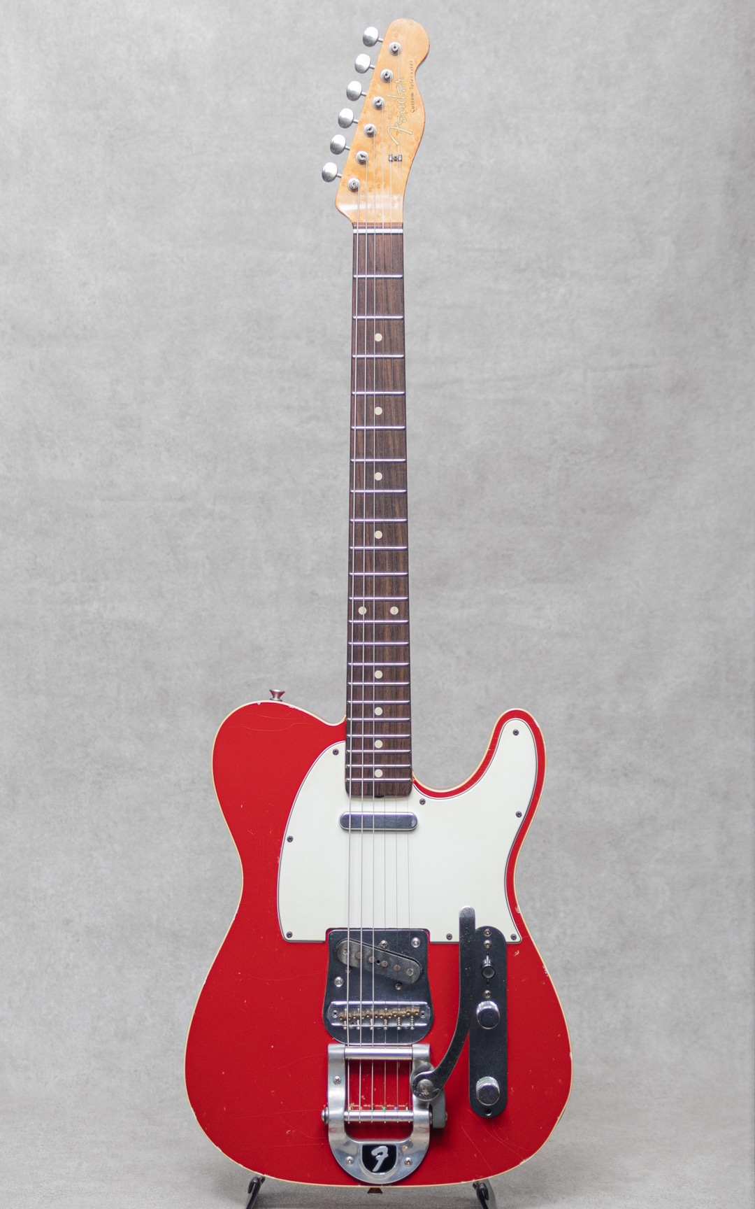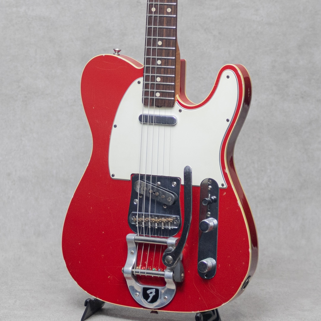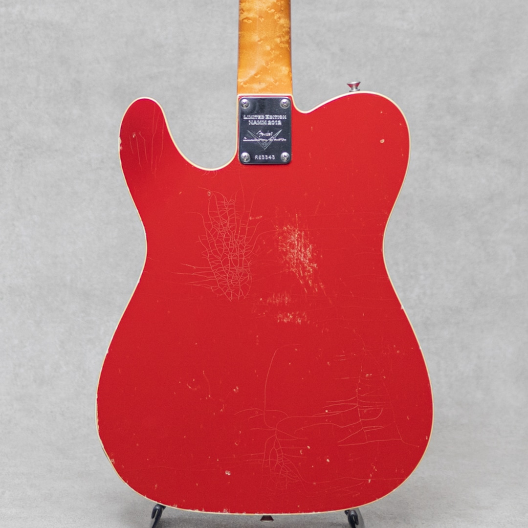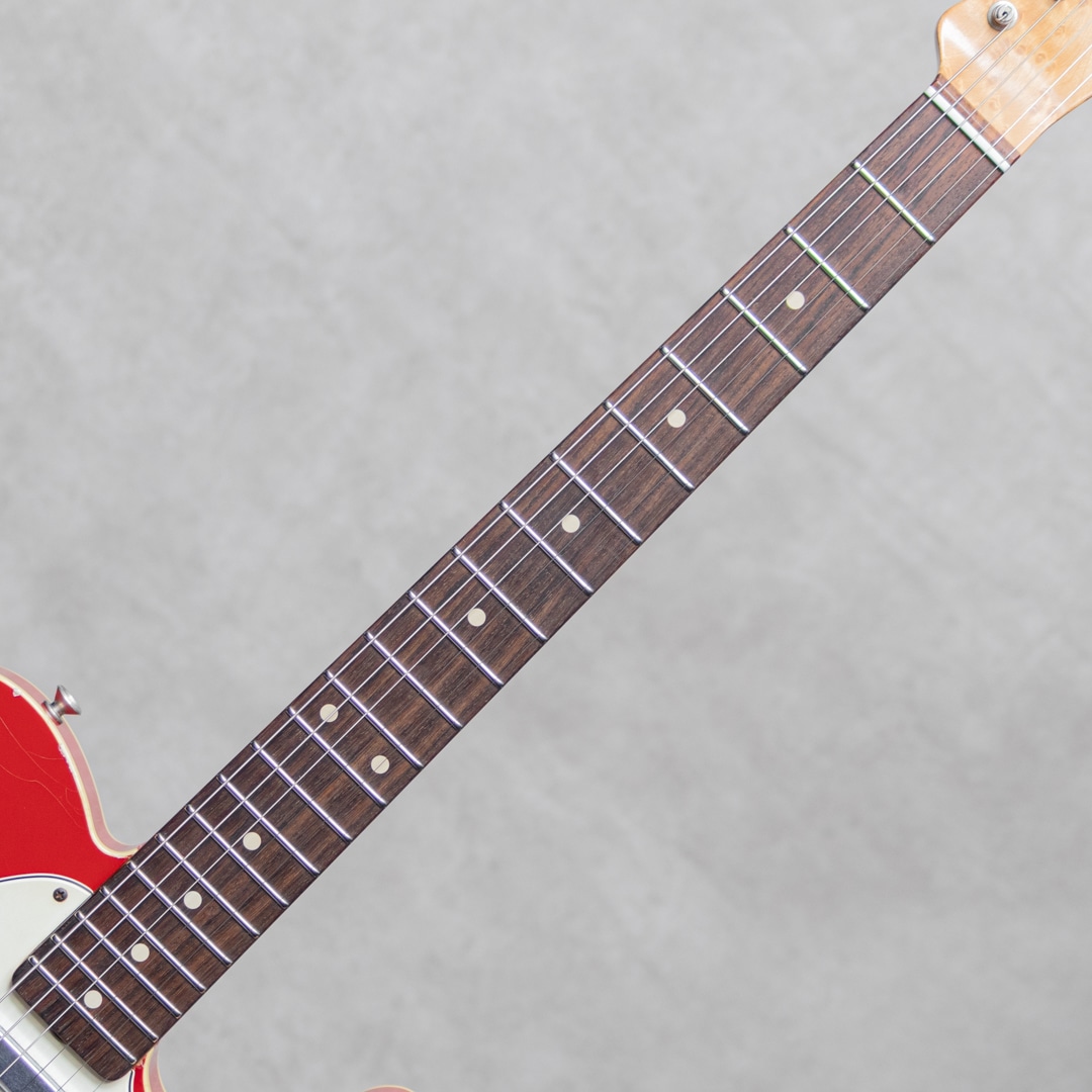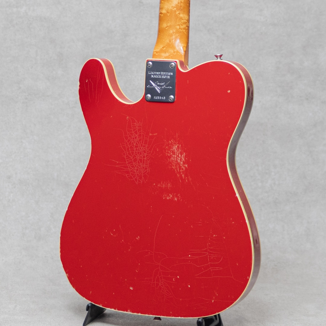 2012 NAMMショーリミテッドモデル”Telecaster Custom w/Bigsby Closet Classic”。ビグスビーB5搭載仕様の2012年製USED品。”Dakota Red(ダコタ・レッド)”と思われる深い赤が特徴のカラーで、極上のAAAバーズアイメイプルをネックに使用した程よく使い込まれたクールな1本。アルダーボディ、ラウンドローズ指板のウッドスペックで、ネック材には全体にびっしりと鳥眼杢が浮き出た極上のAAAメイプル材が使用されています。ネックグリップは1f/約8.3”-12f/約9.0”ほどのCシェイプで、ロウフレットはほんの僅かに肉付きがありながらハイフレットへのテーパーがキツくないネックシェイプ。エイジドホワイトカラーの3plyピックガードにBigsby B5とCCハードウェアを使用。ピックアップには、”Abigail Ybarra(アイビゲイル・イバラ)”によるハンドワウンド"Twisted Tele”ピックアップを搭載。コンデンサーにセラミック0.05uFとハイパスコンデンサーを組み込んだモダンテレキャスター配線になっており、ネック・パラMIX・ブリッジのPUセレクトとマスターVol、マスターToneのコントロール配線です。元気で快活なテレキャスターサウンド。しっかりとキレがありながら、裏通しでない弦テンションによる倍音味も感じられる扱いやすいトーン。野太くガツンと出てくれながらミドルまでしっかりと芯の通ったサウンドを響かせてくれます。元々はクローゼットクラシック仕上げだった本器ですが、オリジナルRelicモデルかと思わせる外観。使い込みによる打痕・小傷や バックル傷などが見られますが、いずれもイヤらしい印象は受けず馴染み良い雰囲気です。ネックまわりも良好で、ネックコンディションもとても良好でトラスロッドの余裕もあり、低いアクションにセットアップしていますがハイフレットまで音詰まりなく演奏面も良好です。フレットは6105/ナロートールサイズが使用されており約85%〜90%以上ほどの残りでしっかりとプレイいただけます。ガンガンとお使いいただきたい弾き込まれたビグスビーテレ。クールなルックスと確かなサウンドの1本、是非お手元で。。Fender製モールドハードケース、認定書が付属します。