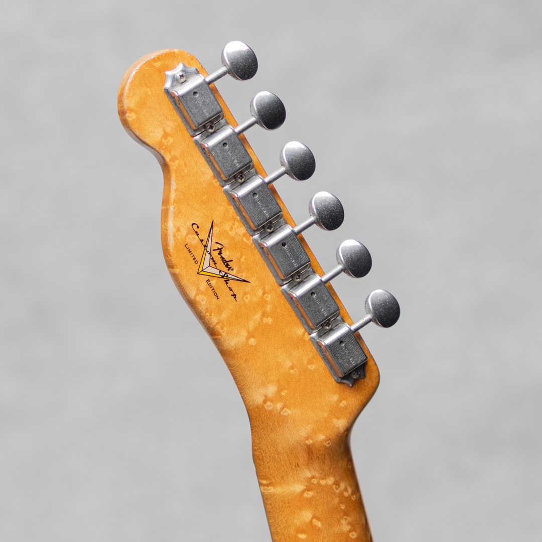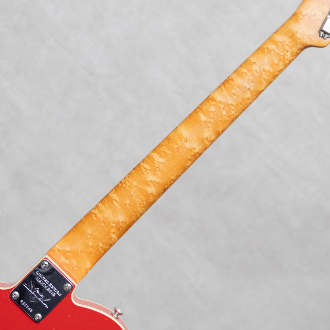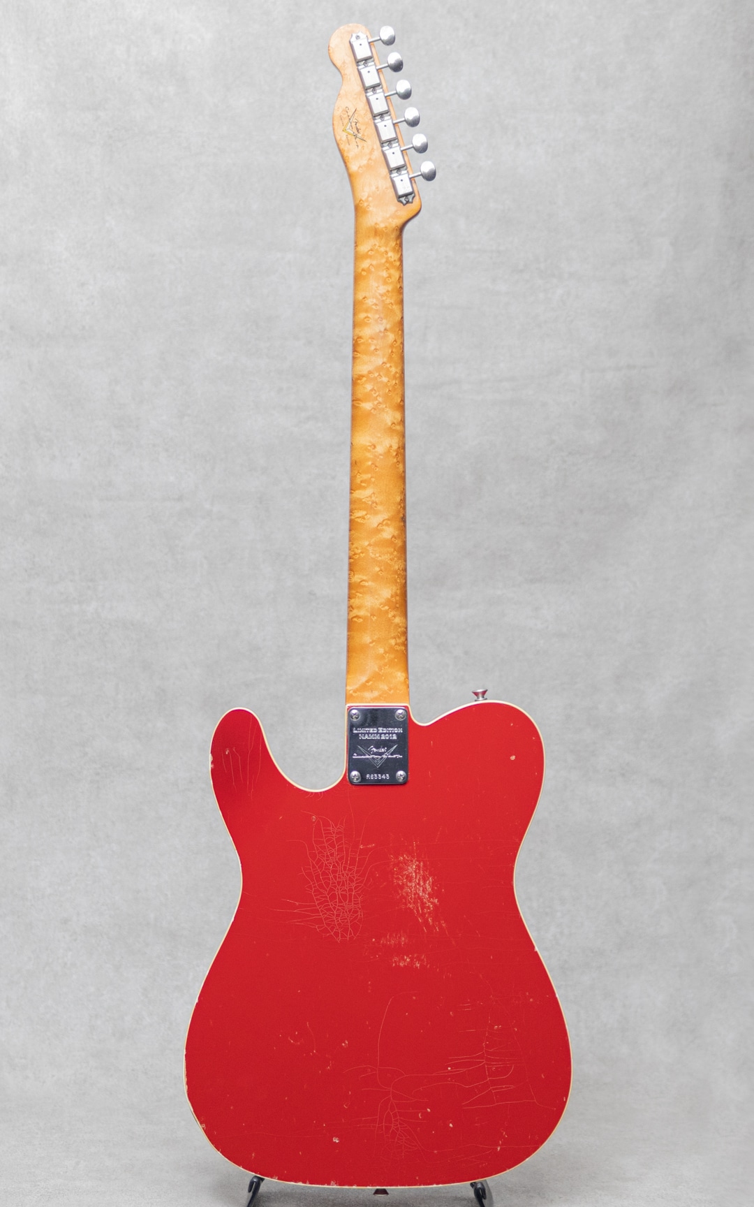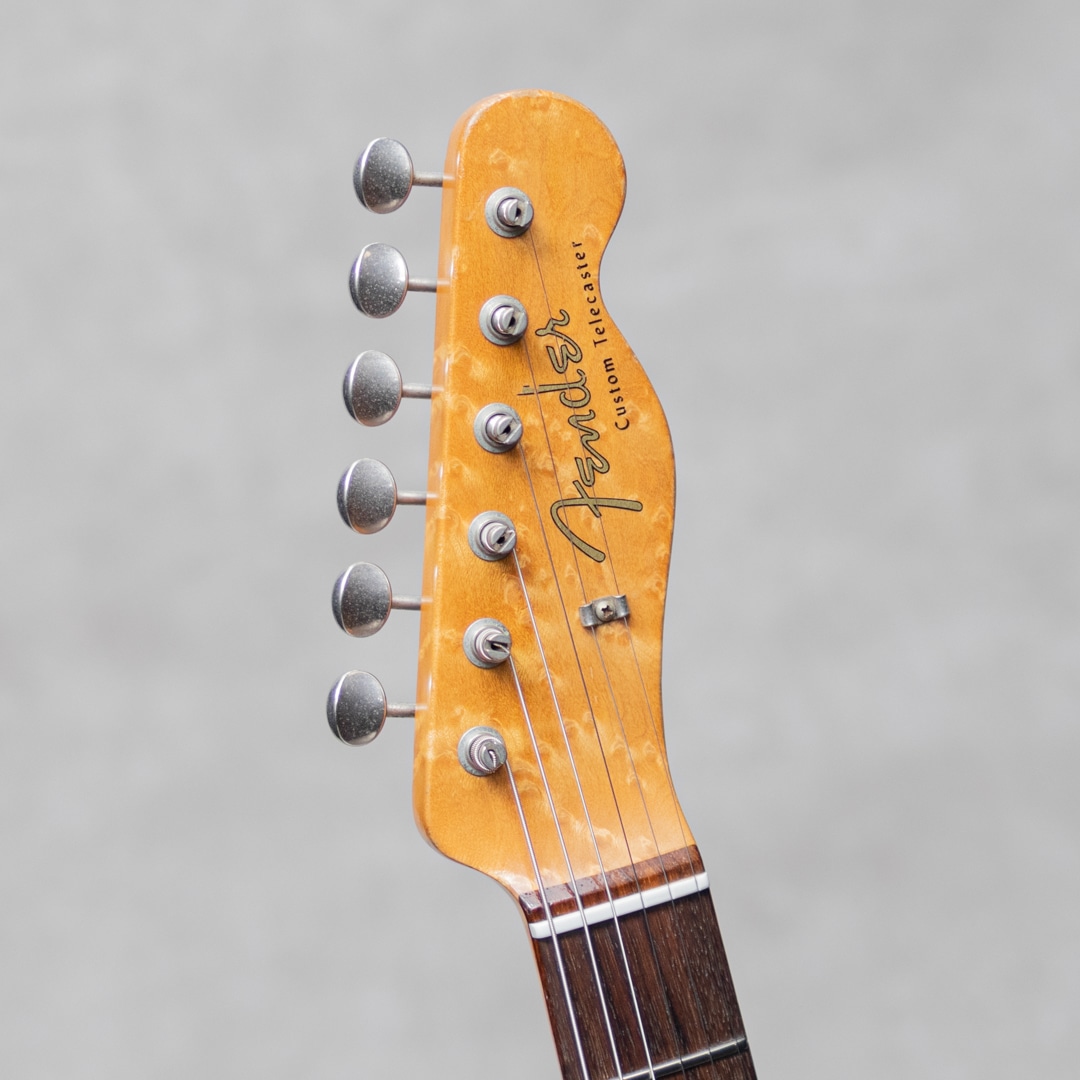 2012 NAMMショーリミテッドモデル”Telecaster Custom w/Bigsby Closet Classic”。ビグスビーB5搭載仕様の2012年製USED品。”Dakota Red(ダコタ・レッド)”と思われる深い赤が特徴のカラーで、極上のAAAバーズアイメイプルをネックに使用した程よく使い込まれたクールな1本。アルダーボディ、ラウンドローズ指板のウッドスペックで、ネック材には全体にびっしりと鳥眼杢が浮き出た極上のAAAメイプル材が使用されています。ネックグリップは1f/約8.3”-12f/約9.0”ほどのCシェイプで、ロウフレットはほんの僅かに肉付きがありながらハイフレットへのテーパーがキツくないネックシェイプ。エイジドホワイトカラーの3plyピックガードにBigsby B5とCCハードウェアを使用。ピックアップには、”Abigail Ybarra(アイビゲイル・イバラ)”によるハンドワウンド"Twisted Tele”ピックアップを搭載。コンデンサーにセラミック0.05uFとハイパスコンデンサーを組み込んだモダンテレキャスター配線になっており、ネック・パラMIX・ブリッジのPUセレクトとマスターVol、マスターToneのコントロール配線です。元気で快活なテレキャスターサウンド。しっかりとキレがありながら、裏通しでない弦テンションによる倍音味も感じられる扱いやすいトーン。野太くガツンと出てくれながらミドルまでしっかりと芯の通ったサウンドを響かせてくれます。元々はクローゼットクラシック仕上げだった本器ですが、オリジナルRelicモデルかと思わせる外観。使い込みによる打痕・小傷や バックル傷などが見られますが、いずれもイヤらしい印象は受けず馴染み良い雰囲気です。ネックまわりも良好で、ネックコンディションもとても良好でトラスロッドの余裕もあり、低いアクションにセットアップしていますがハイフレットまで音詰まりなく演奏面も良好です。フレットは6105/ナロートールサイズが使用されており約85%〜90%以上ほどの残りでしっかりとプレイいただけます。ガンガンとお使いいただきたい弾き込まれたビグスビーテレ。クールなルックスと確かなサウンドの1本、是非お手元で。。Fender製モールドハードケース、認定書が付属します。