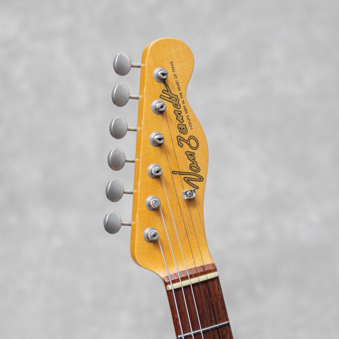 “Neo Vintage”を感じさせる”Vanzandt”。数多くのミュージシャンから愛されたテキサス生まれの”Van Zandt”ピックアップを搭載し、国産の確かな技術で作り上げられるギターは、その価格以上のクオリティを感じずにはいられない実力派ギター。本器は60年代モデルを踏襲したバインディング付きの”STV-R2 3Tone Sunburst”。指板材にハカランダを使用されたプレミアムな1本。2005年製USED品。アルダー2pcsボディ、こだわりの板目取りでうっすらとフレイム杢の浮き出るメイプルネックにスラブ指板のウッドスペックといった王道スペック。指板材には美しい杢のハカランダ材が使用されています。ネックグリップは21フレット仕様の60 Style Oval Cシェイプで、厚すぎず薄すぎない弾き心地の良いネックシェイプ。ピックアップには”Van Zandt” Tele-N&B-55を搭載、トーンコンデンサーにはオレンジドロップコンデンサーを使用。モダン配線でフロント・パラMIX・リアのPUセレクトとマスターVol、マスターToneのコントロール配線です。キレがありアタックに長けながらも甘いトーンを帯同する60sを思わせるサウンド。しっかりと輪郭をともなう低音と粘るサスティン。ブルースにもロックにもしっかりと使える高いポテンシャルを持つ1本です。極薄塗装ゆえ幾らかの小傷やバックル傷は否めませんが、大きな塗装剥がれや嫌らしく目立つ傷はなく、経年から見ると程良いコンディションの本器。ネックコンディションも良好でフレット減りも殆んど無く、弾きやすいアクションでしっかりとお使いいただけます。憧れやまないハカランダ指板の1本。ワンクラス上を目指したいプレイヤーにオススメです。オリジナルソフトケース付属