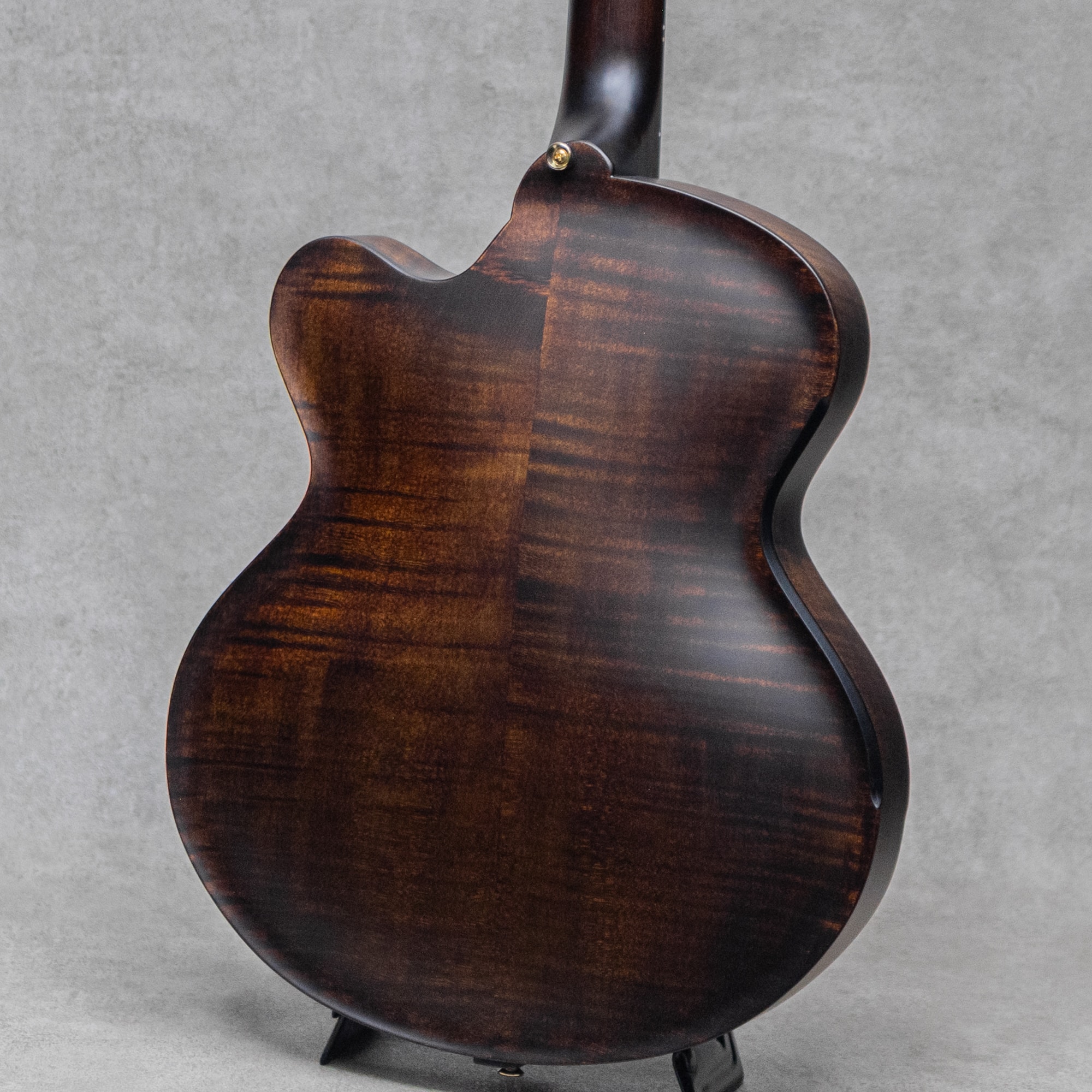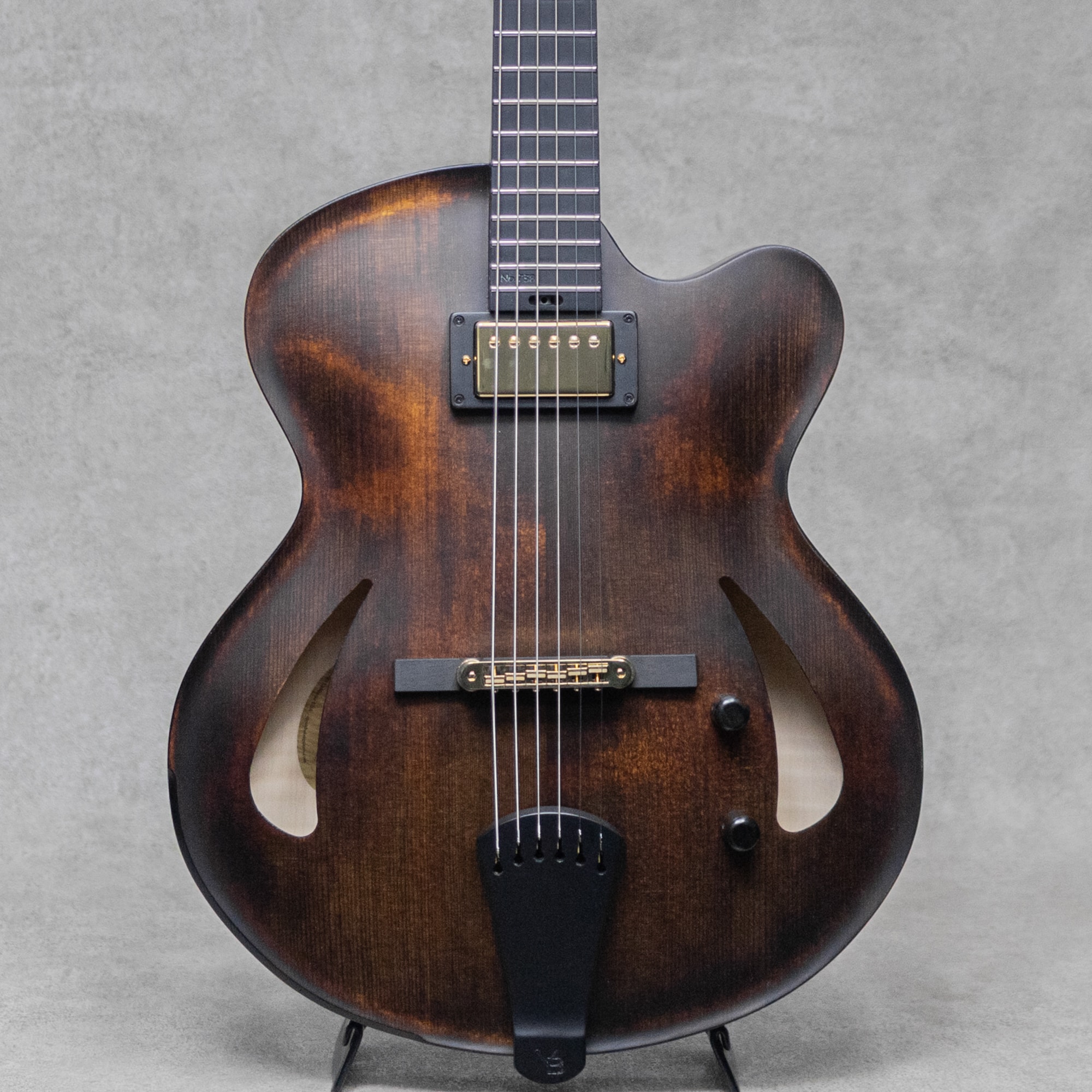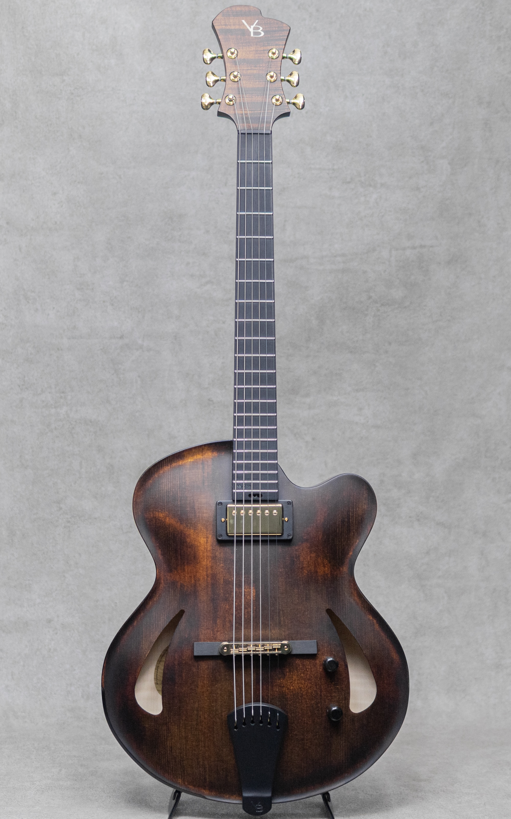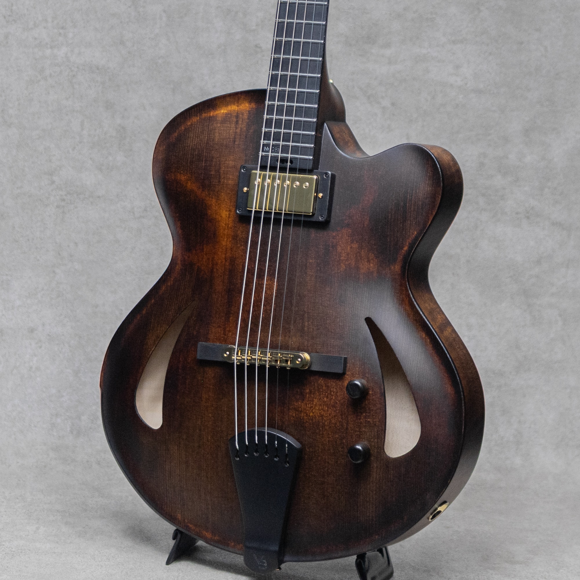 "Victor Baker(ヴィクター・ベイカー)"。自身も卓越したジャズギタリストであり、本拠地とするニューヨークにてアーチトップギター製作開始。ニューヨークの名門と呼ばれるジャズクラブを渡り歩き、名を挙げたベイカーがギター製作に着手したのは2000年。多くのギタリストに愛用されその品質は現場で証明されています。Victor Bakerで最もポピュラーといえるフルホロー15インチモデル。15インチのソリッドスプルーストップ、ソリッドメイプルサイド&バック。マホガニーネック、エボニー指板といったウッドスペックを採用。本器ではピックアップにLoller Pickups製"Imperial"を搭載。またペグ、ピックアップカバー、ブリッジにはゴールドハードウェアを採用し、素朴でシンプルなデザインながら上品な印象も持たせてくれるルックス。塗装面は非常に薄くサテン調に仕上げられており、驚くほど軽量でかつ心地よいフィット感を持った見事な仕上がり。素直でクリアな出音、各フレット上どのポジションでも均整の取れた安定感ある発音でフルホロウアーチトップに求める甘く豊かなトーンをお楽しみいただける1本。ストレスなくプレイできる持ち心地とプレイアビリティの高さも申し分無しのギターです。Reunion Blues製ギグケースが付属。