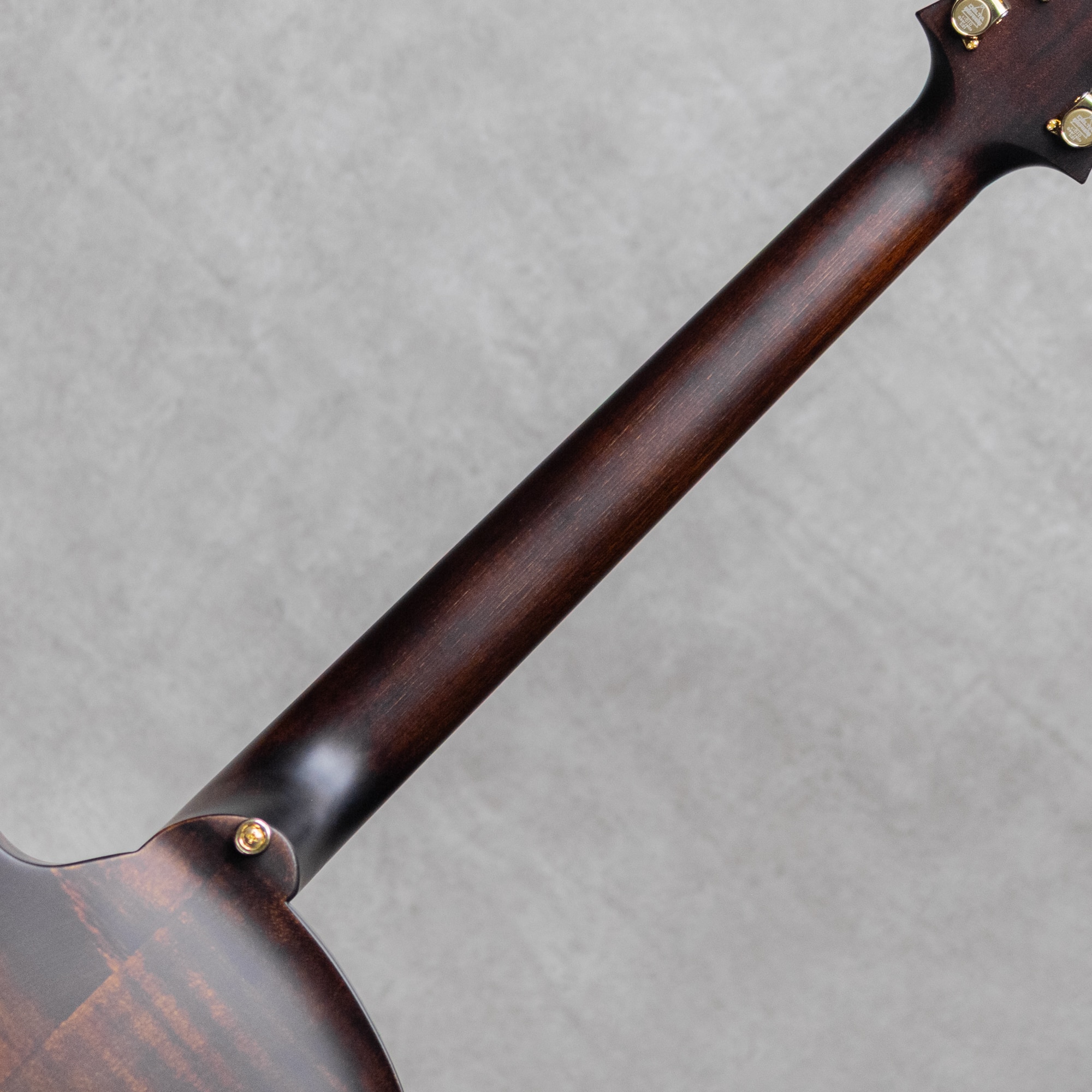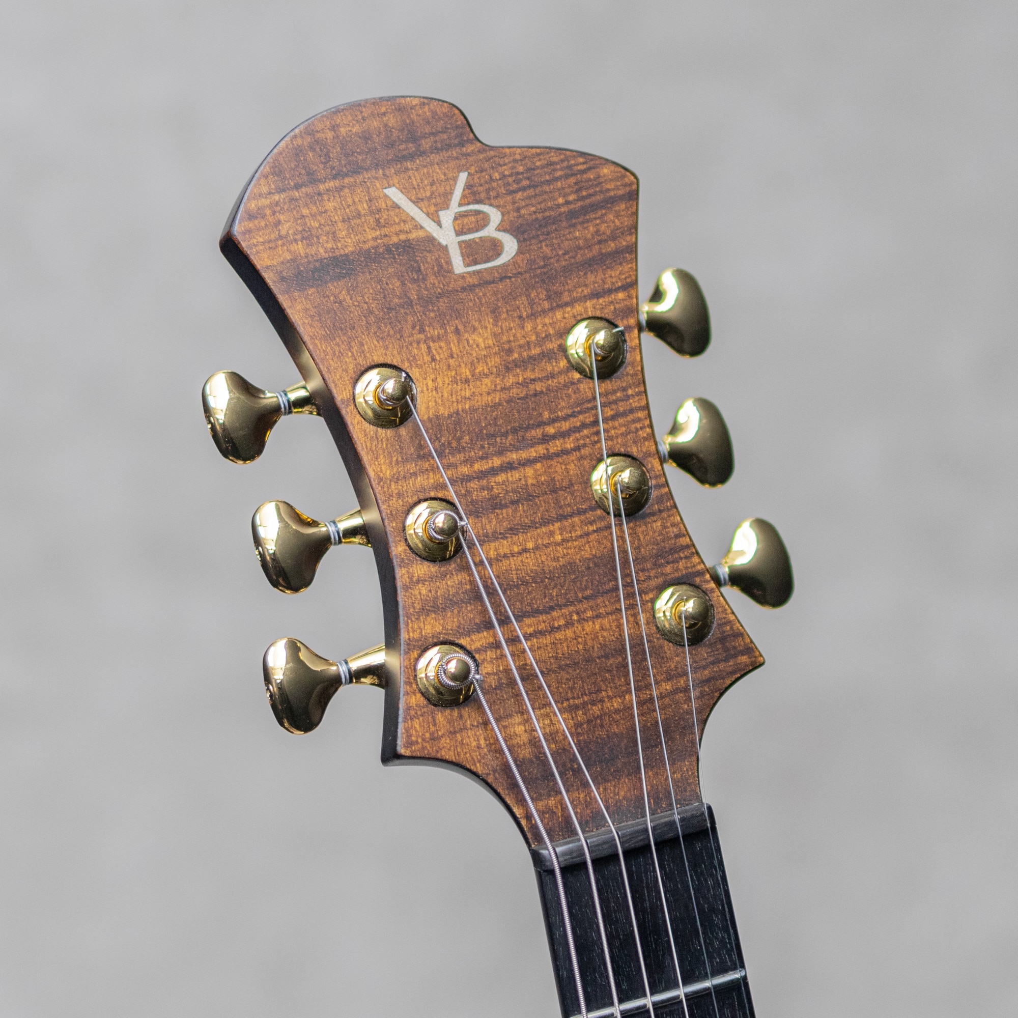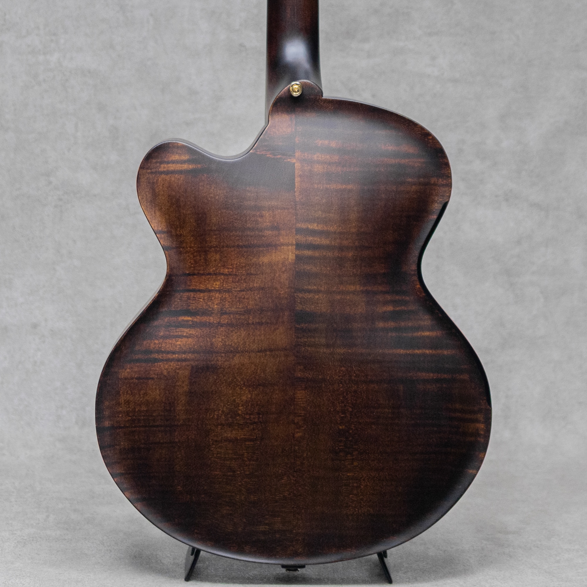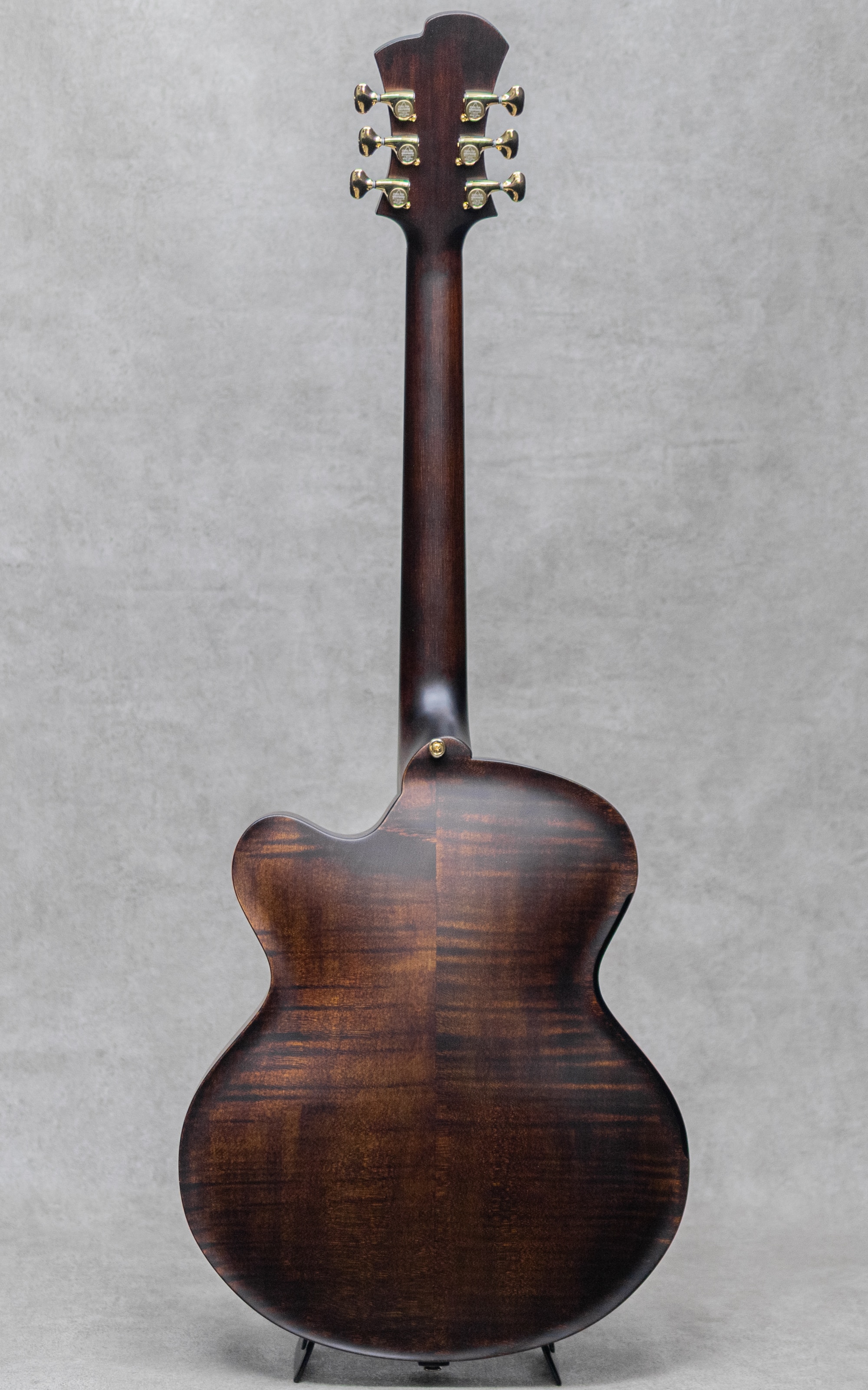 "Victor Baker(ヴィクター・ベイカー)"。自身も卓越したジャズギタリストであり、本拠地とするニューヨークにてアーチトップギター製作開始。ニューヨークの名門と呼ばれるジャズクラブを渡り歩き、名を挙げたベイカーがギター製作に着手したのは2000年。多くのギタリストに愛用されその品質は現場で証明されています。Victor Bakerで最もポピュラーといえるフルホロー15インチモデル。15インチのソリッドスプルーストップ、ソリッドメイプルサイド&バック。マホガニーネック、エボニー指板といったウッドスペックを採用。本器ではピックアップにLoller Pickups製"Imperial"を搭載。またペグ、ピックアップカバー、ブリッジにはゴールドハードウェアを採用し、素朴でシンプルなデザインながら上品な印象も持たせてくれるルックス。塗装面は非常に薄くサテン調に仕上げられており、驚くほど軽量でかつ心地よいフィット感を持った見事な仕上がり。素直でクリアな出音、各フレット上どのポジションでも均整の取れた安定感ある発音でフルホロウアーチトップに求める甘く豊かなトーンをお楽しみいただける1本。ストレスなくプレイできる持ち心地とプレイアビリティの高さも申し分無しのギターです。Reunion Blues製ギグケースが付属。