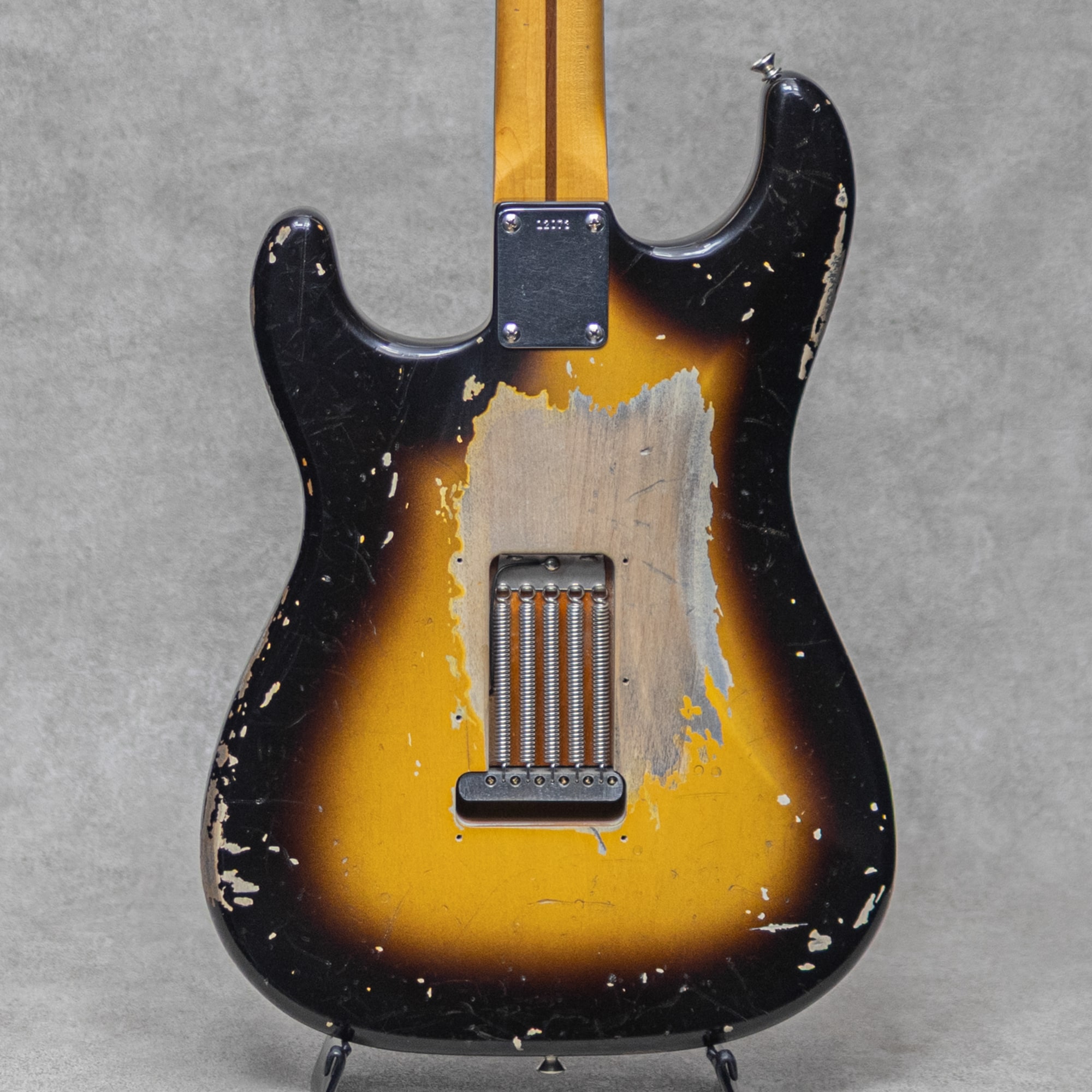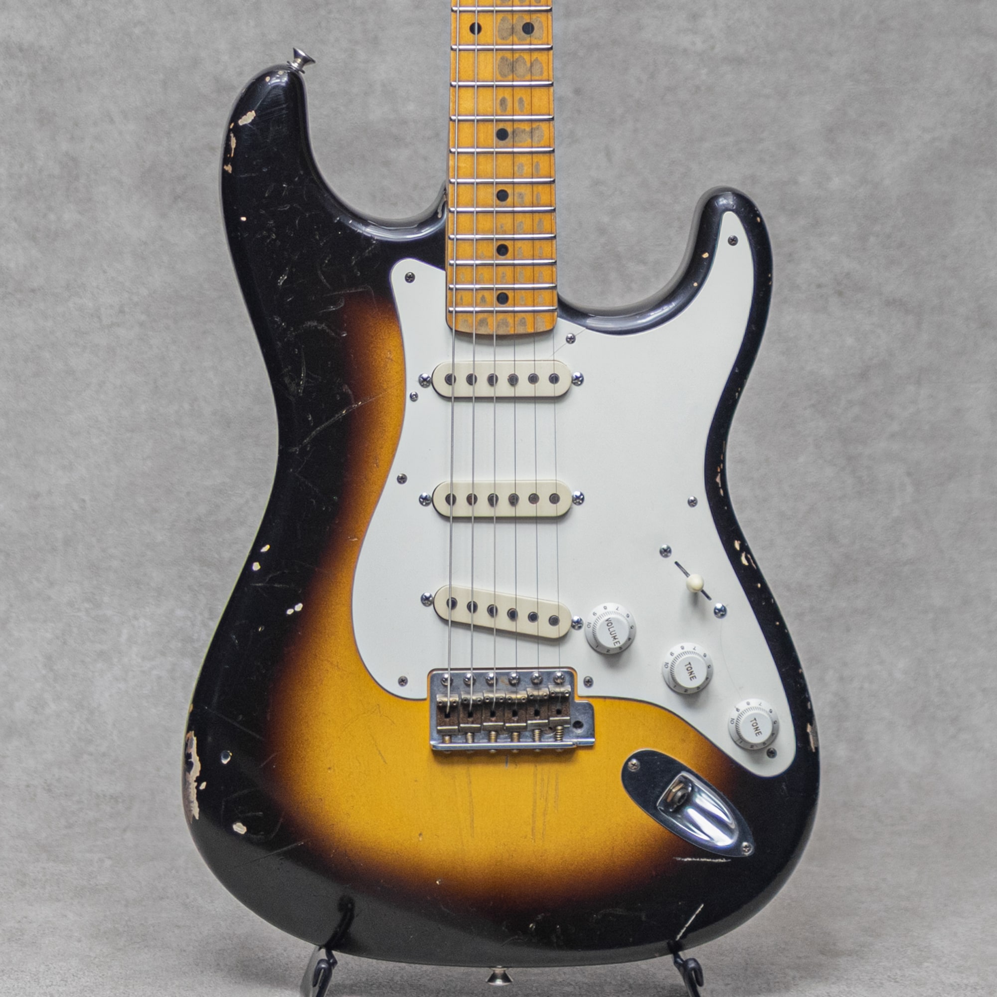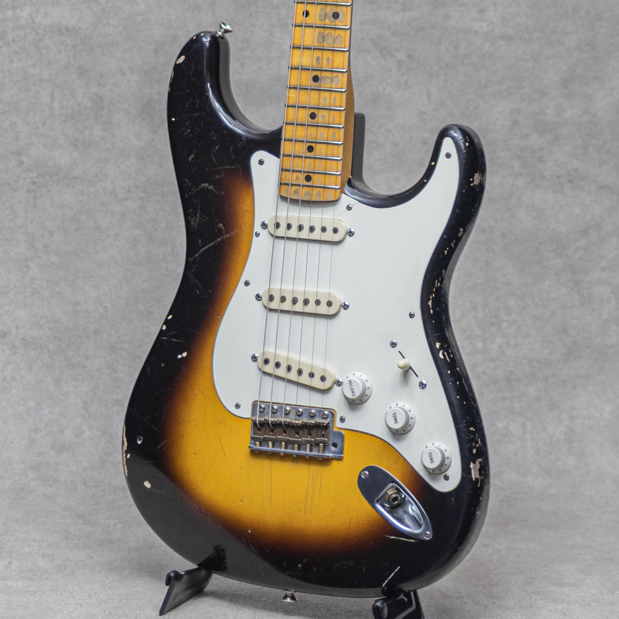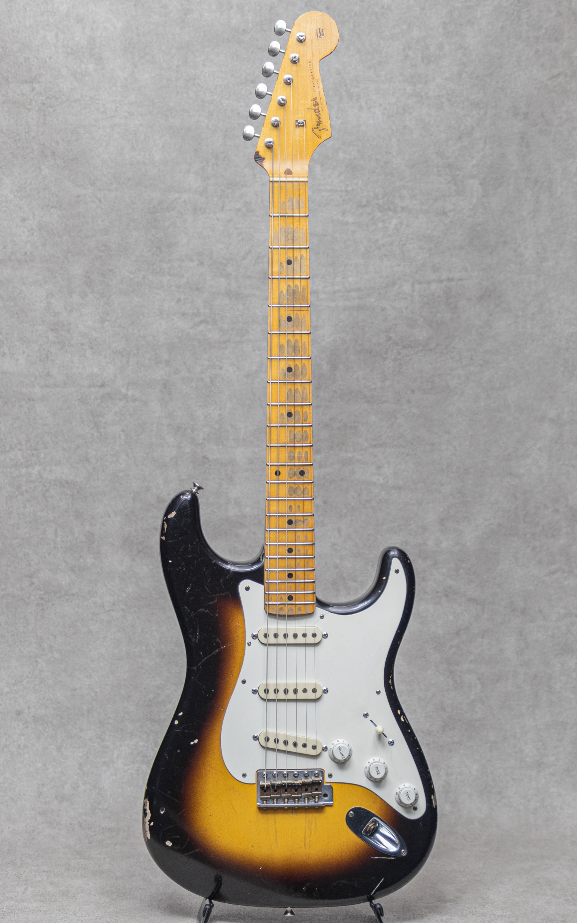 Eric Clapton “Brownie”。エリック・クラプトン自身が初めて手に入れたストラトキャスターとして知られる1956年製のStratocasetr。1967年にロンドンで中古品だったものを自身で購入し、その後レコーディングやライブにて活躍、1999年にNYクリスティーズ・オークションにてギターとしては当時最高価格にて落札され、彼が設立したアルコール・ドラッグ治療センター”クロスロード・センター”の設立資金に充てられた。1967年当時クラプトンはクリームに在籍しており、ずっとメイプル指板のストラトキャスターを探していた。バディ・ホリーやバディ・ガイなどのプレイヤーが弾いていたメイプル指板のストラトキャスター。入手後はとても気に入られ、そのサウンドやルックスは彼の1970年のファーストソロアルバムで見られ、同年デレク&ドミノスの"いとしのレイラ"においてはジャケット写真はもちろん全ての曲でレコーディングにも使用され、その後の彼のギター代名詞になる”Blackie”へと繋がる要石でもあった。本器は、そんな”Brownie”を細部に至るまで忠実にレプリカされた”Eric Clapton "Brownie" Tribute Stratocaster Master Built by Todd Krause”。世界限定100本でマスタービルダー・トッド・クラウスにて製作された1本。モデルナンバー100/100のラストナンバー。2013年製極上USED品。アルダー3ピースボディ、メイプルワンピースネック。ネックシェイプは特製のラージ"ソフトV"シェイプ。7.25”R指板、ビンテージフレット、21フレット仕様。そして、オリジナル”Brownie”のネックプレートと同じ”12073”のシリアル入りネックプレート。”Brownie”の外観特徴である56年当時としては珍しいアシンメトリーのワイドトリムサンバーストや、傷や打痕、お決まりのヘッドタバコ痕など、実器に基づき細かなところまで再現。プラスチックパーツも実器を再現すべく、ピックアップカバーとセレクターノブはエイジドカラーになっており、コントロールノブはベークライト製だったと思われ面取りエイジドをした白っぽいノブを使用するなど、細部までこだわりの詰まった再現度。ピックアップにはカスタムシールディングされたブラックボビンの"Custom 56 Pick Up”x3を搭載、またコンデンサーにはMid50’sを思わせるワックスペーパー”フォンブック”コンデンサーを使用し、サウンド再現の要でもある5wayPUセレクター。ピックガードの下には実器と同じ追加アルミシールドや導電塗料、ジャックまでのシールディング配線など、細やかに再現されています。製作を担当した“Tood Krause”は、ジェフ・ベック、エリック・クラプトン、ボブ・ディラン、デビッド・ギルモア、ロビー・ロバートソン、ケニー・ウェイン・シェパード、ロビン・トロワーなどなど、世界で最も偉大なミュージシャンのために絶妙にカスタマイズされた楽器を製作する大ベテラン。多くの経験値を積みながら1997年にマスタービルダーに就任し、自身の個人的なデザイン哲学を体現しながら独特の楽器を製作する人気ビルダーです。本器のコンディションは使用された形跡はなく、完全なコレクターピースとして保管されてきた1本。新品時以降についた傷などもなく、完璧な状態で保管されています。数多くのミュージシャンモデルの中でも、Fenderにとっても大きな意味合いを持つEric Clapton Stratocaster。それらの原点ともなるクラプトン自身が初めて手にした”Brownie”のトリビュートモデルは、ファンなら外せない原点回帰の1本です。実器に付属していたステンシルマークの”FRAGILE/DEREK AND THE DOMINOS"ブラックトーレックス"アンダーライン”ケースも復刻されており付属。残念ながら"いとしのレイラ”40thアニバーサリーボックスセットやFender Custom Shopブックレットは欠品していますが、Eric Clapton直筆サイン入り認定書やストラップ、シールドやその他新品時付属品はしっかりと残され付属しています。