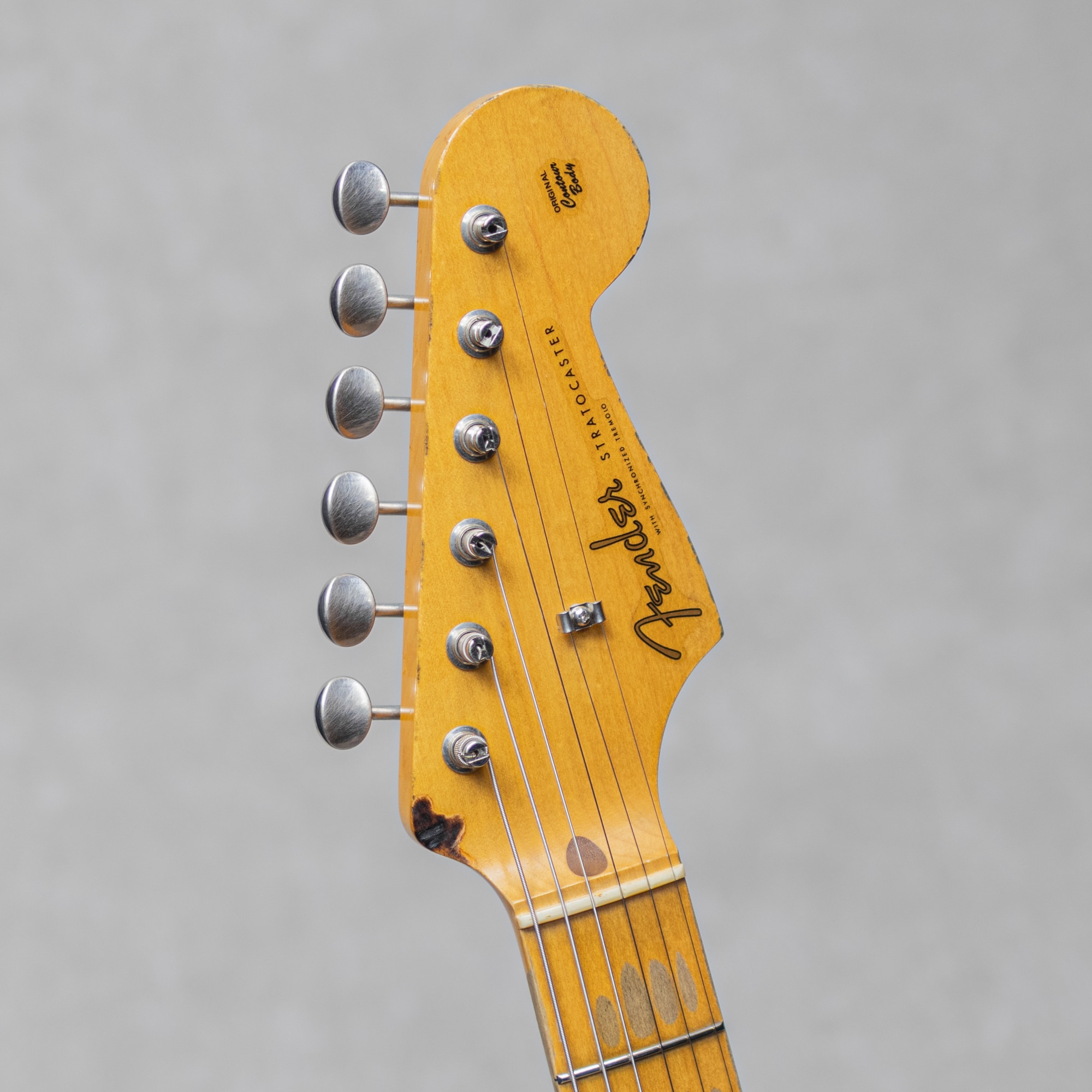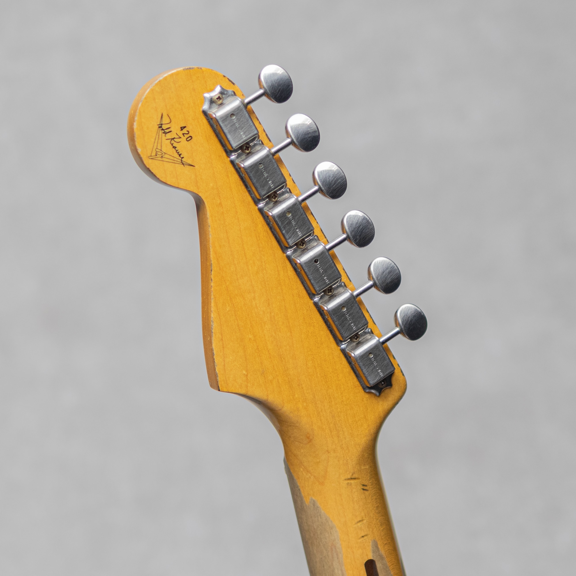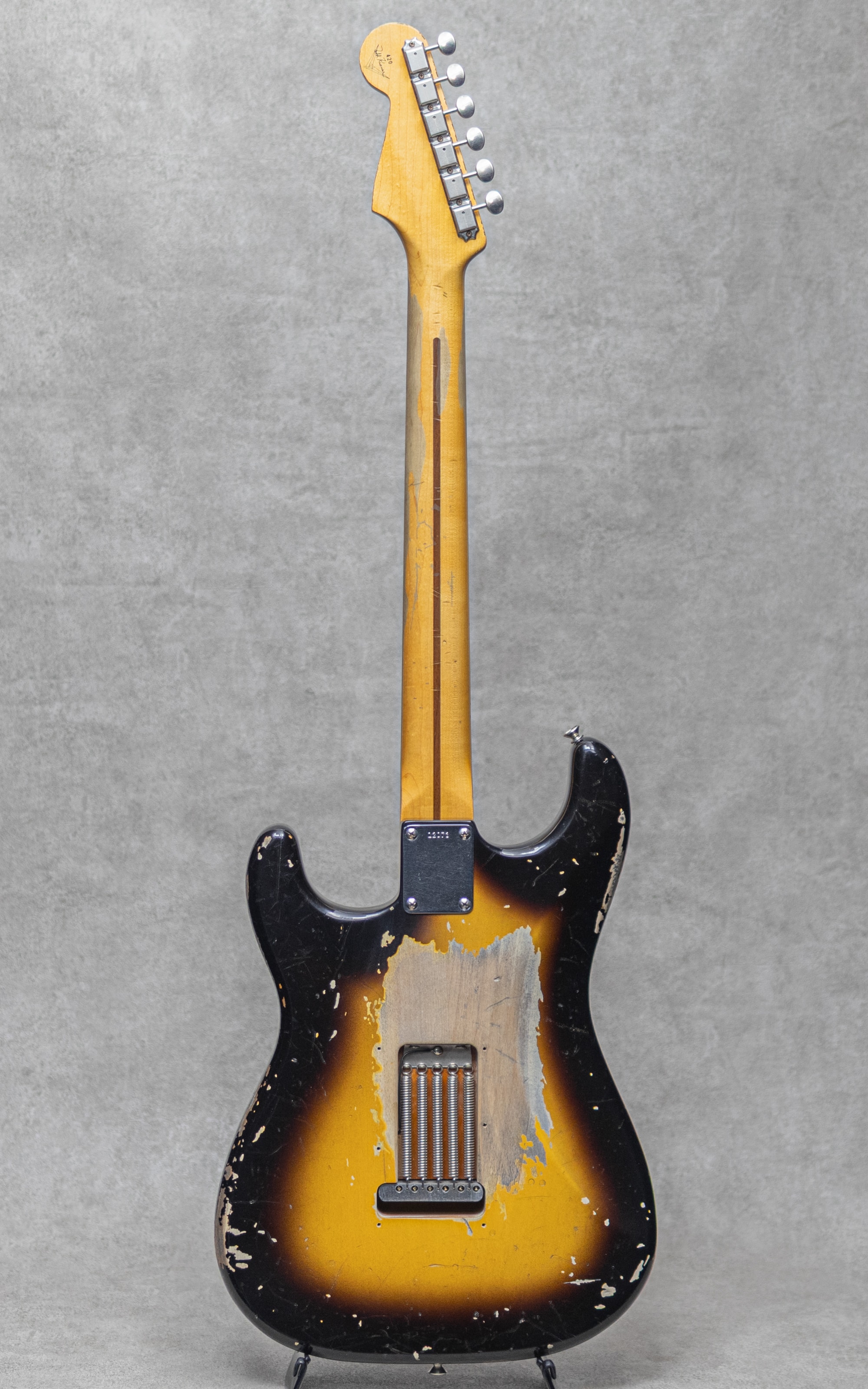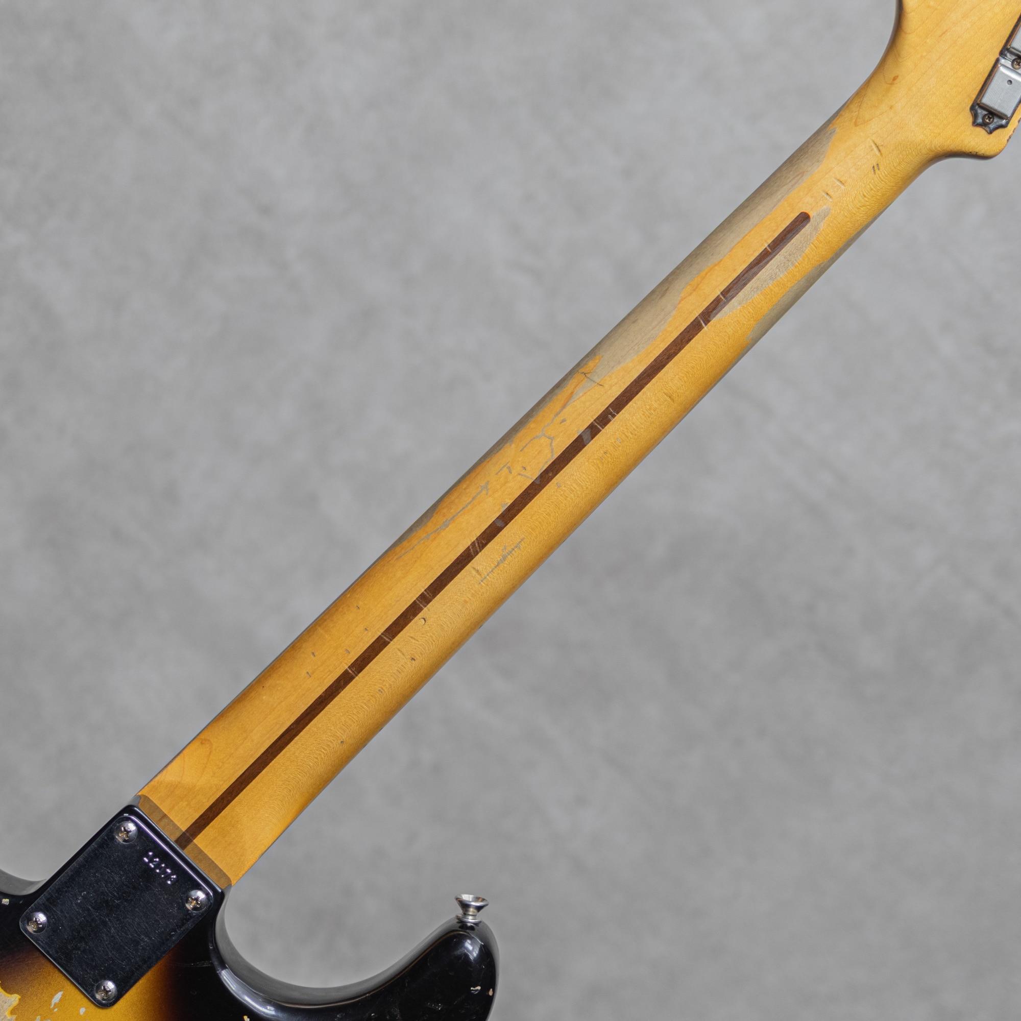 Eric Clapton “Brownie”。エリック・クラプトン自身が初めて手に入れたストラトキャスターとして知られる1956年製のStratocasetr。1967年にロンドンで中古品だったものを自身で購入し、その後レコーディングやライブにて活躍、1999年にNYクリスティーズ・オークションにてギターとしては当時最高価格にて落札され、彼が設立したアルコール・ドラッグ治療センター”クロスロード・センター”の設立資金に充てられた。1967年当時クラプトンはクリームに在籍しており、ずっとメイプル指板のストラトキャスターを探していた。バディ・ホリーやバディ・ガイなどのプレイヤーが弾いていたメイプル指板のストラトキャスター。入手後はとても気に入られ、そのサウンドやルックスは彼の1970年のファーストソロアルバムで見られ、同年デレク&ドミノスの"いとしのレイラ"においてはジャケット写真はもちろん全ての曲でレコーディングにも使用され、その後の彼のギター代名詞になる”Blackie”へと繋がる要石でもあった。本器は、そんな”Brownie”を細部に至るまで忠実にレプリカされた”Eric Clapton "Brownie" Tribute Stratocaster Master Built by Todd Krause”。世界限定100本でマスタービルダー・トッド・クラウスにて製作された1本。モデルナンバー100/100のラストナンバー。2013年製極上USED品。アルダー3ピースボディ、メイプルワンピースネック。ネックシェイプは特製のラージ"ソフトV"シェイプ。7.25”R指板、ビンテージフレット、21フレット仕様。そして、オリジナル”Brownie”のネックプレートと同じ”12073”のシリアル入りネックプレート。”Brownie”の外観特徴である56年当時としては珍しいアシンメトリーのワイドトリムサンバーストや、傷や打痕、お決まりのヘッドタバコ痕など、実器に基づき細かなところまで再現。プラスチックパーツも実器を再現すべく、ピックアップカバーとセレクターノブはエイジドカラーになっており、コントロールノブはベークライト製だったと思われ面取りエイジドをした白っぽいノブを使用するなど、細部までこだわりの詰まった再現度。ピックアップにはカスタムシールディングされたブラックボビンの"Custom 56 Pick Up”x3を搭載、またコンデンサーにはMid50’sを思わせるワックスペーパー”フォンブック”コンデンサーを使用し、サウンド再現の要でもある5wayPUセレクター。ピックガードの下には実器と同じ追加アルミシールドや導電塗料、ジャックまでのシールディング配線など、細やかに再現されています。製作を担当した“Tood Krause”は、ジェフ・ベック、エリック・クラプトン、ボブ・ディラン、デビッド・ギルモア、ロビー・ロバートソン、ケニー・ウェイン・シェパード、ロビン・トロワーなどなど、世界で最も偉大なミュージシャンのために絶妙にカスタマイズされた楽器を製作する大ベテラン。多くの経験値を積みながら1997年にマスタービルダーに就任し、自身の個人的なデザイン哲学を体現しながら独特の楽器を製作する人気ビルダーです。本器のコンディションは使用された形跡はなく、完全なコレクターピースとして保管されてきた1本。新品時以降についた傷などもなく、完璧な状態で保管されています。数多くのミュージシャンモデルの中でも、Fenderにとっても大きな意味合いを持つEric Clapton Stratocaster。それらの原点ともなるクラプトン自身が初めて手にした”Brownie”のトリビュートモデルは、ファンなら外せない原点回帰の1本です。実器に付属していたステンシルマークの”FRAGILE/DEREK AND THE DOMINOS"ブラックトーレックス"アンダーライン”ケースも復刻されており付属。残念ながら"いとしのレイラ”40thアニバーサリーボックスセットやFender Custom Shopブックレットは欠品していますが、Eric Clapton直筆サイン入り認定書やストラップ、シールドやその他新品時付属品はしっかりと残され付属しています。