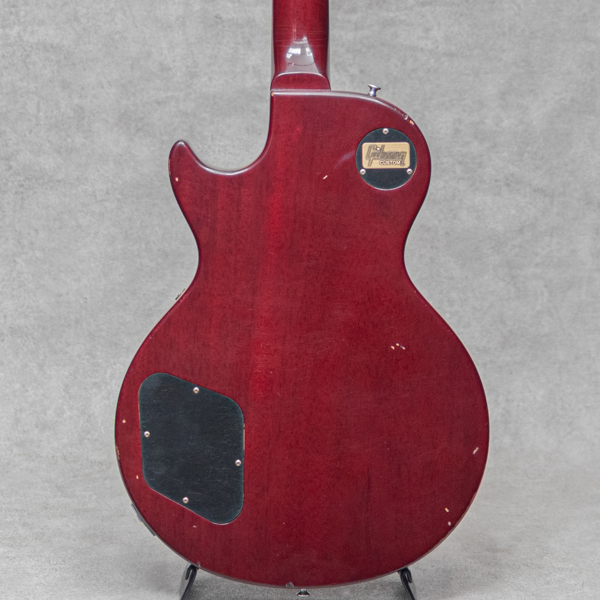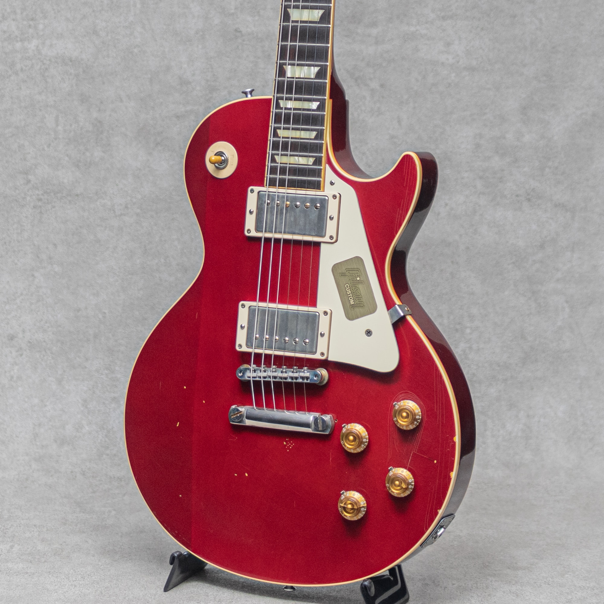 Les Paul "Lucy”。1957年製のLes Paulゴールドトップが幾重の遍歴と歴史を伴って歩んだ1本で、”Rick Derringer(リック・デリンジャー)”が手に入れた後、”Eric Clapton(エリック・クラプトン)”がニューヨークで中古購入し、その後英国に持ち帰り”George Harrison(ジョージ・ハリスン)”にプレゼントされた逸話が有名。リック・デリンジャーが1965年に手に入れた当時は擦り切れたゴールドトップだったため、カラマズーのGibson工場にて当時の人気カラーでもあったSGと同じチェリーカラーに再塗装され、この特有の外観カラーに辿り着きました。また”Lucy”は、ビートルズのレコーディングでジョージ・ハリソンがエリック・クラプトンをレコーディングに呼び、エリックが”Lucy”を使用して演奏した"While My Guitar Gently Weeps”のギターパート録音でも有名です。本器は、そんな”Lucy”を細部に至るまで忠実にレプリカされた”1957 Les Paul Harrison-Clapton "Lucy" Aged”。世界限定100本でギブソン・カスタムショップにて製作された1本。モデルナンバー096/100。2013年製極上USED品。6弦側に大きくそれたオフセットセンターのメイプルトップにマホガニーバックのボディ。ゴールドトップからのリフィニッシュならではの雰囲気を木部の色味の違いを含めて見事に再現されています。マホガニーネック、ローズウッド指板、パーロイドディッシュ指板インレイ。ペグのクルーソンデラックスからグローバー102Cへと載せ替えた痕や、”CUSTOM”刻印入りのロッドカバー、黒色プライのジャックプレート、エンドピン周囲のテイルピース痕のネジなど、細部にわたりこだわりの再現をされています。ピックアップにはGibson “Custom Bucker” x2を搭載、またコンデンサーにはバンブルビーレプリカコンデンサーを使用。ボディにはウェザーチェックや打痕など、リアルなエイジド加工が施されています。本器のコンディションは使用された形跡はなく、完全なコレクターピースとして保管されてきた1本。新品時以降についた傷などもなく、完璧な状態で保管されています。数多くの銘器レスポールの中でも歴史的にも重要なモデルの1つ、”Lucy”。なかなか出回らないエリック・クラプトン、ジョージハリスンのダブルネームを冠したリミテッドモデル、ファンなら外せない1本です。オリジナルハードケース、クラプトンインタビュー映像ディスク、特性ブックレット&リマスターLPなど、新品時付属品もしっかりと残され付属しています。