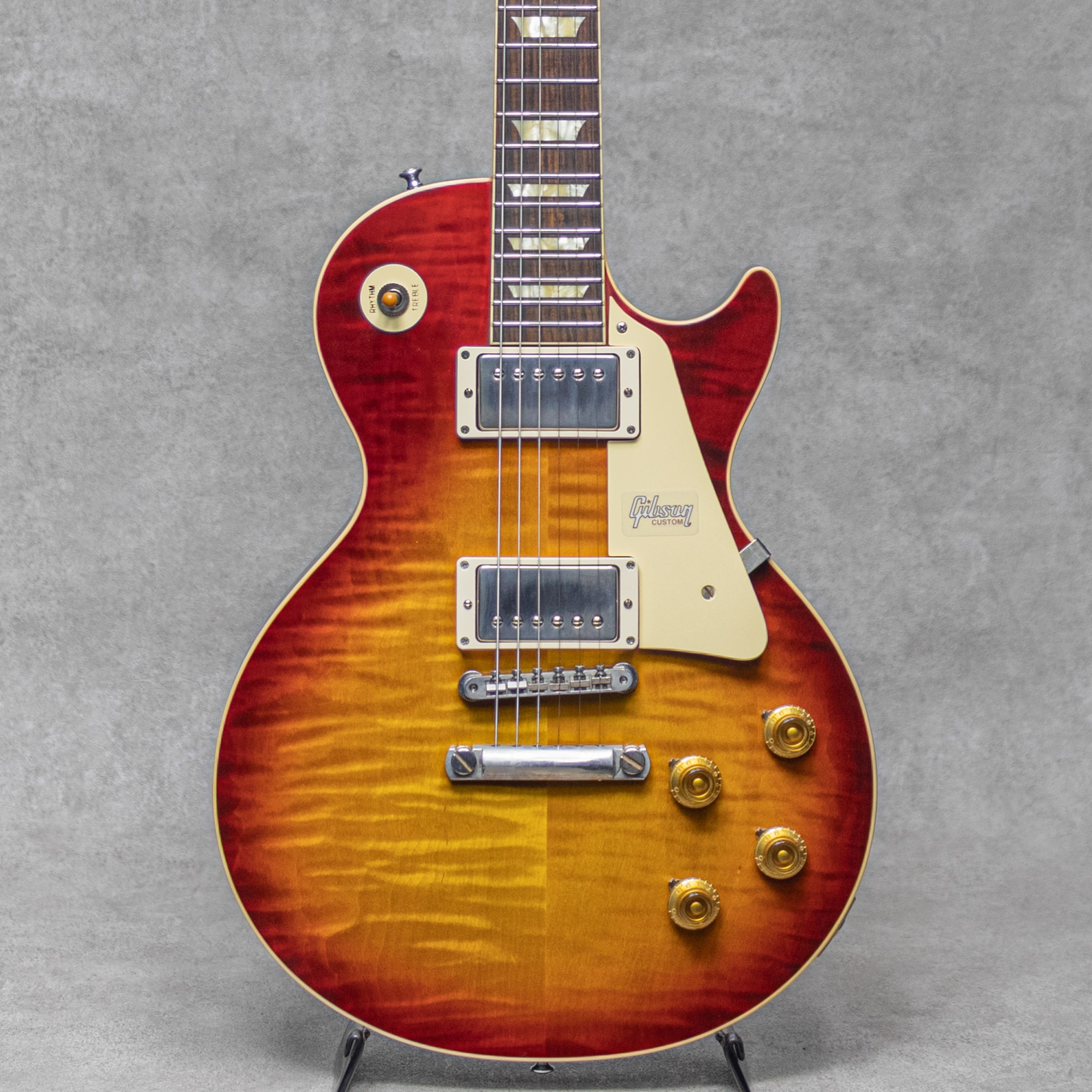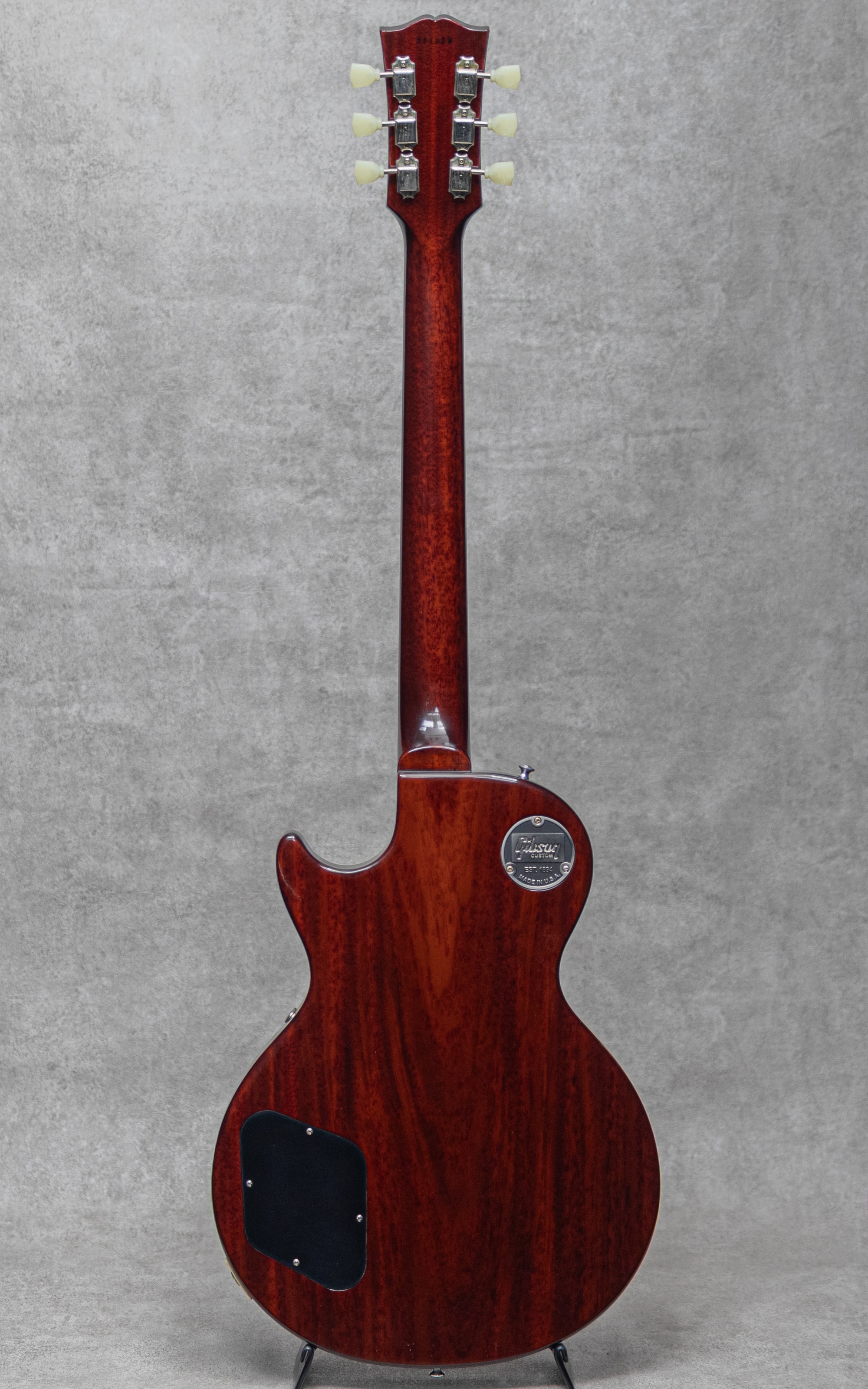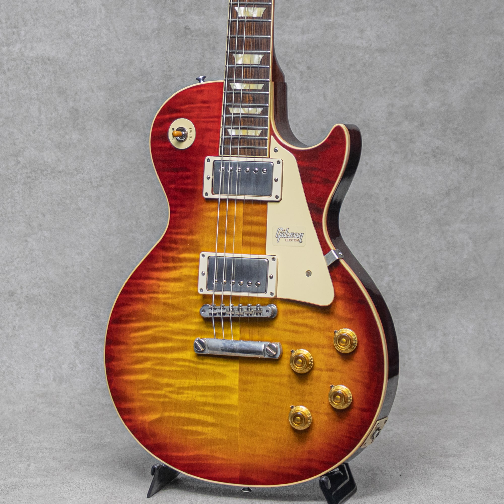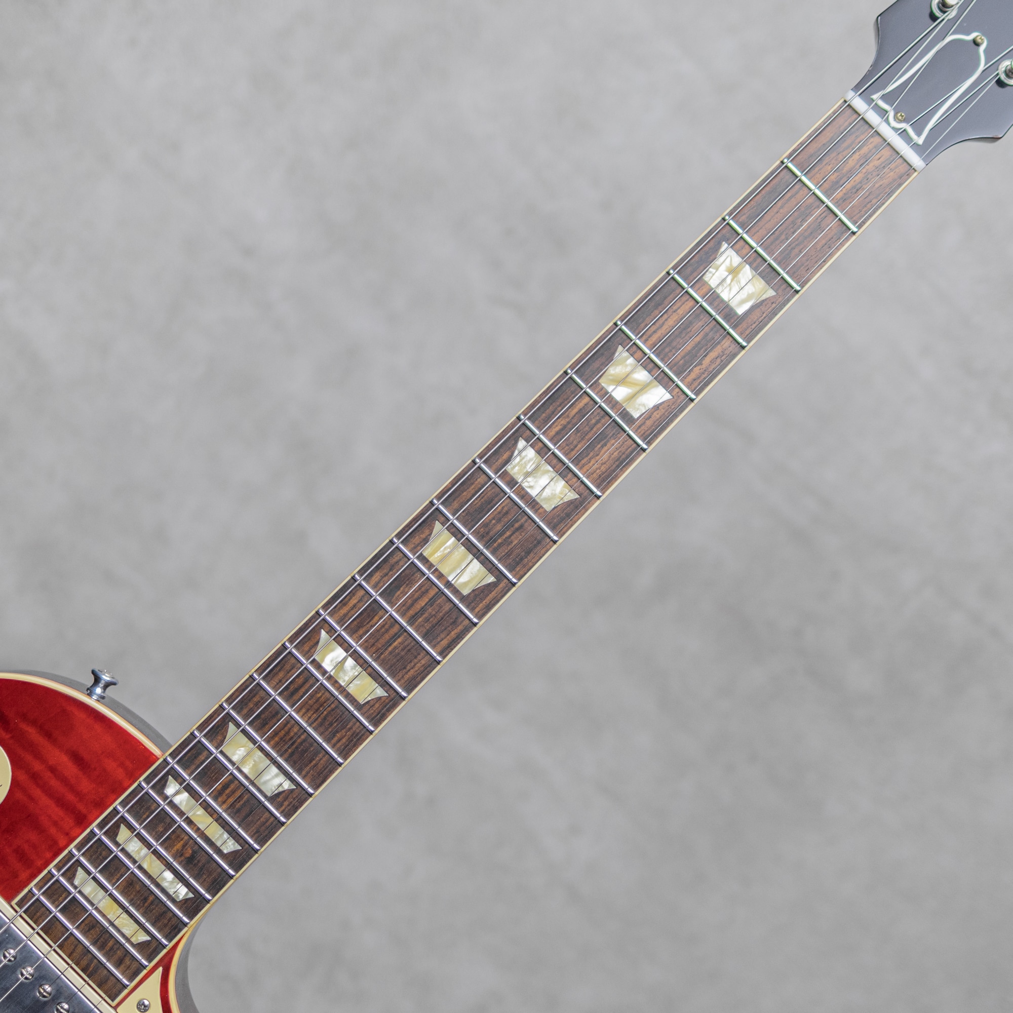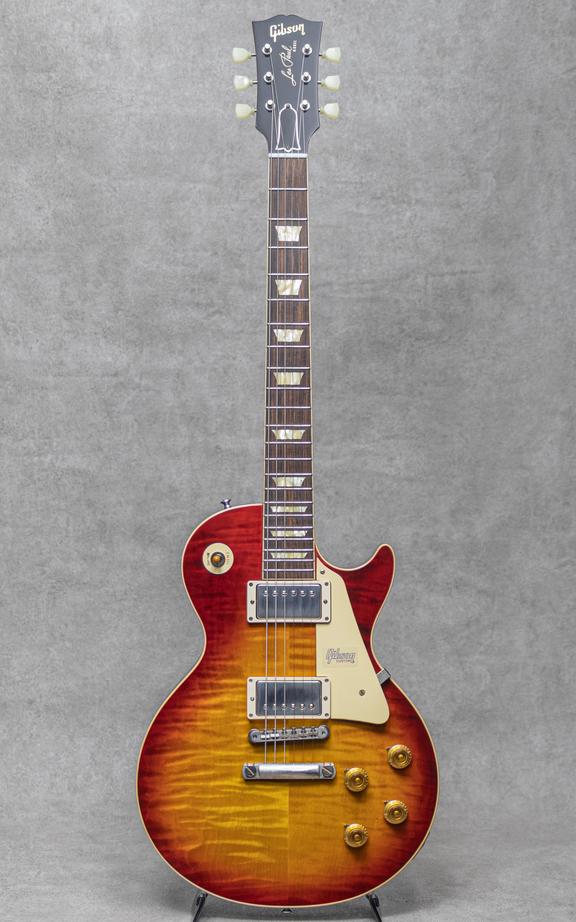 Gibson Custom Shopのフラッグシップモデル"1959 Les Paul Standard Reissue(R9)"に続き、"Historic Collection"を牽引する"1958 Les Paul Standard Reissue (R8)"。グリップのしっかりしたネックプロファイルによって作り出される骨太でガッツのあるサウンドが"R9"とは一味違った魅力を感じさせてくれるモデルです。本器は2018年製"1958 Les Paul Standard Reissue Figured Top VOS"。通常はプレーンメイプルトップが採用される"R8"ですが、本器は国内ディーラーによる材選定オーダーの1本。抜群の木を楽しませてくれるフィギュアドメイプルトップに、これもまた"Les Paul"らしいアイコニックな雰囲気を前面に押し出した"Factory Burst"カラーがとても良く映える外観。2015年の”True Historic”登場以降のスペックで各所のディテールや、ニカワ接着、チューブレストラスロッド、ヴィンテージに倣いロウ付けをしない”アンポッテド”仕様のCustomBuckerに、サーキット内のポットとバンブルビーコンデンサーもよりヴィンテージライクな仕様を採用するなど、昨今のアップデートも網羅している年式です。こちらVOSですので塗装表面のヘアライン、ニッケルハードウェアのくすみ、また仕様に伴う細かな擦り傷程度はあるものの、2019年製ということもあり著しく目立つ使用感、気になるダメージはございません。フレットのヘリもほとんど気にならずネックの状態も良好。新品同様に演奏をお楽しみいただけるグッドコンディションです。オリジナルハードケース、認定書、"ハンドピック証明"が付属。