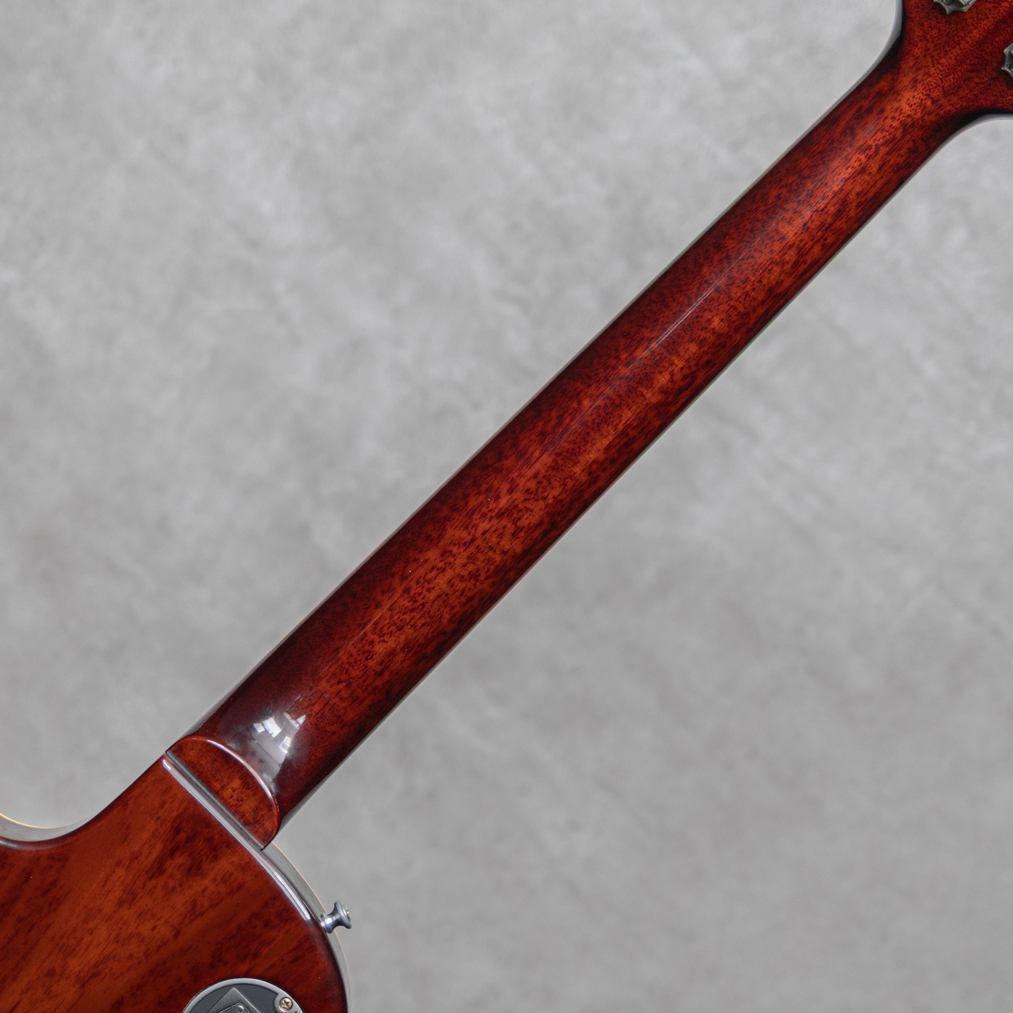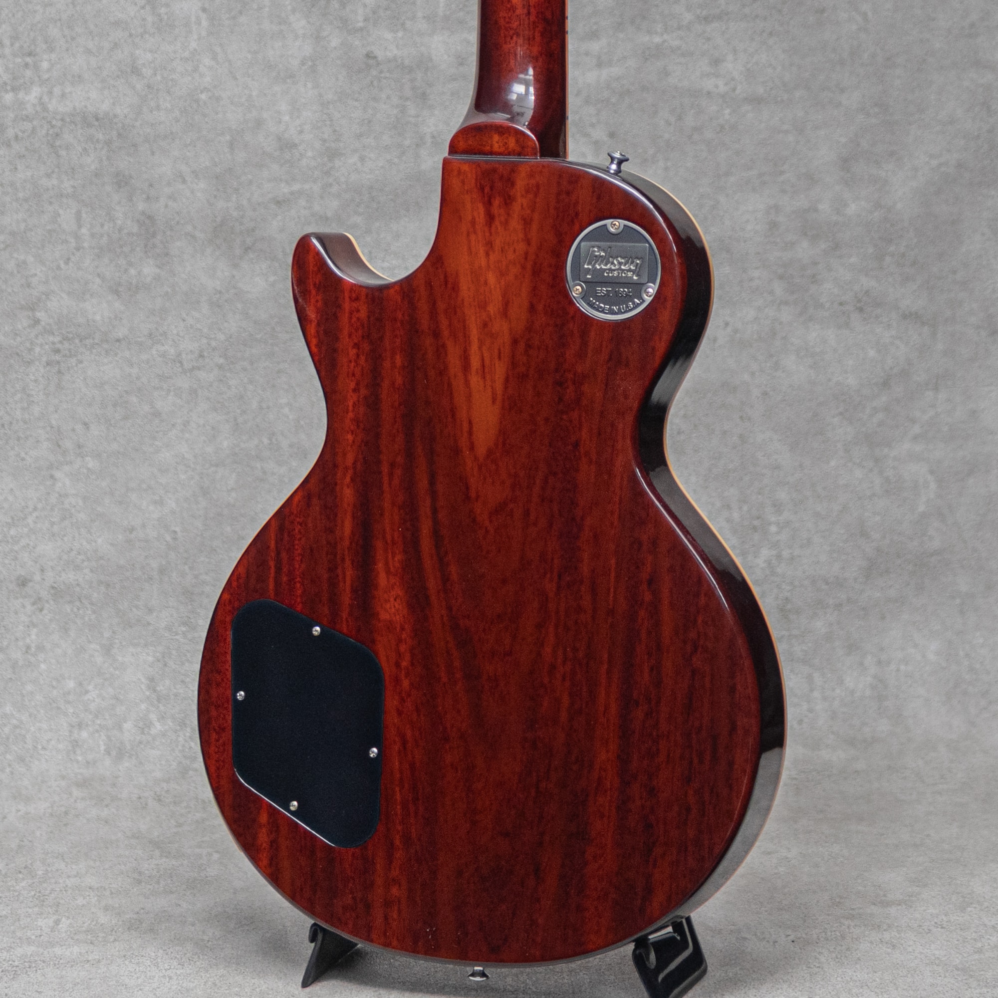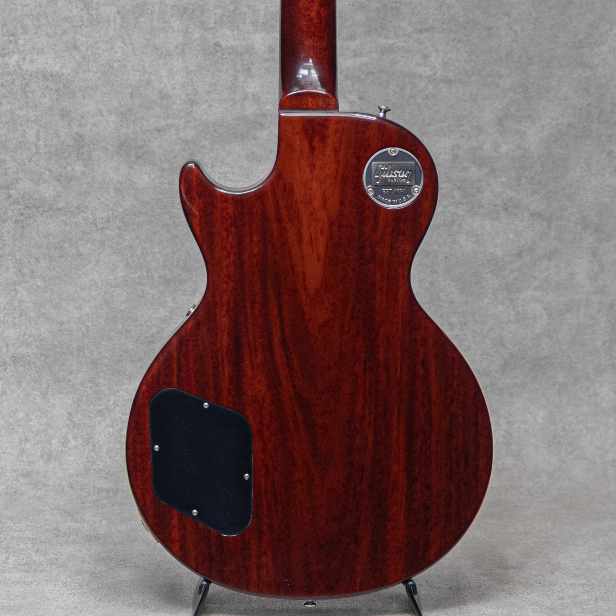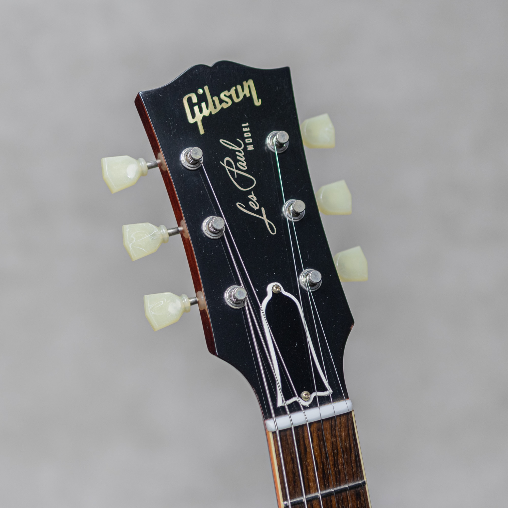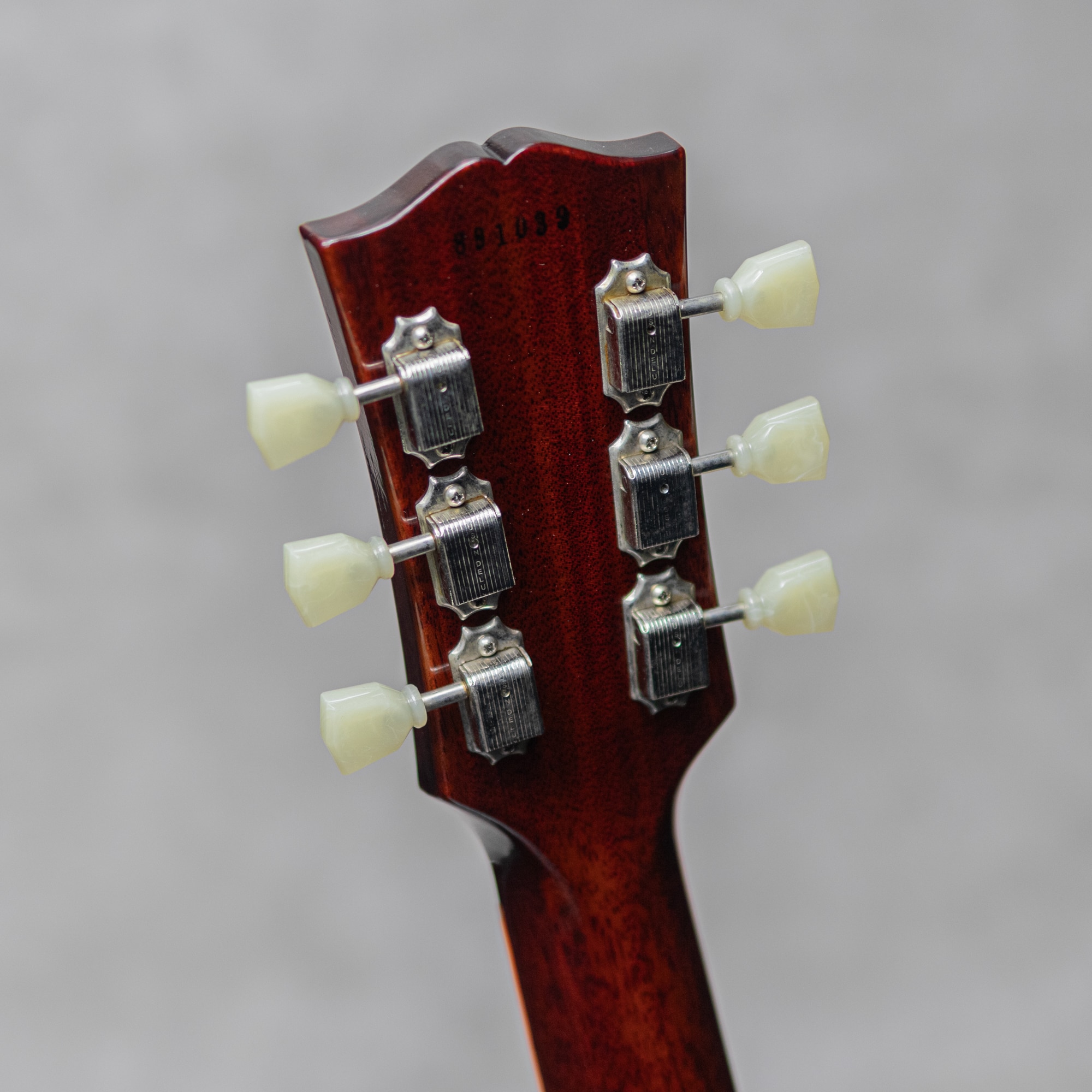 Gibson Custom Shopのフラッグシップモデル"1959 Les Paul Standard Reissue(R9)"に続き、"Historic Collection"を牽引する"1958 Les Paul Standard Reissue (R8)"。グリップのしっかりしたネックプロファイルによって作り出される骨太でガッツのあるサウンドが"R9"とは一味違った魅力を感じさせてくれるモデルです。本器は2018年製"1958 Les Paul Standard Reissue Figured Top VOS"。通常はプレーンメイプルトップが採用される"R8"ですが、本器は国内ディーラーによる材選定オーダーの1本。抜群の木を楽しませてくれるフィギュアドメイプルトップに、これもまた"Les Paul"らしいアイコニックな雰囲気を前面に押し出した"Factory Burst"カラーがとても良く映える外観。2015年の”True Historic”登場以降のスペックで各所のディテールや、ニカワ接着、チューブレストラスロッド、ヴィンテージに倣いロウ付けをしない”アンポッテド”仕様のCustomBuckerに、サーキット内のポットとバンブルビーコンデンサーもよりヴィンテージライクな仕様を採用するなど、昨今のアップデートも網羅している年式です。こちらVOSですので塗装表面のヘアライン、ニッケルハードウェアのくすみ、また仕様に伴う細かな擦り傷程度はあるものの、2019年製ということもあり著しく目立つ使用感、気になるダメージはございません。フレットのヘリもほとんど気にならずネックの状態も良好。新品同様に演奏をお楽しみいただけるグッドコンディションです。オリジナルハードケース、認定書、"ハンドピック証明"が付属。