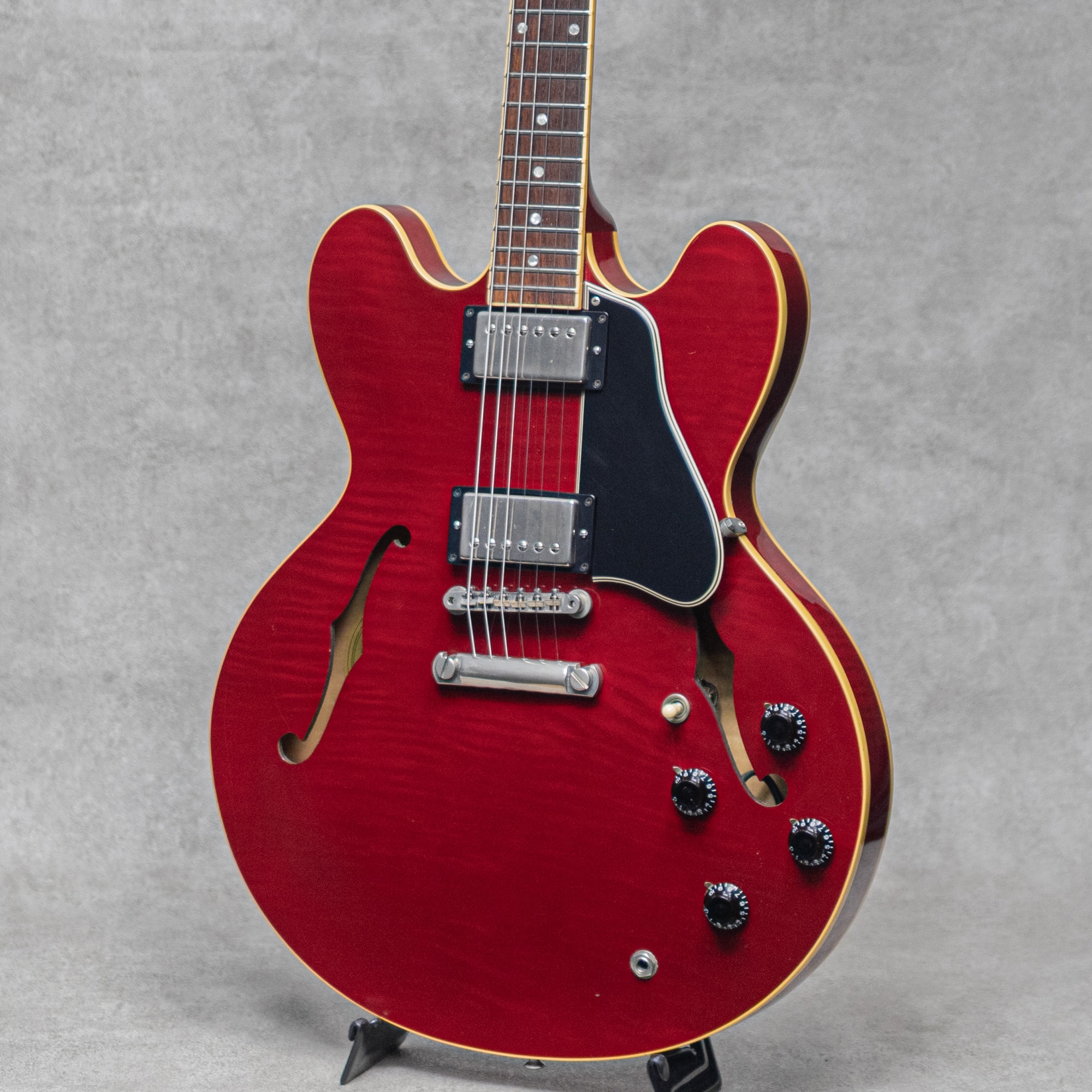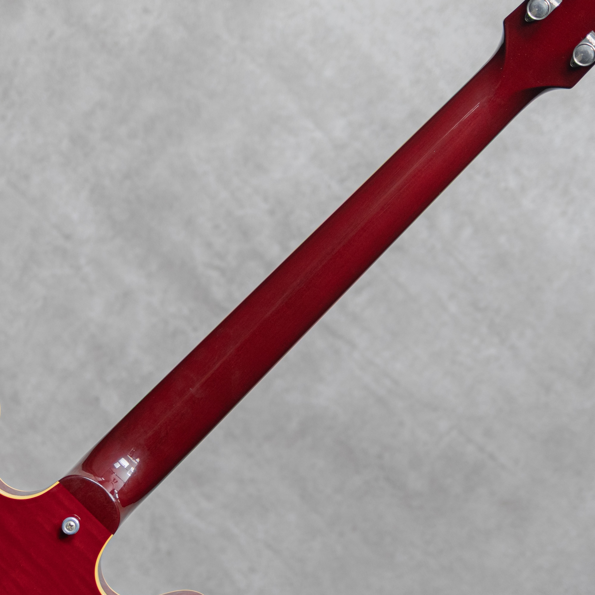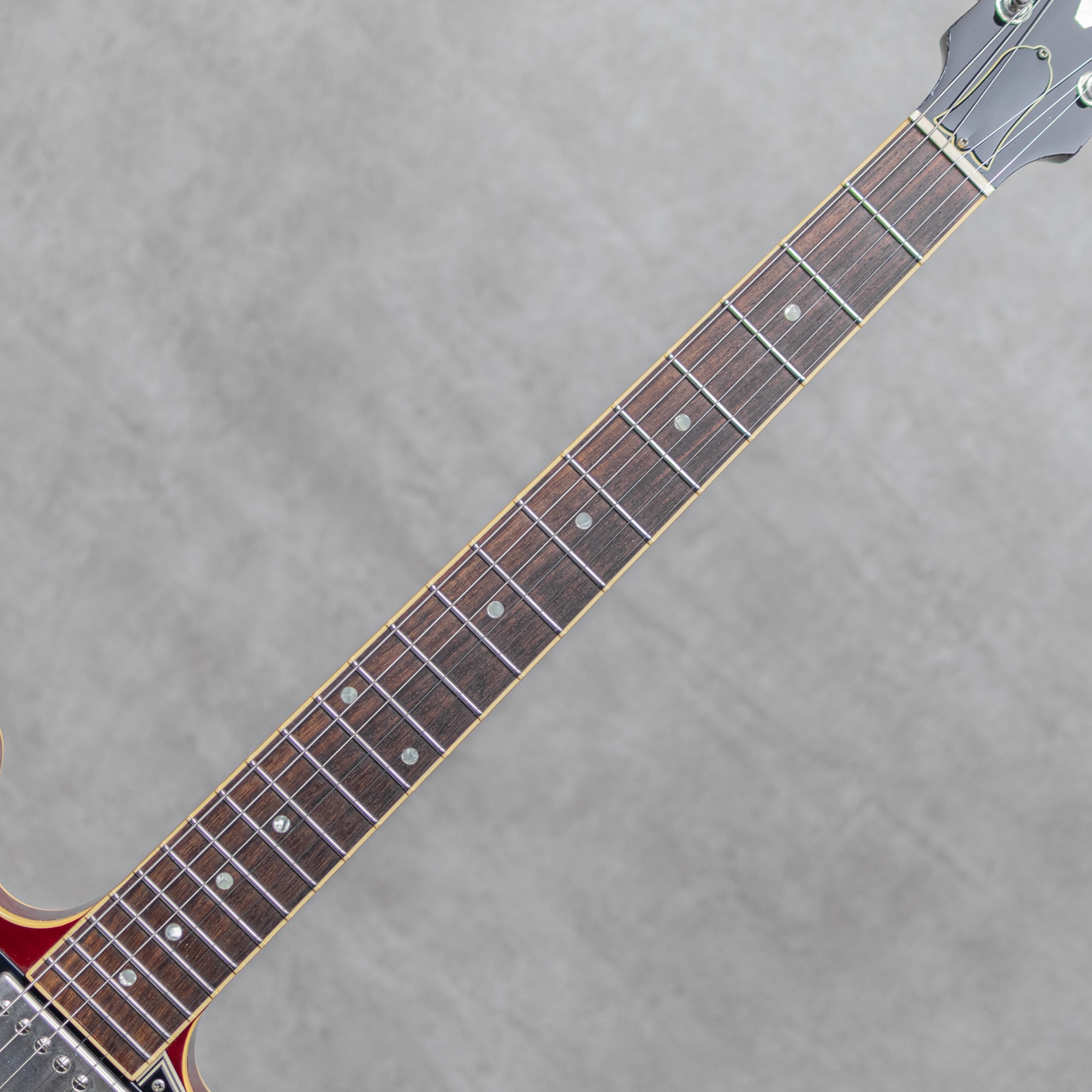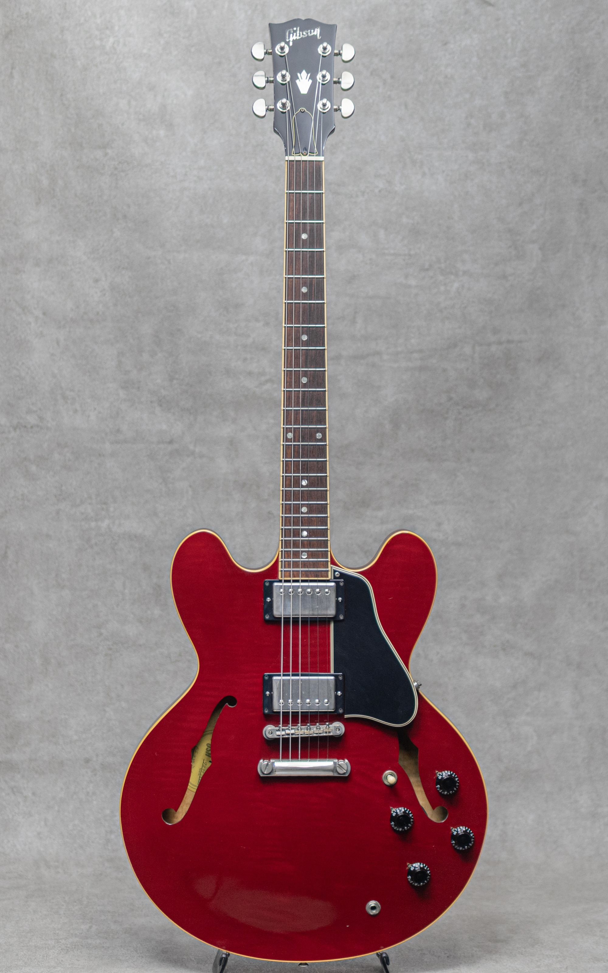 "Les Paul"に続き、憧れのギブソンエレクトリックとして君臨する王道モデル"ES-335"。"セミアコ"の代名詞としての存在感は言わずもがな、バーサタイルな実用性を伴った完成度から、古今あらゆる場面でプレイヤーたちに愛用され数々の名演を彩ってきたことも絶えない人気の所以です。本器は1997年ナッシュビル工場製"ES-335 Dot" 王道のCherryカラー。2000年代初頭にGibsonでは新しいメンフィス工場が稼働を始め、"ES-335"をはじめとするESモデルやアーチトップモデルの製造の中心はそちらに移行をすることとなりました。しかし本器はメンフィス工場スタート前、70年代より続くナッシュビル工場にて製造された年式。メンフィス製に比べタイトな出音は、音のハリやコシがしっかりとしておりレスポンシブルな反応が圧倒的な魅力。後期メンフィス製のエアー感にあふれた"まさにホロウサウンド"といった印象に比べ、格段に音の芯や抜け感が強くソリッド寄りのサウンドキャラクターと言えます。初期57 Classicによるミッドのふくよかさを持ちながらもコロコロと音が弾けるような挙動は、既に4半世紀が経過した本体の経年とも相まって、説得力のあるギブソントーンを楽しませてくれます。クリーントーンでも音像が太く、存在感のあるミッドレンジが抜群のサスティーンで突き抜けるグッドサウンド。ドライブサウンドでも張りつめた緊張感あふれるブルースフレーズから、分厚い音圧のロックサウンドと、即戦力のポテンシャル。なおメンフィス工場は2019年で稼働を終了し、現在の"ES-335"製造はナッシュビルに戻っているものの、現行モデルはどちらかというとメンフィス寄りのキャラクターの為、"旧ナッシュビル製335"特有のこの魅力は無二の物と言えるでしょう。こちら経年を鑑みると、非常に好印象な外観コンディション。勿論細かなかすり傷、打痕、塗装の軽微なチェッキング、ニッケルハードウェアのくすみ等あるものの、目立って外観を損ねるダメージはなく、丁寧に扱われてきたことが伺える様子。ロッドの調整を含めネックコンディションも良好で、フレットも9割ほどの高さを残してローアクションのセッティングでも良いプレイヤビリティ。うっすらと上品にフィギュアドが伺えるメイプルボディも雰囲気が良く、比較的綺麗な使用感ながらも経年による貫禄が抜群の一本。ぜひお見逃しなく。