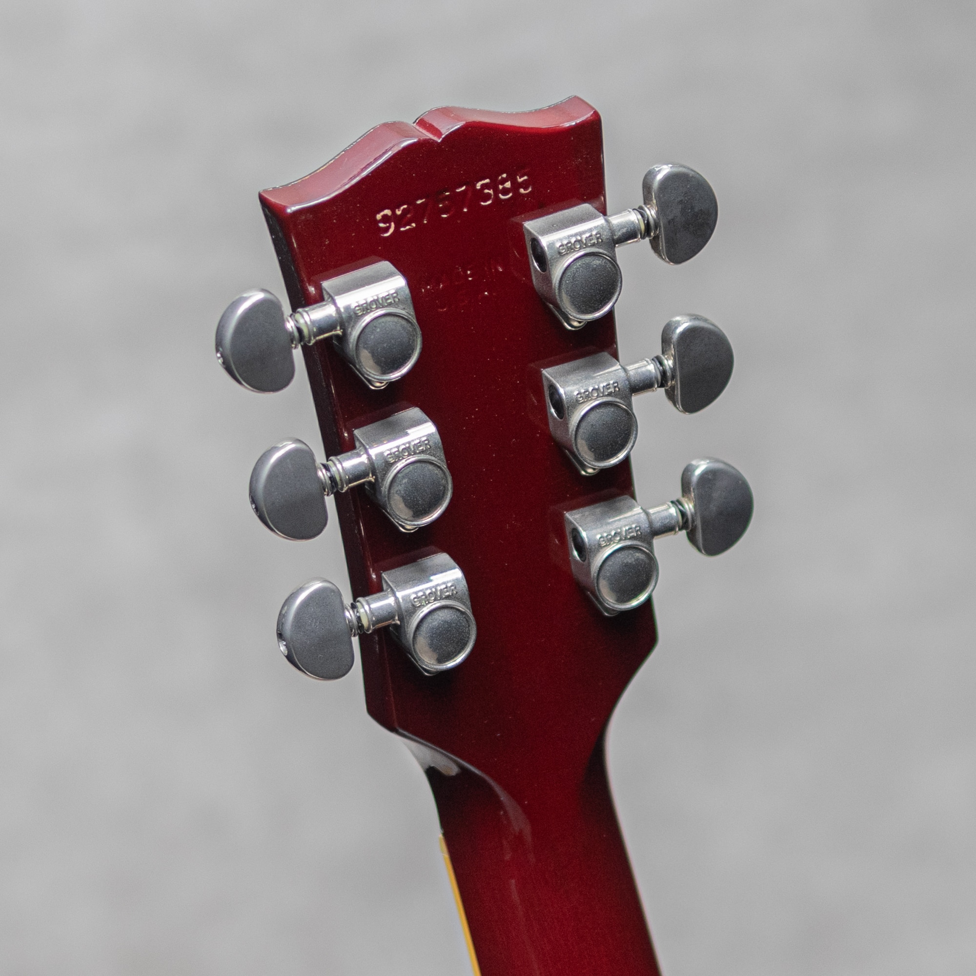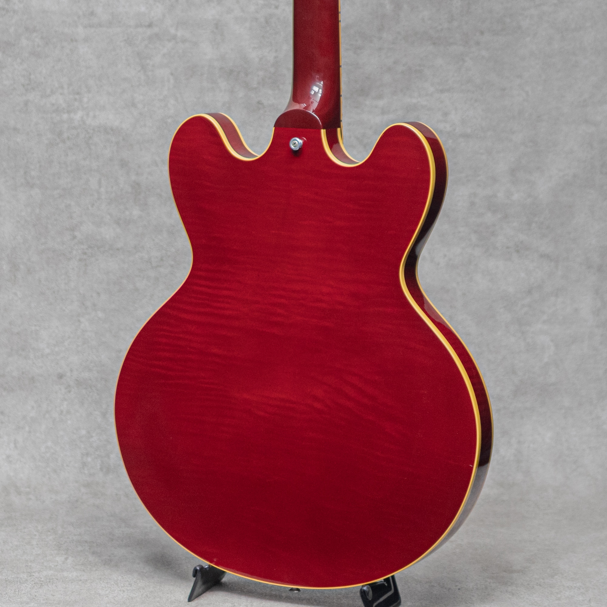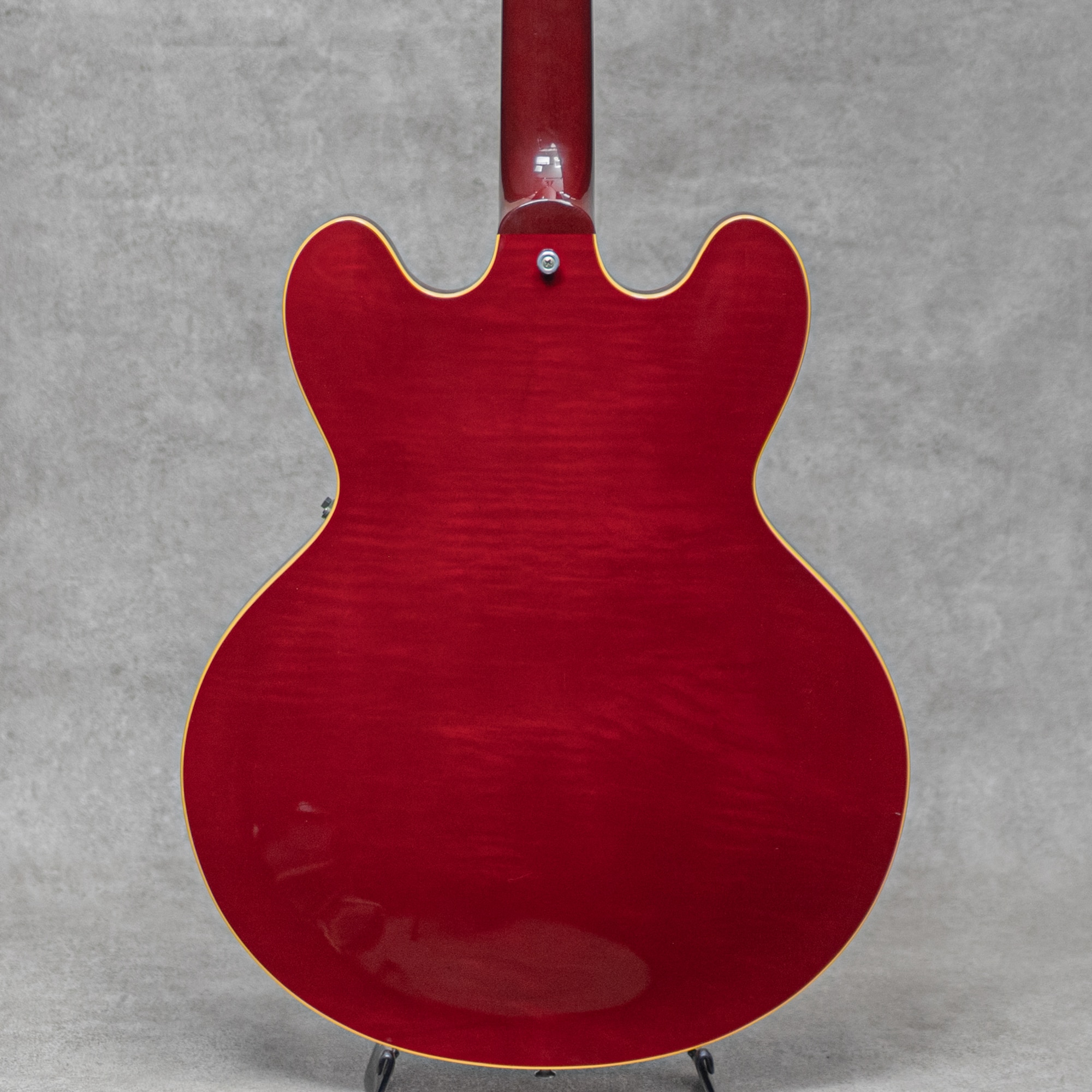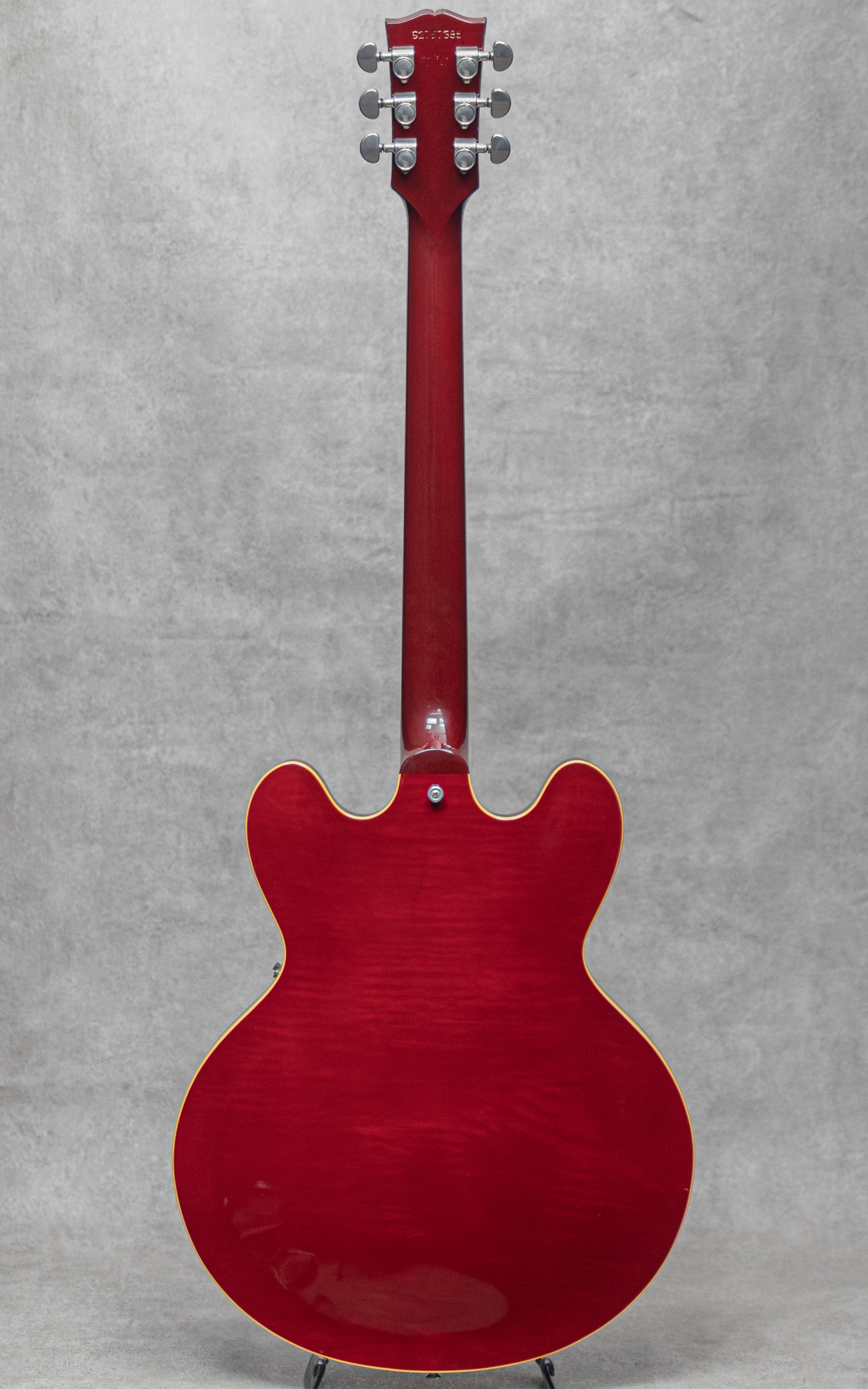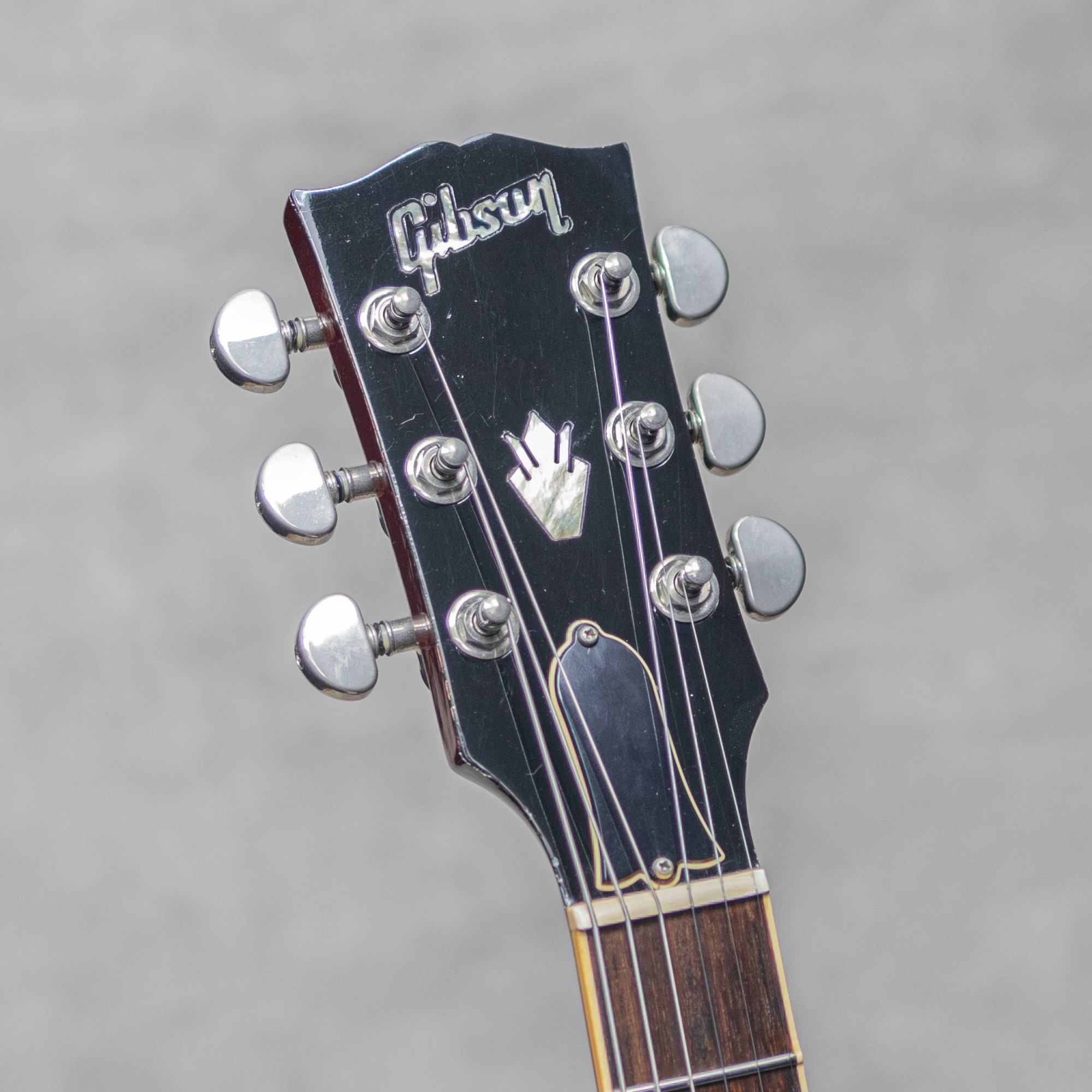 "Les Paul"に続き、憧れのギブソンエレクトリックとして君臨する王道モデル"ES-335"。"セミアコ"の代名詞としての存在感は言わずもがな、バーサタイルな実用性を伴った完成度から、古今あらゆる場面でプレイヤーたちに愛用され数々の名演を彩ってきたことも絶えない人気の所以です。本器は1997年ナッシュビル工場製"ES-335 Dot" 王道のCherryカラー。2000年代初頭にGibsonでは新しいメンフィス工場が稼働を始め、"ES-335"をはじめとするESモデルやアーチトップモデルの製造の中心はそちらに移行をすることとなりました。しかし本器はメンフィス工場スタート前、70年代より続くナッシュビル工場にて製造された年式。メンフィス製に比べタイトな出音は、音のハリやコシがしっかりとしておりレスポンシブルな反応が圧倒的な魅力。後期メンフィス製のエアー感にあふれた"まさにホロウサウンド"といった印象に比べ、格段に音の芯や抜け感が強くソリッド寄りのサウンドキャラクターと言えます。初期57 Classicによるミッドのふくよかさを持ちながらもコロコロと音が弾けるような挙動は、既に4半世紀が経過した本体の経年とも相まって、説得力のあるギブソントーンを楽しませてくれます。クリーントーンでも音像が太く、存在感のあるミッドレンジが抜群のサスティーンで突き抜けるグッドサウンド。ドライブサウンドでも張りつめた緊張感あふれるブルースフレーズから、分厚い音圧のロックサウンドと、即戦力のポテンシャル。なおメンフィス工場は2019年で稼働を終了し、現在の"ES-335"製造はナッシュビルに戻っているものの、現行モデルはどちらかというとメンフィス寄りのキャラクターの為、"旧ナッシュビル製335"特有のこの魅力は無二の物と言えるでしょう。こちら経年を鑑みると、非常に好印象な外観コンディション。勿論細かなかすり傷、打痕、塗装の軽微なチェッキング、ニッケルハードウェアのくすみ等あるものの、目立って外観を損ねるダメージはなく、丁寧に扱われてきたことが伺える様子。ロッドの調整を含めネックコンディションも良好で、フレットも9割ほどの高さを残してローアクションのセッティングでも良いプレイヤビリティ。うっすらと上品にフィギュアドが伺えるメイプルボディも雰囲気が良く、比較的綺麗な使用感ながらも経年による貫禄が抜群の一本。ぜひお見逃しなく。