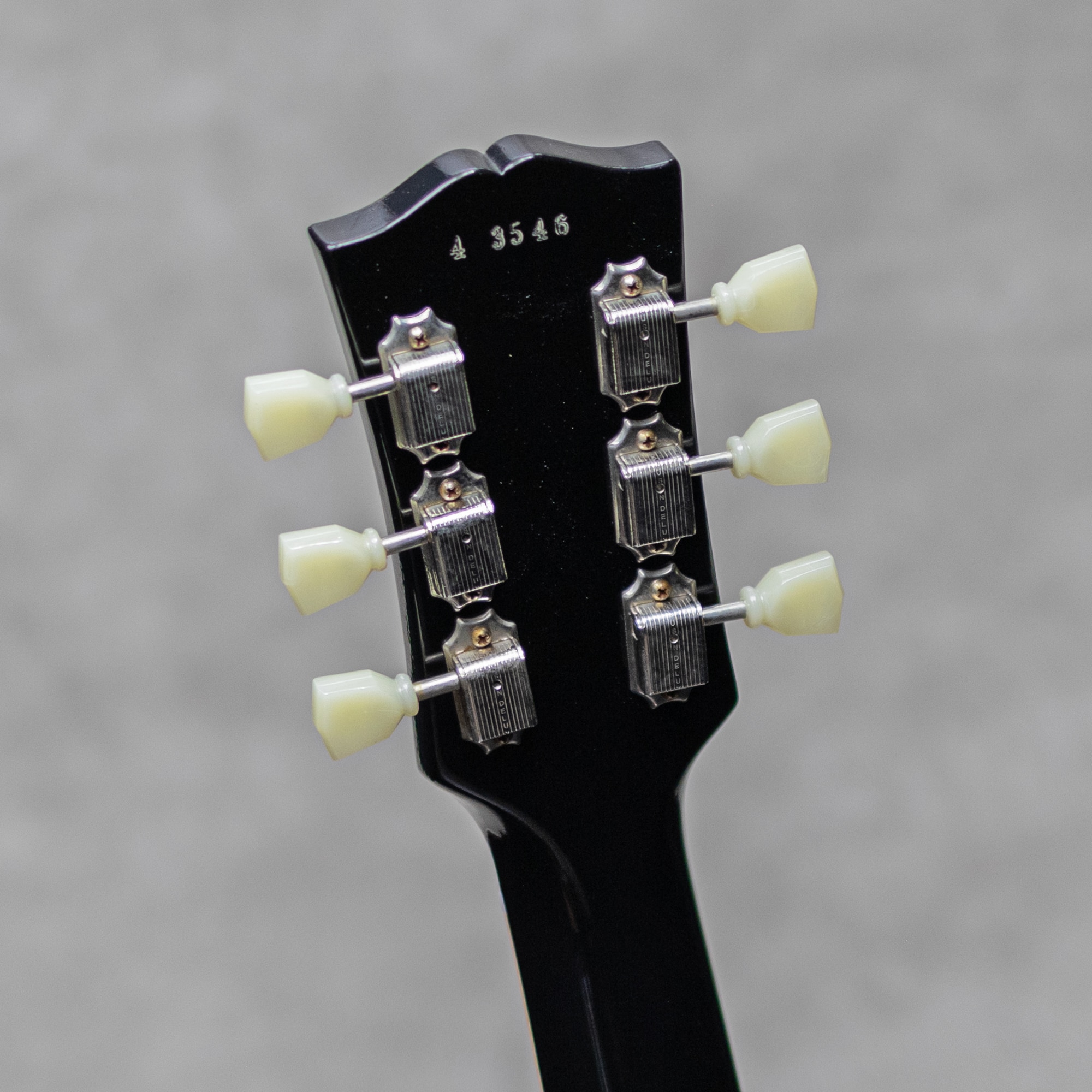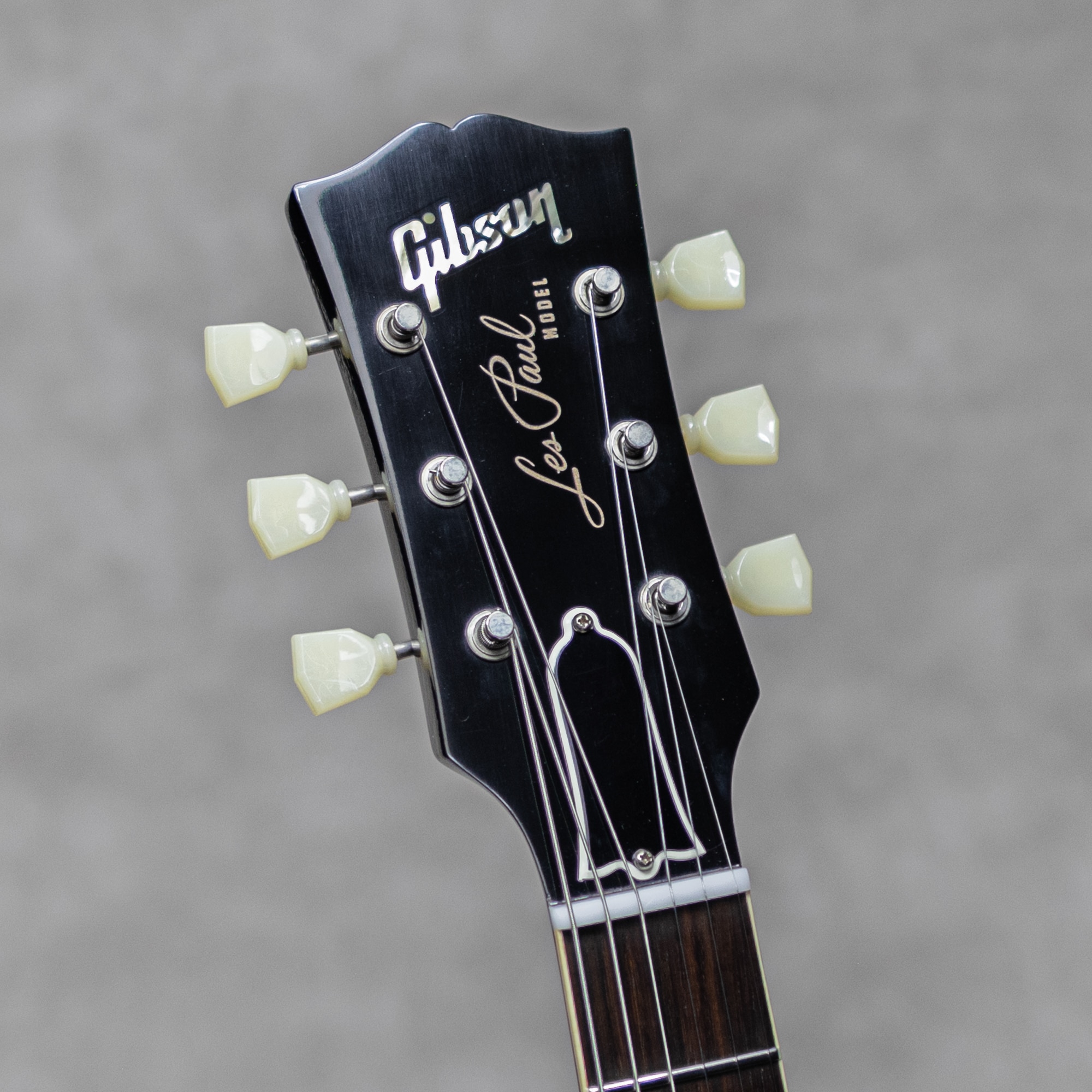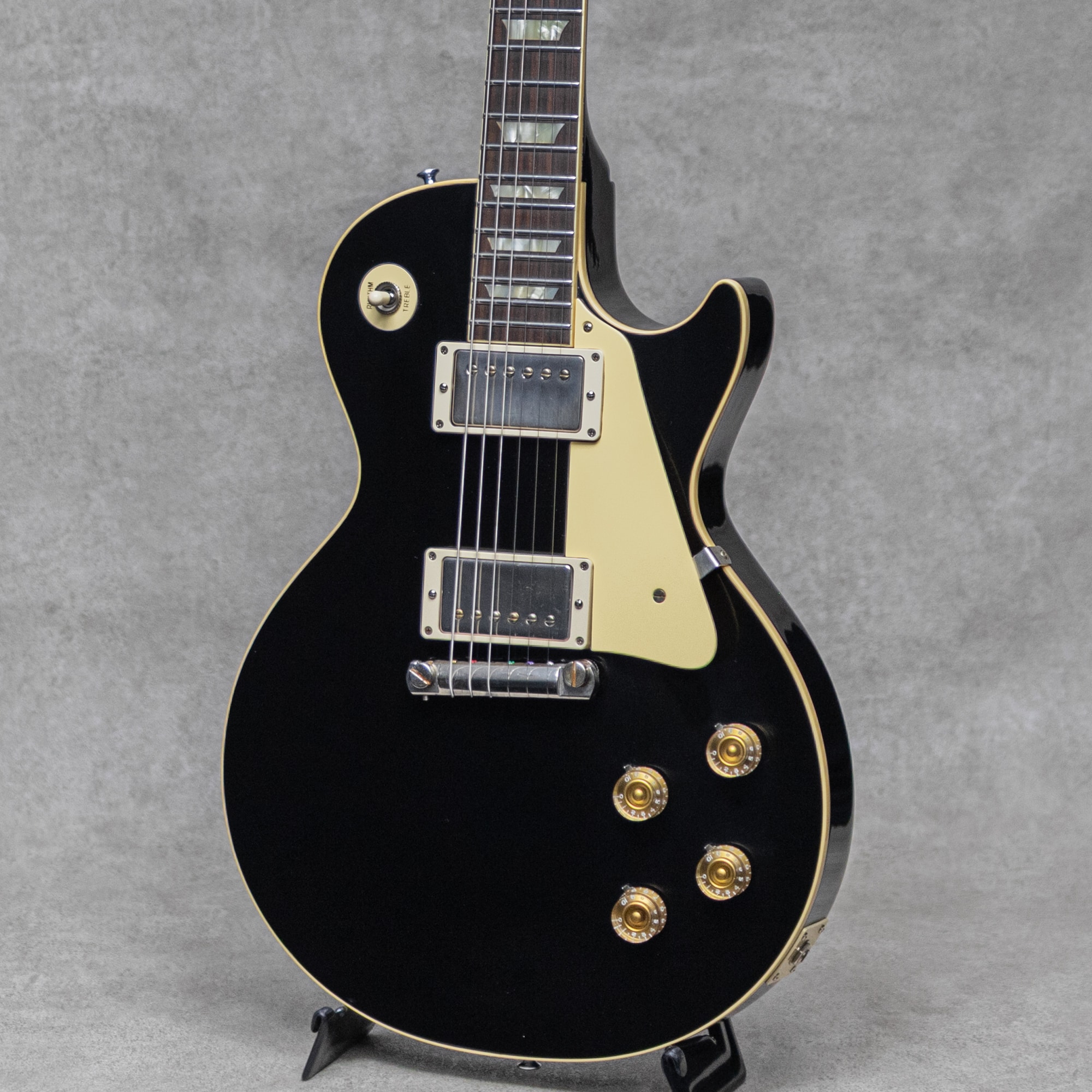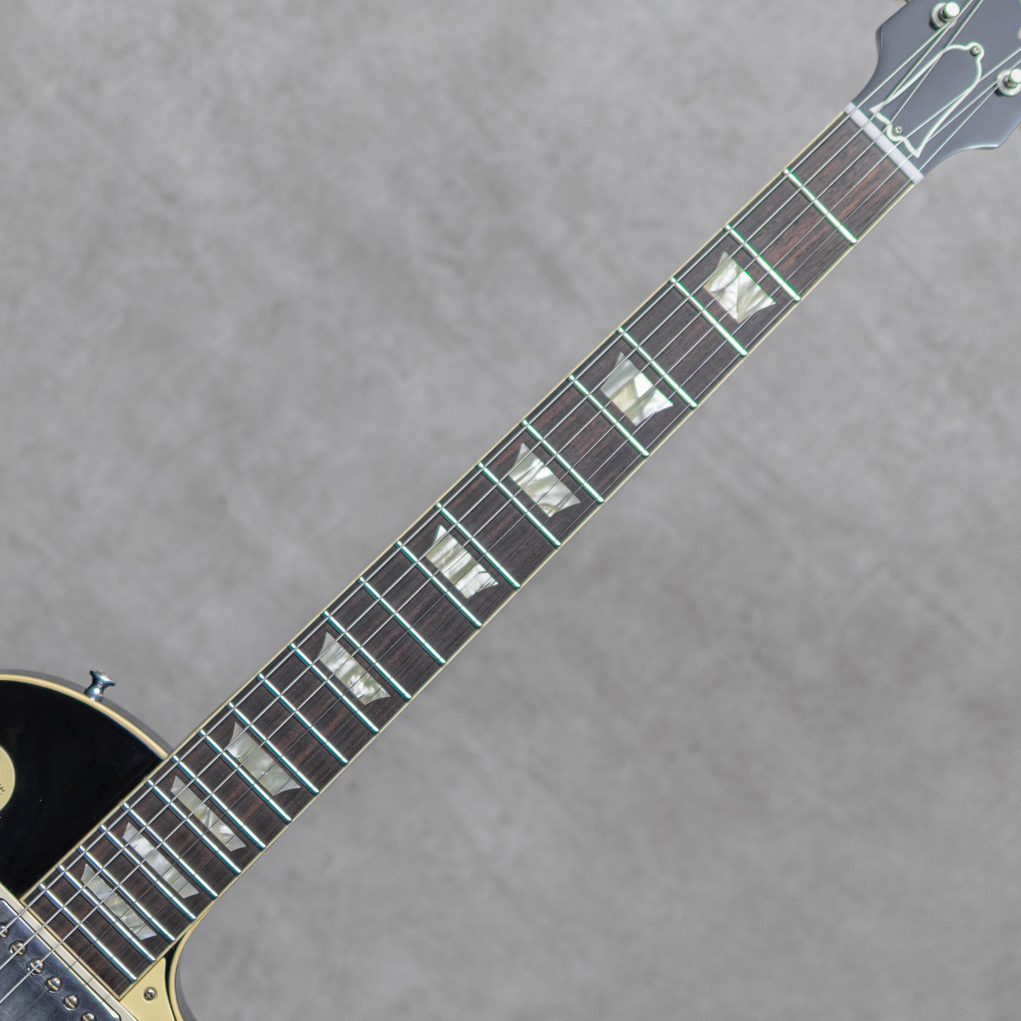 1990年代初頭に設立された"GIbson Custom shop"とフラッグシップモデルの"1959 Les Paul Standard Reissue"を筆頭に往年の名モデルを復刻する"Historic Collection"のシリーズ。細かなブラッシュアップをしながら、憧れのヴィンテージモデルを最新のクオリティで現代に蘇らせてきました。本器は2024年製"1954 Les Paul Wraparound 2 Humbuckers All Ebony VOS"。本来はゴールドトップにP-90×2を搭載する"Historic Collection"の"1954 Les Paul (R4)"ですが、こちらは国内ディーラー限定企画でオーダーがされたハムバッカー搭載スタイル。その他ヘッドストックの"Gibson"ロゴを当時存在した"Lower Logo"低い位置に配した仕様の他、ボディとネック、全体をエボニーカラーでまとったシンプルかつスタイリッシュな内容。ネックシェイプとフレットのスペックは通常の"R4"同様の"50s Rounded Medium C"と"Historic Gibson Narrow/Tall"を採用。元々の"1954 Les Paul"のユニークなキャラクターを持ちつつ、ハムバッカー搭載でよりオールラウンダーな扱いやすさを手に入れた魅力的なスペックです。ラップアラウンドブリッジによる豊かなサスティーンとダイレクトな鳴感、握り応えのある丸いネックシェイプと少し細めのフレットから生み出されるウッディでふくよかなトーン。チューン-O-マチックに比べシンプルな倍音構成で手元のニュアンスもしっかりと汲み取ってくれる挙動で、ついつい弾き続けてしまう面白みが特徴的な魅力です。勿論近年ヒストリックモデルの仕様であるチューブレストラスロッドやニカワ接着、ポッティング作業を施さないCustombucker等による、レスポンシブルで開放感のあるポテンシャルも存分にお楽しみいただけます。こちらボディバック等の極細かな小傷、極細かな当て傷、ネックとボディエンドに軽いスタンド負けがある他、VOSフィニッシュの為、元より全体的なヘアラインや塗装ポリッシングのムラがありますが、顕著に目立ったダメージはなく演奏上の妨げになるものはございません。フレットの使用感もさほど感じず、ロッドの調整を含め良好なネックコンディション。現状弾きやすいローアクションでのセッティングができております。レギュラーのカタログラインナップにはない1954 Les Paulのハムバッカーコンバート仕様。ぜひお見逃しなく。オリジナルハードケース、認定書、タグ類が付属。