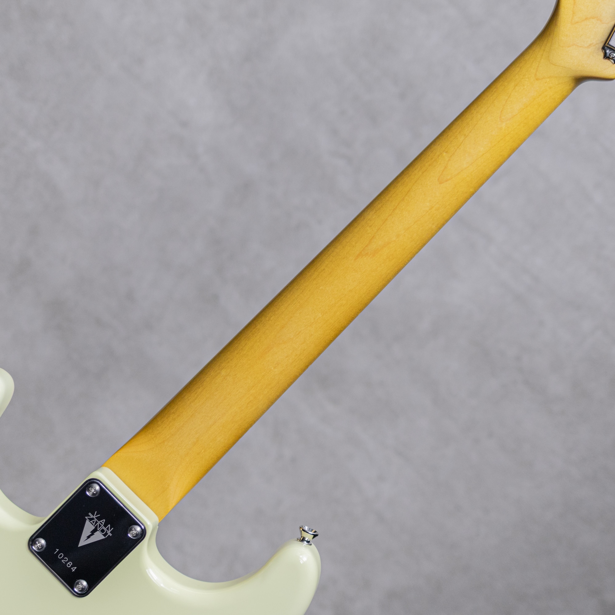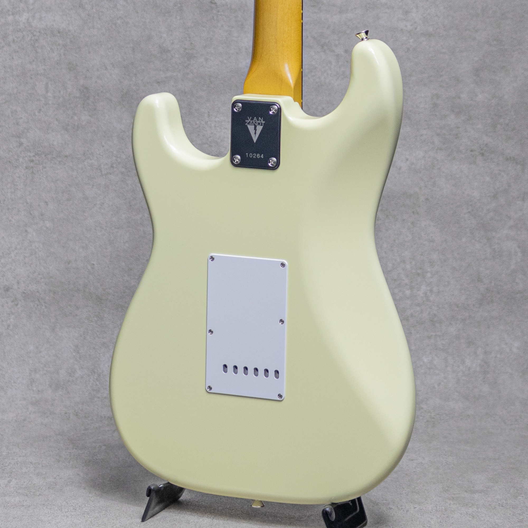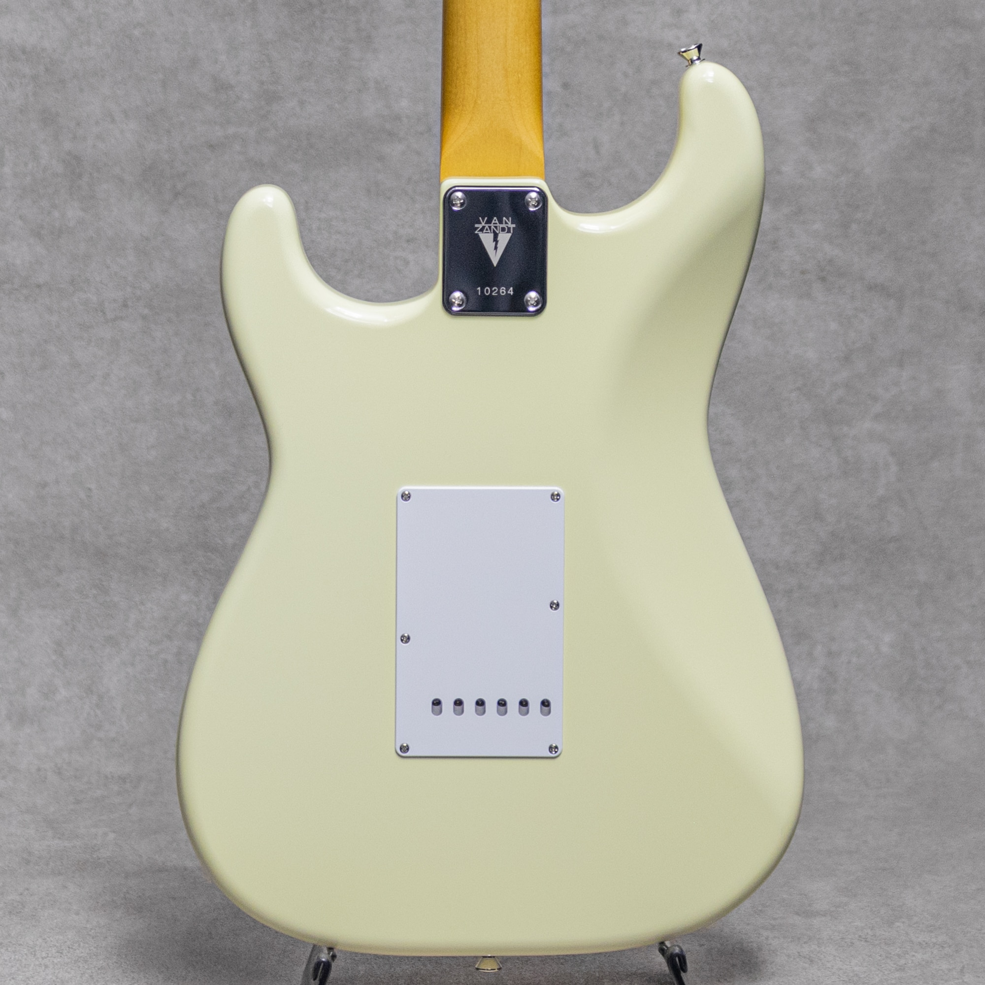 “Neo Vintage”を感じさせる”Vanzandt”。数多くのミュージシャンから愛されたテキサス生まれの”Van Zandt”ピックアップを搭載し、国産の確かな技術で作り上げられるギターは、その価格以上のクオリティを感じずにはいられない実力派ギター。本器は60年代モデルを踏襲した”STV-R2 Vintage White”。ピックアップに"Van Zandt” TrueVintage&Bluesを搭載したショップセミオーダーモデル。グッドルッキンのビンテージホワイトカラーの1本。アルダー2pcsボディ、こだわりの板目取りメイプルネックにインディアンローズウッドスラブ指板のウッドスペックといった王道スペック。ネックグリップは22フレット仕様の60 Style Oval Cシェイプで、厚すぎず薄すぎない弾き心地の良いネックシェイプ。通常モデルのピックアップは”Van Zandt”Bluesx3が搭載されておりますが、本器にはフロントPU&センターPUに”Van Zandt”TrueVintageを、リアPUには”Van Zandt”Bluesを搭載。トーンコンデンサーにはヴァンザントオリジナルレプリカコンデンサーを使用。フロント・センター時のクリアで乾いた響きは、より奥行きのあるベルトーンを思わせるレンジの広い響きで、リア時のパンチのあるミッドの効いたサウンドはドライブサウンドにも持ってこいです。より繊細で表現力のあるフロントやハーフトーンでファットでメロウなトーンから、エッジの効いたアグレッシブなパワー感の得られるリアサウンドまで幅広いサウンドメイクを可能にしてくれる1本です。