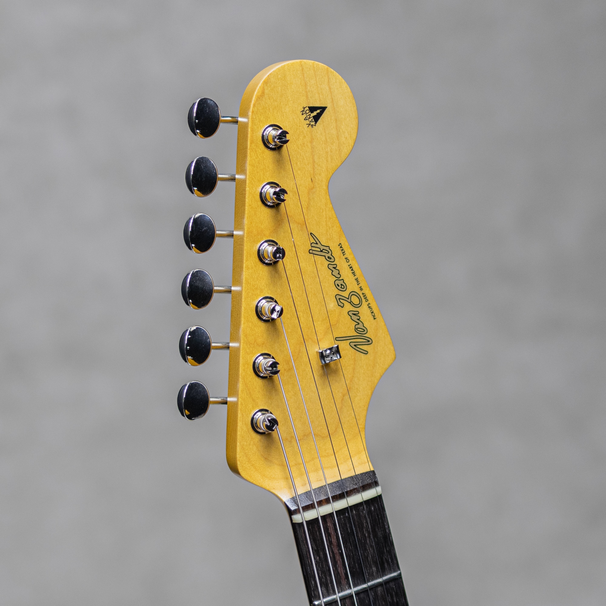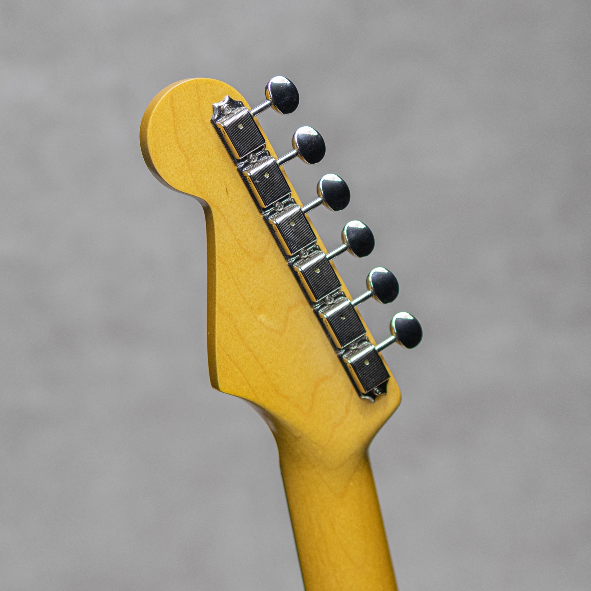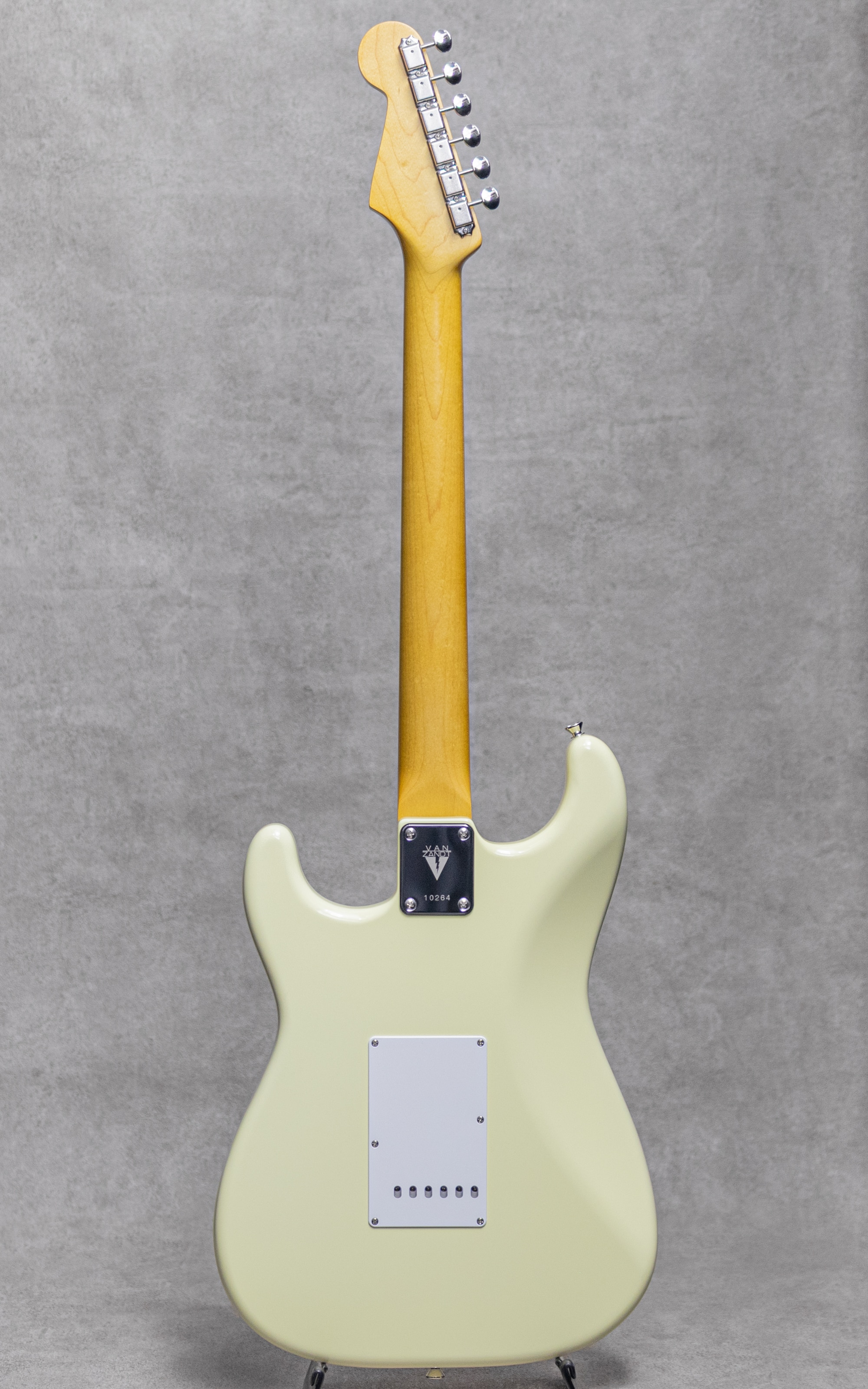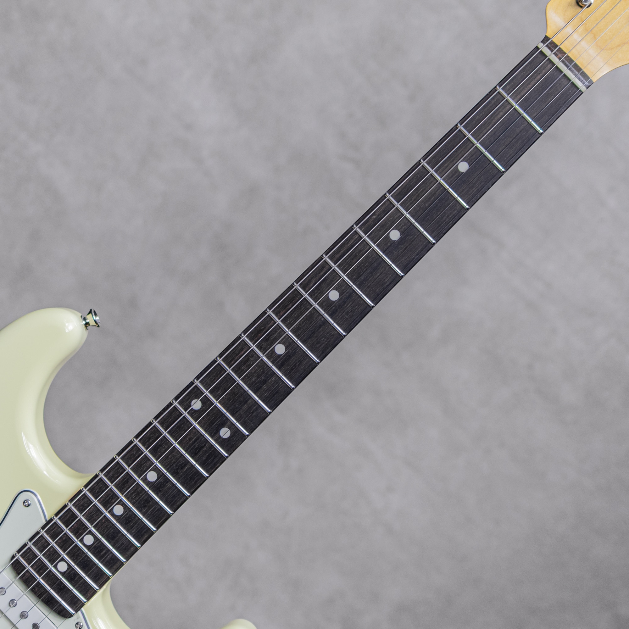 “Neo Vintage”を感じさせる”Vanzandt”。数多くのミュージシャンから愛されたテキサス生まれの”Van Zandt”ピックアップを搭載し、国産の確かな技術で作り上げられるギターは、その価格以上のクオリティを感じずにはいられない実力派ギター。本器は60年代モデルを踏襲した”STV-R2 Vintage White”。ピックアップに"Van Zandt” TrueVintage&Bluesを搭載したショップセミオーダーモデル。グッドルッキンのビンテージホワイトカラーの1本。アルダー2pcsボディ、こだわりの板目取りメイプルネックにインディアンローズウッドスラブ指板のウッドスペックといった王道スペック。ネックグリップは22フレット仕様の60 Style Oval Cシェイプで、厚すぎず薄すぎない弾き心地の良いネックシェイプ。通常モデルのピックアップは”Van Zandt”Bluesx3が搭載されておりますが、本器にはフロントPU&センターPUに”Van Zandt”TrueVintageを、リアPUには”Van Zandt”Bluesを搭載。トーンコンデンサーにはヴァンザントオリジナルレプリカコンデンサーを使用。フロント・センター時のクリアで乾いた響きは、より奥行きのあるベルトーンを思わせるレンジの広い響きで、リア時のパンチのあるミッドの効いたサウンドはドライブサウンドにも持ってこいです。より繊細で表現力のあるフロントやハーフトーンでファットでメロウなトーンから、エッジの効いたアグレッシブなパワー感の得られるリアサウンドまで幅広いサウンドメイクを可能にしてくれる1本です。