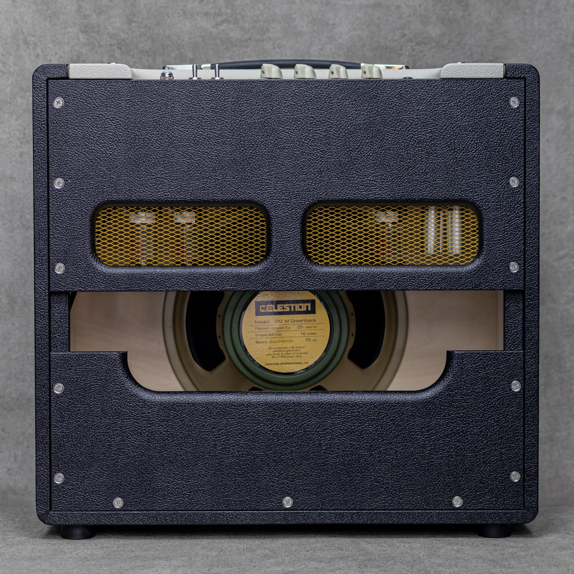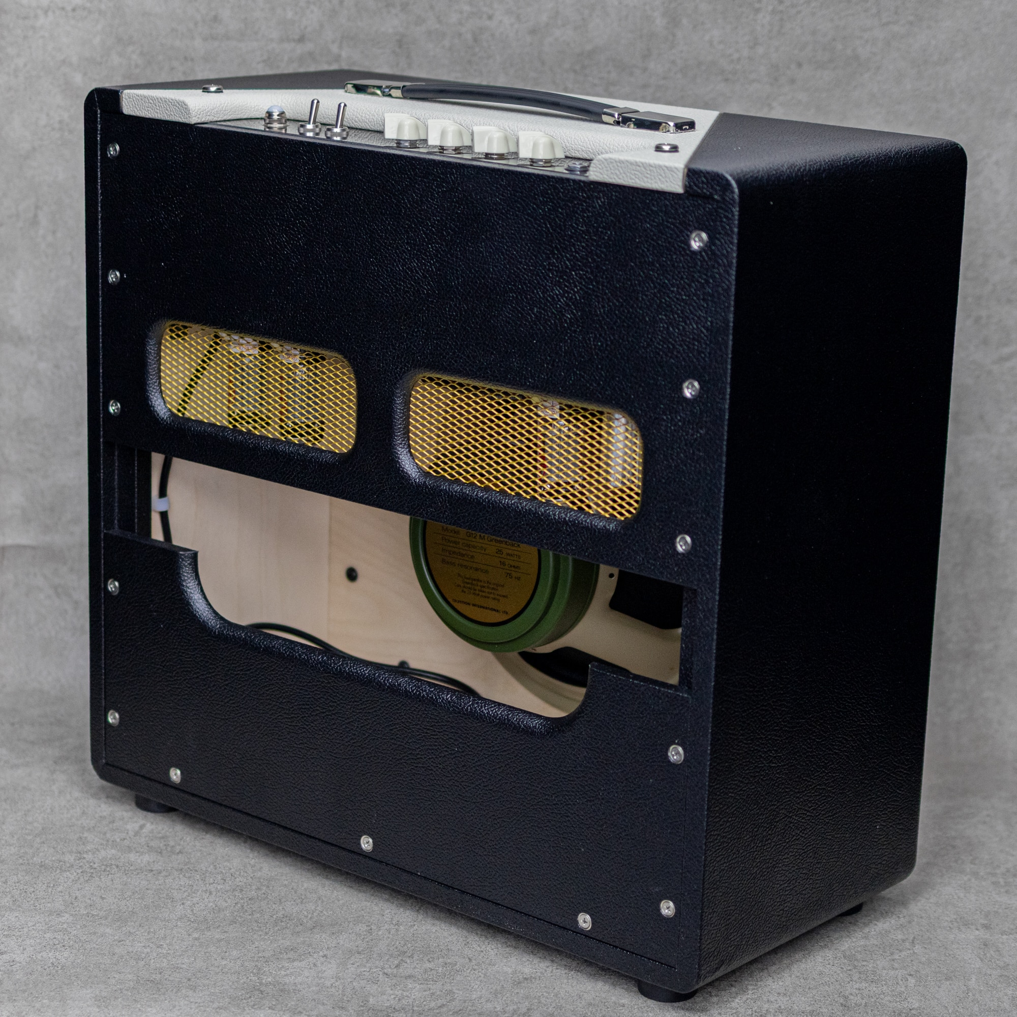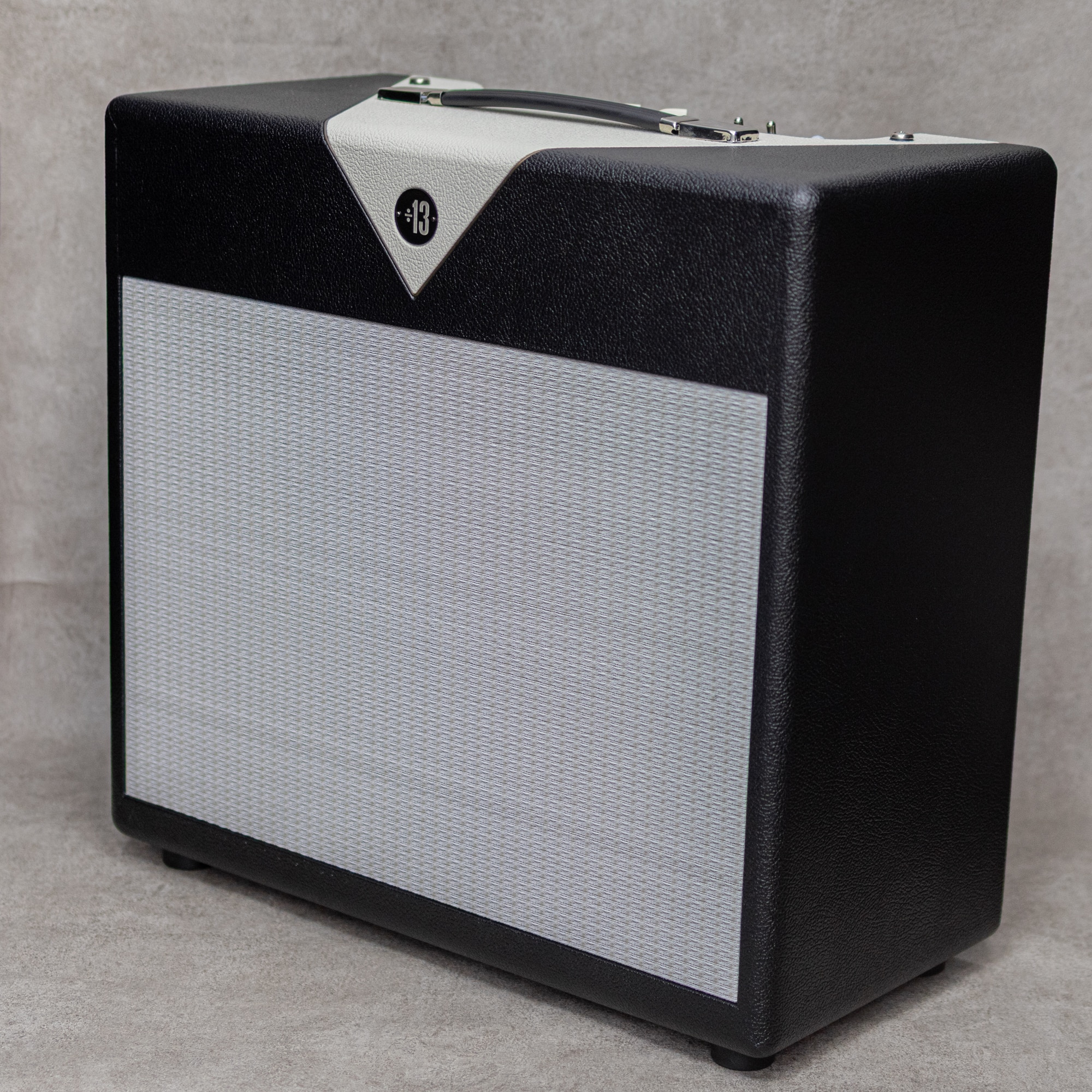数多くのミュージシャンに選ばれる高品質なアンプを手作業で製作する”Divided by 13”。米国カリフォルニア”Two-Rock Amplifiers”での生産体制へと移行された最新モデルが届きました。本器は、” CJ11 11W Combo Black/Cream”。典型的なアメリカンサウンドのクラスA回路を基にデザインされた6V6x2を使用した11w出力のコンボアンプモデル。全てのパーツがポイントトゥポイントで組み上げられるハンドワイヤードアンプで、ボリュームに加え、トレブル・ベースのトーンシェイプとマスターボリューム(MV)を装備。また、ボリュームノブのプッシュ/プル切り替えでミッドブーストが可能です。スピーカーは1x12”でセレッションG12M Greenbackを搭載。クラシックデザインのデュアル6V6シングルチャンネルアンプですが、整流管に5AR4/GZ34の使用とカスタムビルドのトランスを使用することで、クリアでヘッドルームの広い低域まで濁らないサウンド実現させています。マスターボリュームをしっかりと上げてボリュームでコントロールするクリーンサウンドではしっかりとヘッドルームの広いサウンドが得られ、ボリューム&マスターボリュームの組み合わせで作られるドライブサウンドはトーンシェイプでしっかりとサウンドコントロールができ、50年代のツイードスタイルを基にしながらクラシックなトーンからより汎用性が広く実用的なサウンドまでをカバーしています。本器ではブラックトーレックスとクリームのVアクセントカラーを組み合わせたBlack/Creamの外装が採用されています。ハイクラスのサウンドを楽しませてくれるスタジオ・ホームユースアンプ。そのサウンドを、是非ご堪能ください。
