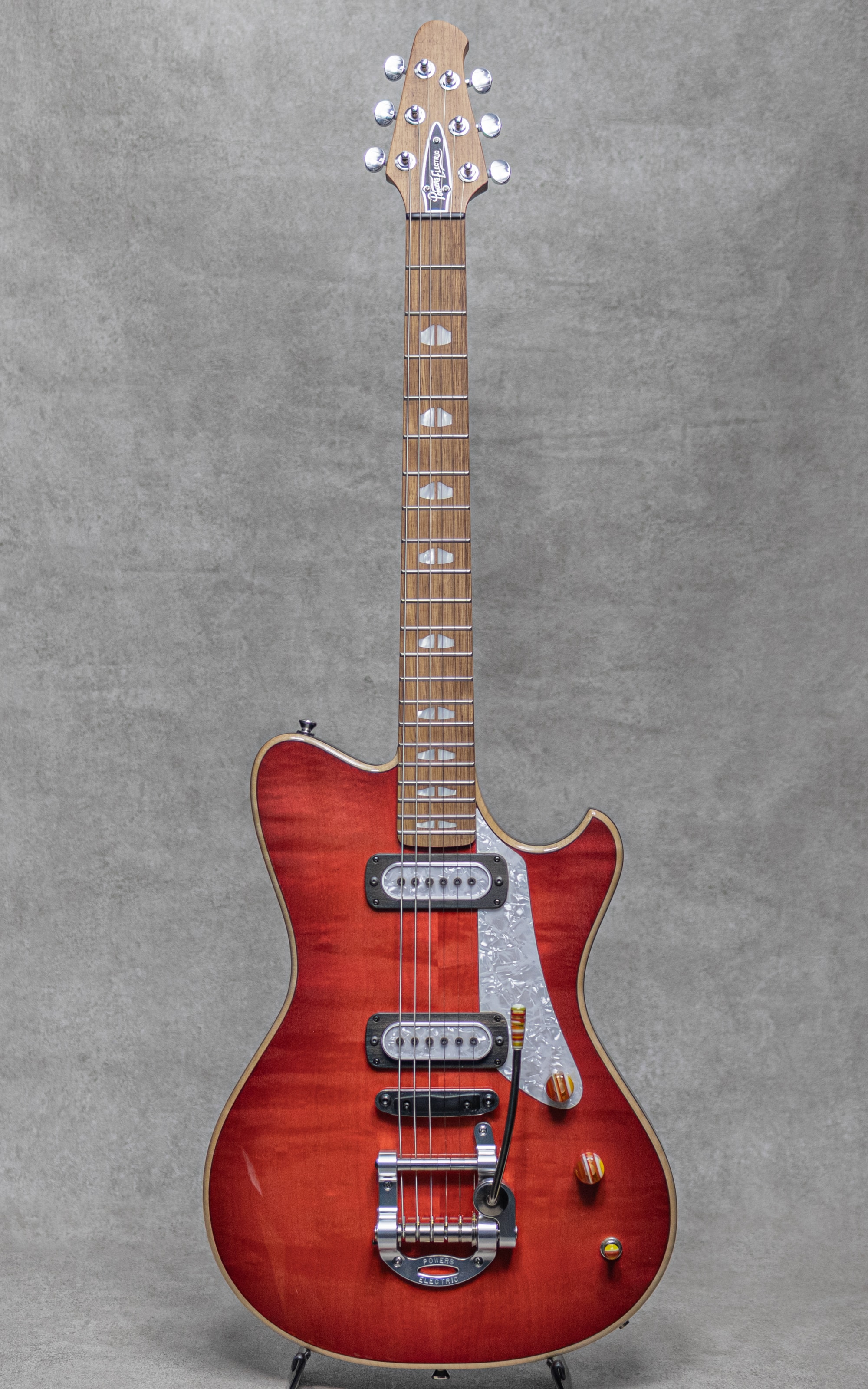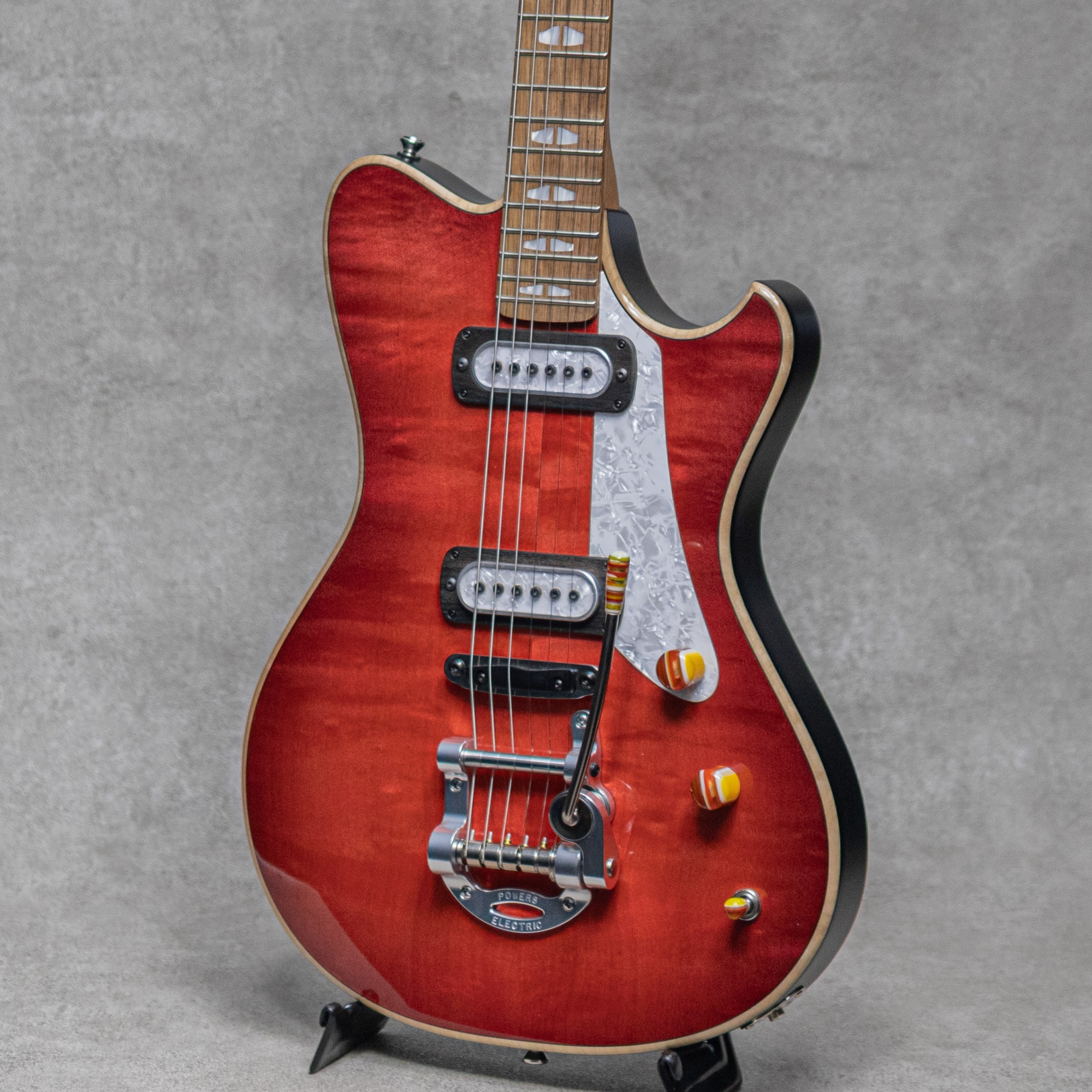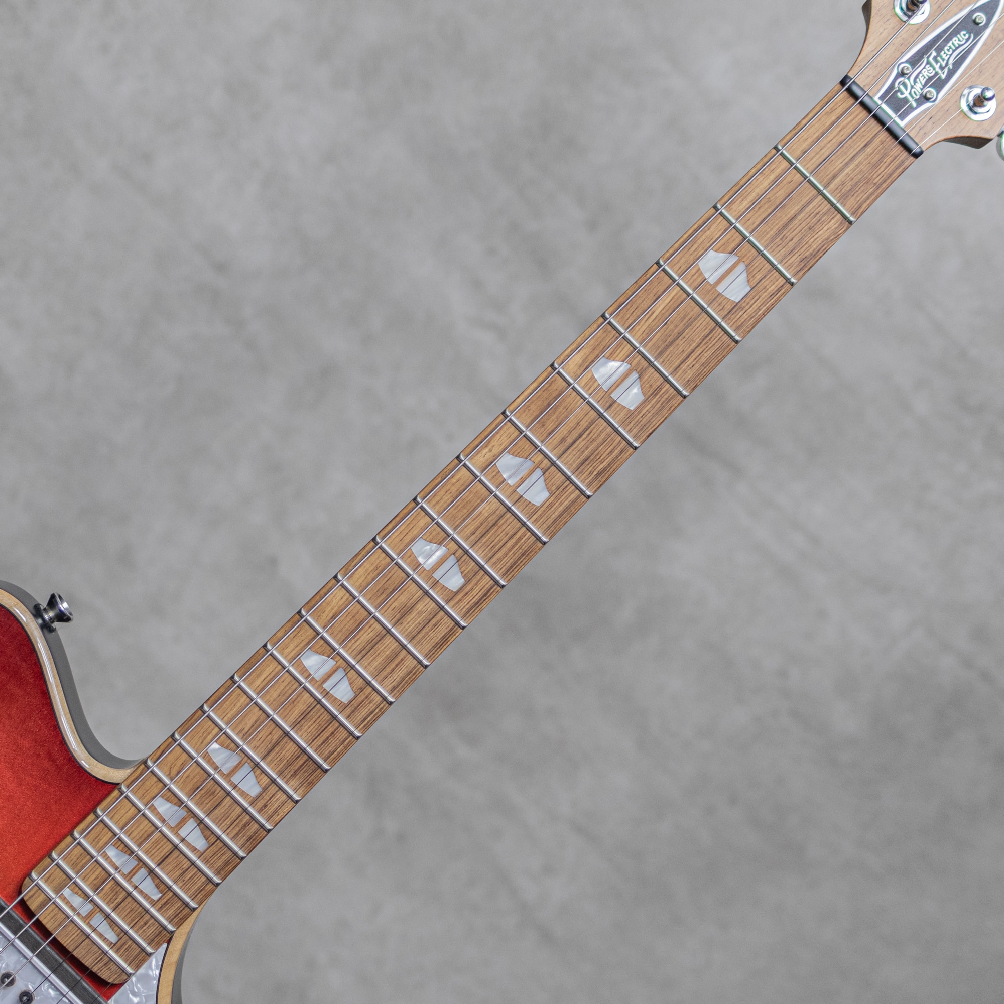 海外で話題を集めている新ブランド"Powers Electric”は、”Taylor Guitars”の現CEOも務める”Andy Powers(アンディ・パワーズ)”が創る新ブランド。アンディは7歳の頃に初めて自身でギターを作り、その経験が生涯をかける情熱を生み出し成長させました。2011年に”Bob Taylor(ボブ・テイラー)"より誘いを受けTaylor社へ入社、2022年に同社CEO兼チーフデザイナーに就任し活躍しています。そんなアンディはミュージシャンであり、デザイナーであり、サーファーであり、ビルダーとしてその活躍の場をさらに広げます。故郷カリフォルニア州ノースカウンティで育った彼は、サーフィン、スケートボード、自動車、音楽、アート、デザインといった様々な文化がぶつかり合う環境に大きくインスピレーションされ、”Powers Electric”はそれらをシームレスに融合させ創り上げられています。本器は”A-Type Select Maple / PF42 / Camtail / Cosmo Red”。大胆なルックス、ダイナミックなサウンド。その全てが新しく、それでいて驚きの完成度を誇る逸品です。フィギュアド杢の浮き出るメイプルトップにホロウ構造を持つアーバンアッシュボディのフルクローズドスリムホロウボディ構造。クラシックカーやホットロッド、そしてサーフボードからインスパイアされたボディ形状は、左右非対称であらゆる角度から視覚的なバランスを損なわない秀逸なアウトライン。美しいシースルーのコスモレッドにナチュラルバインディングのトップ、サテンブラックのサイド&バックカラー。ワンピースマホガニーネックにホンジュラスローズウッド指板。細めで握り心地の良いネックシェイプで、指板ラジアスは低音弦側と高音弦側で異なるラジアスのスプリットラジアスを採用。高音弦側がわずかにフラットに設計されてチョークフリーなベンドが可能です。ピックアップにはオリジナル”PF42”を搭載、マスターボリューム、マスタートーン、3wayPUセレクター。ウォームカラーのハードウェアノブ、ホワイトパーロイドピックガード、デルリン製ブリッジサドル、カムテイルビブラート。驚くほどに軽量で、抱えた時の収まりも良く、それでいてボディバランスに長けた本器。クリスピーでアタックの小気味良いリアサウンドから、倍音豊かでレンジ感あるのフロントトーン。トーンバランスがとても良く、しっかりと喰いつくサスティンを併せ持ちます。そして歪ませても音の粒立ちが良く、ポップス・ブルース・ジャズはもちろん、ロック・クラシックロックまで幅広くカバーできるとてもポテンシャルの高いサウンドと演奏性を持ち合わせます。新興ブランドのモダンテイストよりもクラシックかつトラッドなフィールを感じさせながら、扱いやすさやピッチの安定などはとてもモダンなハイブリッドの1本。また付属ケースも拘りが詰め込まれており、60年代ポルシェのシートで使用されていたペピータ柄のレザーケースを作成。ケースの開閉方向も一般的なものとは逆で、開口時に本体を構えた向きと同じ方向から見える様に設計されています。”Powers Electric”は、ペグやPOT・PUスイッチ・ジャックなど以外、PU・サドル・ビブラートやテイルピースの金属ハードウェアやノブパーツに至るまでの全てのパーツからカリフォルニアの自社工場で製作しており、既存の流通パーツや設計の組み合わせで生み出されたギターではありません。アンディがそれまで所有し経験した数多くの名作からインスピレーションを受けながら、未来のプレイヤーのために作り上げた全く新しいギターです。彼の何十年にも渡る研究と努力に基づきゼロから生み出されたニュースタイルのギター。是非、お手元でお確かめください。