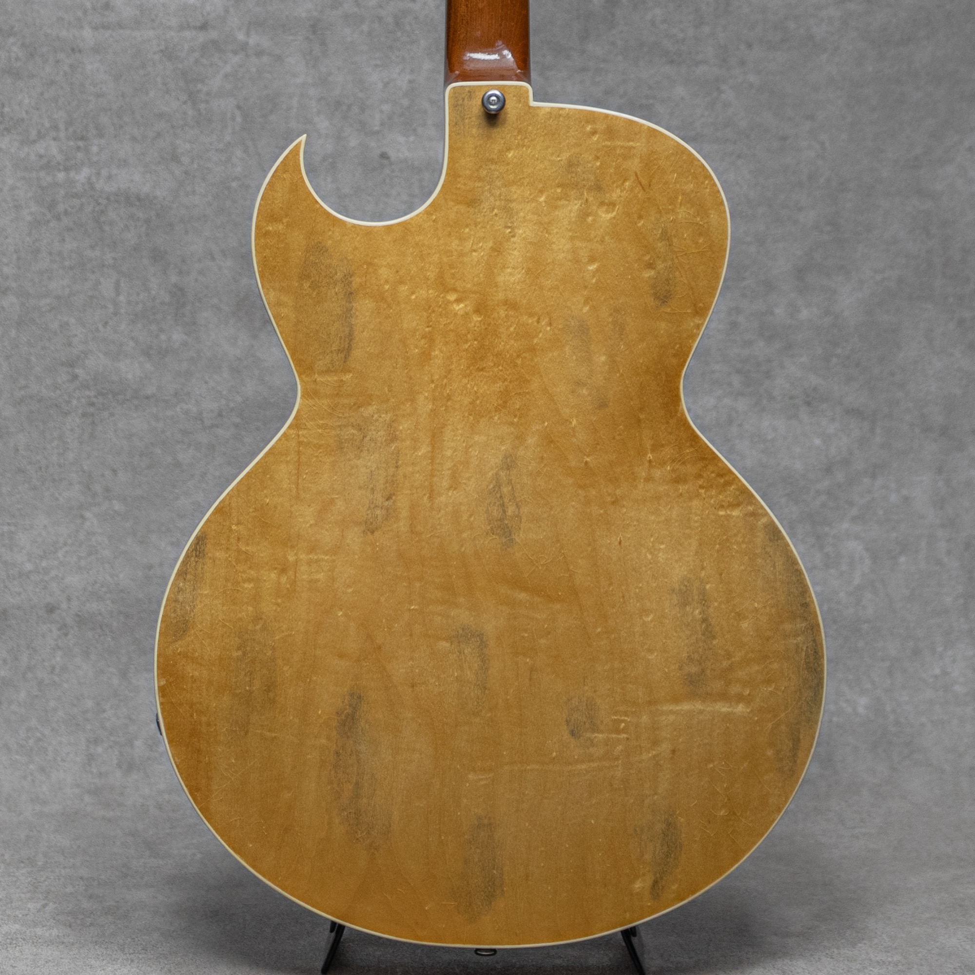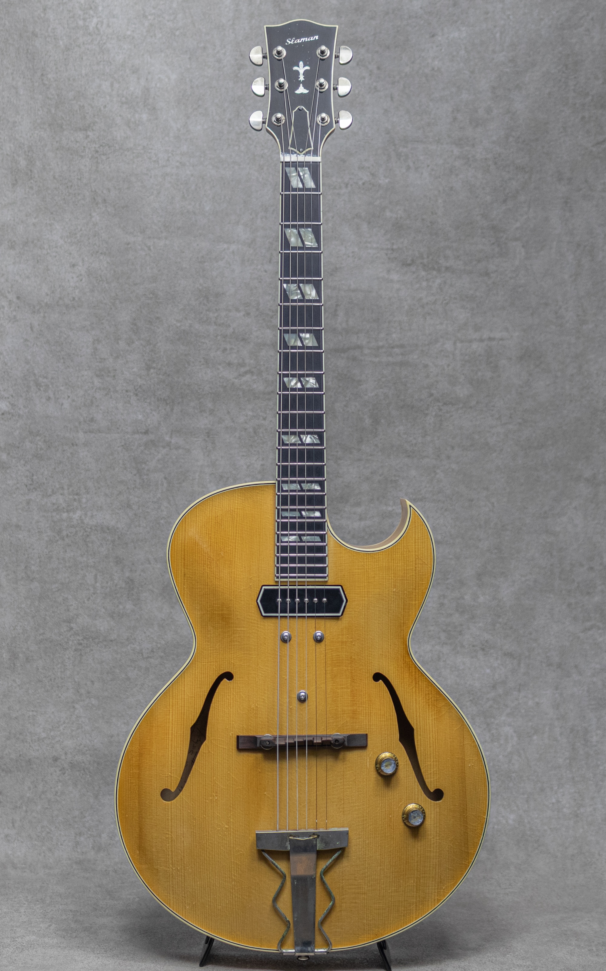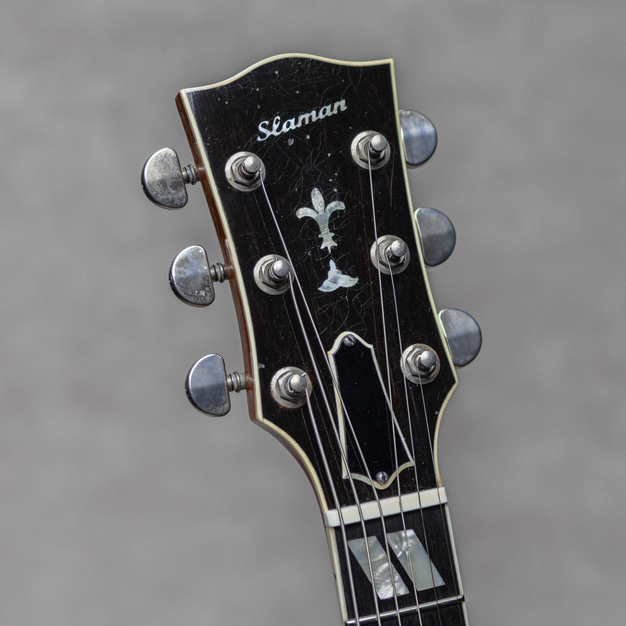 オランダ、ヴェステインデで製作されるDaniel Slaman Guitars。Daniel Slaman(ダニエル スラマン)は1978年よりアコースティックギターの製作に携わりはじめ、1995年以降はアーチトップスタイルを専門に作り続けています。偉大なヴィンテージモデルにインスピレーションを受けてデザインされるラインナップは、愛情を感じる先人へのリスペクトとともに、現代的な見識と実直な技術力を持って個性豊かなキャラクターに仕上げられております。本器は定番人気のモデル"Sisterhood"に"175"スタイルを織り込んだ"Hybrid Sister/175"。16.25インチロウワーバウトのフローレンタインカッタウェイボディ。単板削り出しのヨーロピアンスプルーストップ、Xブレーシング、ラミネイトメイプルバック、マホガニーネック、エボニー指板&ブリッジ、セルロイドポジションマーク、MOPロゴインレイ。ピックアップにはチャーリー・クリスチャンスタイル復刻として定評のあるイギリスCC Pickup製を採用。通常のブレードスタイルでは調整をしきれない各弦のバランスを、アジャスタブルポールピーススタイルに改良、いいところ取りをしたカスタムスペックを搭載しています。大変雰囲気の良いエイジド加工が施されており全体的にウェザーチェックが走る質感の良いニロセルロースラッカーの塗装面や、オフホワイトのバインディング。またジグザグテールピースとコントロールノブには、ヴィンテージギターに使用されていたパーツを使い、尚の説得力を増しています。単板トップ故の豊かなボリューム感、ドライでざらついた倍音感が堪らない生鳴とレスポンス抜群の弾き応え。ピックアップ出力では柔らかで落ち着きのあるチャーリークリスチャンスタイルの魅力をリラックスした安定感で楽しめる完成度。各ポジションでの音のばらつきも少なく、良いバランス感です。こちらエイジド加工がされている為、判断の難しい部分もございますが、使用に伴う消耗は殆ど感じられずとても綺麗なコンディション。各所調整にも問題なく、フレットのヘリも見受けられない良好なネックコンディション。温故知新な魅力が詰まったハンドメイドアーチトップ、ぜひお確かめください。未取付のピックガード、オリジナルハードケースが付属。