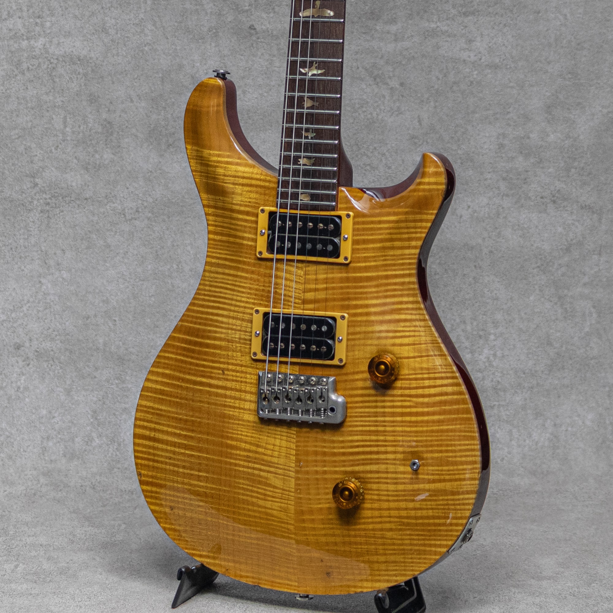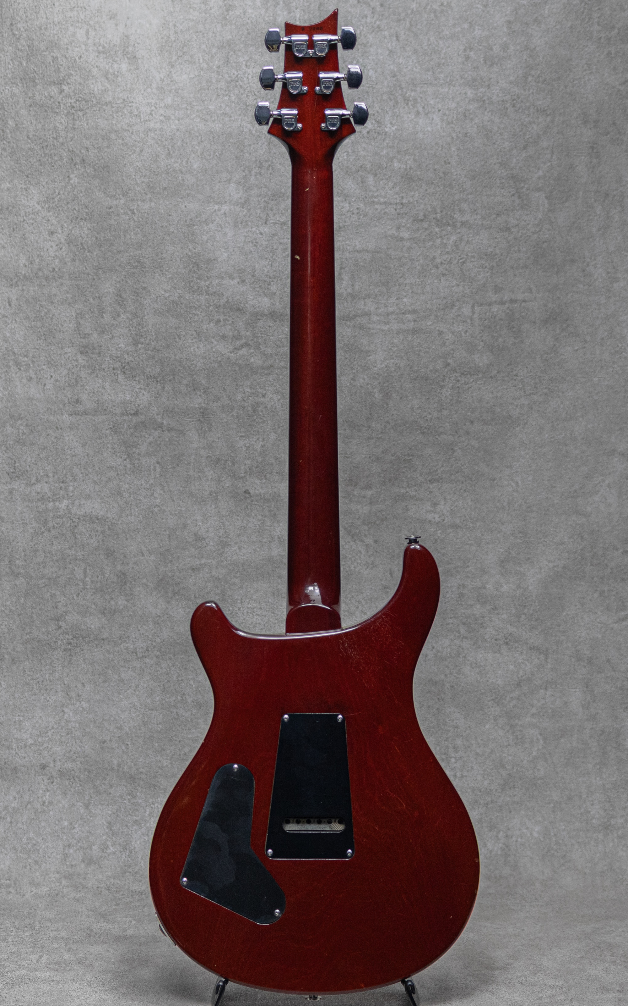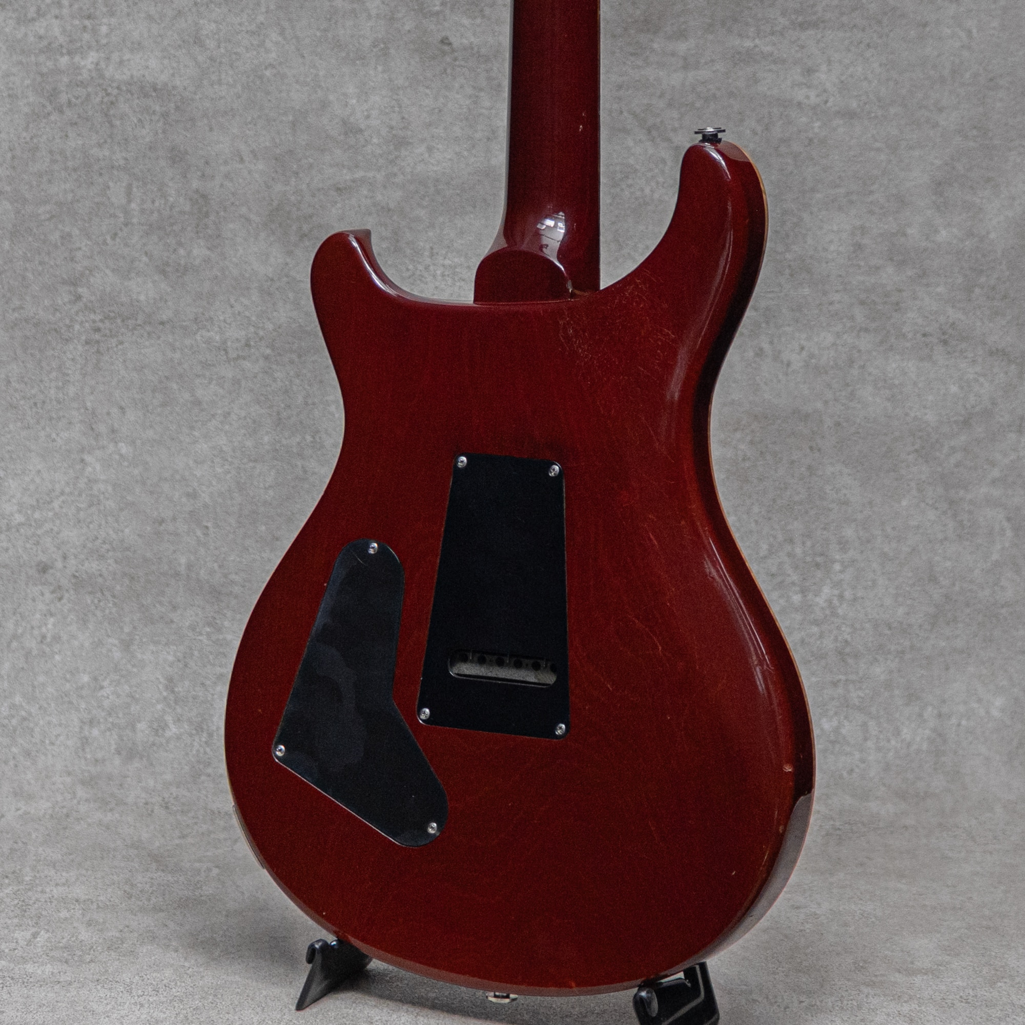 PRSを代表するフラッグシップモデル”Custom 24”。"Paul Reed Smith"が1985年に初めて出展したトレード・ショーで世に発表し、今日でも代表的存在かつ最も人気の高いPRSオリジナルモデルの決定版とも言えるモデル。本器は1989年製"Custom24 10 Top"。現在も変わらず人気カラーのVintage Yellow。加えてブラジリアンローズ指板が使われた初期スペックの1本。独自のダブルカッタウェイシェイプのボディには美しいフレイム杢がしっかりと浮き出たメイプルトップとマホガニーを合わせ、ナチュラルバインディングを施した言わずと知れたデザイン。Pattern Regularネックシェイプ、PRSトレモロブリッジ、ロッキングチューナー、PUにはStandard TREBLE & BASSを採用、1ボリューム、5wayロータリースイッチ、Sweet Switch。デカールロゴやスモールネックヒール、その他ボディ形状やトップのアーチ具合などもこの時期特有の現行とは異なるディテールで、PRSの卓越したデザインセンスの説得力を存分に魅せてくれます。クリアな音像にしっかりと芯のあるグッドサウンド。甘く太いフロントトーンから、重厚なドライブサウンド、コイルタップを使った軽快なサウンドまで、まさに万能モデル的魅力をしっかりと具現化した名モデル。整然として反応の良いアタックと広いレンジを持ちながら、ギター然としたスウィートスポットを突いたこの年代特有のチューニングは弾く楽しみを強く感じさせてくれます。こちら各所細かな小傷、小さな塗装チップ、ボディバックのバックル痕など、経年相応に良く弾かれた様子の伺える外観コンディション。しかし顕著に見た目を損ねるダメージはございません。フレットは8割ほどを残しまだまだしっかり弾いていただける余力があり、ロッドの調整を含め良好なネックコンディション。ローアクションの弾きやすいセッティングができております。現行モデルとはまた異なった魅力と存在感を持つ初期スペック。ぜひご検討ください。オリジナルハードケースが付属。