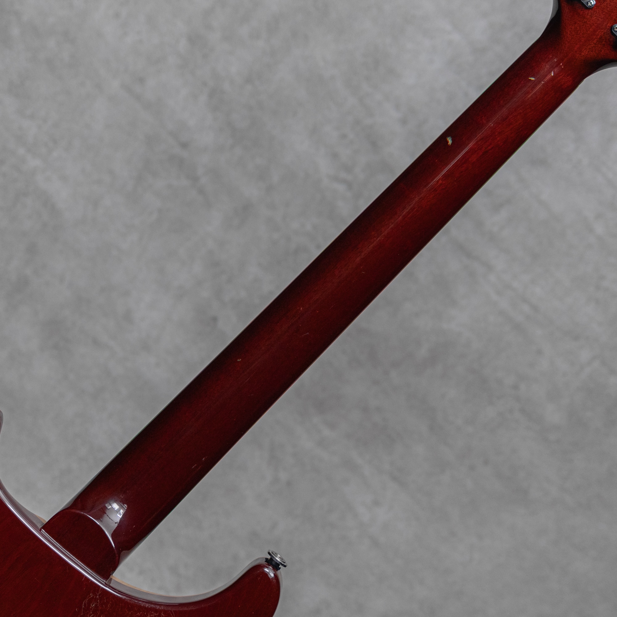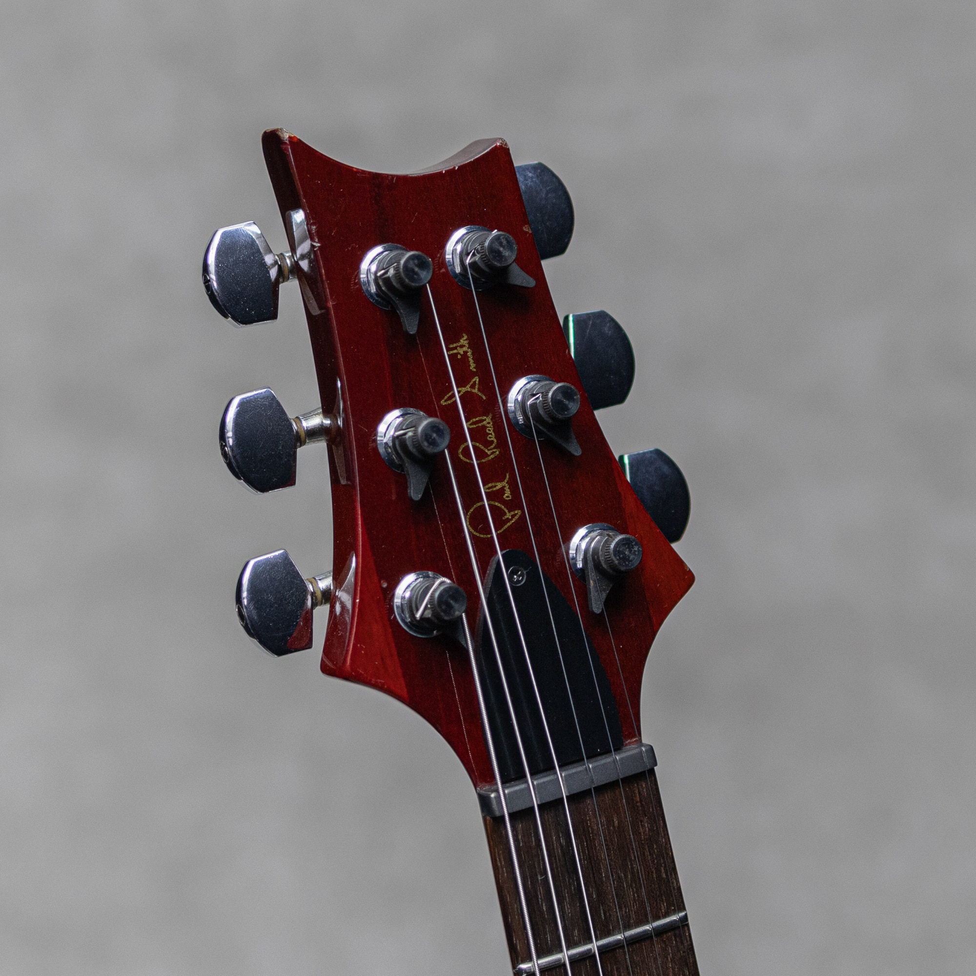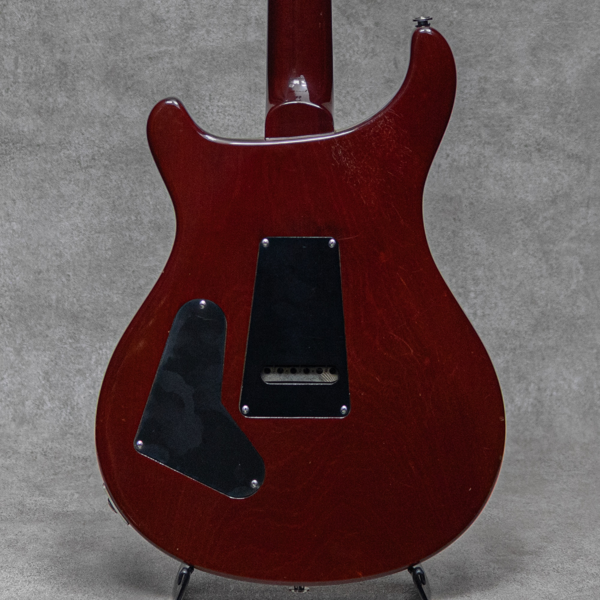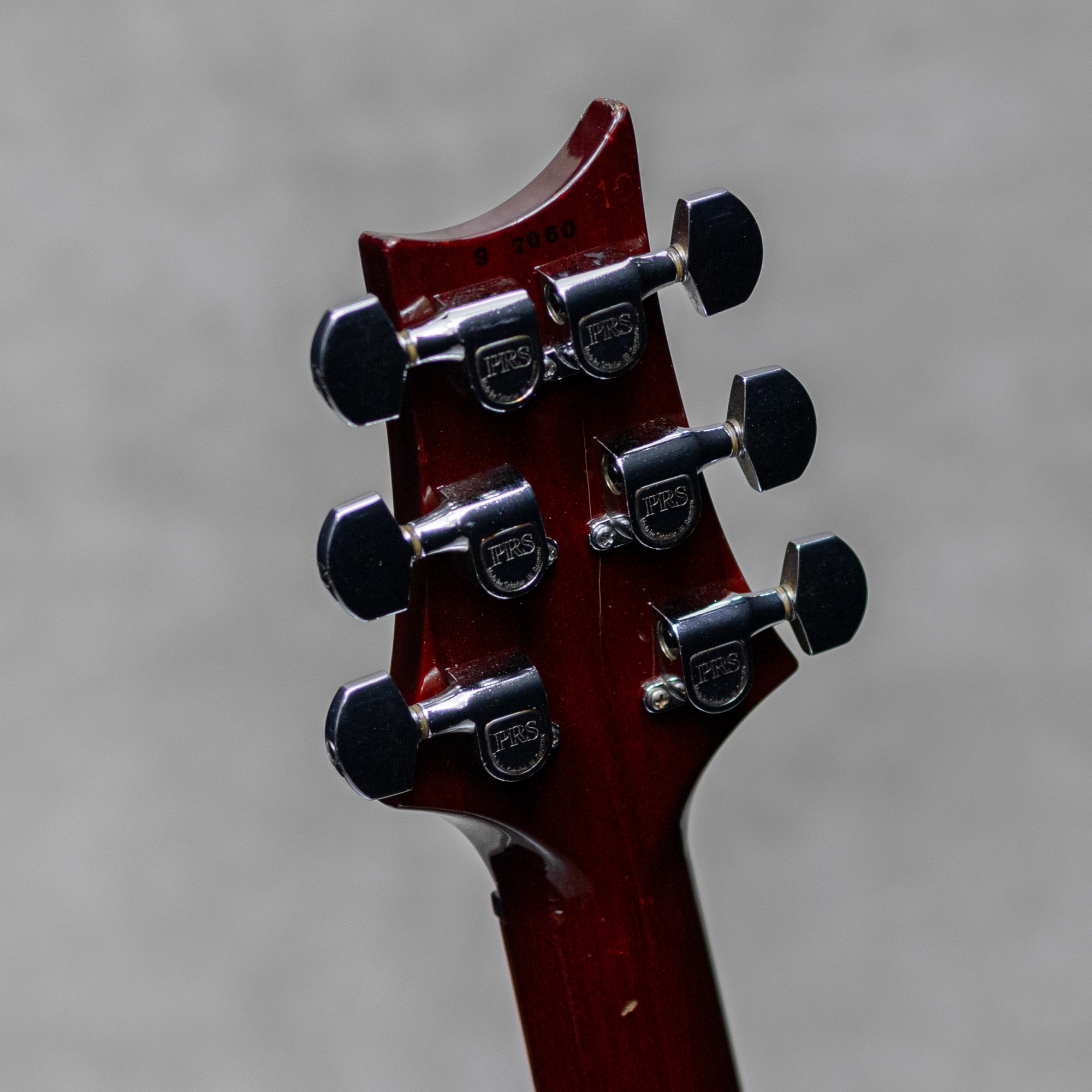 PRSを代表するフラッグシップモデル”Custom 24”。"Paul Reed Smith"が1985年に初めて出展したトレード・ショーで世に発表し、今日でも代表的存在かつ最も人気の高いPRSオリジナルモデルの決定版とも言えるモデル。本器は1989年製"Custom24 10 Top"。現在も変わらず人気カラーのVintage Yellow。加えてブラジリアンローズ指板が使われた初期スペックの1本。独自のダブルカッタウェイシェイプのボディには美しいフレイム杢がしっかりと浮き出たメイプルトップとマホガニーを合わせ、ナチュラルバインディングを施した言わずと知れたデザイン。Pattern Regularネックシェイプ、PRSトレモロブリッジ、ロッキングチューナー、PUにはStandard TREBLE & BASSを採用、1ボリューム、5wayロータリースイッチ、Sweet Switch。デカールロゴやスモールネックヒール、その他ボディ形状やトップのアーチ具合などもこの時期特有の現行とは異なるディテールで、PRSの卓越したデザインセンスの説得力を存分に魅せてくれます。クリアな音像にしっかりと芯のあるグッドサウンド。甘く太いフロントトーンから、重厚なドライブサウンド、コイルタップを使った軽快なサウンドまで、まさに万能モデル的魅力をしっかりと具現化した名モデル。整然として反応の良いアタックと広いレンジを持ちながら、ギター然としたスウィートスポットを突いたこの年代特有のチューニングは弾く楽しみを強く感じさせてくれます。こちら各所細かな小傷、小さな塗装チップ、ボディバックのバックル痕など、経年相応に良く弾かれた様子の伺える外観コンディション。しかし顕著に見た目を損ねるダメージはございません。フレットは8割ほどを残しまだまだしっかり弾いていただける余力があり、ロッドの調整を含め良好なネックコンディション。ローアクションの弾きやすいセッティングができております。現行モデルとはまた異なった魅力と存在感を持つ初期スペック。ぜひご検討ください。オリジナルハードケースが付属。
