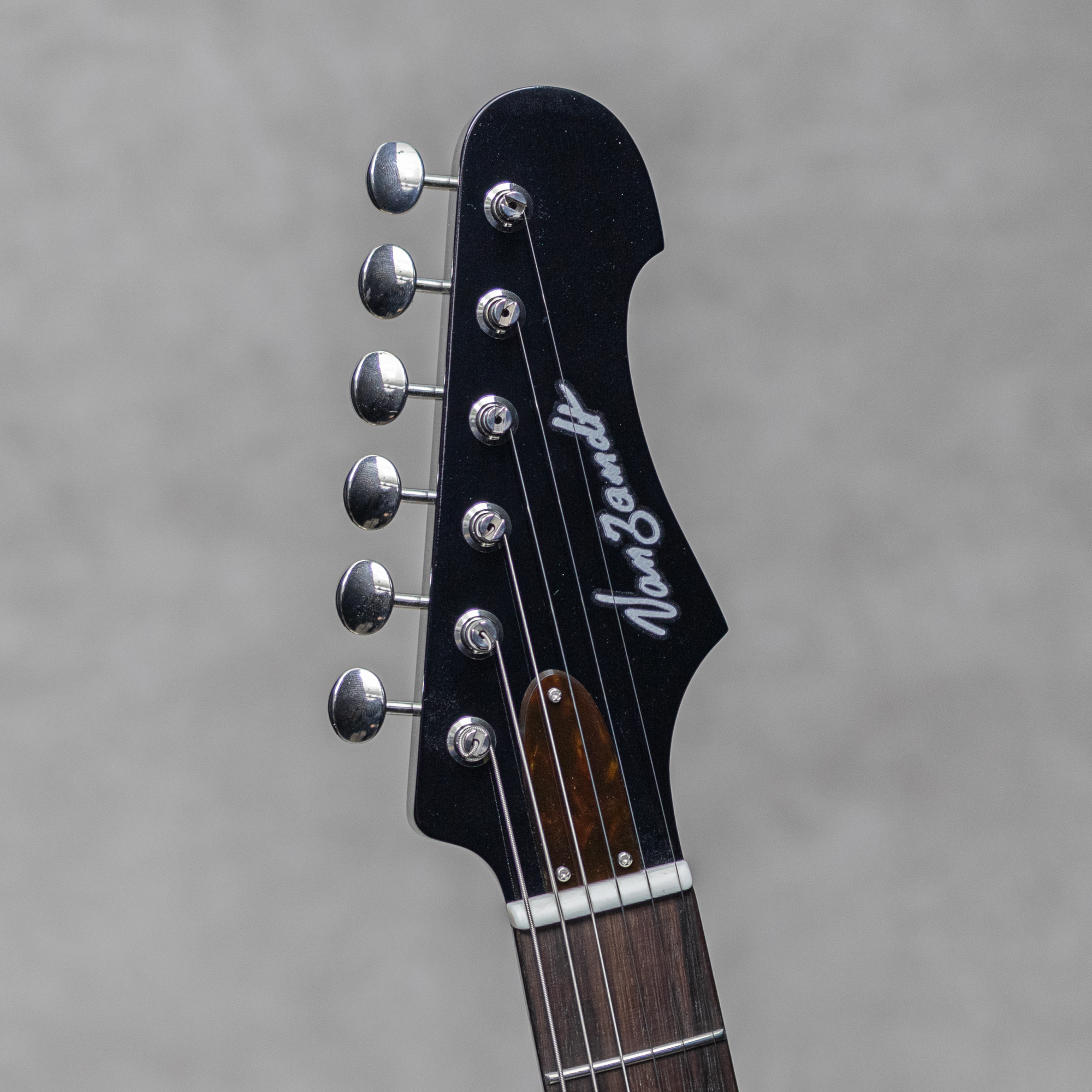 “Neo Vintage”を感じさせる”Vanzandt”。数多くのミュージシャンから愛されたテキサス生まれの”Van Zandt”ピックアップを搭載し、国産の確かな技術で作り上げられるギターは、その価格以上のクオリティを感じずにはいられない実力派ギター。本器は新ラインナップ"Hybrid Series"より"Bronson V "。628㎜スケールのメイプルセットネック、インディアンローズウッドスラブ指板、ヘムロックボディ、ピックアップにはこのモデル専用に開発された70年代ロックテイストを意識した"VZ-V"シングルコイルピックアップ2基搭載。一見トラッドなスチューデントモデルを想起させるアッセンブリながら、セットネック構造の628㎜スケールやスプルースにも近いヘムロック材の採用など、オリジナリティとセンスに溢れたマッシュアップで楽しませてくれるNewモデル。ユニークかつ機能的なスペックを少しビザーリーでレトロ、それでもどこかモダンなルックスに落とし込んだまさに"Neo Vintage"を実感させてくれる納得のデザイン。子気味良くクリスピーに乾いた弾き心地と明るくキレのあるレスポンスながら、ガッツのある出力でまったく軽薄さを感じさせないミッドの太さをしっかりと持ったグッドサウンド。バランス良く軽い取り回しと、心地良い弦のテンションとトルク感でいつまでも弾き続けたくなる完成度。パッと手に取れるカジュアルさを持ちつつ しっかりとした弾き応えが楽しくがっつり弾きこんでいいただきたい1本です。
