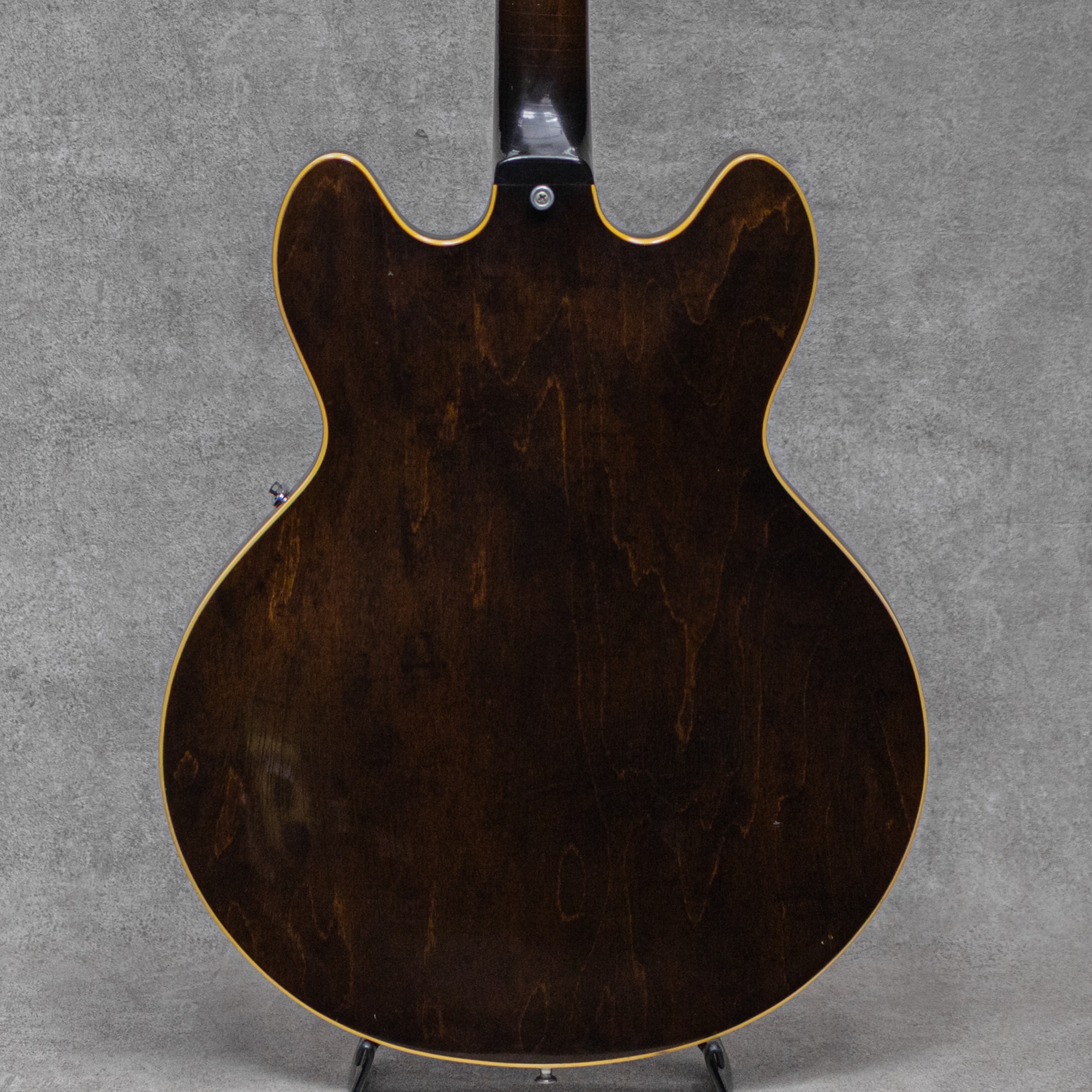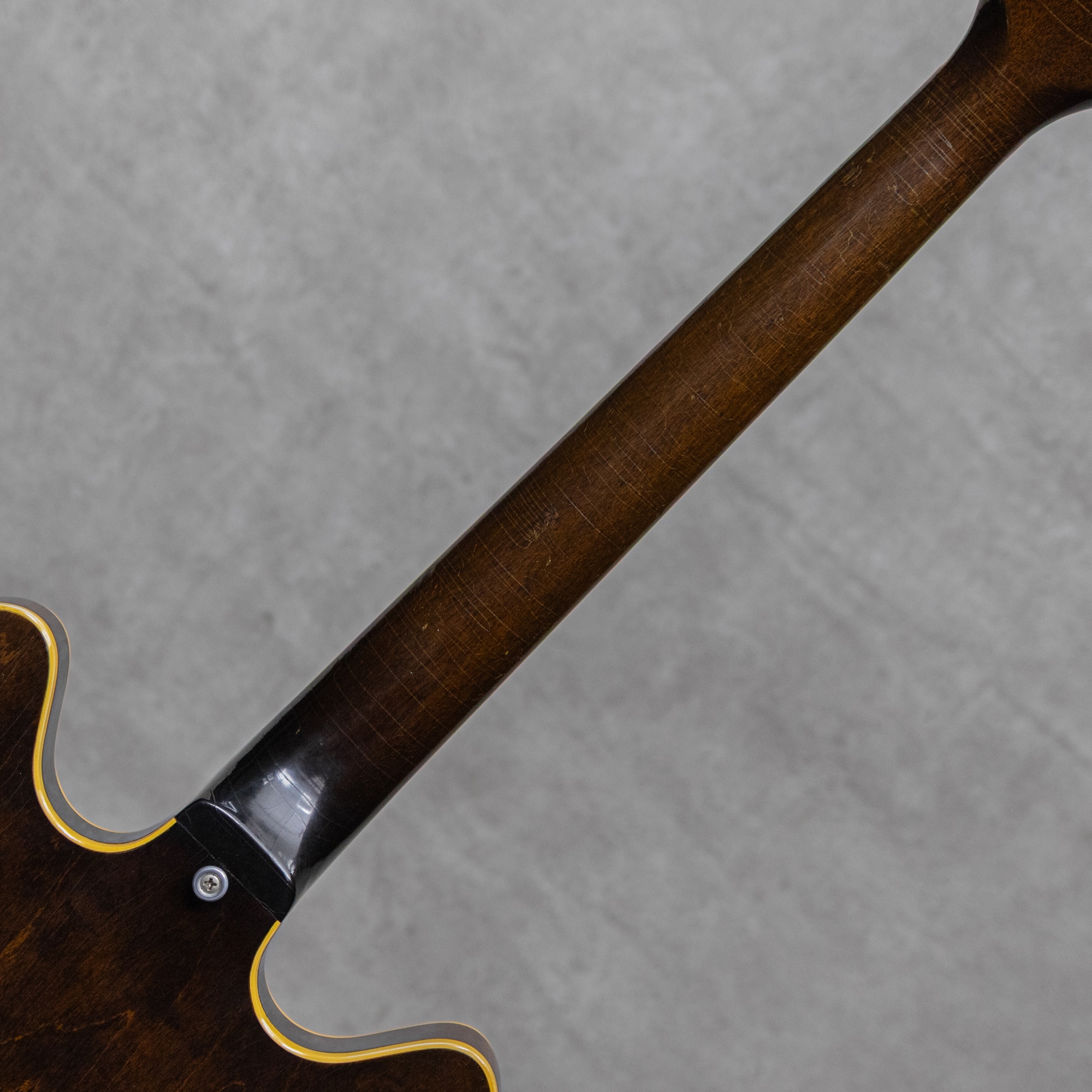 "ES-330"は1959年に登場。"セミアコ"の代名詞ともいえる"ES-335"と同じダブルカットのシンラインボディ形状を持ちつつ、センターブロックを置かないフルホロウ構造を採用、同スタイルのEpiphone版である"Casino"と並んで広く愛されてきました。本器は1967年製"ES-330TD"、60年代らしい淡い色合いが魅力のSunburstカラー。マホガニーネック、ローズウッド指板、スモールブロックインレイ、クルーソン2ラインペグ、メイプルラミネートボディ、16フレットジョイントの"ショートネック"、P-90、ドッグイヤークロームメタルカバー、ブランコテールピース。ネックスケールは約628㎜の通常のギブソンスケールであるものの、登場の1959年~1969年頃まではネックジョイントが16フレット位置で設計されており、ローフレットが手元に近い通称"ショートネック"と呼ばれます。手に取りやすい軽さ、小回りの利くデザインはギターボーカルにも抜群。その後"ES-335"と同じ19フレットジョイントに変更されますが、比べるとネックジョイントが深い分、サウンド的にもより豊かなミッドの飽和感、甘い響きが強く感じられる点もこちらの仕様の魅力です。程よく枯れたドライな生鳴りとエアー感豊富な響き、アンプからの出力もヴィンテージらしい弾き応えのある心地よいレスポンスで、豊かな倍音感を持ちつつも子気味の良い軽快さで楽しませてくれます。こちら全体に塗装チェッキングが入った雰囲気の良い経年具合。リアピックアップがSeymour Duncan製P-90タイプに交換されているものの、フロントピックアップ、ボリューム&トーンポット、コンデンサ等はオリジナルをキープ。フレットの減りも60~70%程と年代相応に見られるものの、ローアクションで気持ちよくお楽しみいただけるネックコンディションをキープしています。その他商品コンディション詳細等はお気軽にお問合せくださいませ。ハードケースが付属。