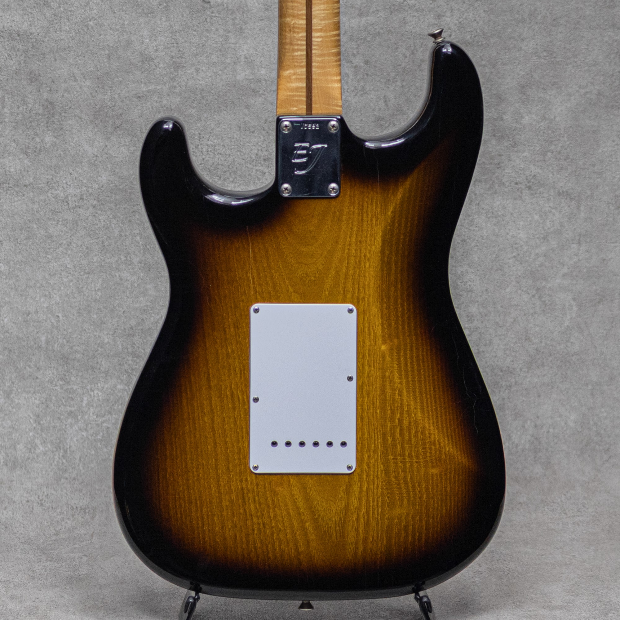 Eric Johnson “Virginia”。エリック・ジョンソンがキャリアの大半で愛用した1954年製Stratocaster。デビュー当時から使用されており代表曲"Cliffs of Dover”はもちろん、”Tone”や"Ah Via Musicom”のアルバムレコーディングや数々のライブでも活躍してきました。EJがその54年製Stratocasterにキャビティ内で見つけた”Virginia”と書かれたマスキングテープにちなんでその愛称をつけた逸話は有名で、彼のキャリアを決定づけスターに押し上げた相棒としても有名です。本器は、そんな”Virginia”を細部に渡りレプリカされた”Eric Johnson "Virginia" Stratocaster Master Built by Carlos Lopez”。世界限定50本でマスタービルダー・カルロス・ロペスによって製作された1本。2020年製極上USED品。サッサフラスのオフセットシーム2ピースボディ、AAAAフレイムメイプルワンピースネック。“Virginia”のその特徴的なサウンドは、当時のStratocasterでは珍しかった”Sassafrass(サッサフラス)”材がボディに使用されていたことでも有名です。ネックシェイプは手に馴染み良い"V”シェイプ。12”R指板、ジャンボフレット、21フレット仕様。”EJ"ネックプレート。ピックアップには、"Josefina Campos(ホセフィーナ・カンポス)”によるハンドワウンド”EJ Virginia”x2とリアにDiMarzio "HS-2 DP116”を搭載、またコンデンサーにはフェンダーワックスペーパー0.1uFを使用。コントロールレイアウトはマスタボリュームと、トーン回路がフロント、リアの配線で、セレクターはCRL5wayスイッチを使用。彼の独特なサウンドを再現すべくカスタムワイヤリングも再現されており、ネック&ミドルのポジションでアウトフェイズミックス、ミドル&ブリッジのポジションでインフェイズミックスで出力されます。面取りされた1プライ"エッグシェル”ピックガードやコントロールノブ、”Closet Classic”仕上げなど、雰囲気も抜群の完成度です。そしてキャビティ内に残された”Virginia”のサイン入りのマスキングテープも再現。これは1954年当時、製作担当者がサインを残していた名残でした。また実器より採取されたデータに基づき、1弦”e”使用された”Graph Tech Saddle、ジャックプレートの平型ワッシャー、ナイロンワッシャーストリングガイド、3:1に配されたトレモロスプリング、1弦側に多く余裕を持たせたオフセットナットなどなど、細部に渡りこだわりを詰め込まれた再現度になっています。メイプル指板モデルでは珍しい甘くファットなトーン。レスポンスに長けていながら、野太くロングトーンを魅せてくれます。製作を担当した“Carlos Lopez”は、マスタービルダー”Todd Krause”の下でマスタービルダーアプレンティスとなり、ジェフ・ベック、エリック・クラプトン、ロビー・ロバートソン、ケニー・ウェイン・シェパード、ロビン・トロワーなどのギターを手伝ったキャリアを持つビルダーです。使用に伴う傷や使用感は伺いにくく、とても良好なコンディションで保たれた本器。ネックコンディションも良好でフレット減りも殆んど無く、弾きやすいアクションでしっかりとお使いいただけます。ファンにはたまらない完成度を持つ、魅惑の1本、"Virginia”。ファンにマストなアイテム。コレクタブルコンディションの1本をお見逃しなく。。認定書やストラップ、シールドやその他新品時付属品はしっかりと残され付属しています。