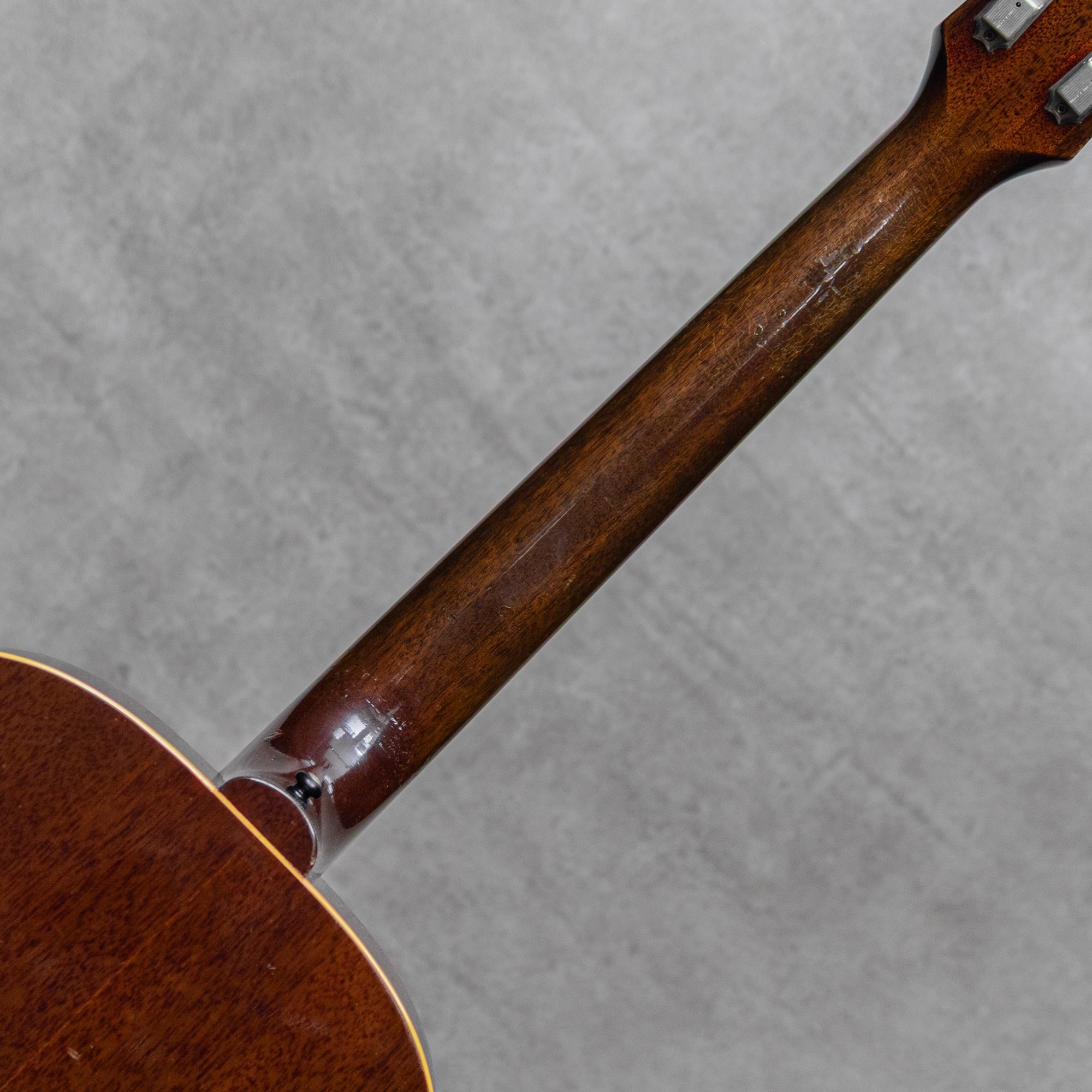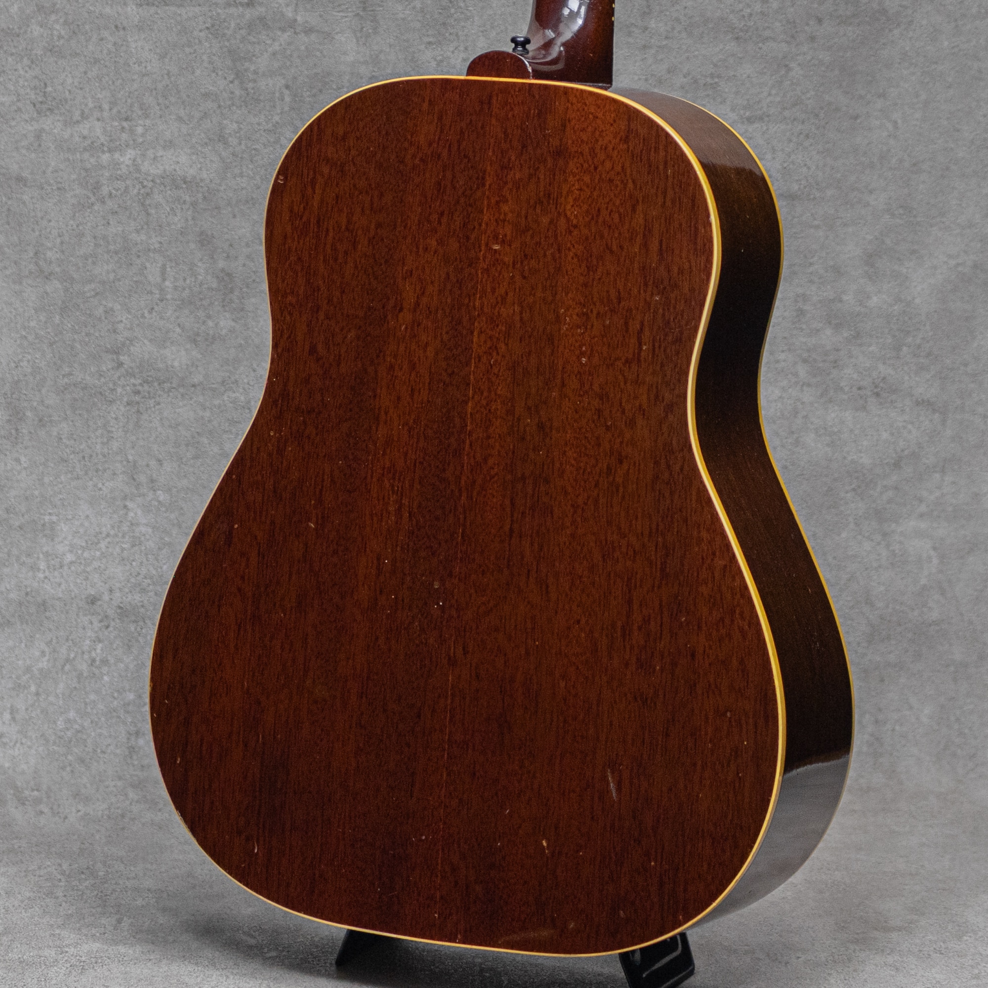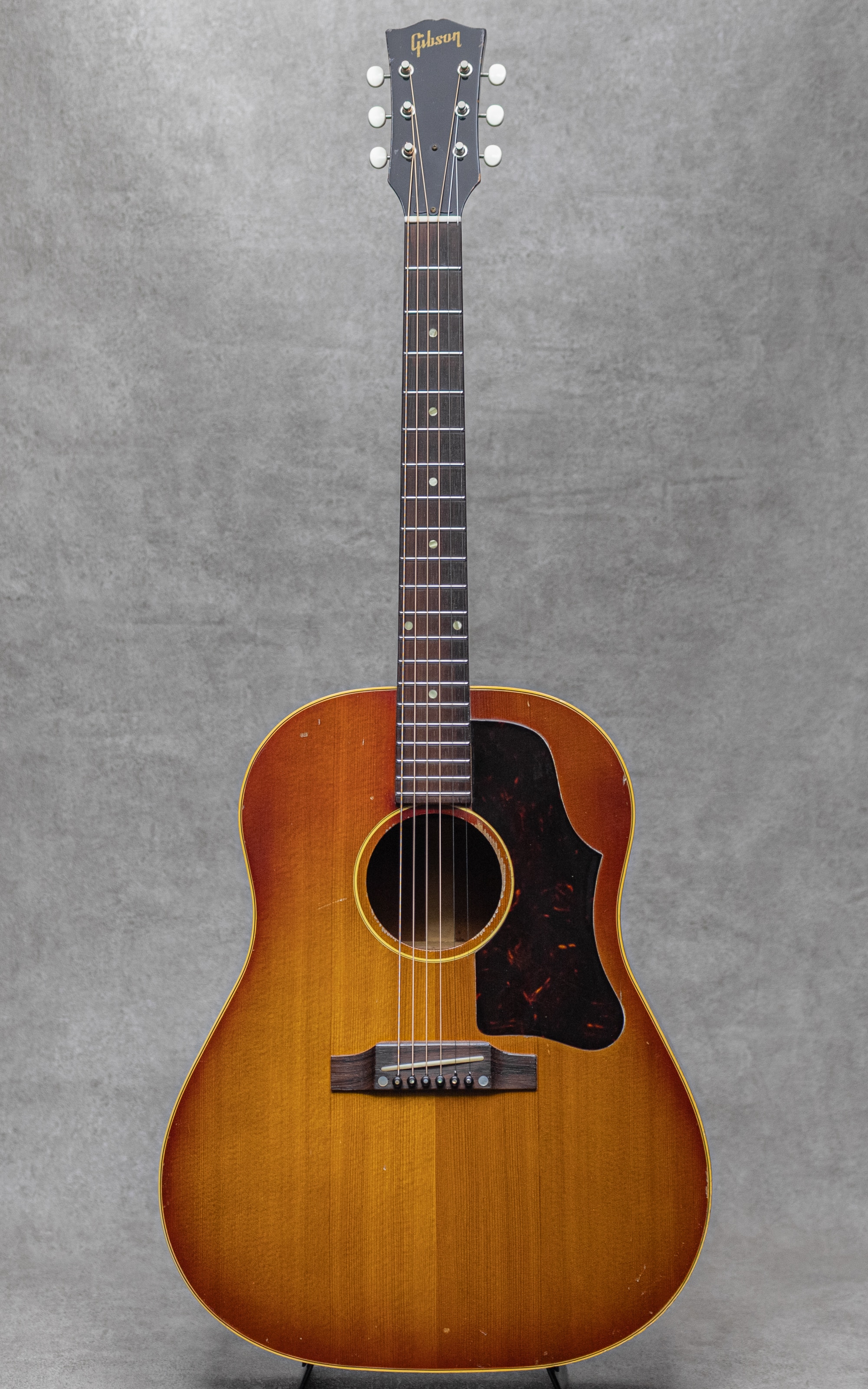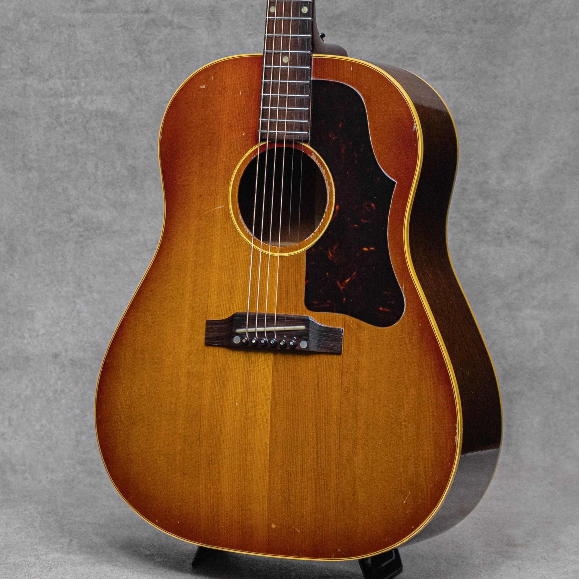 フラットトップにおけるもうひとつの憧れ、ワーキングホースGibson"J-45"。1942年に登場した"J-45"、その後幾つかのマイナーチェンジを繰り返しながらも、今尚トップシーンで欠かせないGibsonを代表するラウンドショルダーボディのジャンボモデル。本器は艶かしく美しいチェリーサンバーストの1本。"J-45”には1956年からアジャスタブルブリッジオプションが登場しますが、1961年頃にはスタンダード仕様へと変更になります。そのため、この年式でオリジナルフィックスドブリッジはなかなかお目にかかれない珍しい仕様です。グッドコンディションの1962年製極上Vintage品。スプルーストップ、マホガニーサイド&バック、マホガニーネック、ハカランダ指板、ハカランダブリッジ、ポインテッドシンピックガード、シングルリングロゼッタ、ノンスキャロップド・Xブレイシング。ペグは近年製のシングルライン3連クルーソンペグに交換されています。泥臭くガランと響くEarly60sのJ45サウンド。野太くドライで男臭い響きが絶妙な本器。アジャスタブルサドル仕様に比べミドルが詰まったサウンドはこの頃独特の平薄型のネックと合わさり、より生々しく、よりダイレクトなアコースティックサウンドを存分にお楽しみいただけます。まだまだしっかりと美しいチェリーサンバーストカラーを残し、びっしりと入ったウェザーチェックには汚れが入り込んでおらず、塗装の光沢感も相まって艶やかな色気ある雰囲気を醸し出す貫禄は、経年でしか味わえない趣きあるリアルビンテージならではのルックス。ネック周りもグッドコンディションデ弾きやすいアクションをしっかりと保っています。使用に伴う小傷やピッキングウェア、バックル痕などは見られますが、エグるものや汚らしいものはなくその貫禄を助長してくれます。ピックガード外側に杢目に沿ったガードクラックが見られますが、裏側までは達していず歪みもほとんど見られません。ネックヒールへのストラップピン増設と、ヒールサイドにストラップピン取付痕がありますが現在は埋木&タッチアップで補修されています。ペグ交換以外は、ノンクラックでパーフェクトなコンディションの実践器。コレクションとしても、オススメ度二重丸の1本です。お見逃しなく要チェックください。少し後年のGibsonハードケースが付属します。