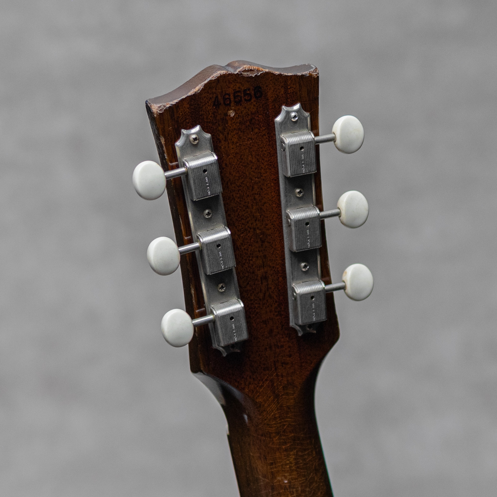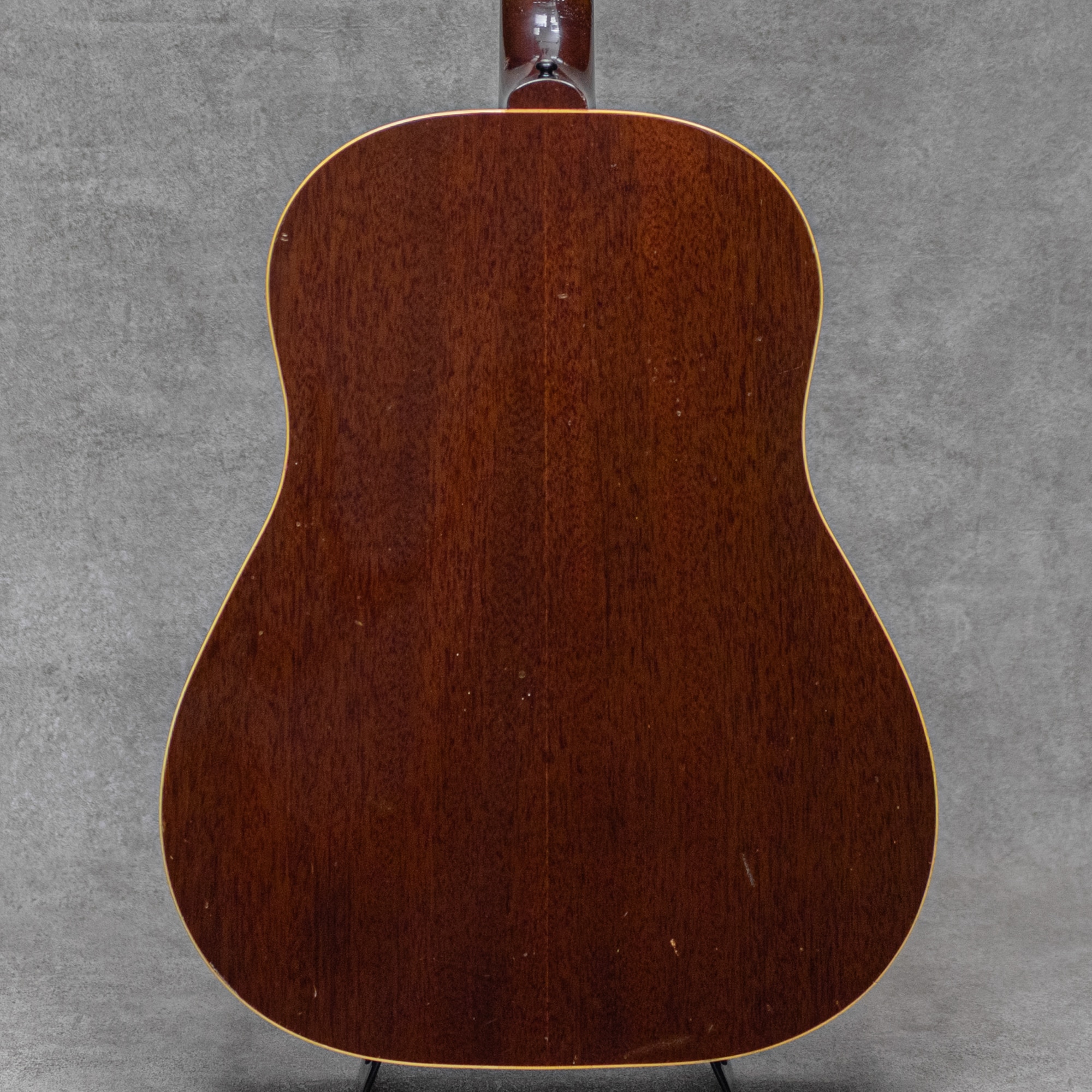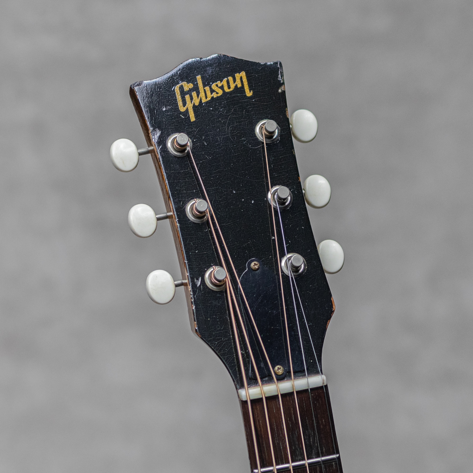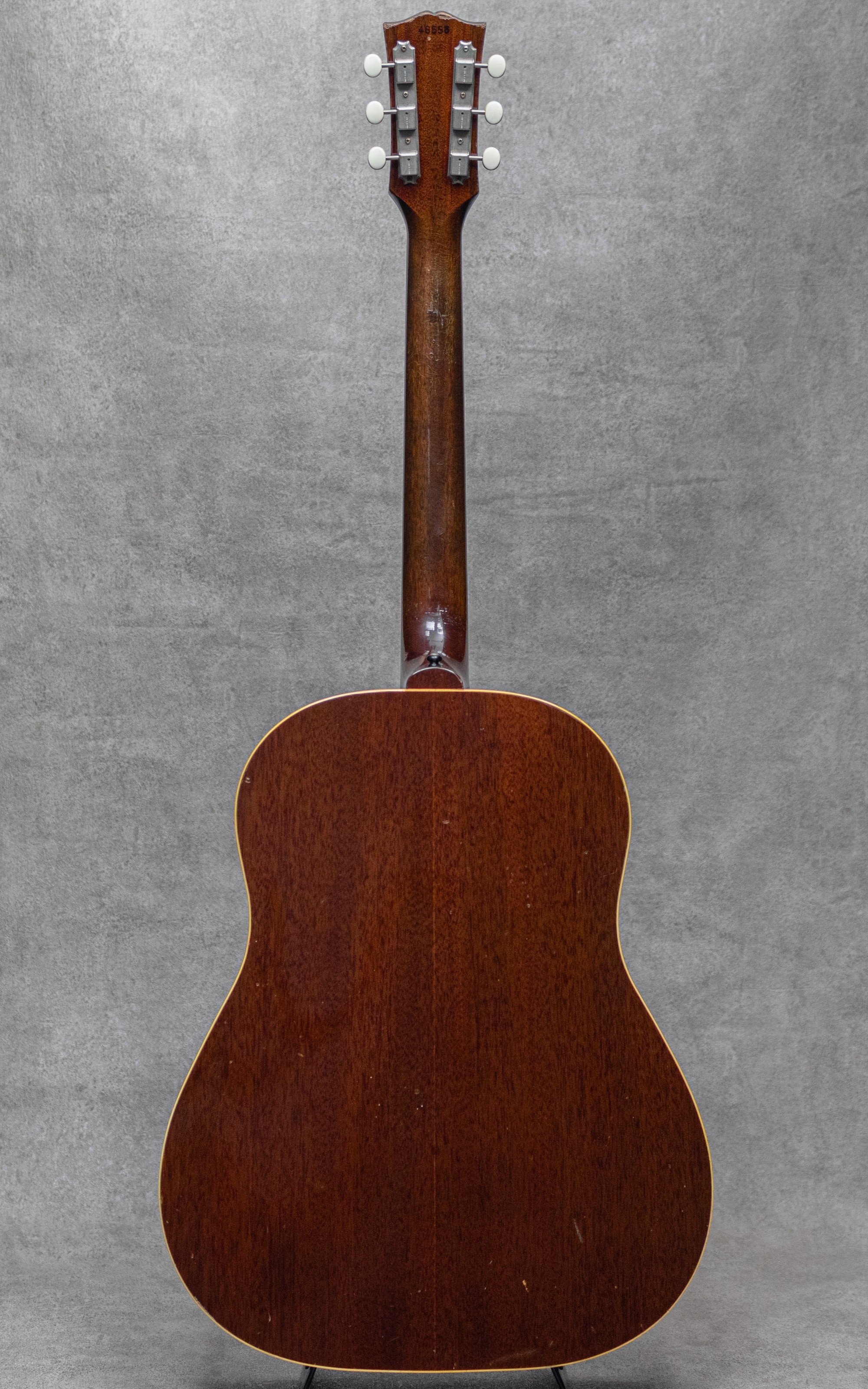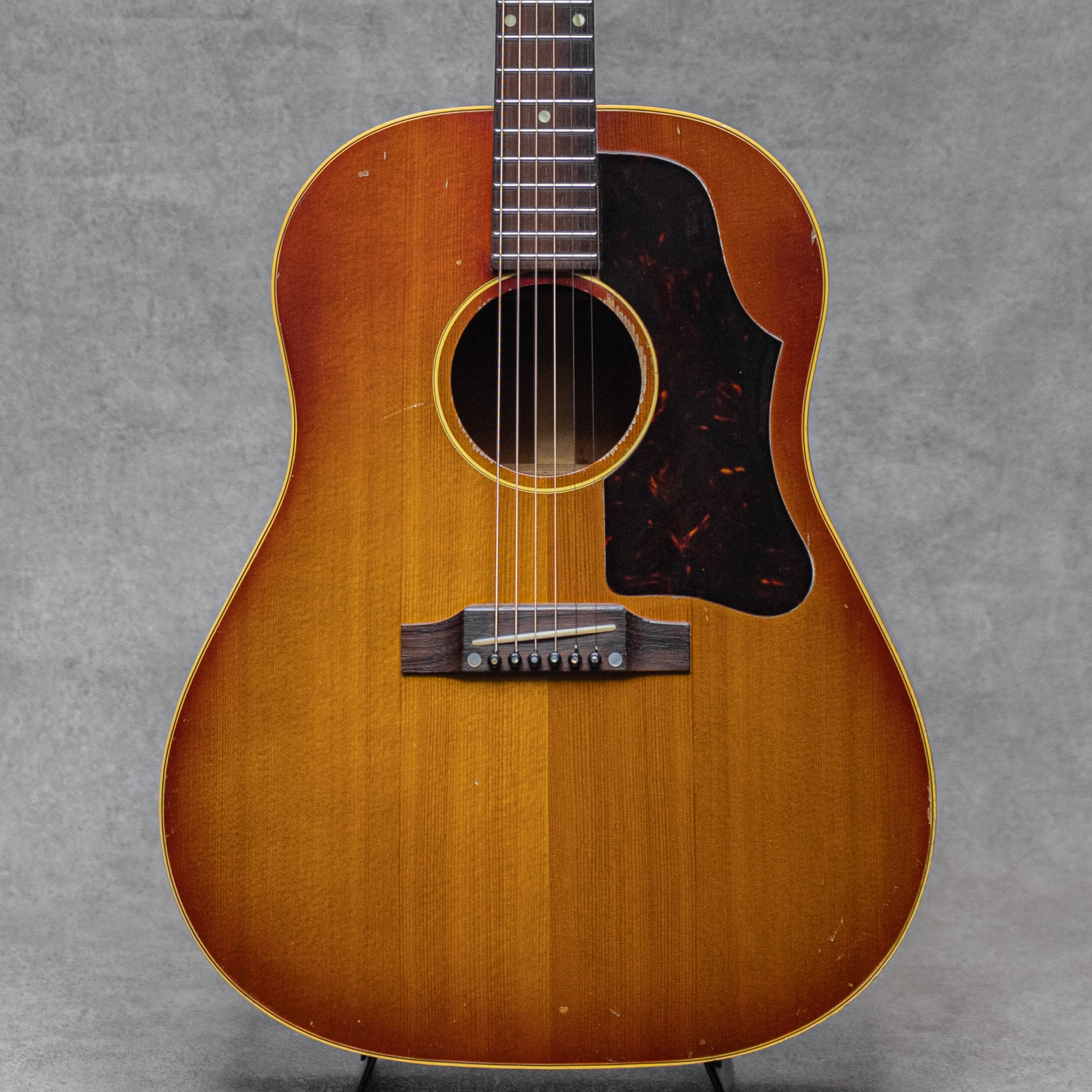 フラットトップにおけるもうひとつの憧れ、ワーキングホースGibson"J-45"。1942年に登場した"J-45"、その後幾つかのマイナーチェンジを繰り返しながらも、今尚トップシーンで欠かせないGibsonを代表するラウンドショルダーボディのジャンボモデル。本器は艶かしく美しいチェリーサンバーストの1本。"J-45”には1956年からアジャスタブルブリッジオプションが登場しますが、1961年頃にはスタンダード仕様へと変更になります。そのため、この年式でオリジナルフィックスドブリッジはなかなかお目にかかれない珍しい仕様です。グッドコンディションの1962年製極上Vintage品。スプルーストップ、マホガニーサイド&バック、マホガニーネック、ハカランダ指板、ハカランダブリッジ、ポインテッドシンピックガード、シングルリングロゼッタ、ノンスキャロップド・Xブレイシング。ペグは近年製のシングルライン3連クルーソンペグに交換されています。泥臭くガランと響くEarly60sのJ45サウンド。野太くドライで男臭い響きが絶妙な本器。アジャスタブルサドル仕様に比べミドルが詰まったサウンドはこの頃独特の平薄型のネックと合わさり、より生々しく、よりダイレクトなアコースティックサウンドを存分にお楽しみいただけます。まだまだしっかりと美しいチェリーサンバーストカラーを残し、びっしりと入ったウェザーチェックには汚れが入り込んでおらず、塗装の光沢感も相まって艶やかな色気ある雰囲気を醸し出す貫禄は、経年でしか味わえない趣きあるリアルビンテージならではのルックス。ネック周りもグッドコンディションデ弾きやすいアクションをしっかりと保っています。使用に伴う小傷やピッキングウェア、バックル痕などは見られますが、エグるものや汚らしいものはなくその貫禄を助長してくれます。ピックガード外側に杢目に沿ったガードクラックが見られますが、裏側までは達していず歪みもほとんど見られません。ネックヒールへのストラップピン増設と、ヒールサイドにストラップピン取付痕がありますが現在は埋木&タッチアップで補修されています。ペグ交換以外は、ノンクラックでパーフェクトなコンディションの実践器。コレクションとしても、オススメ度二重丸の1本です。お見逃しなく要チェックください。少し後年のGibsonハードケースが付属します。