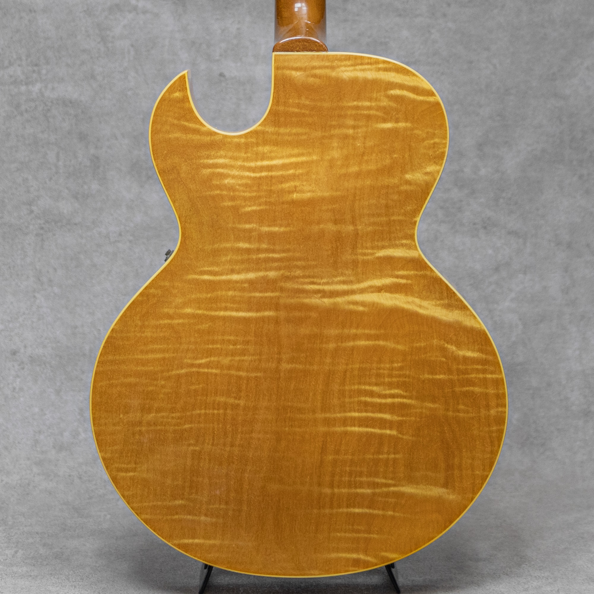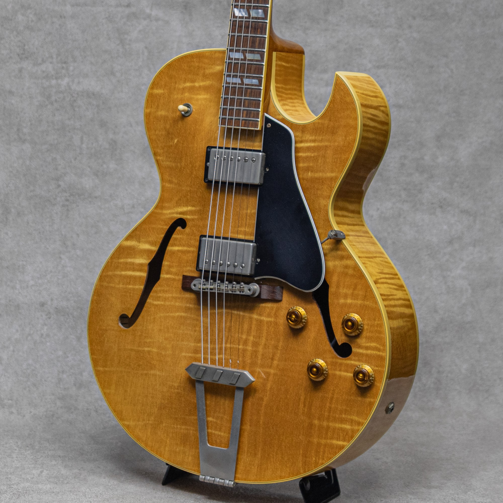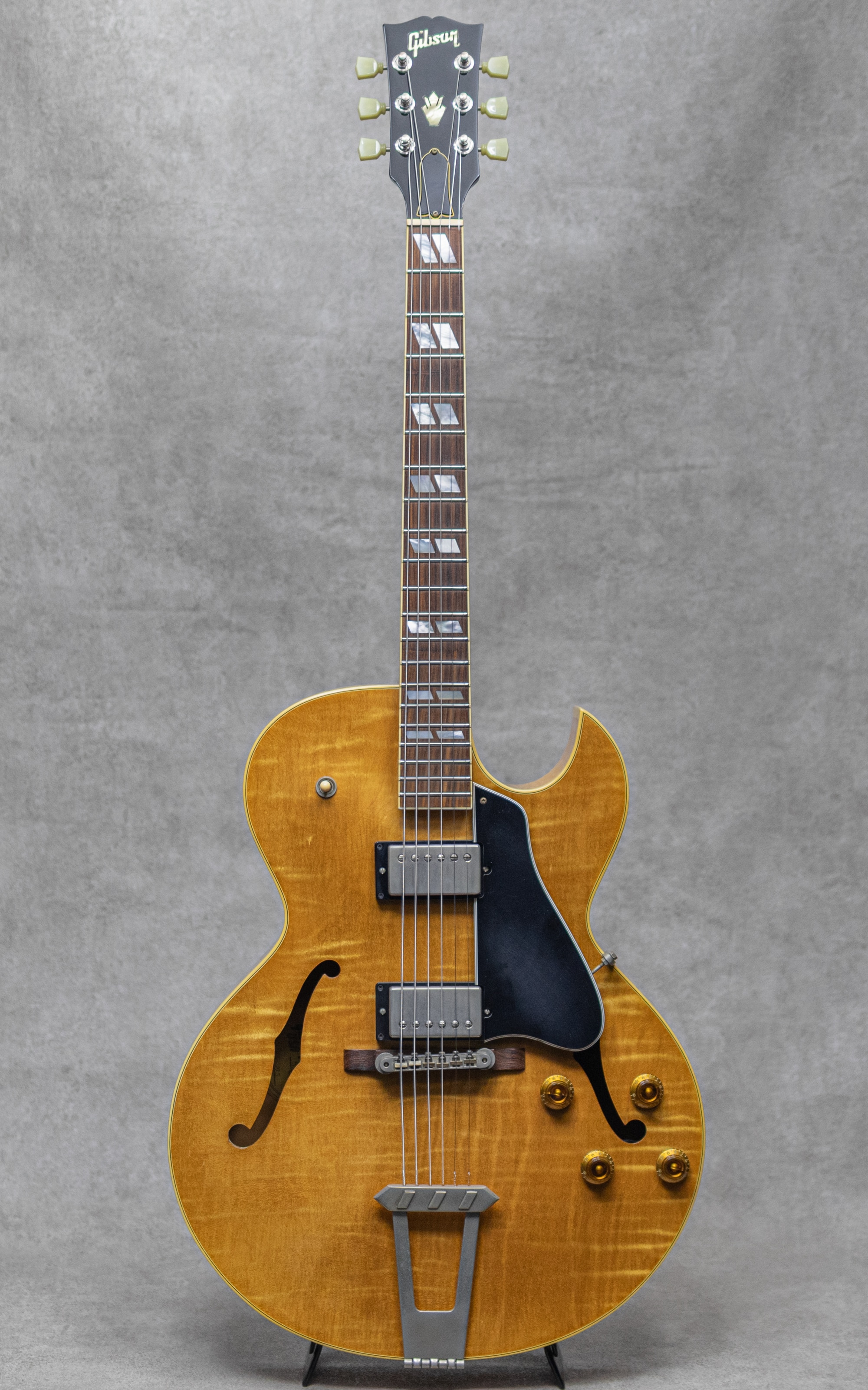 ギブソンアーチトップのスタンダードとして堂々とその名を歴史に刻むモデル"ES-175"。16インチのラミネイトメイプルボディというスタイルはアーチトップギターの標準の1つとしてあらゆるメーカーの指針とされています。本器は1997年製"ES-175 Reissue" Antique Naturalカラー。1970年代中頃に始まったギブソン旧カラマズー工場からナッシュビル工場への移転に伴い、1980年代の間しばらく生産がされなかったESモデル他でしたが、1990年台に入りその生産を再開、王道仕様の定番スペックにてしっかりラインナップがされるようになりました。マホガニーネック、スモールヘッド、クラウンインレイ、"Gibson Deluxe"クルーソンスタイルチューナー、メイプルラミネートボディ、パラレログラムダブルインレイ。ABR-1ブリッジ、トラピーズテールピース、ピックアップには57Classicを搭載。この年代らしく見事なフレイムのメイプルの杢が美しいボディ。程よく僅かに色づいたナチュラルカラーも説得力あるルックスを演出しています。ミドルに膨らみのある牧歌的ギブソントーンが楽しめる1990年代製らしいキャラクター。決してワイドレンジではないもののおいしいゾーンを狙ったアイコニックなサウンド。57Classicピックアップとも相まって、程よく僅かにアタックにコンプレッションのある子気味の良い弾き応え。気構えし過ぎない程よいカジュアルさで楽しませてくれます。こちら経年相応のハードウェアのくすみ、極細かな小傷、擦れ跡程度はあるものの目立ったダメージは無くとても良好なコンデイション。フレットの目立った消耗も見受けられず丁寧に扱わていたことが判る良い印象。トラスロッドの調整を含めネックの状態も良好で、弾きやすいセッティングができております。全体的に雰囲気よく細かラッカー塗装のウェザーチェックがびっしりと入っており、角度によって浮き出す様子もまた一興。各所王道のウッドマテリアルとデザイン、ニッケルハードウェアと塗装の質感も相まって説得力あるルックスが抜群の1本、ぜひご検討ください。オリジナルハードケース付属