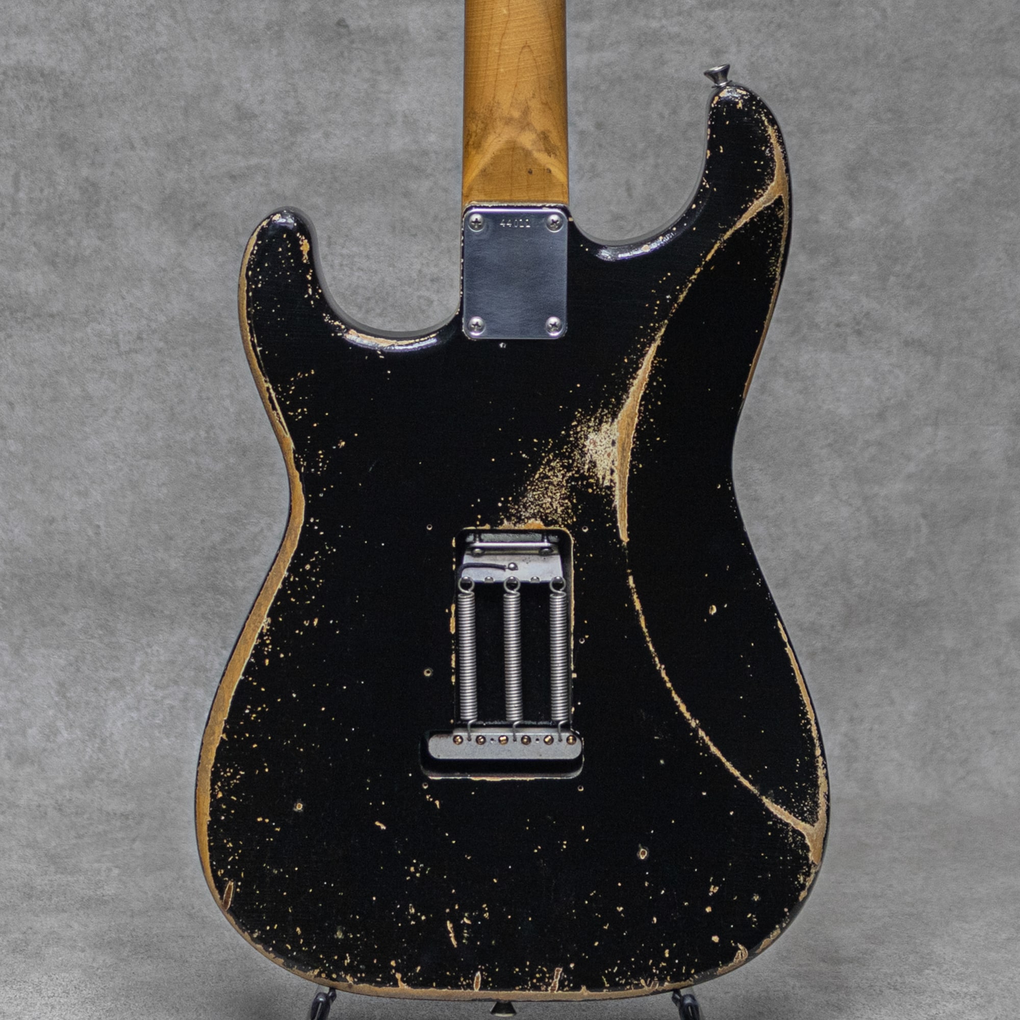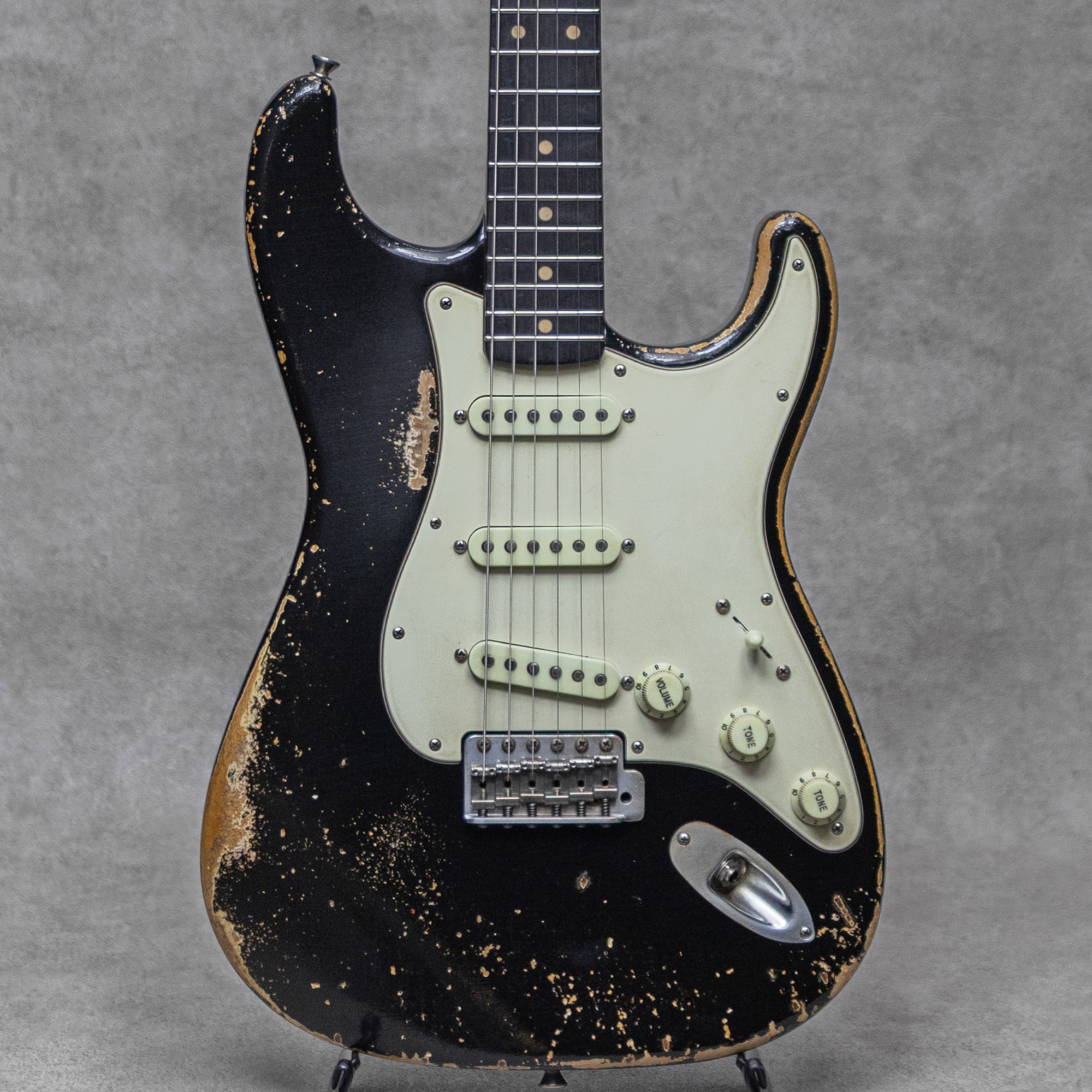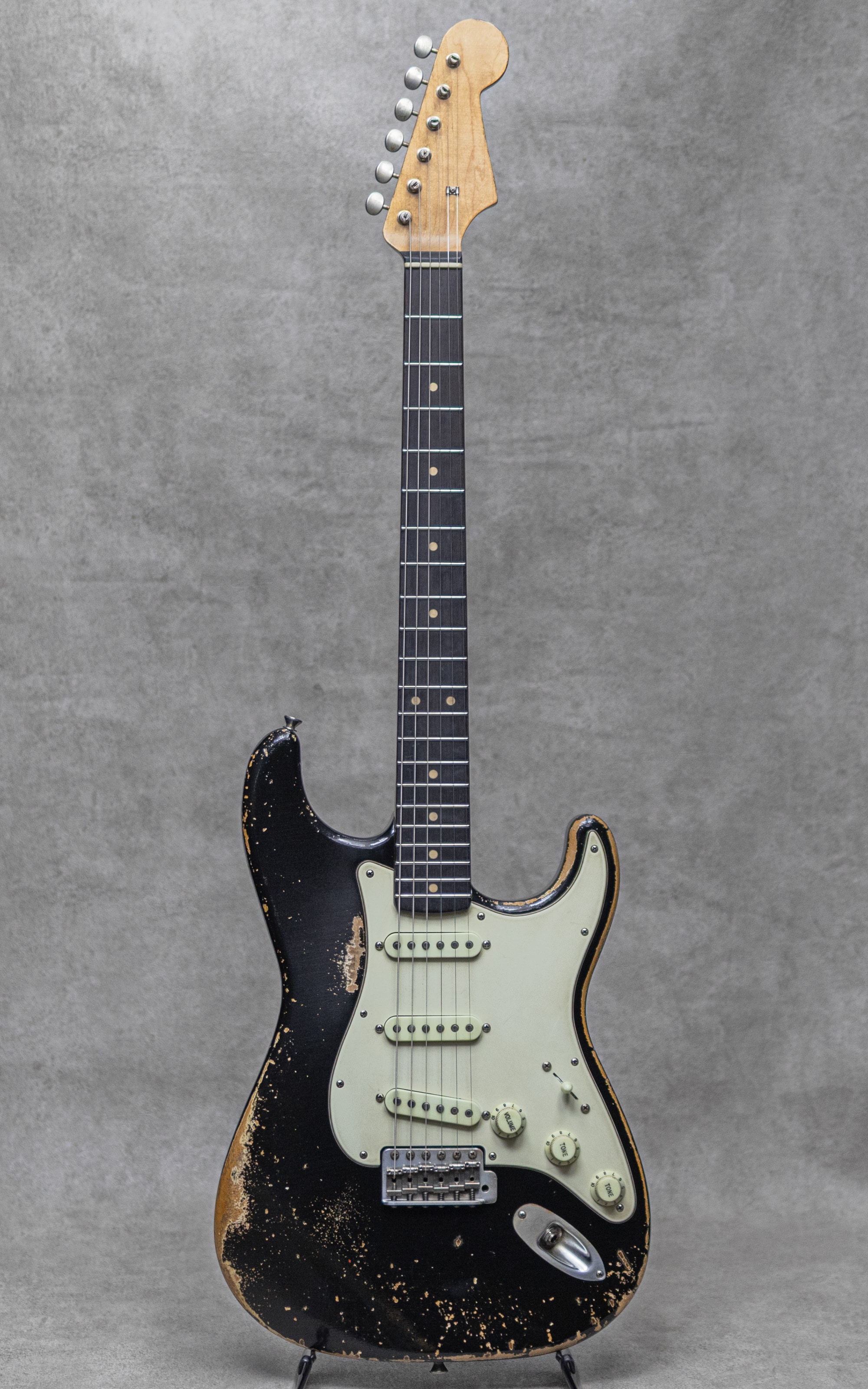 "THE BLACKGUARD BOOK"の著書でもあるNacho Banos氏による、究極のBlackguard Replicaブランド"Nacho Guitars”。年間の製作本数は非常に少なく日本国内への入荷数も限られており、カタログモデルといった概念は無く1本1本個性を宿したギターをワンオフで製作するようなスタイルが貫かれています。同じ年代・特徴のモデルであっても、それぞれが個性を持った外観・弾き心地・そしてサウンドが表現されております。本器は、”Early 60s Contour Body #44011 Super Heavy Aging Black Medium C Neck”。オリジナル・ブラックガードを知り尽くしたNacho氏の経験値を元に製作される、圧巻の完成度を誇る 60’sレプリカの1本。スラブローズウッド指板、メイプルネック、アルダーボディのウッドスペック。オールドを知り尽くしたNacho氏ならではの雰囲気満点、貫禄充分のスーパーヘビーエイジド加工が施された白のアンダーコートが垣間見えるエイジドブラック。ミディアムCシェイプに仕上げられたネックは細すぎず薄すぎない握り心地の良いネックシェイプです。本物さながらの経年したハードウェア、褪色感を再現したエイジンググリーンカラーの3plyPGは、その作り込みを愛でるだけでも楽しめる仕上がり。9.5”ラジアス指板、ミディアムフレット、Early60’sスタイルトレモロブリッジ、スチールサドル、Early 60’sスタイルピックアップ、アルミシールディングプレート、ワックスディップレプリカコンデンサー。ピックアップセレクターワイヤリングは5wayで、ネックPUトーン、センターPU&ブリッジPUトーンです。レンジ感の広い乾いたサウンド。レスポンスに長けながら金属質でないビンテージさながらのトーン。倍音感にあふれる甘いトーンから、ベルトーンの美しいハーフトーンまで、このスタイルに求められるサウンドを遺憾なく発揮してくれます。ストイックにブラックガードを愛したNacho氏ながら、指板ラジアスやピックアップワイヤリングなどはモダンで使いやすいセットをセレクトしており、より実戦向きで使えるビンテージレプリカに仕上げられています。歴戦の1本と見紛うばかりの雰囲気と仕上がりの話題と人気を集めるスペイン発”Nacho Guitars”。是非お手元でお確かめください。オリジナルハードケース、トレモロアーム、バックパネル&スクリュー、オリジナル・レザーバック、スペックシート、当機の画像データが入ったUSBとUSB用の木箱、レザーストラップ付属