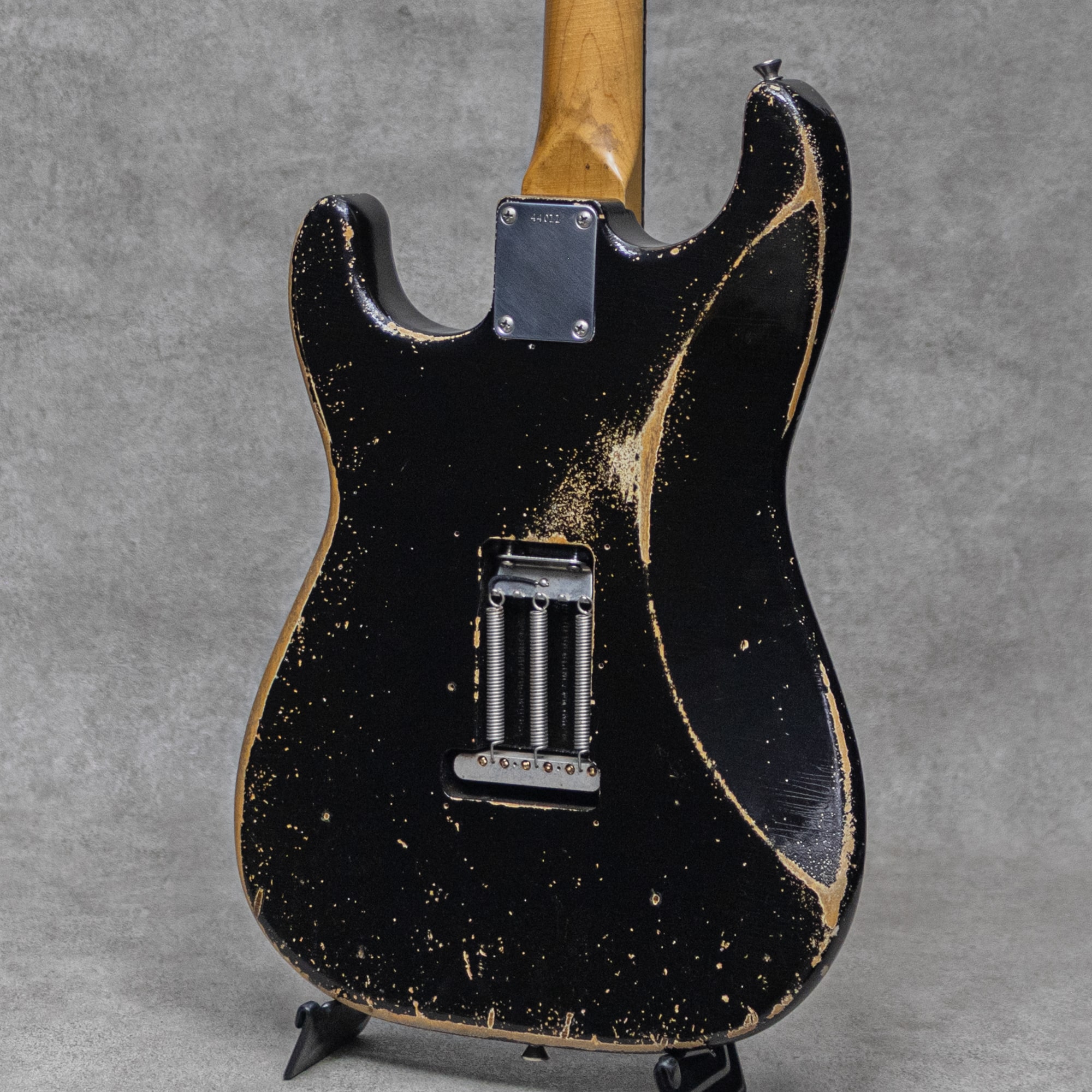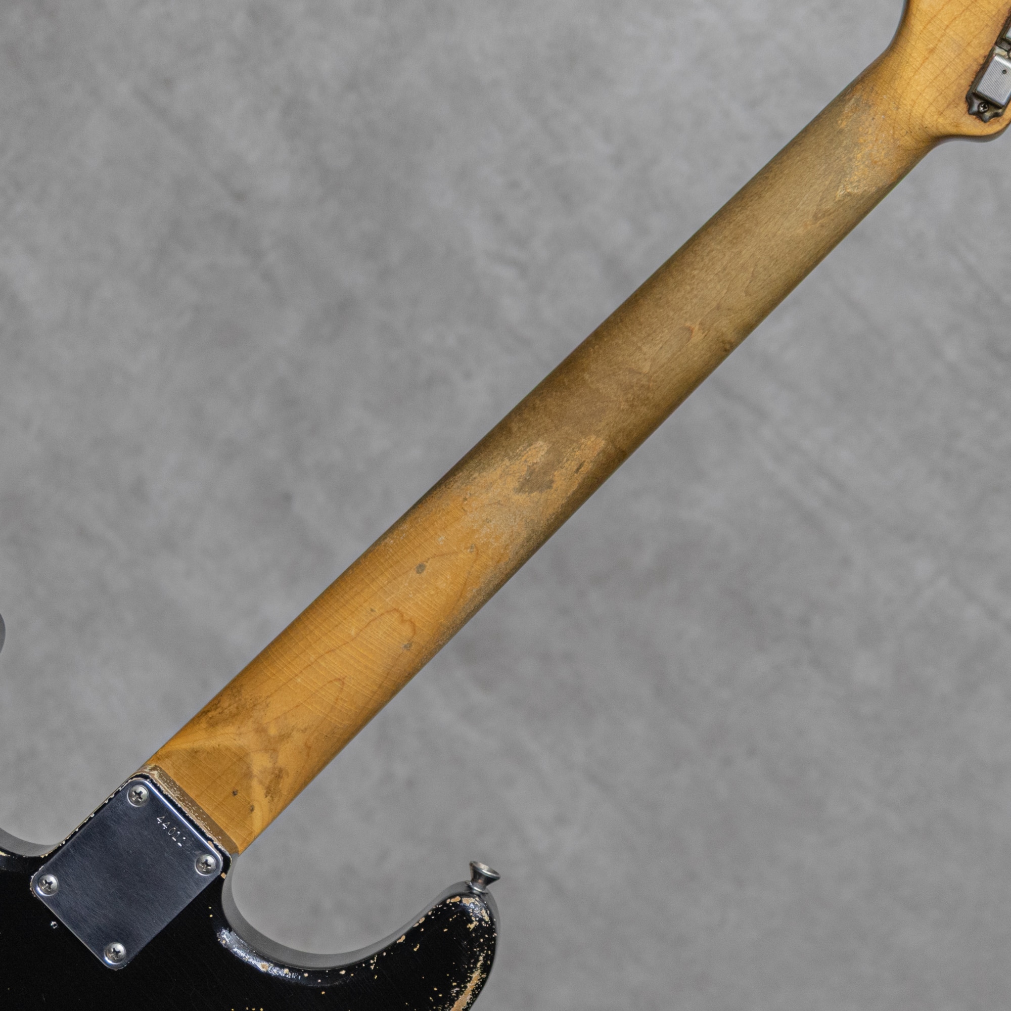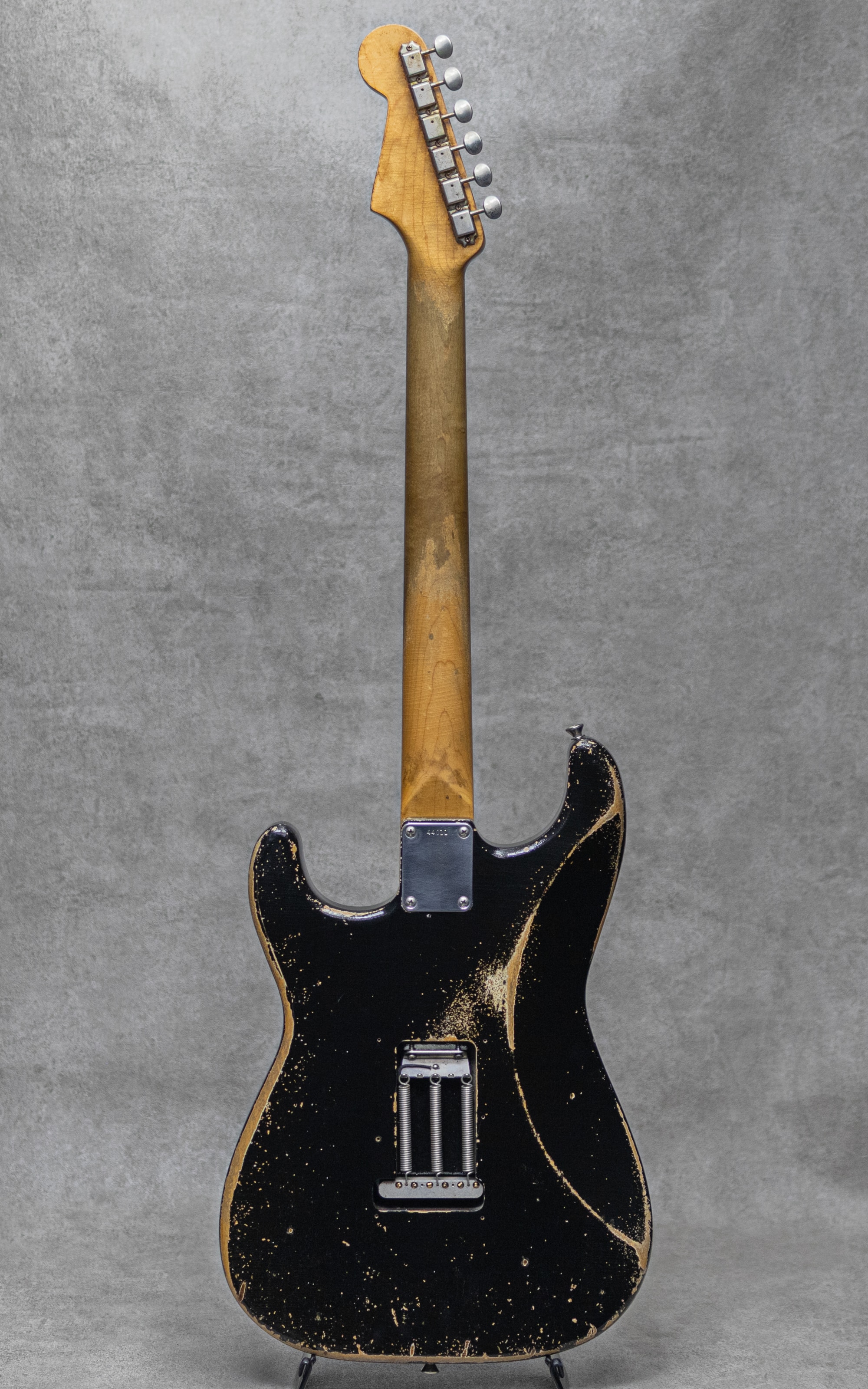 "THE BLACKGUARD BOOK"の著書でもあるNacho Banos氏による、究極のBlackguard Replicaブランド"Nacho Guitars”。年間の製作本数は非常に少なく日本国内への入荷数も限られており、カタログモデルといった概念は無く1本1本個性を宿したギターをワンオフで製作するようなスタイルが貫かれています。同じ年代・特徴のモデルであっても、それぞれが個性を持った外観・弾き心地・そしてサウンドが表現されております。本器は、”Early 60s Contour Body #44011 Super Heavy Aging Black Medium C Neck”。オリジナル・ブラックガードを知り尽くしたNacho氏の経験値を元に製作される、圧巻の完成度を誇る 60’sレプリカの1本。スラブローズウッド指板、メイプルネック、アルダーボディのウッドスペック。オールドを知り尽くしたNacho氏ならではの雰囲気満点、貫禄充分のスーパーヘビーエイジド加工が施された白のアンダーコートが垣間見えるエイジドブラック。ミディアムCシェイプに仕上げられたネックは細すぎず薄すぎない握り心地の良いネックシェイプです。本物さながらの経年したハードウェア、褪色感を再現したエイジンググリーンカラーの3plyPGは、その作り込みを愛でるだけでも楽しめる仕上がり。9.5”ラジアス指板、ミディアムフレット、Early60’sスタイルトレモロブリッジ、スチールサドル、Early 60’sスタイルピックアップ、アルミシールディングプレート、ワックスディップレプリカコンデンサー。ピックアップセレクターワイヤリングは5wayで、ネックPUトーン、センターPU&ブリッジPUトーンです。レンジ感の広い乾いたサウンド。レスポンスに長けながら金属質でないビンテージさながらのトーン。倍音感にあふれる甘いトーンから、ベルトーンの美しいハーフトーンまで、このスタイルに求められるサウンドを遺憾なく発揮してくれます。ストイックにブラックガードを愛したNacho氏ながら、指板ラジアスやピックアップワイヤリングなどはモダンで使いやすいセットをセレクトしており、より実戦向きで使えるビンテージレプリカに仕上げられています。歴戦の1本と見紛うばかりの雰囲気と仕上がりの話題と人気を集めるスペイン発”Nacho Guitars”。是非お手元でお確かめください。オリジナルハードケース、トレモロアーム、バックパネル&スクリュー、オリジナル・レザーバック、スペックシート、当機の画像データが入ったUSBとUSB用の木箱、レザーストラップ付属