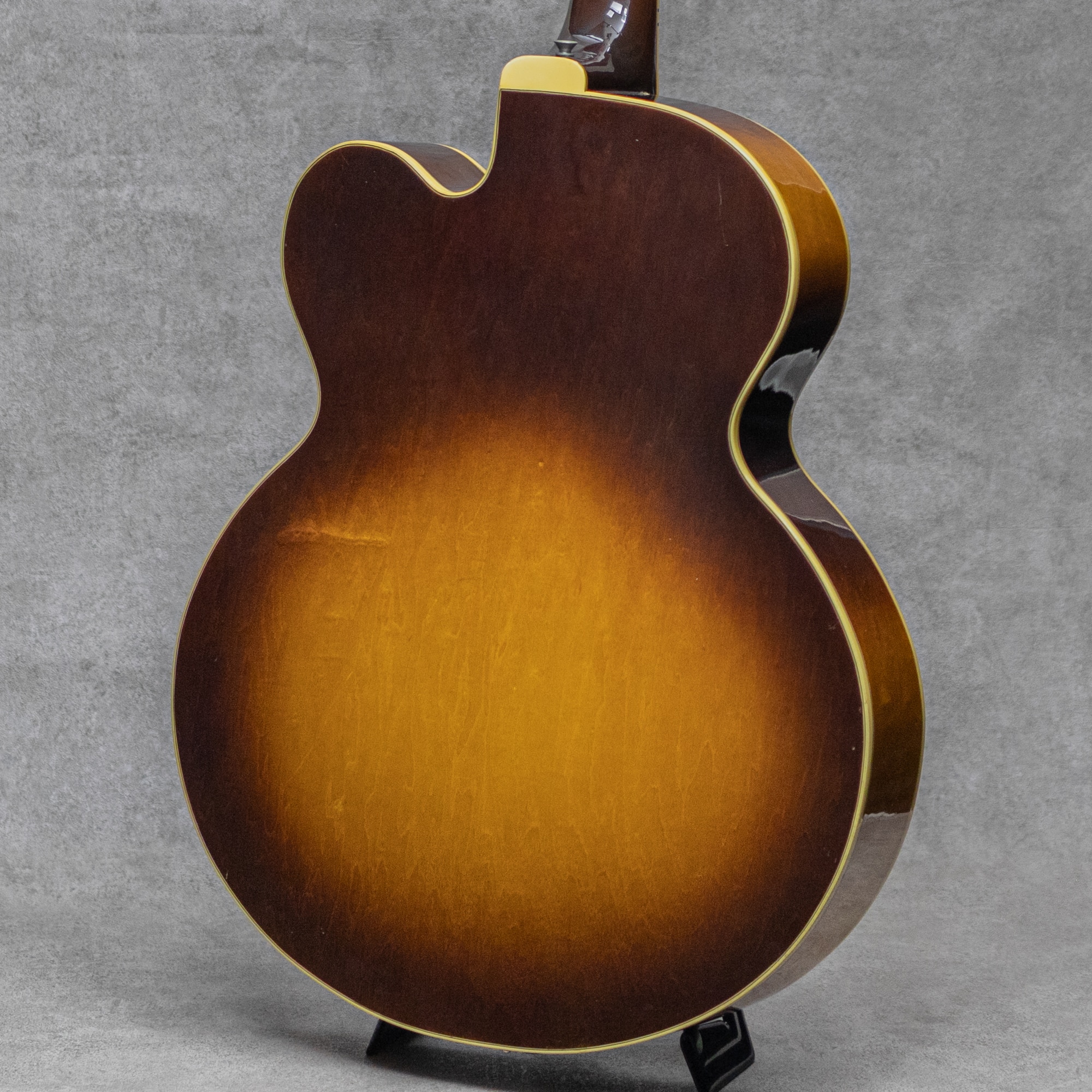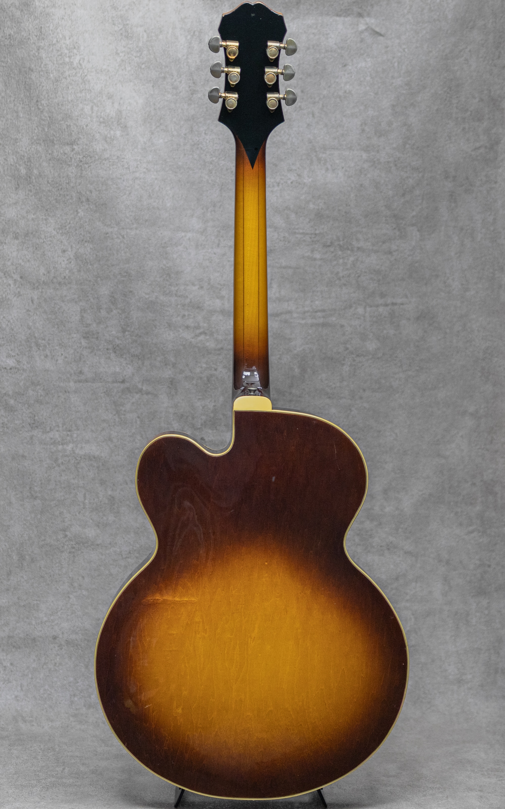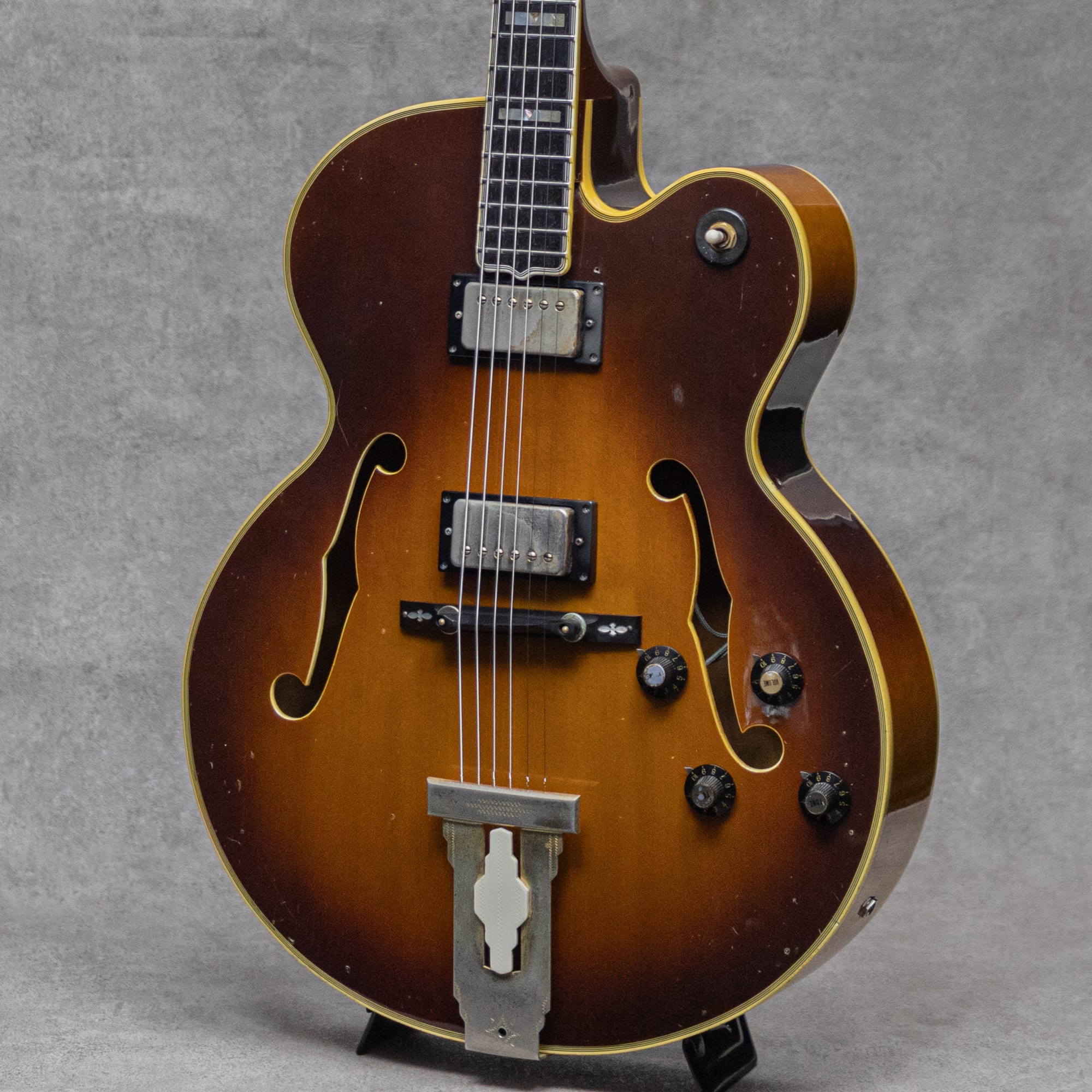 古くは19世紀末、ギリシャ系家族によって始まった"Epiphone"、20世紀にはニューヨーク マンハッタンでの経営をスタート、1928年からは"Epiphone"社名を掲げ名を馳せますが、その後紆余曲折を辿り1957年にギブソン社傘下となります。1960年代はギブソンカラマズー工場にて生産がされますが、その後1970年代には日本の荒井貿易、神田商会と業務提携をスタートし日本製での展開をスタート。当初は日本独自のオリジナルデザインに"Epiphone"ブランドを冠していましたが、ギブソン製品販売代理を請け負う合弁組織"日本ギブソン"が発足する1970年代後半には、従来のEpiphoneラインナップである"Emperor"、"Riviera"、"Casino"、そしてソリッドモデルの"Wilshire"、"Olympic"などといったモデルがマツモク工場製造により復活することとなりました。本器は1970年代後半製の"Emperor"、マツモク工場製を示す通称"ブルーラベル期"の1本。5プライメイプルネック、エボニー指板、上位機種たる風格のMOPロゴとヘッドストックインレイ、アバロンを組み合わせたブロックポジション、マルチプルバインディング、スプルーストップ、メイプルサイド&バック、ハムバッカー×2基登載、L-5スタイルトラピーズテールピース。まさに17インチ幅のフルアコースティックモデルたる、芯に張りのある弾けるような素早いアタックと、程よく低域が削げて明るく響く枯れたトーン。ドライな高域が軽快に歯切れよく、タイトで締まった基音と味わい深くフルホロボディに響く倍音とが快活に鳴る様子は、ギブソン製とはまた異なって印象深いグッドサウンド。ついつい弾き続けてしまう心地のよい弾き応えです。こちら細かな小傷や小さな打痕などはあるものの、経年の雰囲気も抜群に映えるルックス。気になる大きなダメージ等は無く、ロッドの調整も含め良好なネックコンディション。演奏しやすい低いアクションのセッティングができております。ローズウッドのブリッジベースには位置を固定するためのピンが後付けされています。ぜひご検討ください。ハードケース付属