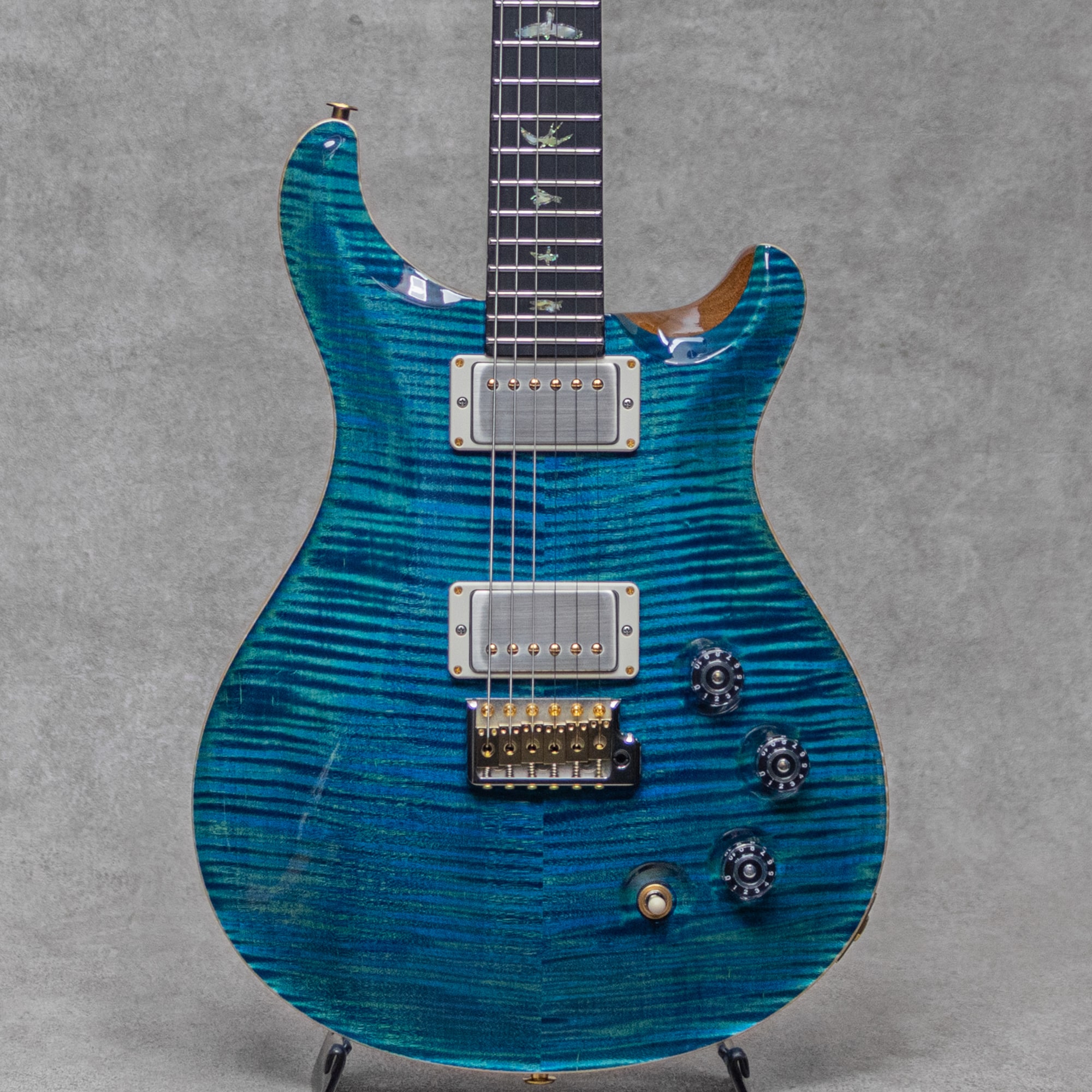 "DGT(David Grissom Trem)"は、長年PRSの製品開発において創業者"Paul Reed Smith"の厚い信頼のもと、多大な影響を与えてきたギタリスト"David Grissom(デイビッド・グリッソム)"の理想を実現した実戦向け実力派モデル。"McCarty"を元としてオリジナルのネックシェイプ、オリジナルピックアップを開発。2008年に登場した後、その完成度は大きく評価されPRSを代表するモデルの1つとなりました。本器は高品質な木材を有するオーダープログラム"Wood Library"にて三木楽器200周年を記念して弊社よりオーダーをした"Miki 200th Anniv. Wood Library DGT"。Laguna(潟湖)カラートップにボディバックはナチュラル、ネックには同じく鮮やかなブルーのステイン仕上げでメイプルの杢を美しく際立たせた存在感抜群のルックス。Artist Gradeフレイムメイプルトップ、マホガニーバック、フィギュアドメイプルネック、エボニー指板、J-Birdsインレイ、Gen II PRSトレモロ、Phase IIIロッキングチューナー、DGTピックアップを搭載。しっかりとしたグリップ感を持ちつつ吸い付くようなフィーリングのネックシェイプは25インチスケールとも抜群の相性。特徴的な背の高いフレットに加え本器ではメイプルネック、エボニー指板を採用し、より明瞭でクリアな音像も魅力。豊かな倍音を含み甘い飽和感が心地よく、それでいてワイドレンジなピックアップのチューニングも抜群で、レンスポンスに優れタイトに引き締まった本体のポテンシャルとも相まって、バーサタイルに高いクオリティを魅せつけてくれる完成度。トラッドな空気感をしっかりと持ちつつ、あらゆるシチュエーションにおいて卓越した対応力で欲しいトーンを引き出してくれるモダンな演奏性を併せ持った、まさにPRSの醍醐味ともいえる実力派モデルの1本。ぜひご検討ください。